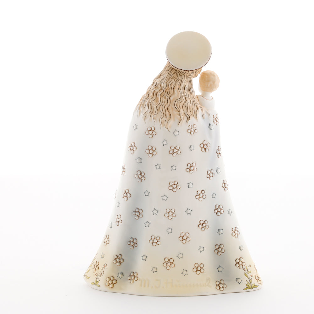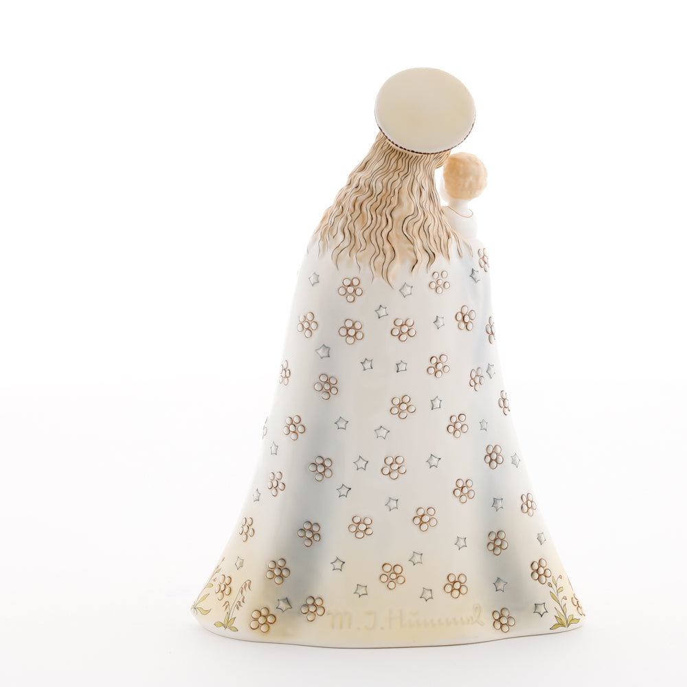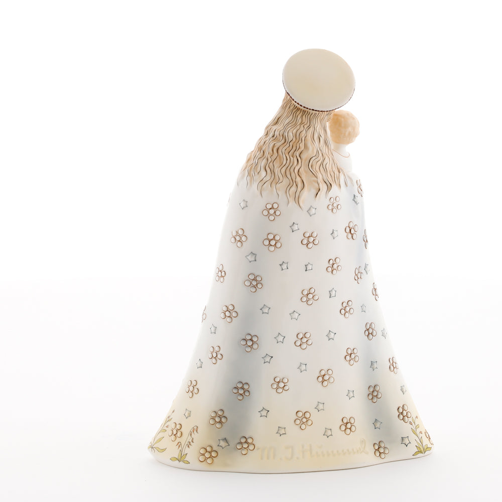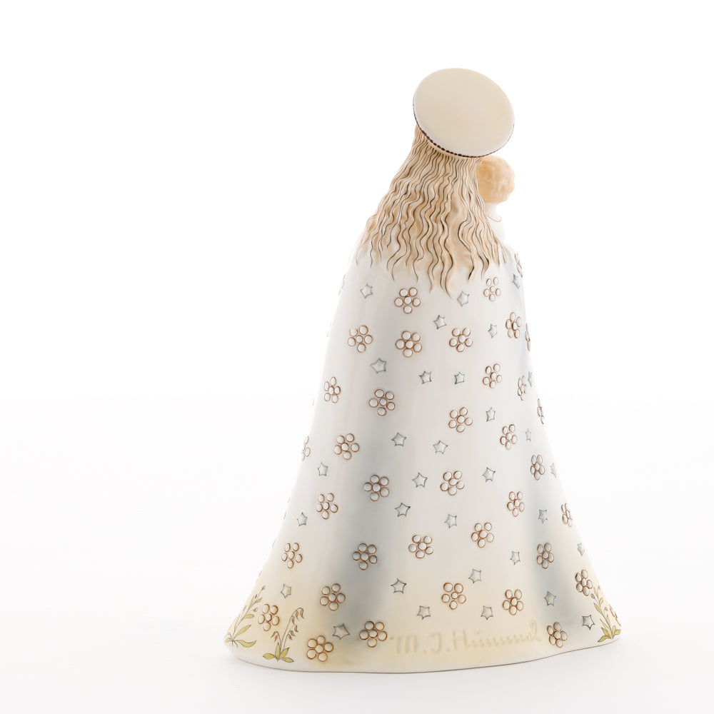 In zahlreichen Werken hat sich die Schwester künstlerisch mit Maria, der Mutter Jesu, auseinandergesetzt. Für sie war sie ein Leitbild auf der Suche nach ihrer gläubigen Identität als Künstlerin und Ordensfrau. Doch obwohl die Schwester sich schwertat, der figürlichen Darstellung ihres Glaubens zuzustimmen, entstanden in den Hummel-Werkstätten dennoch einige wenige Madonnenfiguren. Die erste Figur der neu aufgelegten vierteiligen Serie, die Blumenmadonna (HUM 10), wurde bereits im Jahr 1935 von Meistermodelleur Reinhold Unger gestaltet und von Maria Innocentia persönlich begutachtet. Dabei ist der Schutzmantel besonders gut zu erkennen, der die Blumenmadonna umgibt. Dieser wird häufig bei Mariendarstellungen genutzt, weil er den Schutz der Gläubigen in den Armen Marias ausdrückt. Solche Madonnen sind in der bildenden Kunst seit dem 13. Jahrhundert bekannt. Das Motiv basiert auf dem sogenannten „Mantelschutz“, wonach man einer Person durch Bedecken mit seinem Mantel rechtlichen Schutz gewährt. Für die exklusive Sonderedition wurde das Dekor entsprechend erweitert. Eine Besonderheit ist auch das Dekor der Augenpartie: Während bei anderen Hummel-Figuren die Wimpern mit drei bis vier Härchen nur angedeutet sind, erstrahlt die besondere Blumenmadonna mit einem natürlich wirkenden Wimpernkranz.