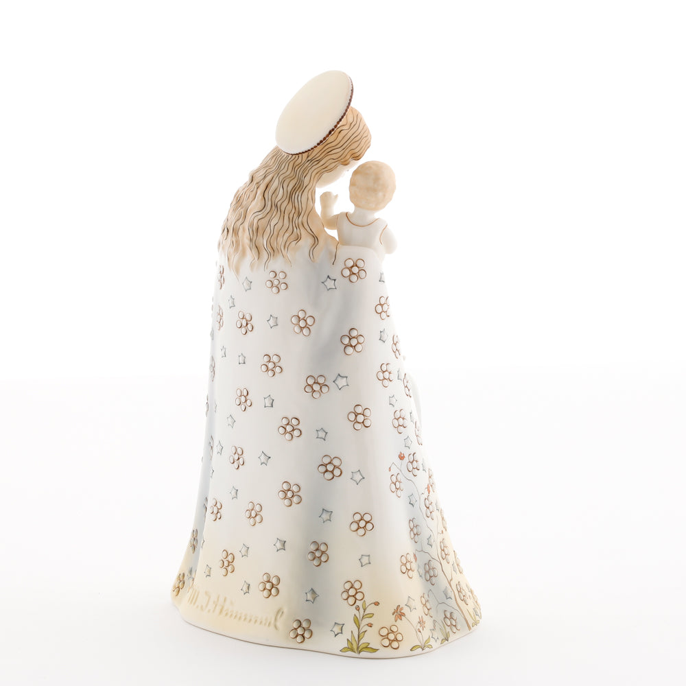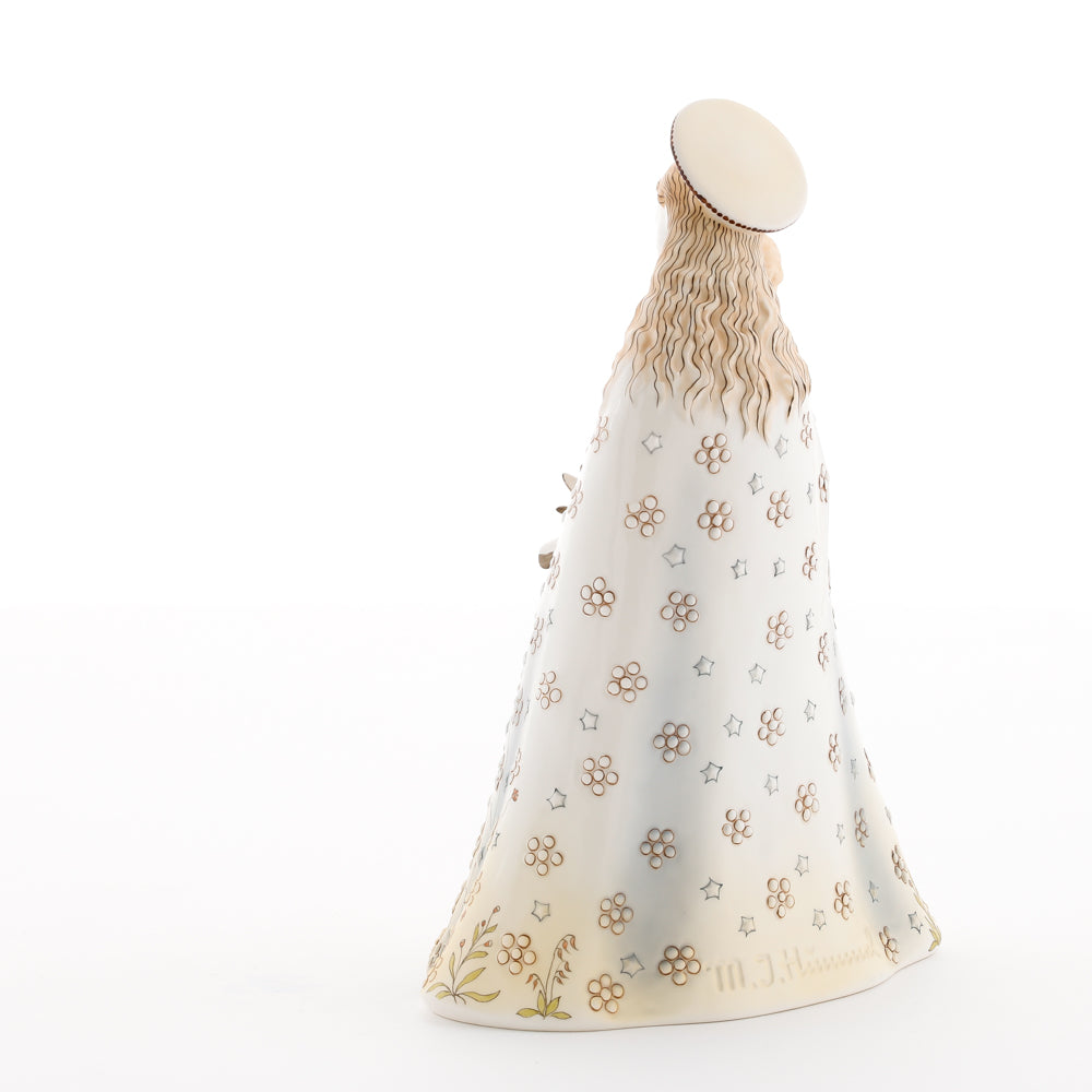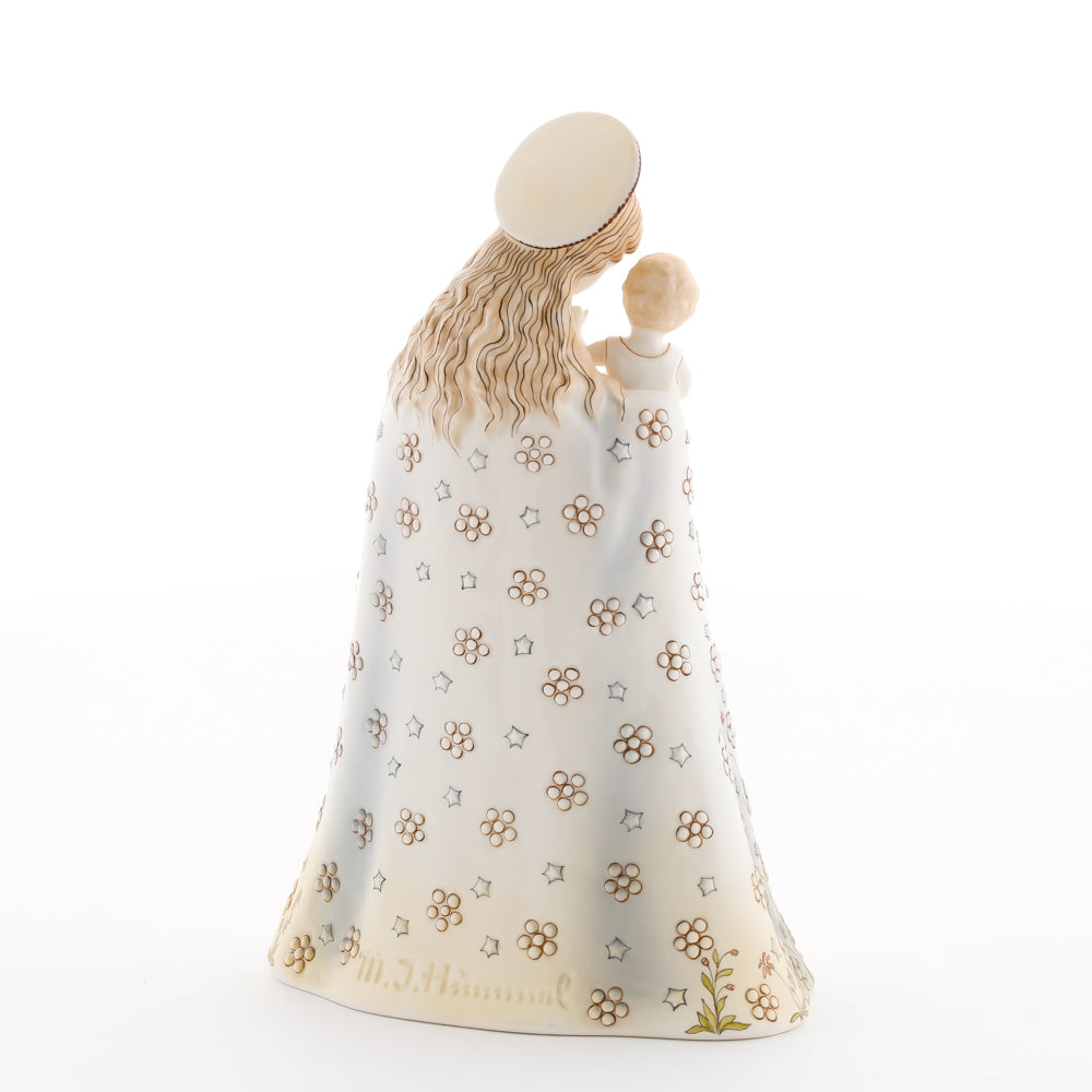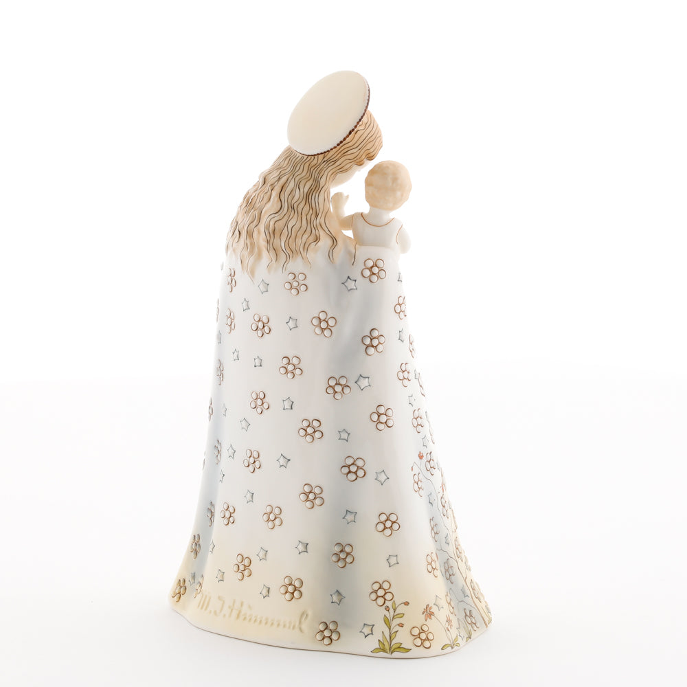 In zahlreichen Werken hat sich die Schwester künstlerisch mit Maria, der Mutter Jesu, auseinandergesetzt. Für sie war sie ein Leitbild auf der Suche nach ihrer gläubigen Identität als Künstlerin und Ordensfrau. Doch obwohl die Schwester sich schwertat, der figürlichen Darstellung ihres Glaubens zuzustimmen, entstanden in den Hummel-Werkstätten dennoch einige wenige Madonnenfiguren. Die erste Figur der neu aufgelegten vierteiligen Serie, die Blumenmadonna (HUM 10), wurde bereits im Jahr 1935 von Meistermodelleur Reinhold Unger gestaltet und von Maria Innocentia persönlich begutachtet. Dabei ist der Schutzmantel besonders gut zu erkennen, der die Blumenmadonna umgibt. Dieser wird häufig bei Mariendarstellungen genutzt, weil er den Schutz der Gläubigen in den Armen Marias ausdrückt. Solche Madonnen sind in der bildenden Kunst seit dem 13. Jahrhundert bekannt. Das Motiv basiert auf dem sogenannten „Mantelschutz“, wonach man einer Person durch Bedecken mit seinem Mantel rechtlichen Schutz gewährt. Für die exklusive Sonderedition wurde das Dekor entsprechend erweitert. Eine Besonderheit ist auch das Dekor der Augenpartie: Während bei anderen Hummel-Figuren die Wimpern mit drei bis vier Härchen nur angedeutet sind, erstrahlt die besondere Blumenmadonna mit einem natürlich wirkenden Wimpernkranz.