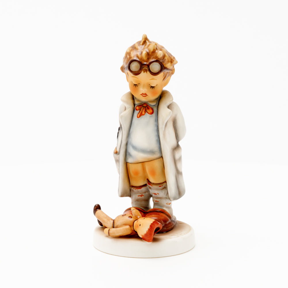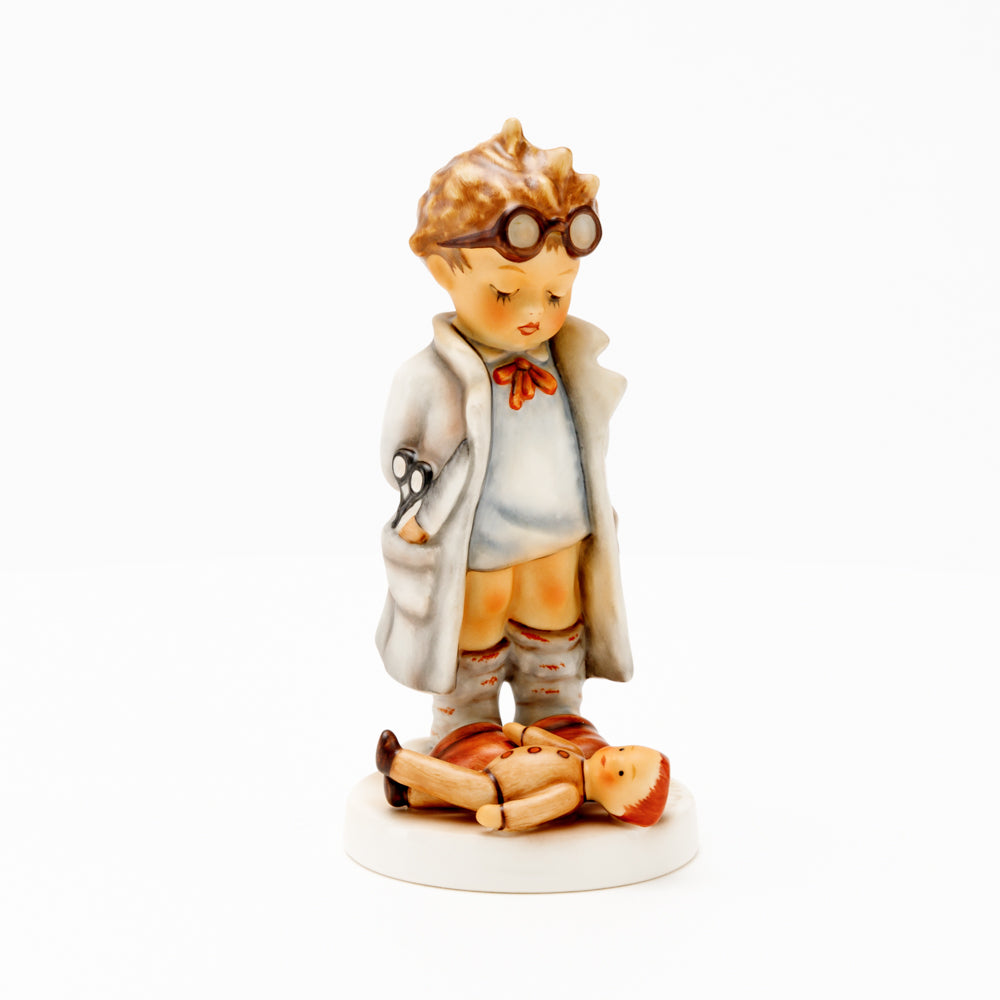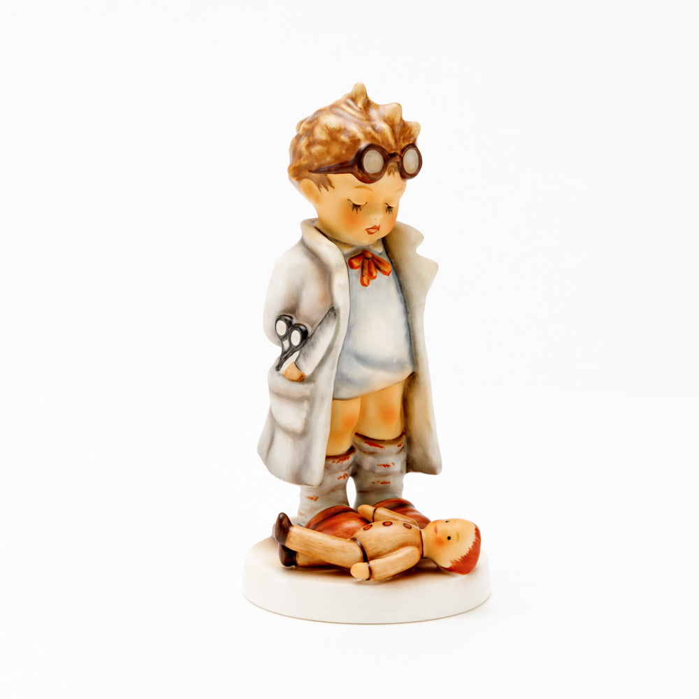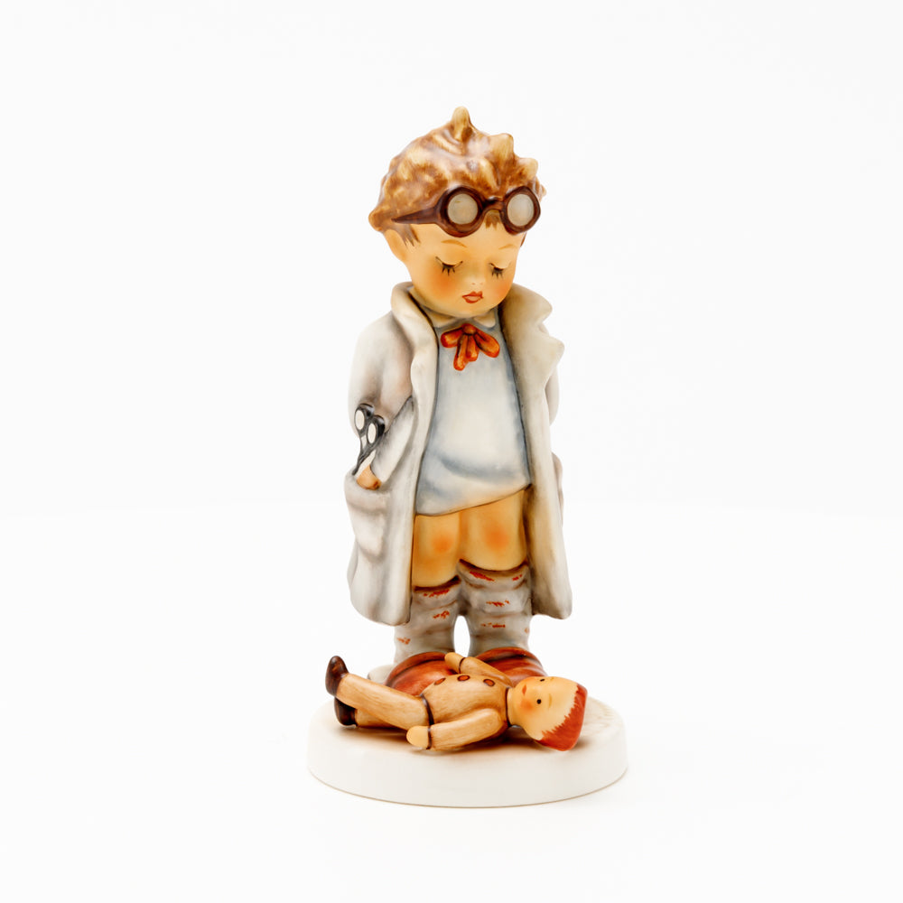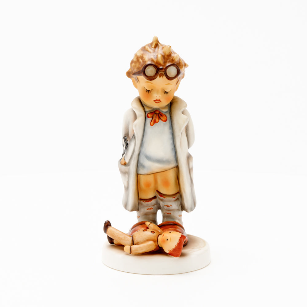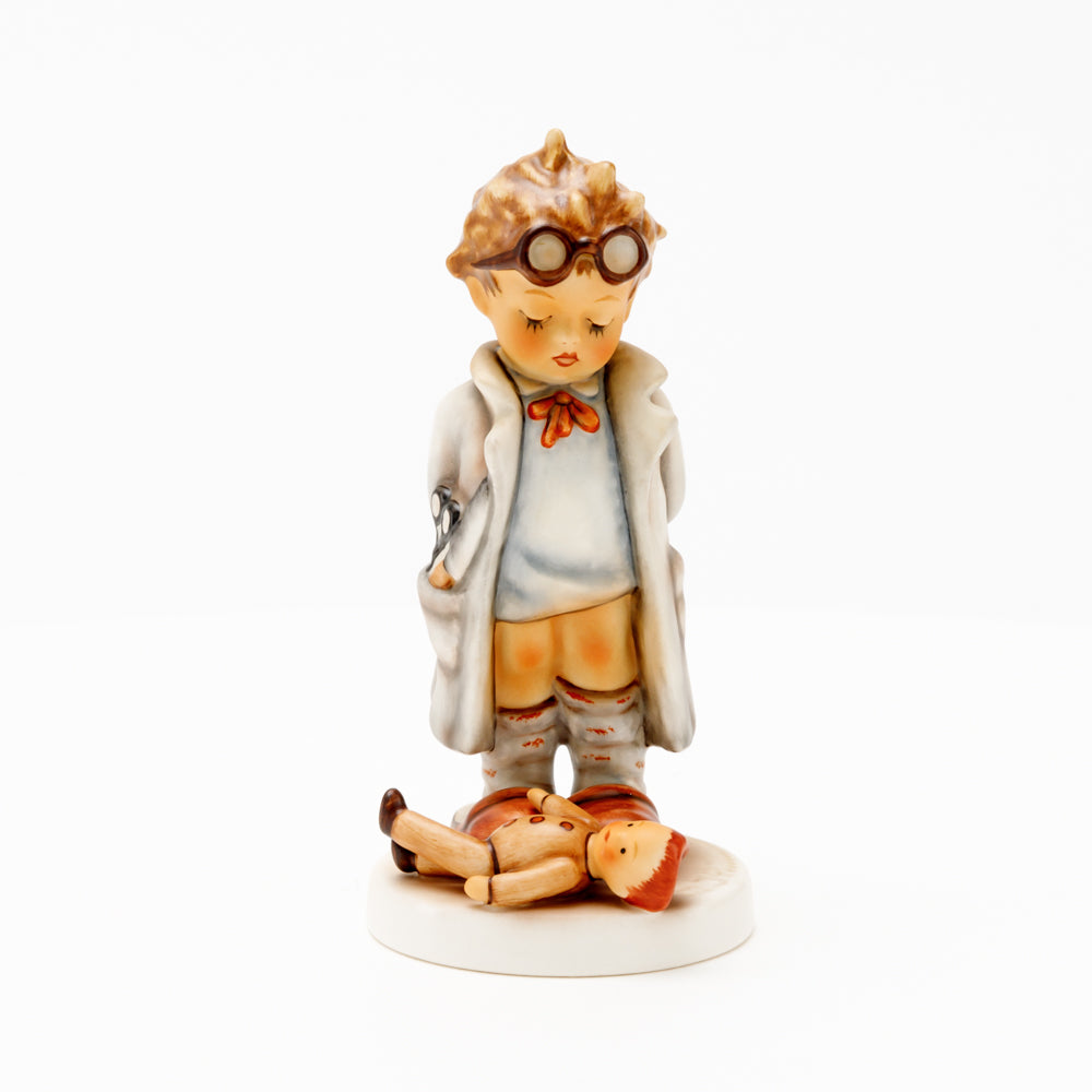 „Der Puppendoktor“ wurde 1939 von Meistermodelleur Arthur Möller modelliert und im Laufe der Jahre mehrfach umgestaltet. Es gibt sie in unterschiedlichen Größen, wobei ältere Modelle geringfügig größer sind. Ganz wunderbar greift diese original Hummel-Figur die kindliche Fantasie der heilen Welt auf, in der Puppenkliniken und Puppendoktoren die kleinen Wehwehchen der Spielzeugwelt mit einem Pflaster und einem Lächeln im Handumdrehen heilen.