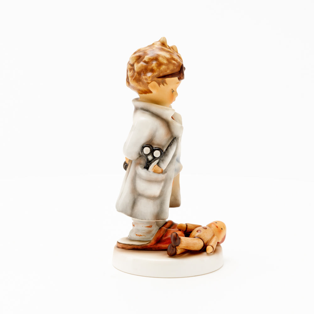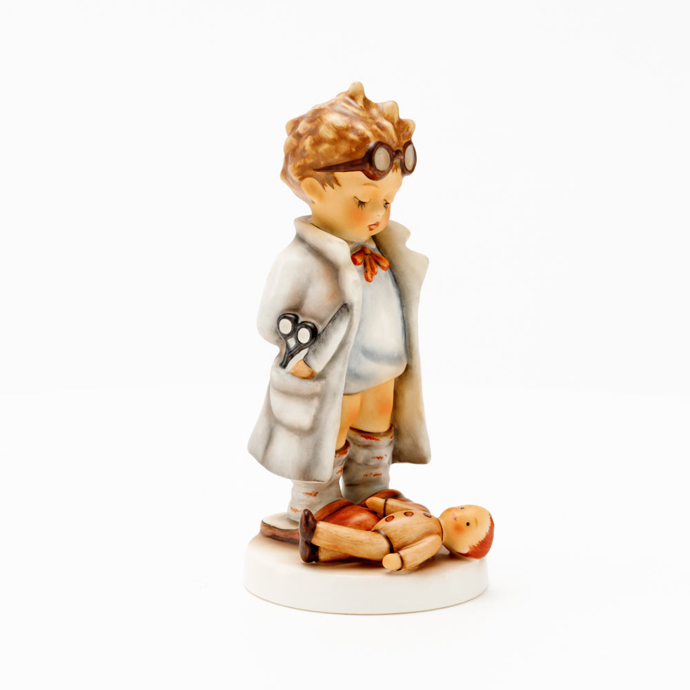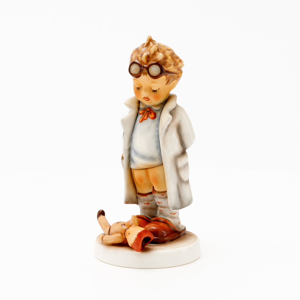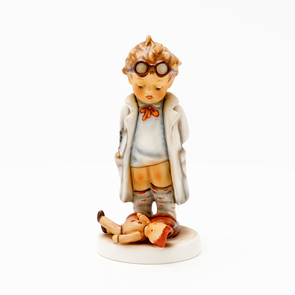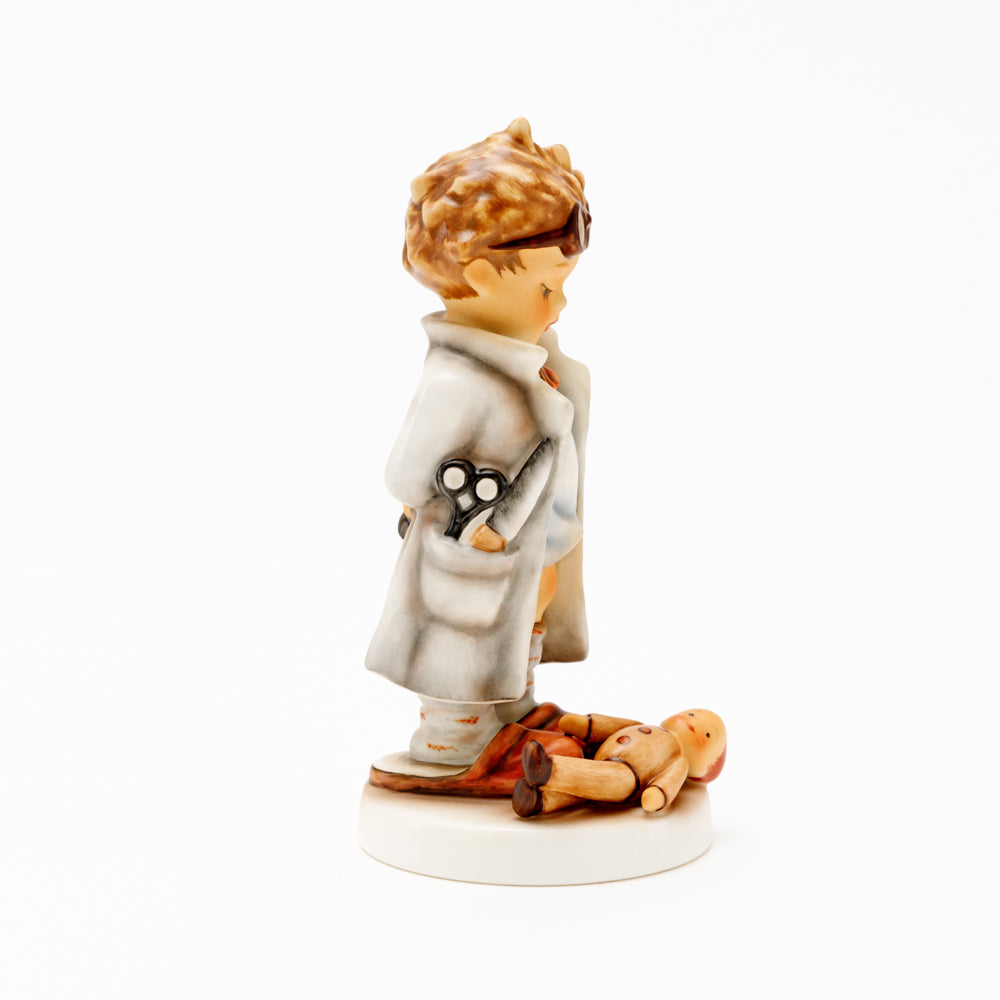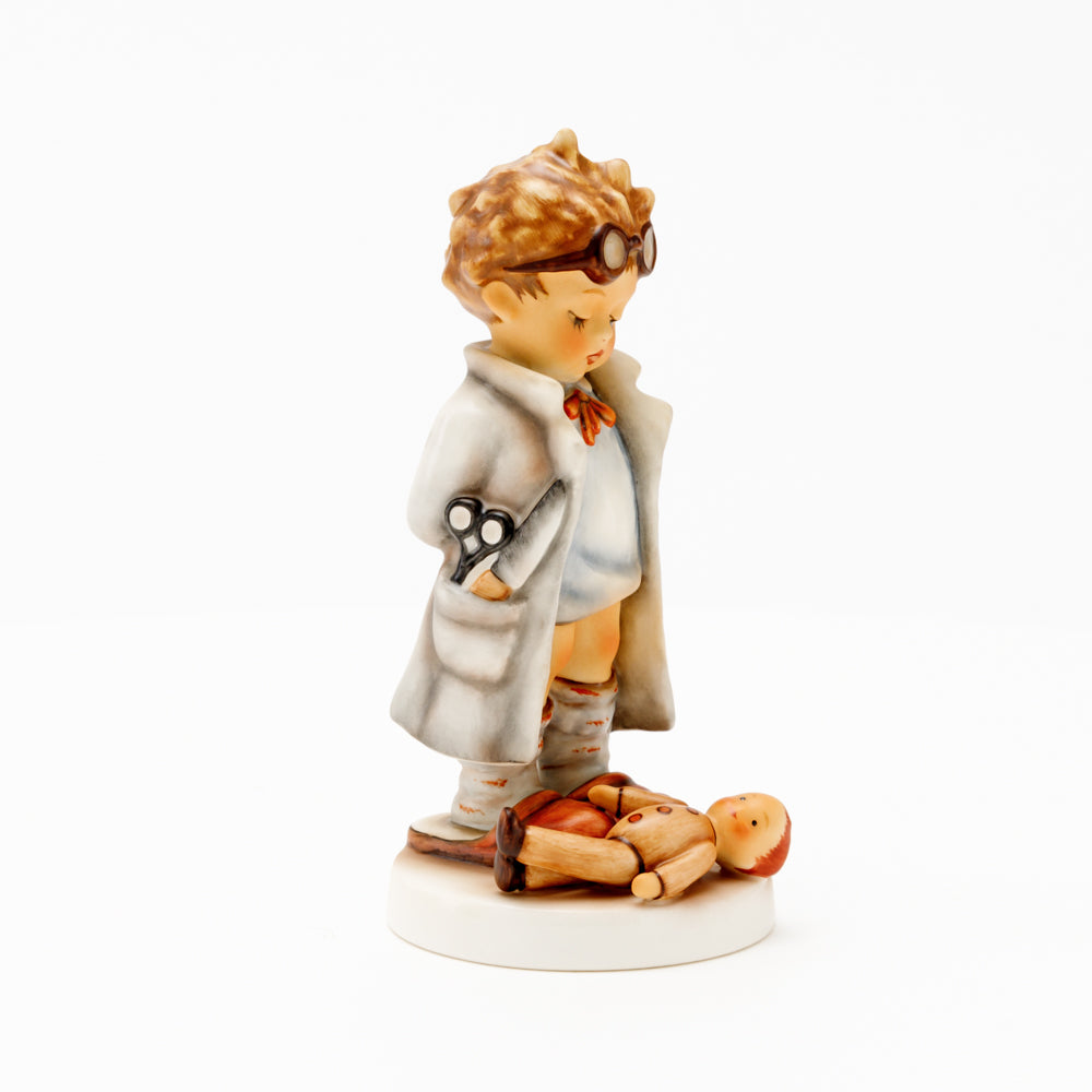 „Der Puppendoktor“ wurde 1939 von Meistermodelleur Arthur Möller modelliert und im Laufe der Jahre mehrfach umgestaltet. Es gibt sie in unterschiedlichen Größen, wobei ältere Modelle geringfügig größer sind. Ganz wunderbar greift diese original Hummel-Figur die kindliche Fantasie der heilen Welt auf, in der Puppenkliniken und Puppendoktoren die kleinen Wehwehchen der Spielzeugwelt mit einem Pflaster und einem Lächeln im Handumdrehen heilen.