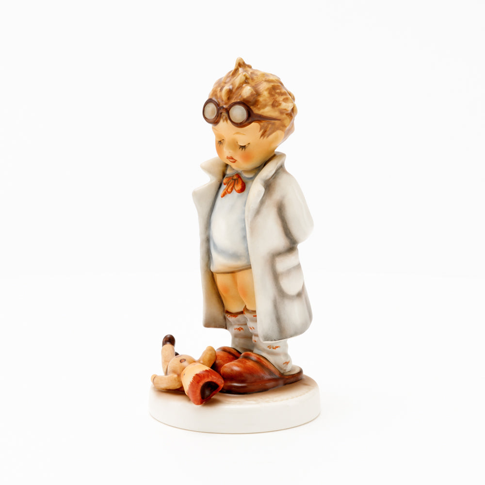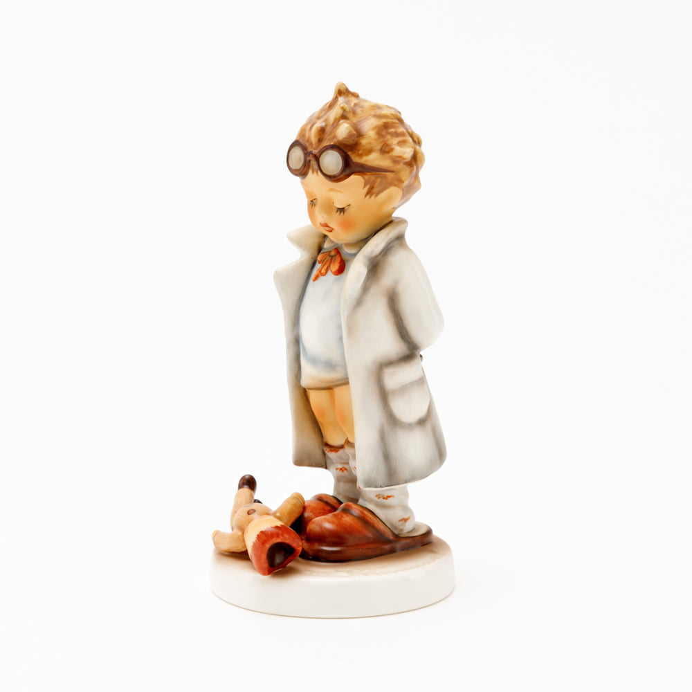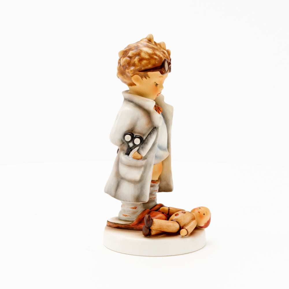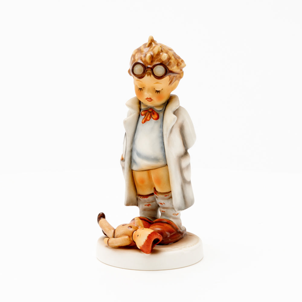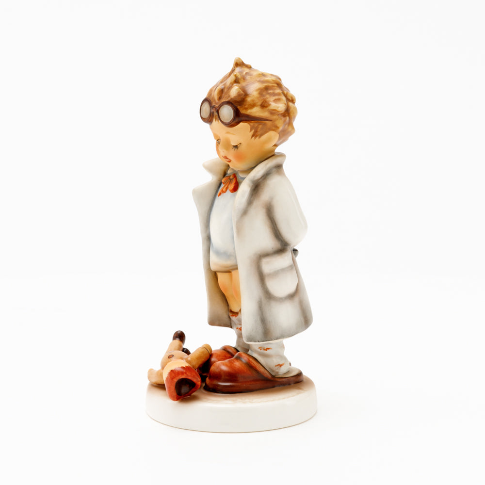„Der Puppendoktor“ wurde 1939 von Meistermodelleur Arthur Möller modelliert und im Laufe der Jahre mehrfach umgestaltet. Es gibt sie in unterschiedlichen Größen, wobei ältere Modelle geringfügig größer sind. Ganz wunderbar greift diese original Hummel-Figur die kindliche Fantasie der heilen Welt auf, in der Puppenkliniken und Puppendoktoren die kleinen Wehwehchen der Spielzeugwelt mit einem Pflaster und einem Lächeln im Handumdrehen heilen.