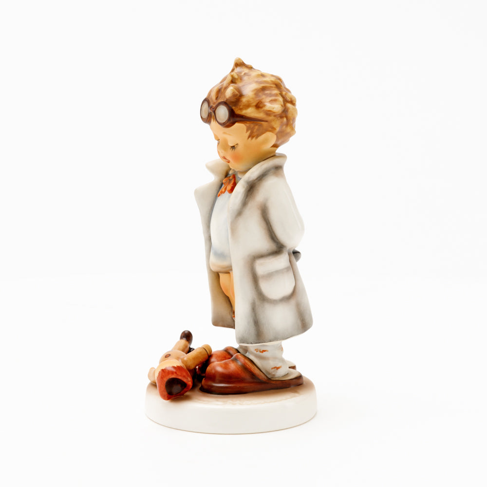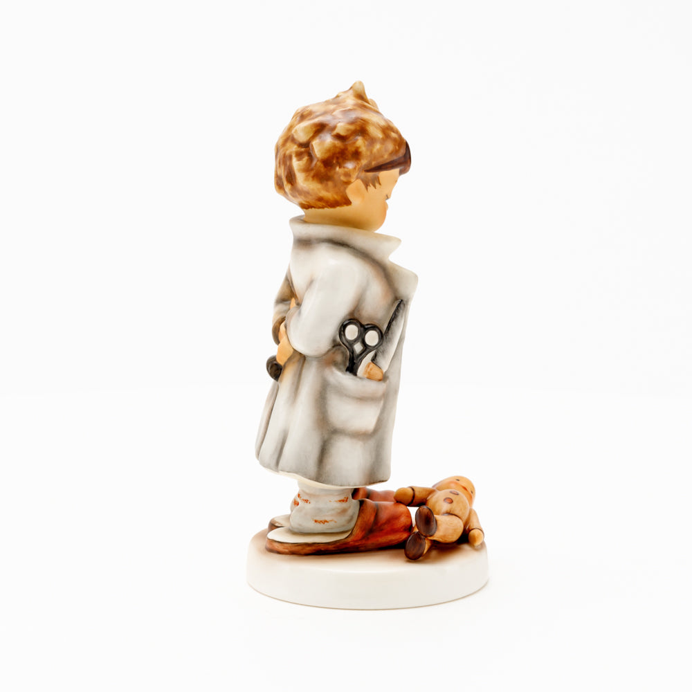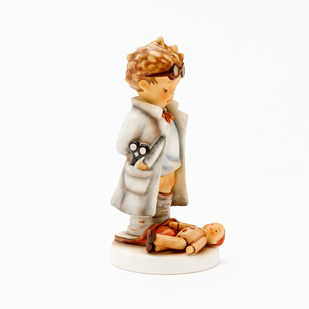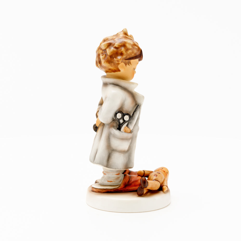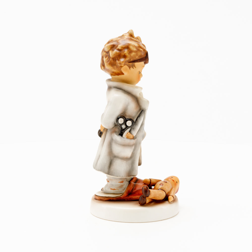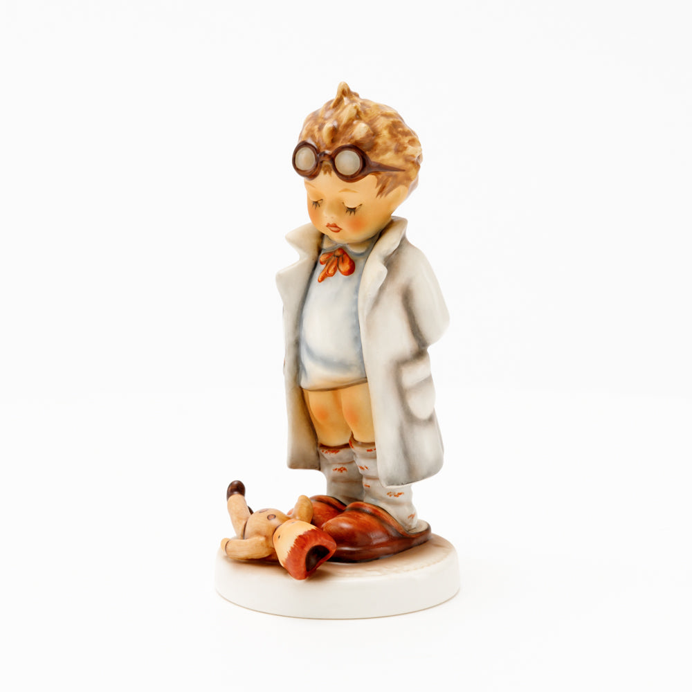 „Der Puppendoktor“ wurde 1939 von Meistermodelleur Arthur Möller modelliert und im Laufe der Jahre mehrfach umgestaltet. Es gibt sie in unterschiedlichen Größen, wobei ältere Modelle geringfügig größer sind. Ganz wunderbar greift diese original Hummel-Figur die kindliche Fantasie der heilen Welt auf, in der Puppenkliniken und Puppendoktoren die kleinen Wehwehchen der Spielzeugwelt mit einem Pflaster und einem Lächeln im Handumdrehen heilen.