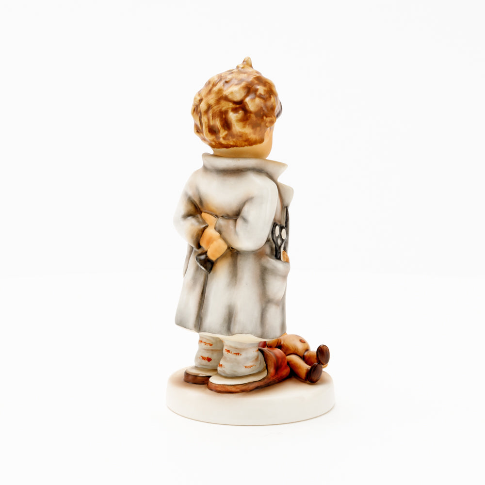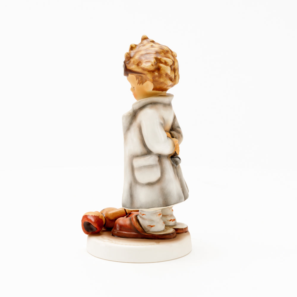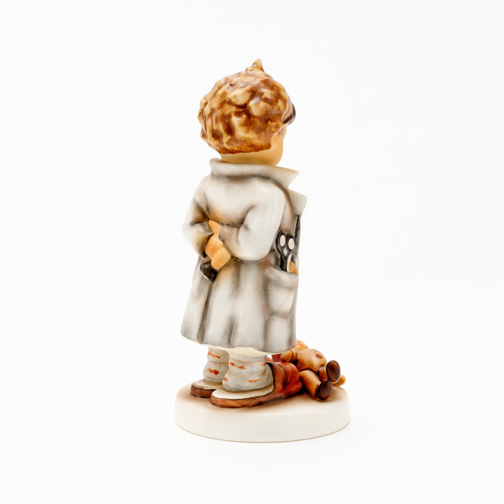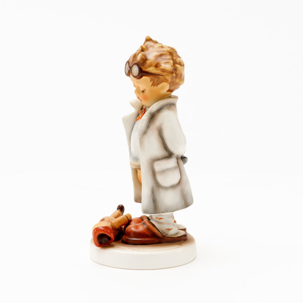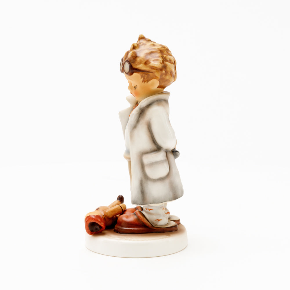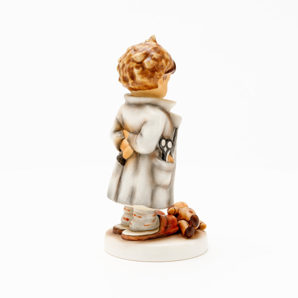 „Der Puppendoktor“ wurde 1939 von Meistermodelleur Arthur Möller modelliert und im Laufe der Jahre mehrfach umgestaltet. Es gibt sie in unterschiedlichen Größen, wobei ältere Modelle geringfügig größer sind. Ganz wunderbar greift diese original Hummel-Figur die kindliche Fantasie der heilen Welt auf, in der Puppenkliniken und Puppendoktoren die kleinen Wehwehchen der Spielzeugwelt mit einem Pflaster und einem Lächeln im Handumdrehen heilen.