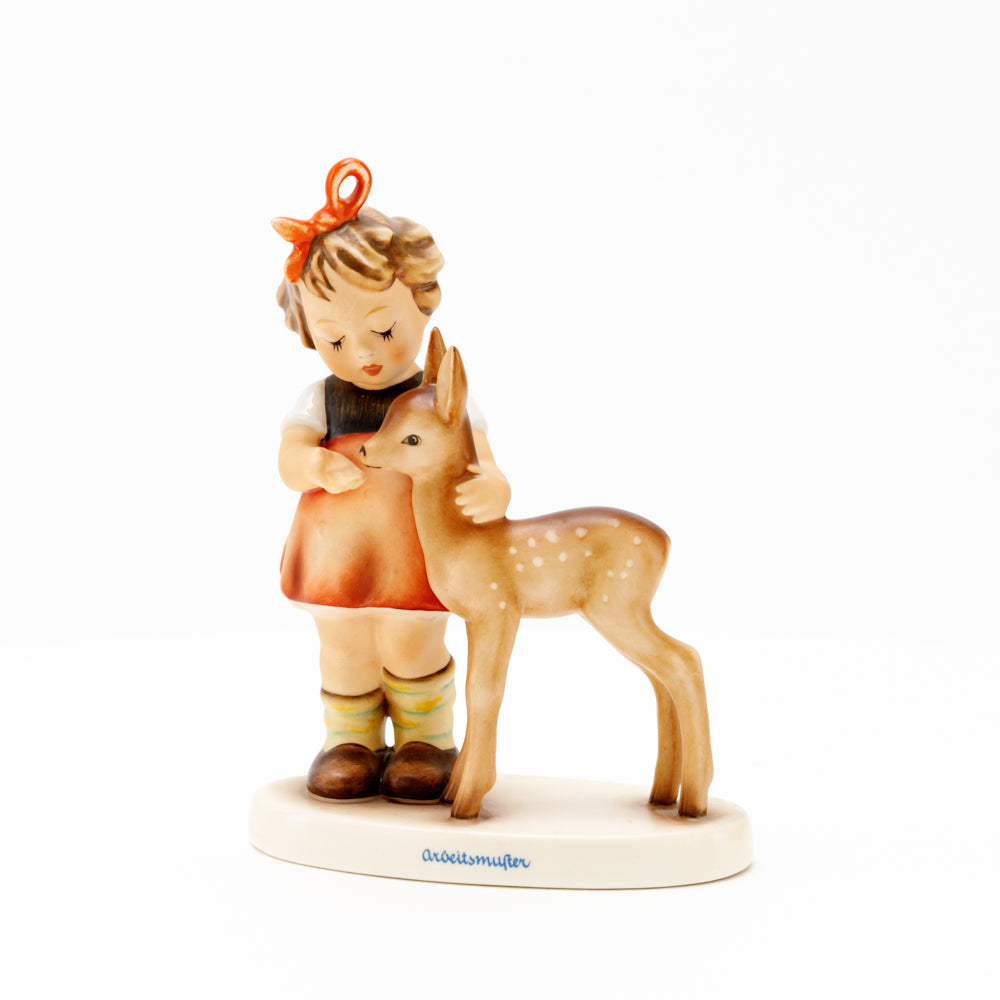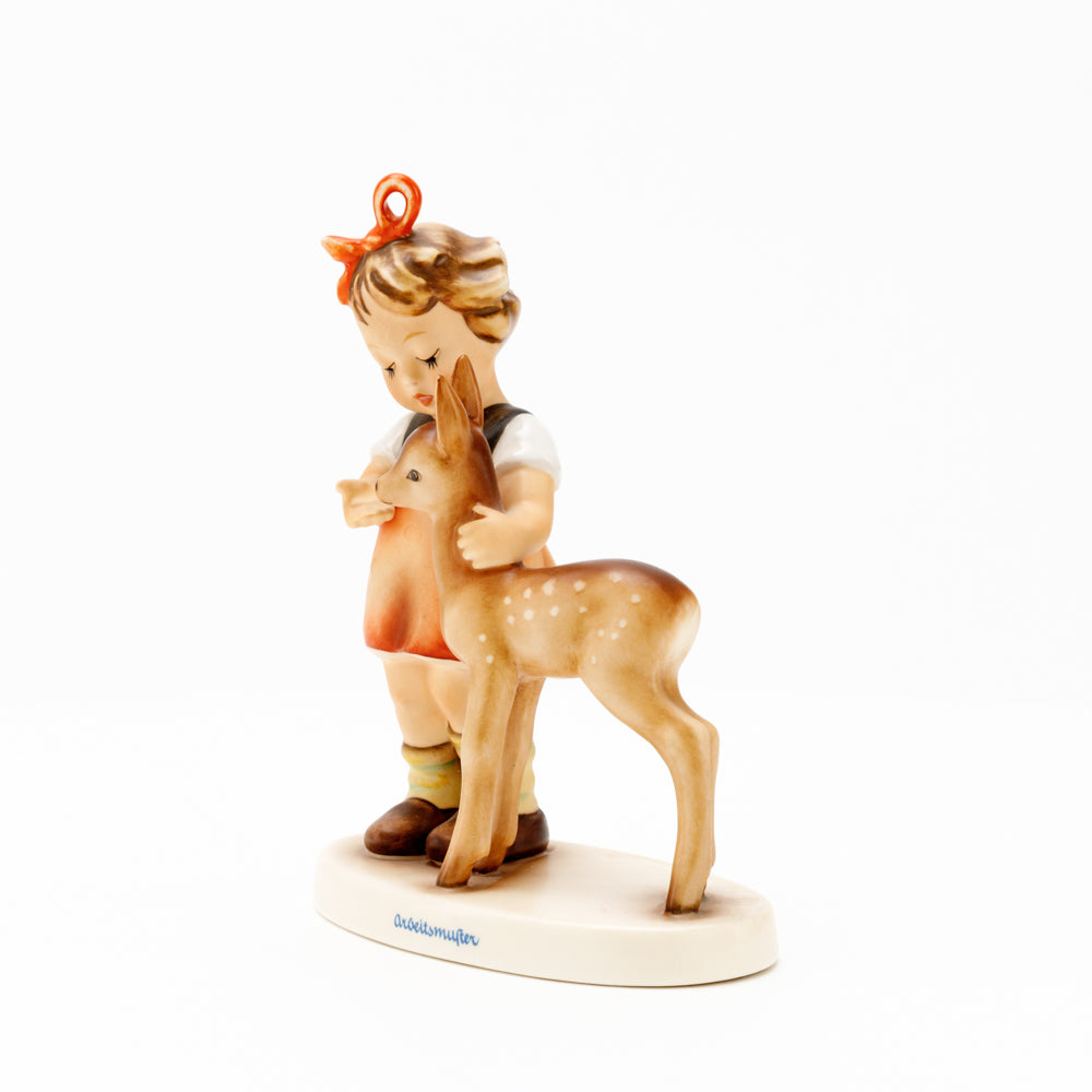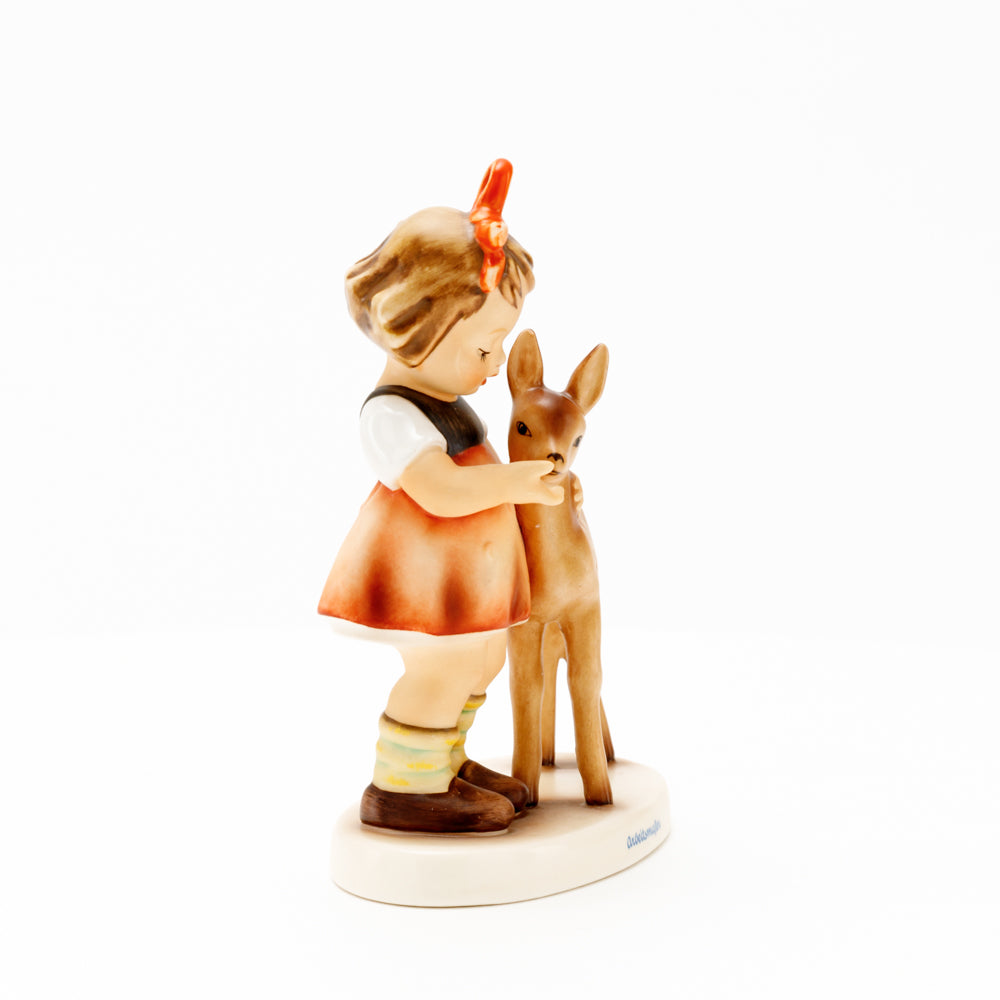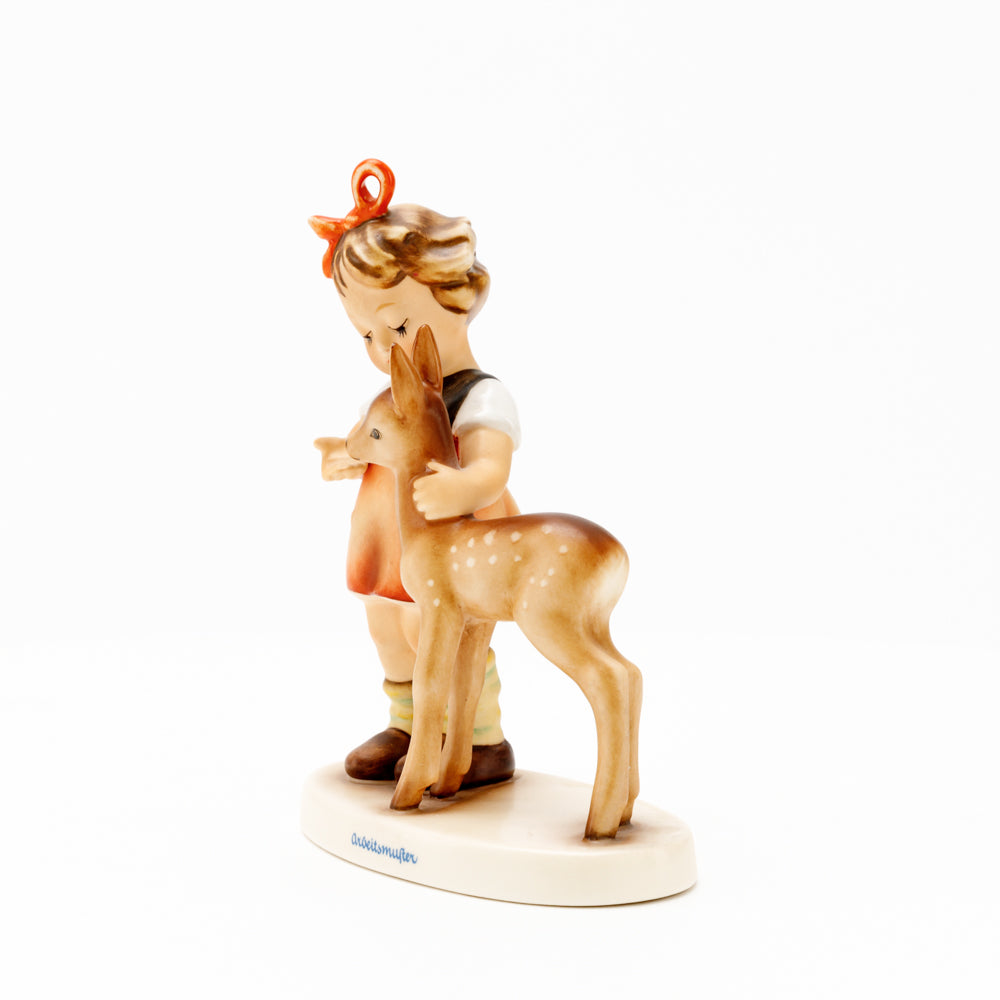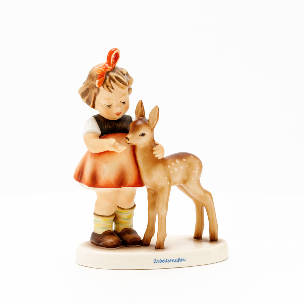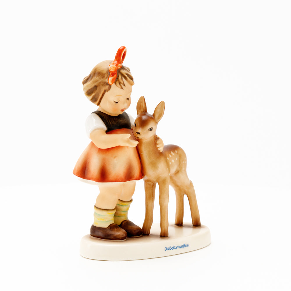 Immer wieder hat Schwester Maria Innocentia die Liebe der Kinder zu Tieren in ihren Zeichnungen aufgegriffen. So sind über die Jahre auch immer mehr Figuren in der Hummel Manufaktur gestaltet worden, die die Zuneigung zwischen Mensch und Tier ausdrücken. „Gute Freunde“ ist eine davon. Die Figur zeigt ein kleines Hummel-Mädchen mit ihrem Rehkitz, dessen hellbraunes Fell herrlich in der Sonne glänzt. Die Figur wurde 1940 von Reinhold Unger modelliert. Die Tupfer auf dem Fell des Rehs sind in zwei oder drei Reihen angeordnet. Die Variante in Terrakotta Finish ist sehr limitiert und daher ein rares Sammlerstück.