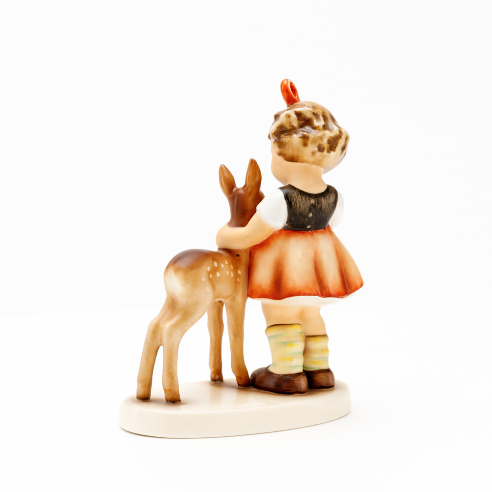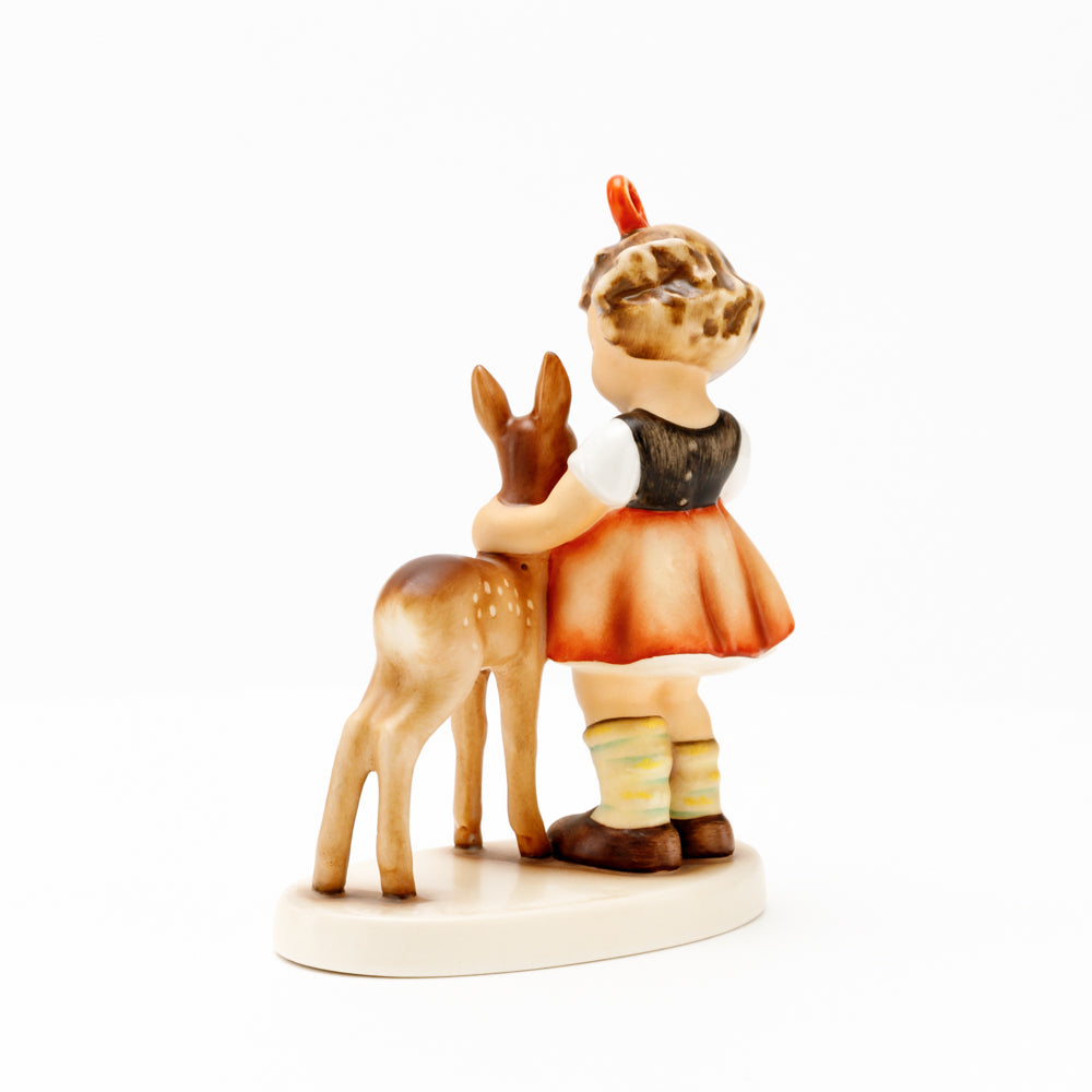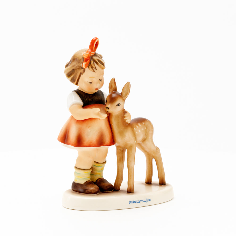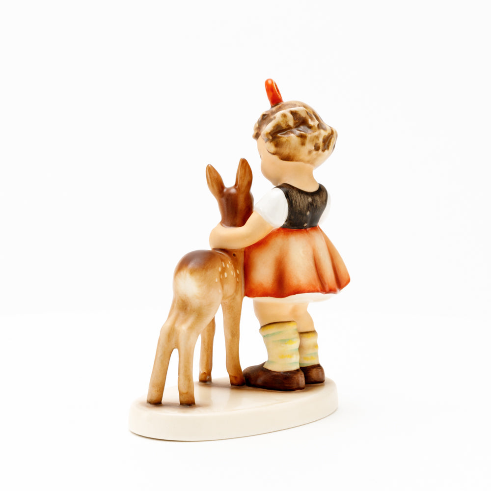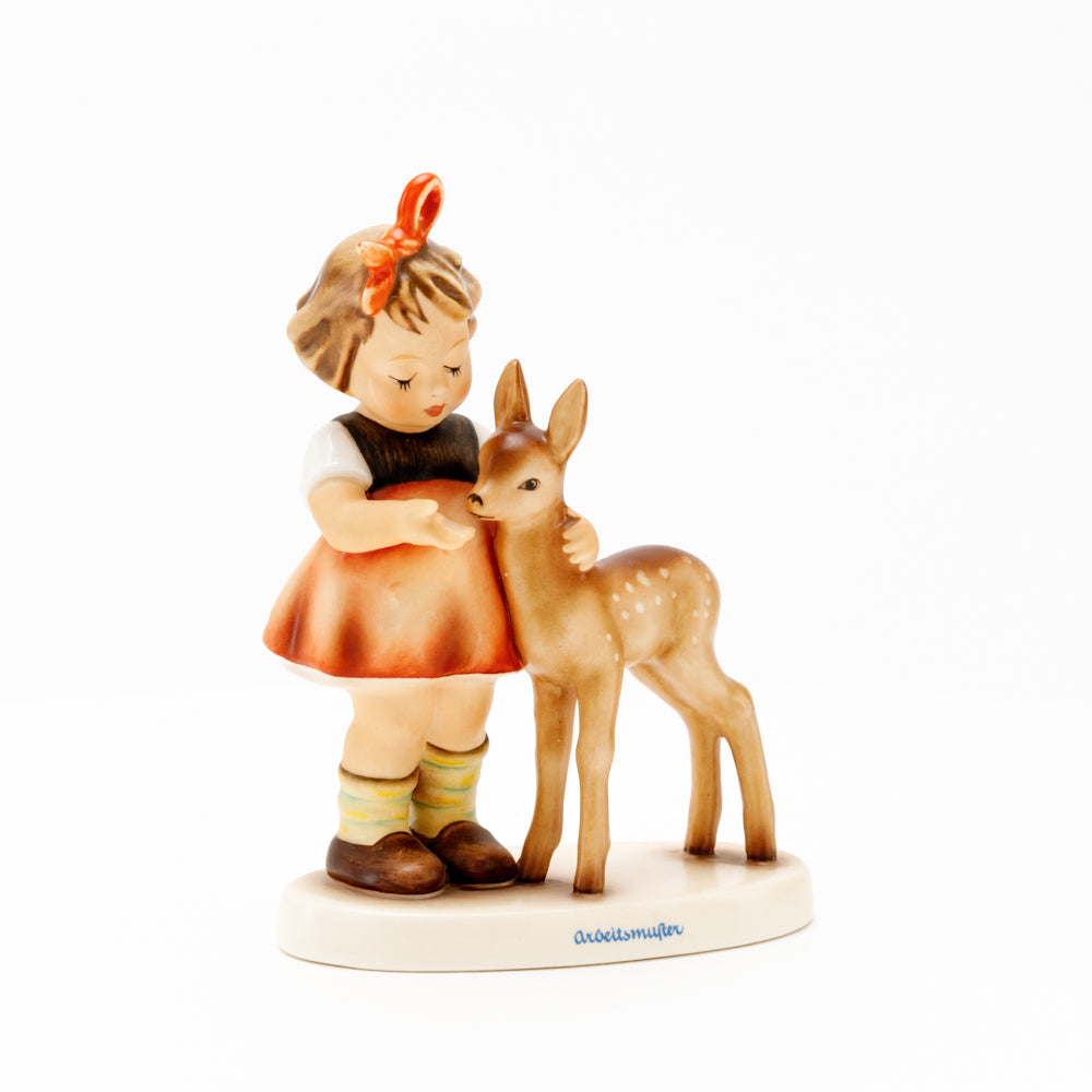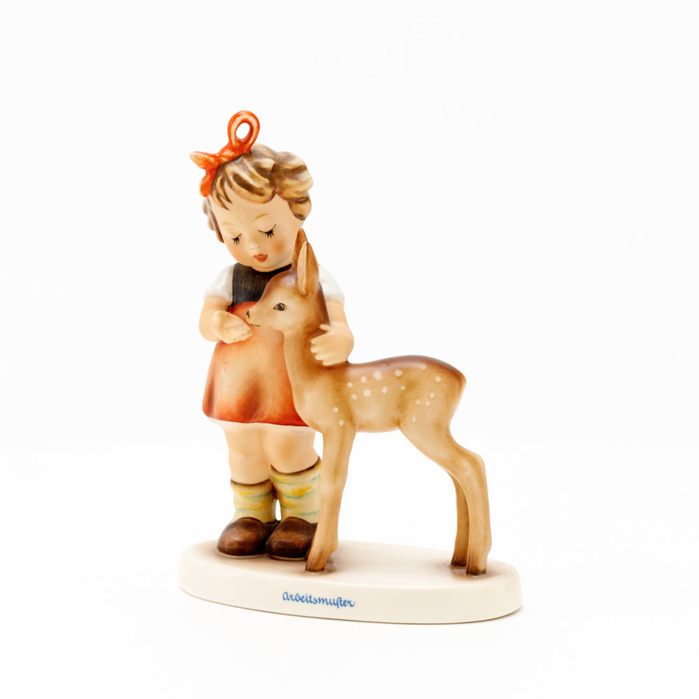 Immer wieder hat Schwester Maria Innocentia die Liebe der Kinder zu Tieren in ihren Zeichnungen aufgegriffen. So sind über die Jahre auch immer mehr Figuren in der Hummel Manufaktur gestaltet worden, die die Zuneigung zwischen Mensch und Tier ausdrücken. „Gute Freunde“ ist eine davon. Die Figur zeigt ein kleines Hummel-Mädchen mit ihrem Rehkitz, dessen hellbraunes Fell herrlich in der Sonne glänzt. Die Figur wurde 1940 von Reinhold Unger modelliert. Die Tupfer auf dem Fell des Rehs sind in zwei oder drei Reihen angeordnet. Die Variante in Terrakotta Finish ist sehr limitiert und daher ein rares Sammlerstück.