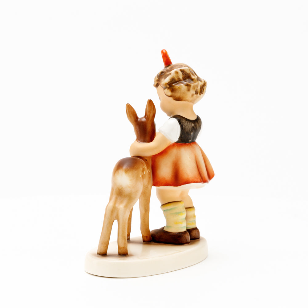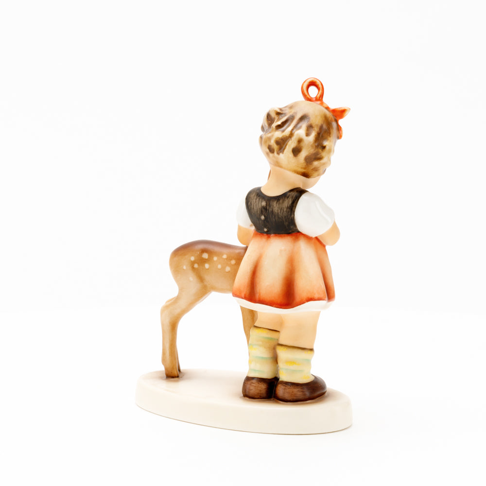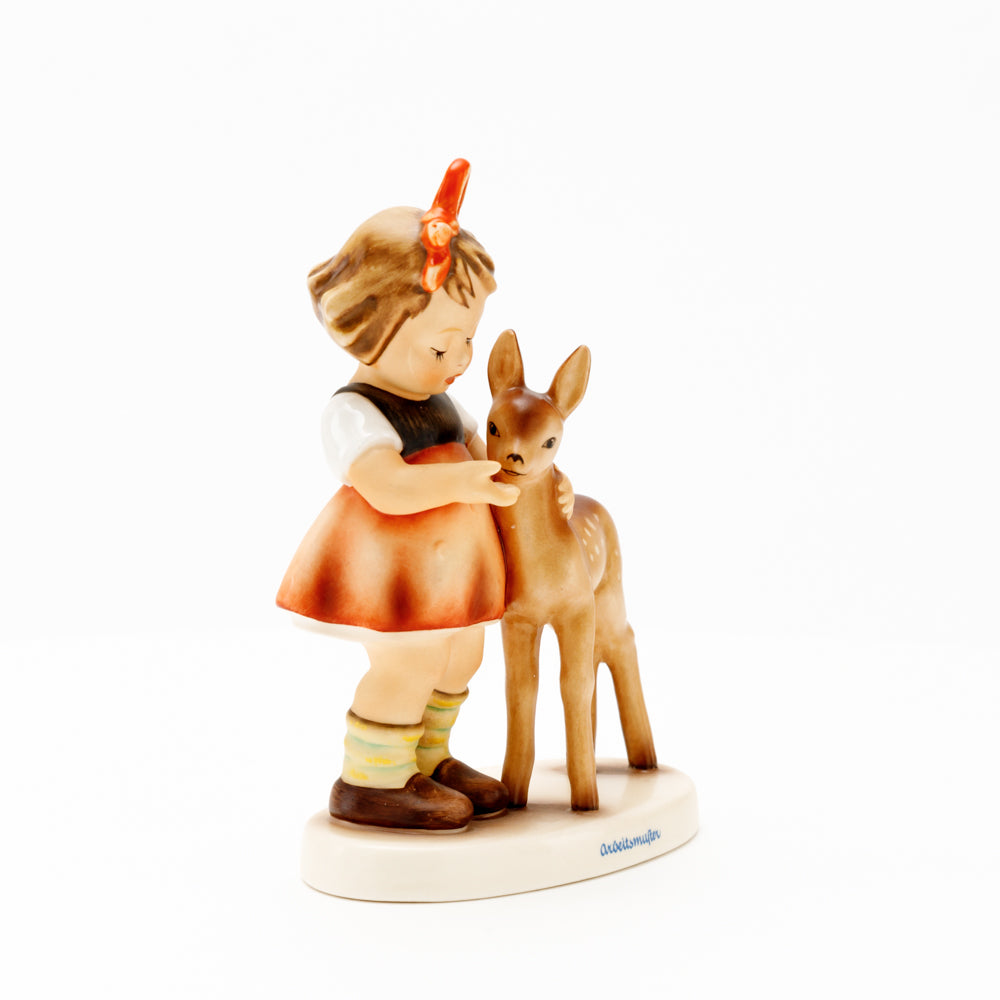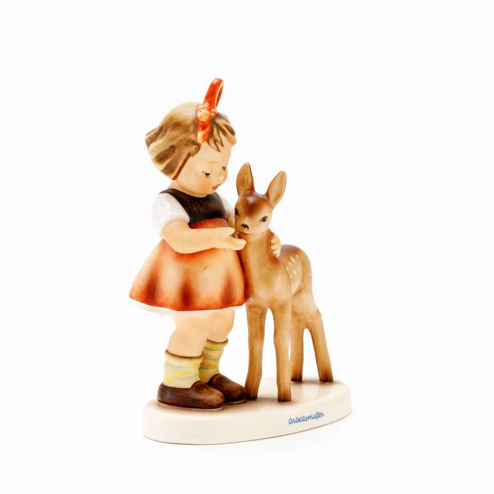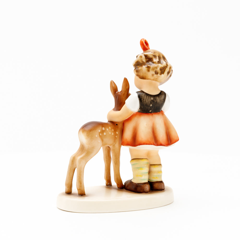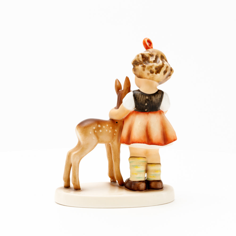 Immer wieder hat Schwester Maria Innocentia die Liebe der Kinder zu Tieren in ihren Zeichnungen aufgegriffen. So sind über die Jahre auch immer mehr Figuren in der Hummel Manufaktur gestaltet worden, die die Zuneigung zwischen Mensch und Tier ausdrücken. „Gute Freunde“ ist eine davon. Die Figur zeigt ein kleines Hummel-Mädchen mit ihrem Rehkitz, dessen hellbraunes Fell herrlich in der Sonne glänzt. Die Figur wurde 1940 von Reinhold Unger modelliert. Die Tupfer auf dem Fell des Rehs sind in zwei oder drei Reihen angeordnet. Die Variante in Terrakotta Finish ist sehr limitiert und daher ein rares Sammlerstück.