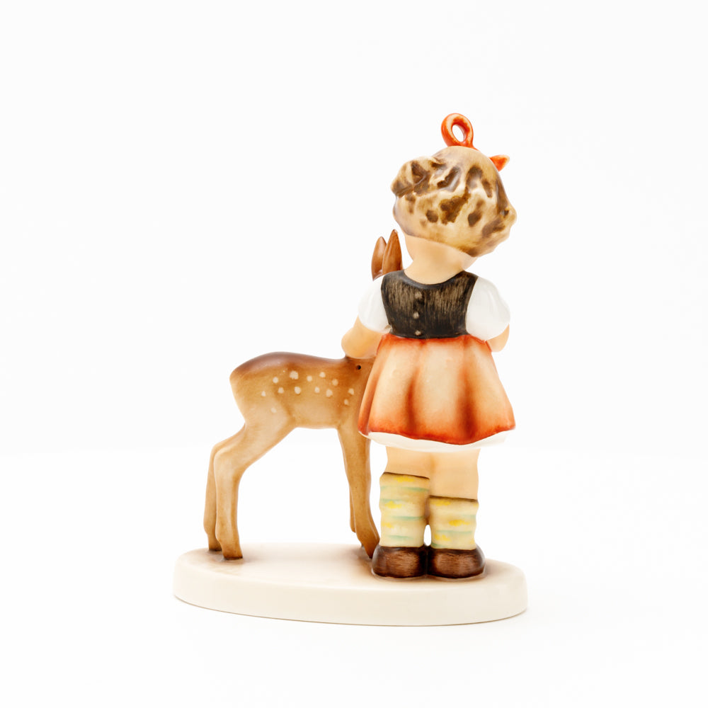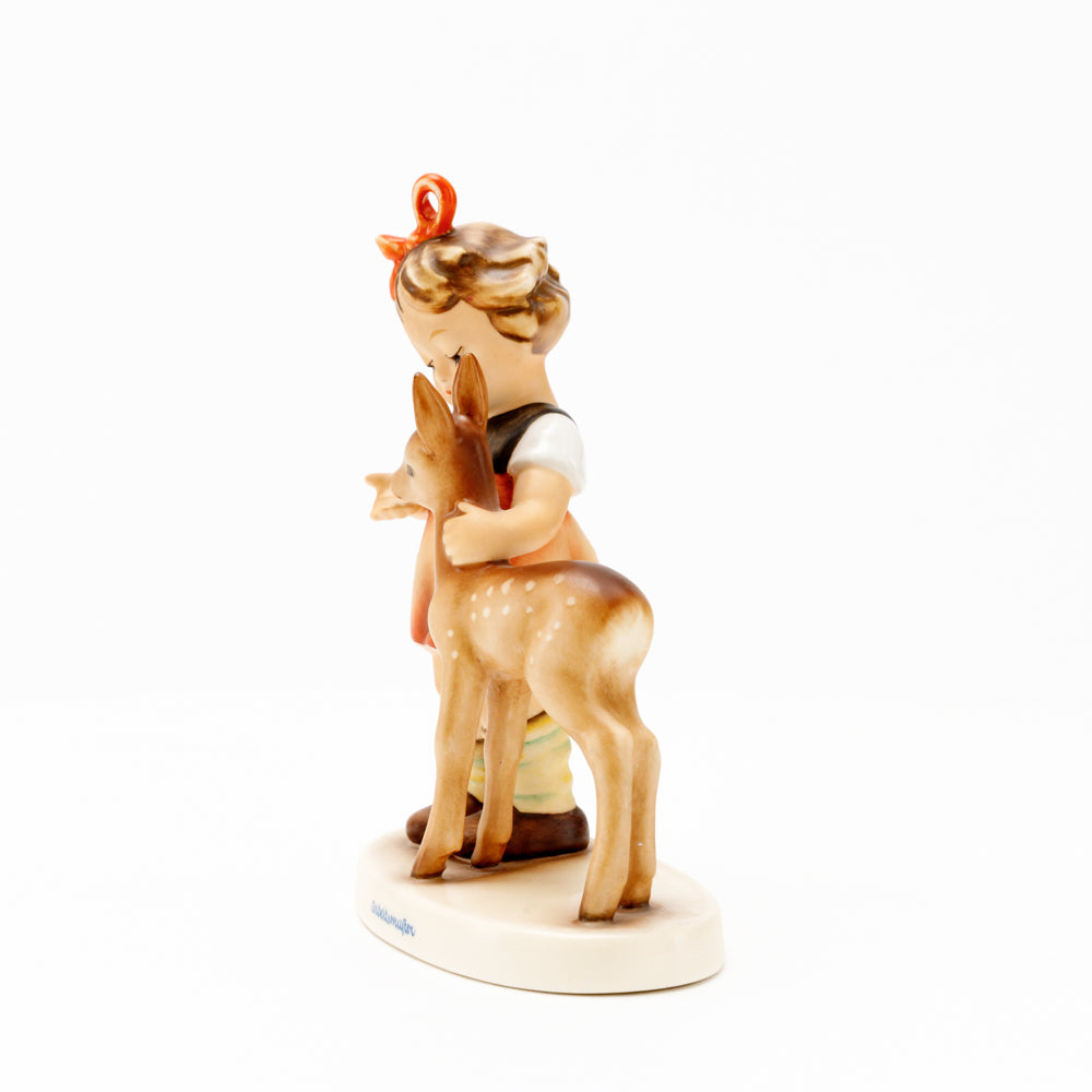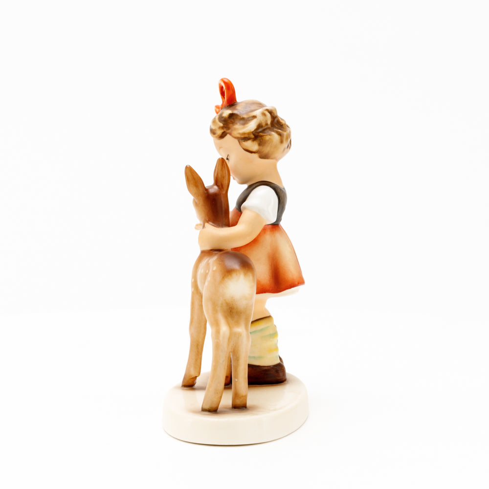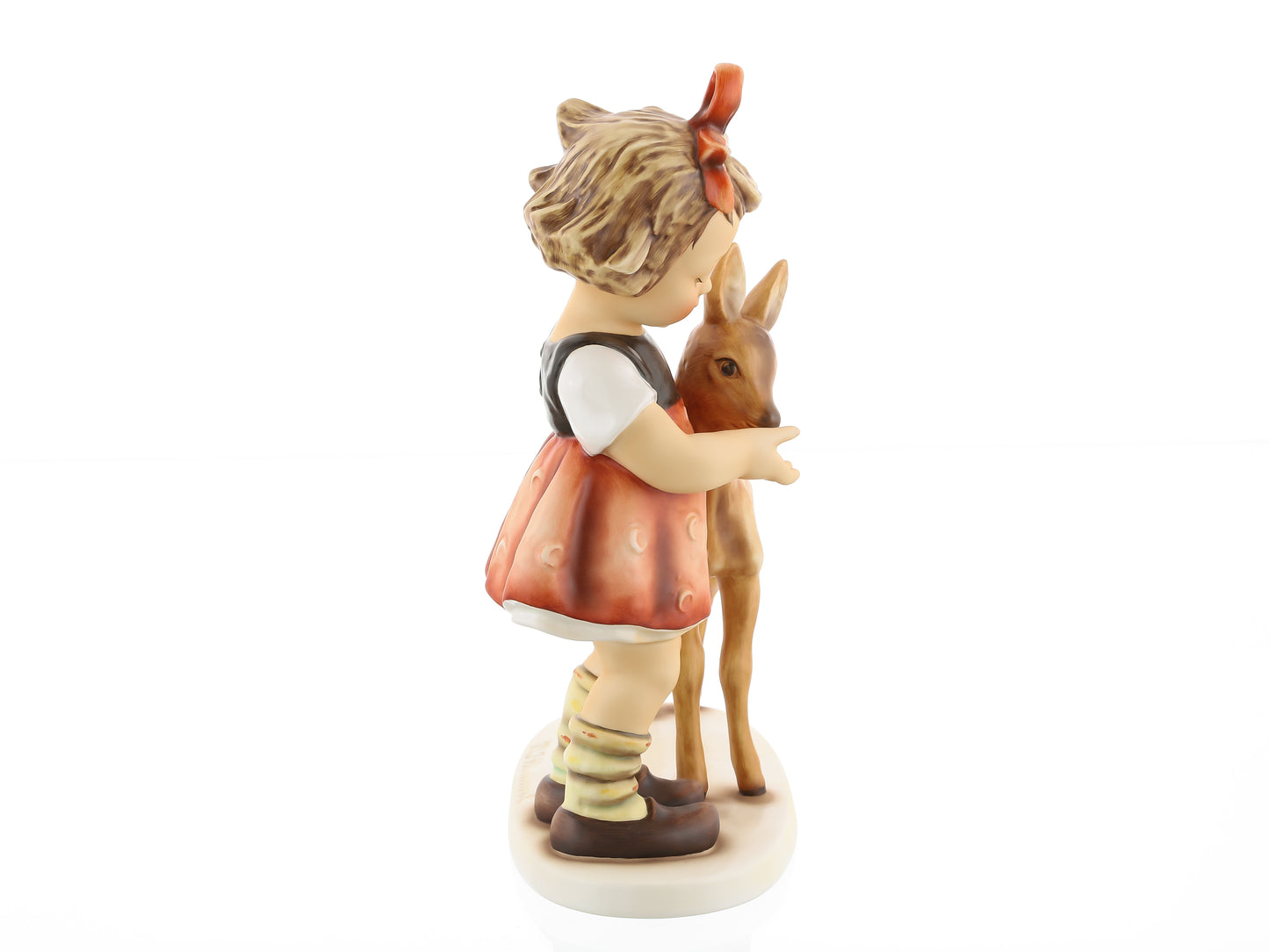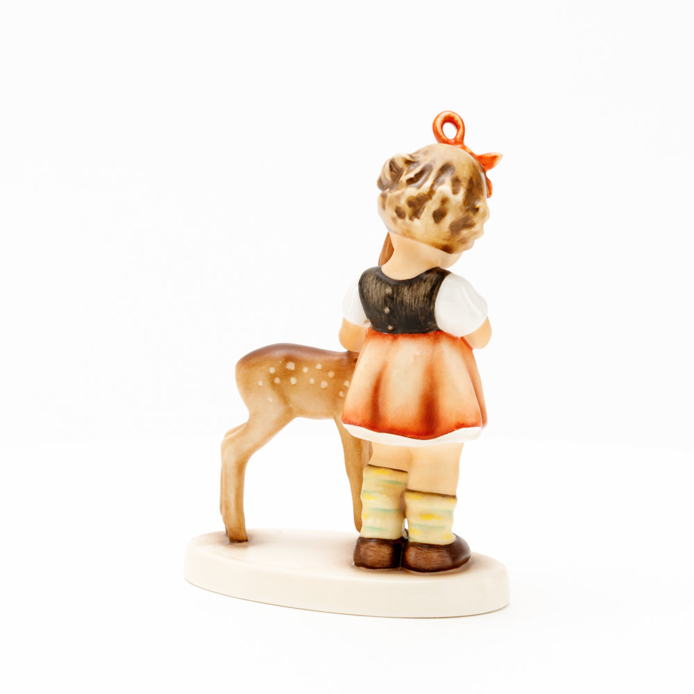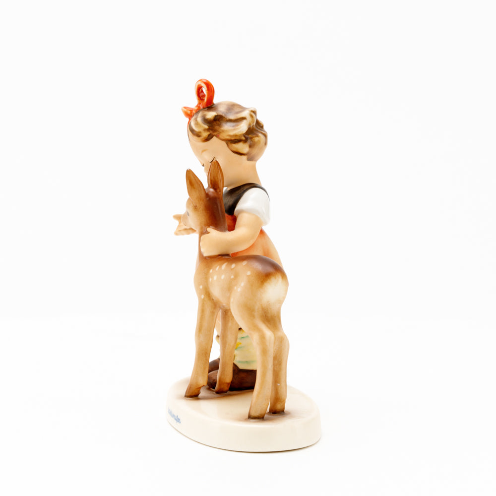 Immer wieder hat Schwester Maria Innocentia die Liebe der Kinder zu Tieren in ihren Zeichnungen aufgegriffen. So sind über die Jahre auch immer mehr Figuren in der Hummel Manufaktur gestaltet worden, die die Zuneigung zwischen Mensch und Tier ausdrücken. „Gute Freunde“ ist eine davon. Die Figur zeigt ein kleines Hummel-Mädchen mit ihrem Rehkitz, dessen hellbraunes Fell herrlich in der Sonne glänzt. Die Figur wurde 1940 von Reinhold Unger modelliert. Die Tupfer auf dem Fell des Rehs sind in zwei oder drei Reihen angeordnet. Die Variante in Terrakotta Finish ist sehr limitiert und daher ein rares Sammlerstück.