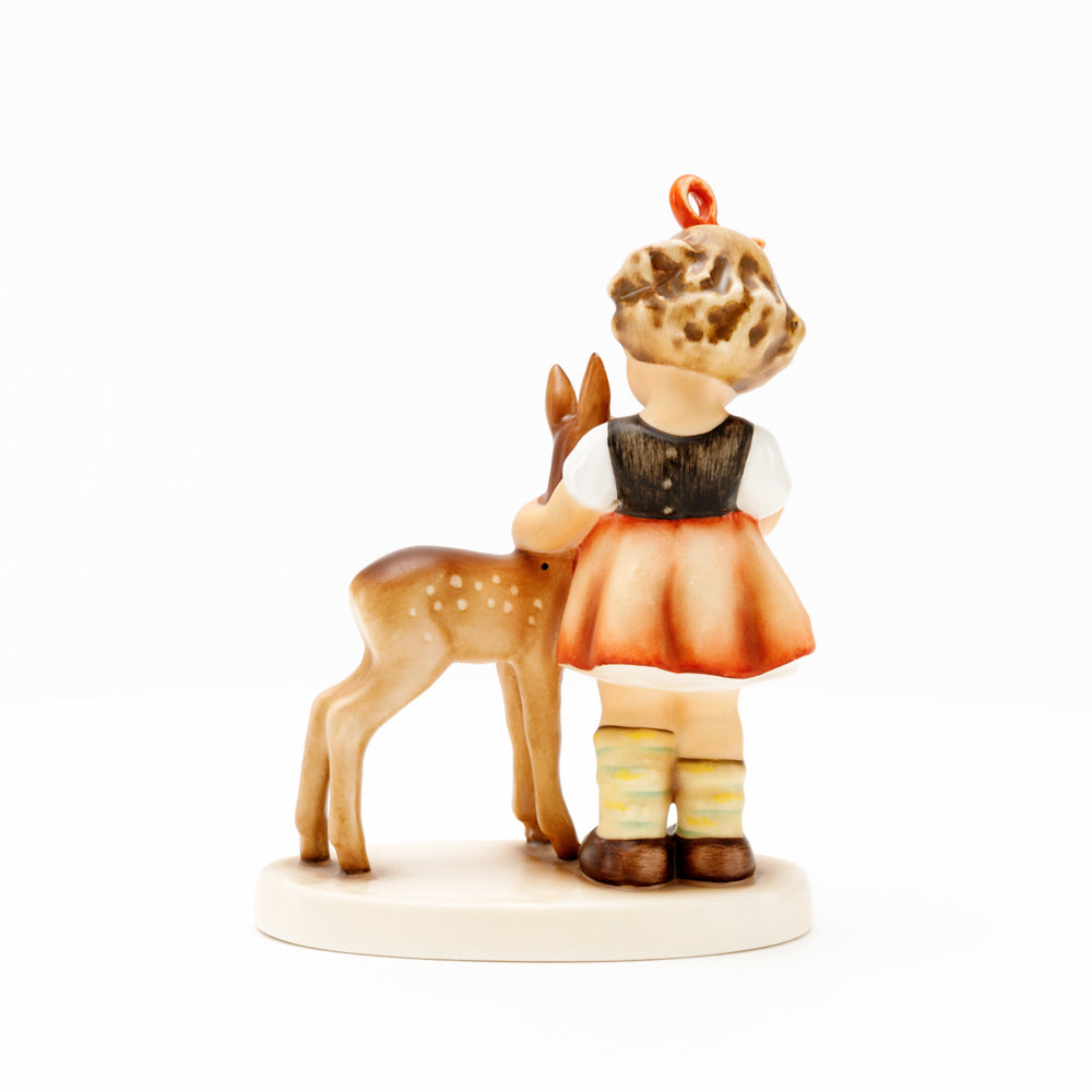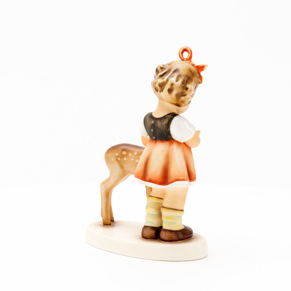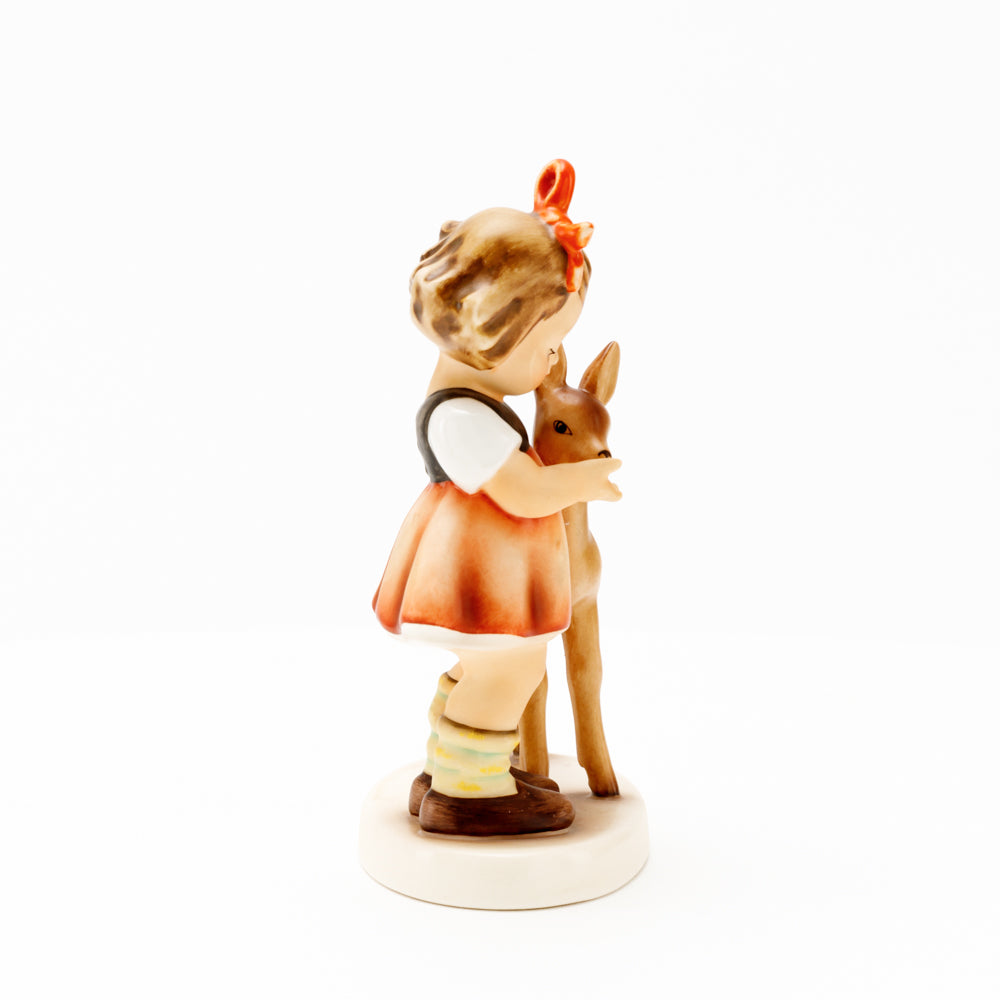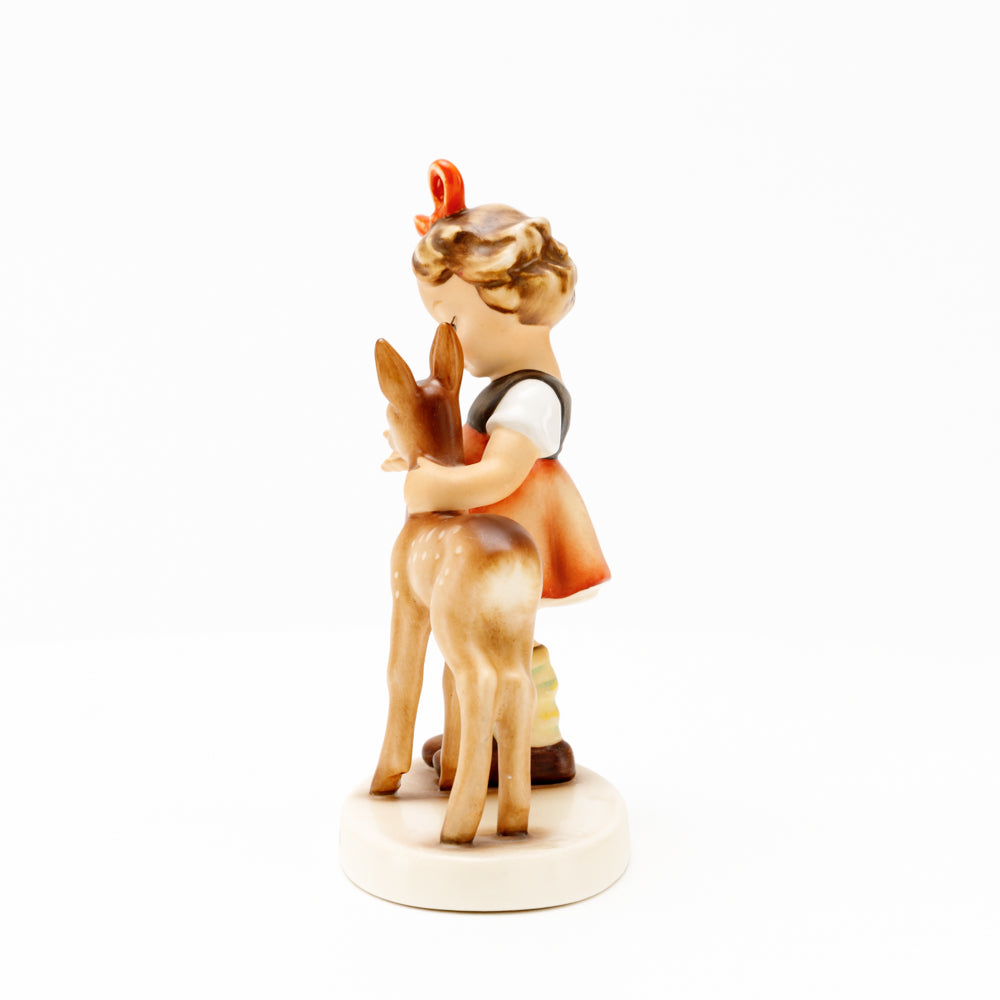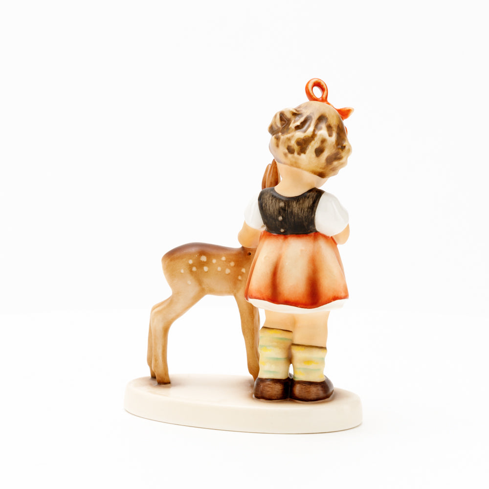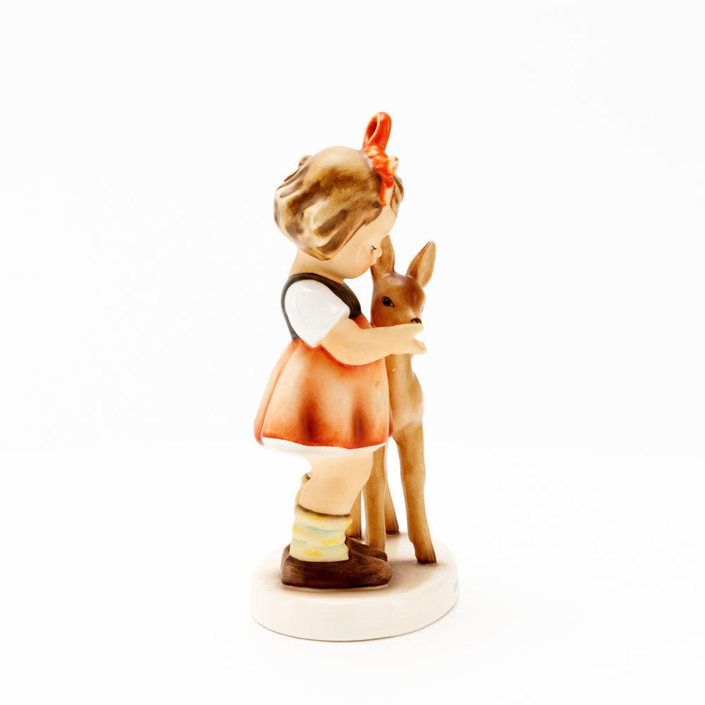 Immer wieder hat Schwester Maria Innocentia die Liebe der Kinder zu Tieren in ihren Zeichnungen aufgegriffen. So sind über die Jahre auch immer mehr Figuren in der Hummel Manufaktur gestaltet worden, die die Zuneigung zwischen Mensch und Tier ausdrücken. „Gute Freunde“ ist eine davon. Die Figur zeigt ein kleines Hummel-Mädchen mit ihrem Rehkitz, dessen hellbraunes Fell herrlich in der Sonne glänzt. Die Figur wurde 1940 von Reinhold Unger modelliert. Die Tupfer auf dem Fell des Rehs sind in zwei oder drei Reihen angeordnet. Die Variante in Terrakotta Finish ist sehr limitiert und daher ein rares Sammlerstück.