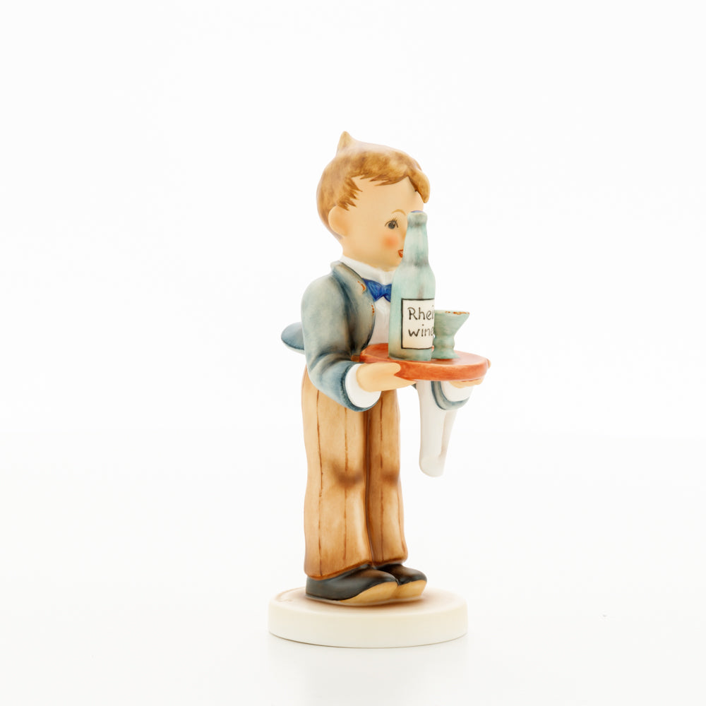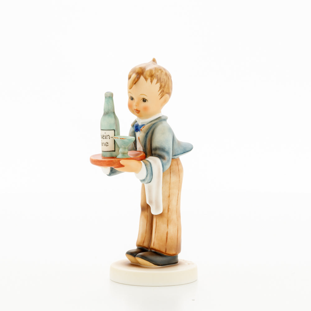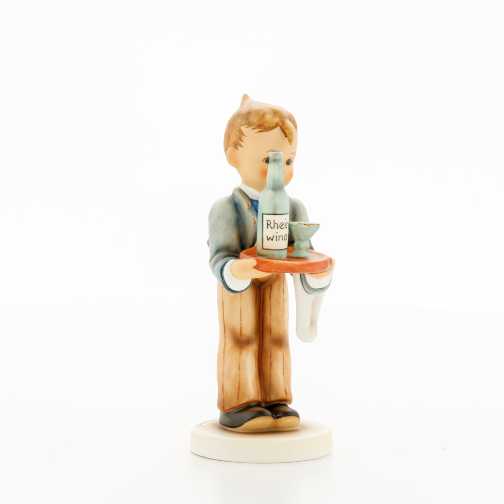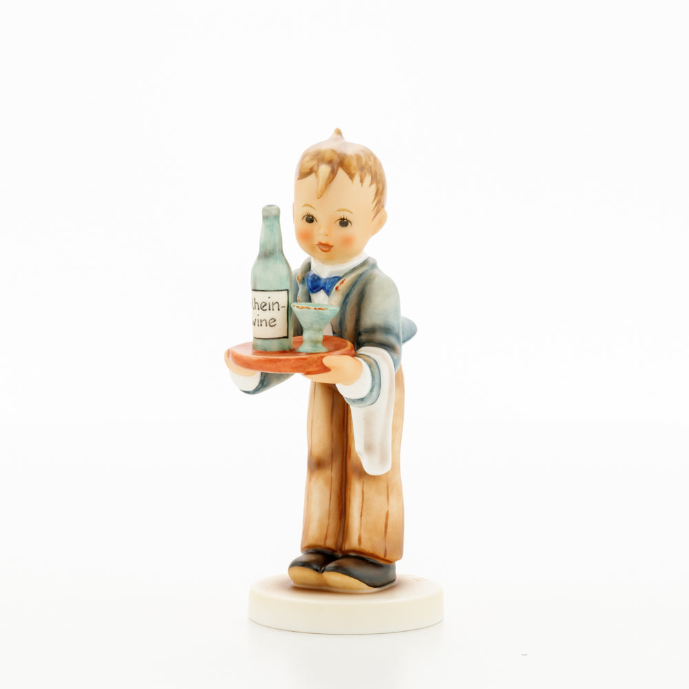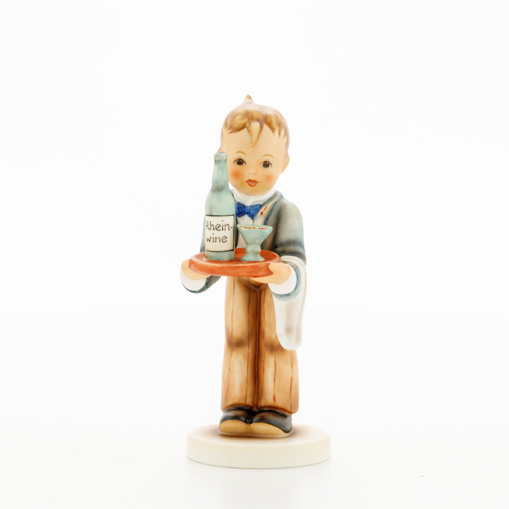 "Bloß nicht fallen lassen!" Vorsichtig und konzentriert trägt der Ober aus der Hummel Manufaktur Rödental das mit Getränken bestückte Tablett zu Tisch. Die original M.I. Hummel-Figur wurde 1943 von Arthur Möller gestaltet und war zunächst mit grauer Jacke und grau gestreifter Hose gekleidet. Anfang der 50er-Jahre wurde die bezaubernde Hummel-Figur "umgekleidet". Denn ab diesem Zeitpunkt war der Ober aus dem Hause Hummel in blauer Jacke und braun gestreifter Hose zu sehen. Darüber hinaus ist der geschäftige Hummel-Bub in zwei verschiedenen Größen erhältlich. Die Hummel-Figur, die ebenfalls nach den original Zeichnungen der Schwester Maria Innocentia Hummel gestaltet wurde, ist ein ideales Geschenk zur bestandenen Prüfung der Berufsschule oder aber auch zum Renteneintritt für Personen, die in dem entsprechenden Beruf gearbeitet haben.