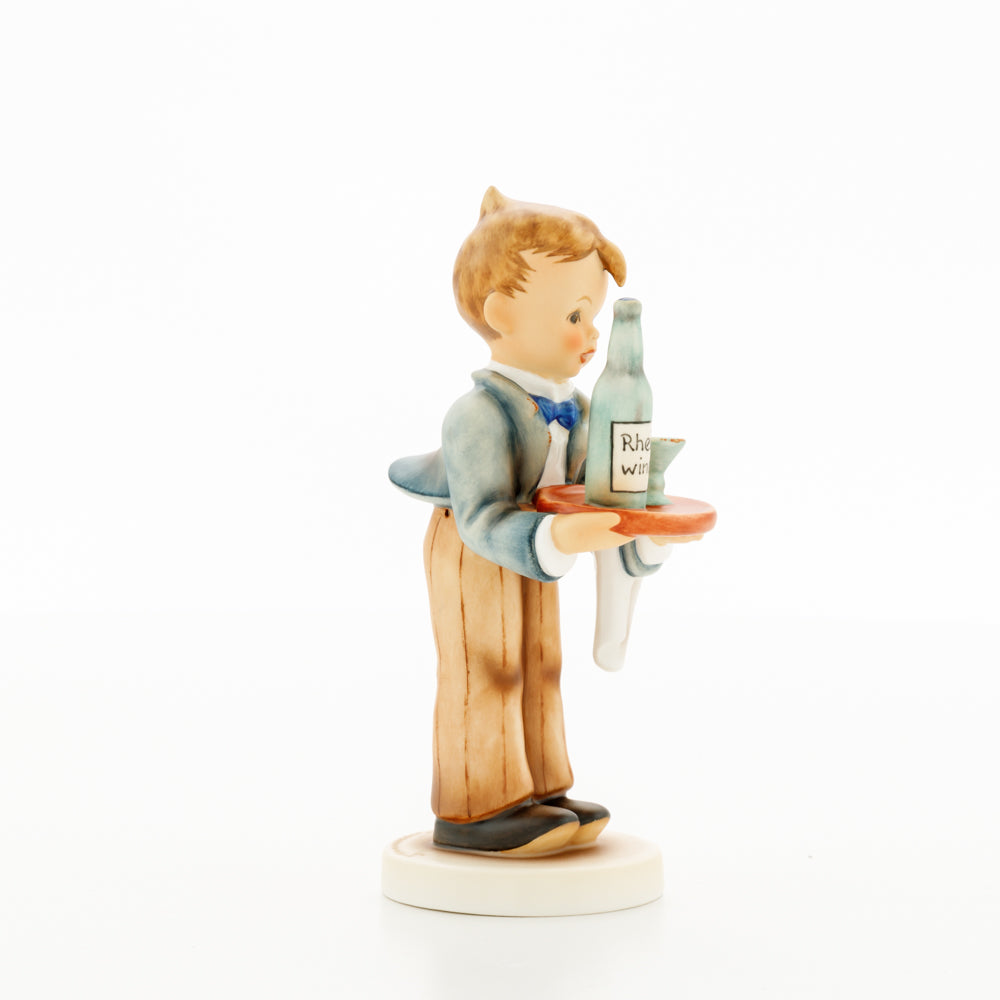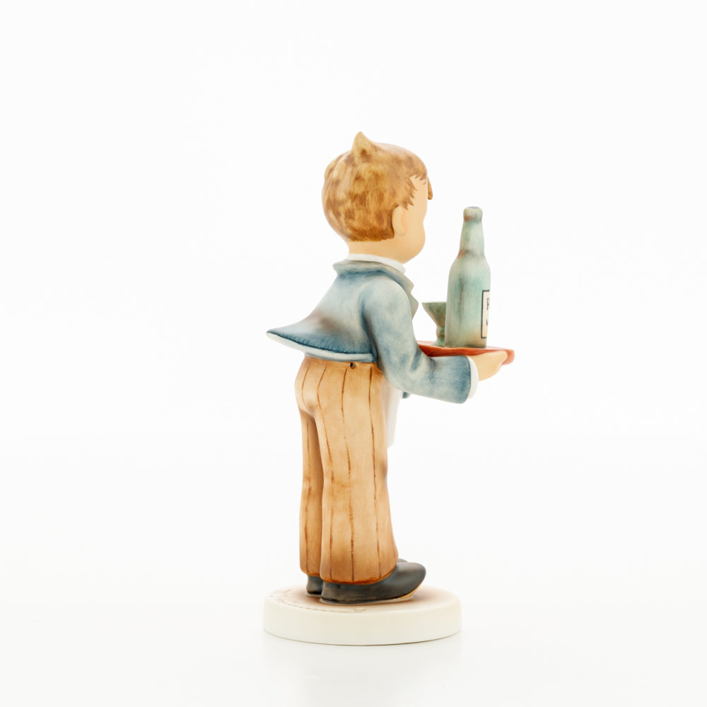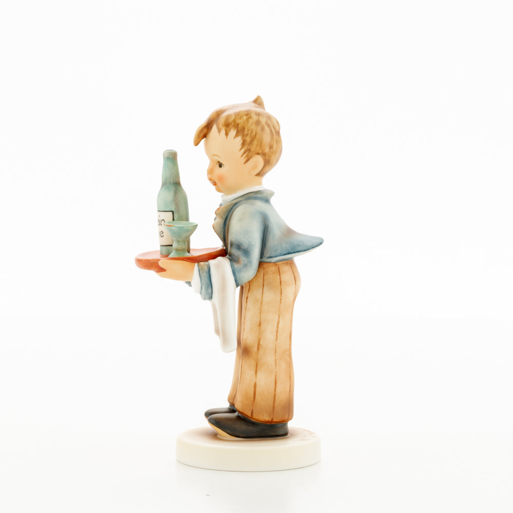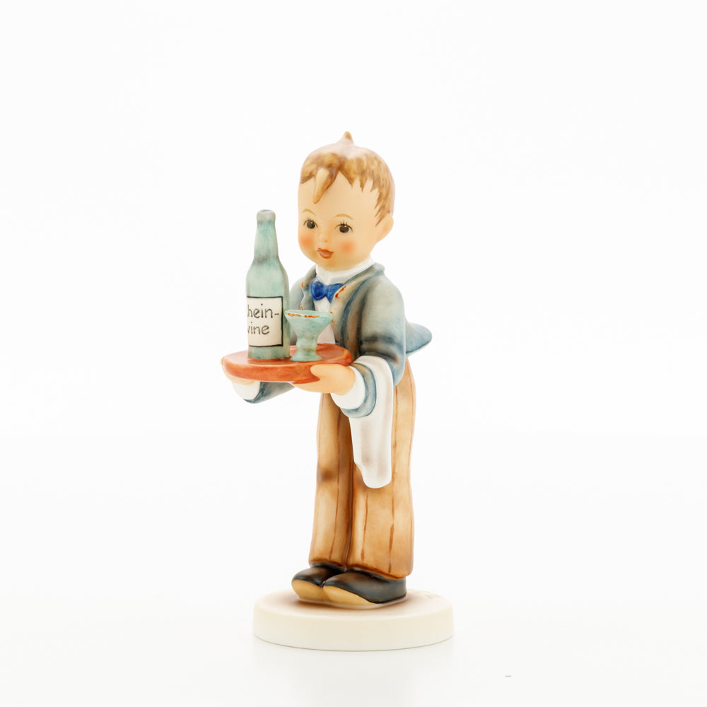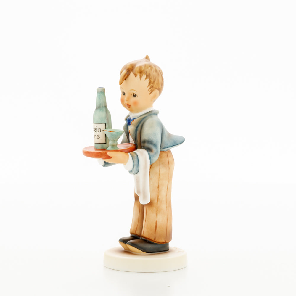 "Bloß nicht fallen lassen!" Vorsichtig und konzentriert trägt der Ober aus der Hummel Manufaktur Rödental das mit Getränken bestückte Tablett zu Tisch. Die original M.I. Hummel-Figur wurde 1943 von Arthur Möller gestaltet und war zunächst mit grauer Jacke und grau gestreifter Hose gekleidet. Anfang der 50er-Jahre wurde die bezaubernde Hummel-Figur "umgekleidet". Denn ab diesem Zeitpunkt war der Ober aus dem Hause Hummel in blauer Jacke und braun gestreifter Hose zu sehen. Darüber hinaus ist der geschäftige Hummel-Bub in zwei verschiedenen Größen erhältlich. Die Hummel-Figur, die ebenfalls nach den original Zeichnungen der Schwester Maria Innocentia Hummel gestaltet wurde, ist ein ideales Geschenk zur bestandenen Prüfung der Berufsschule oder aber auch zum Renteneintritt für Personen, die in dem entsprechenden Beruf gearbeitet haben.
