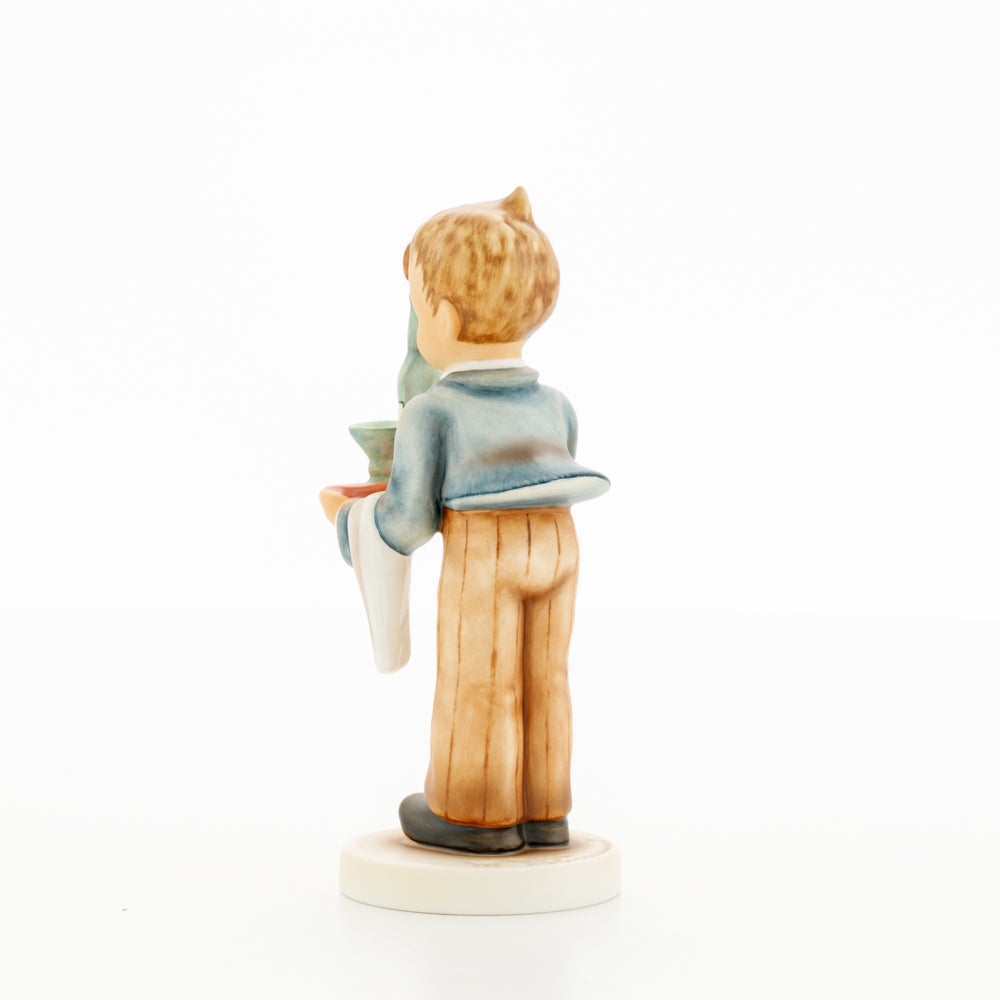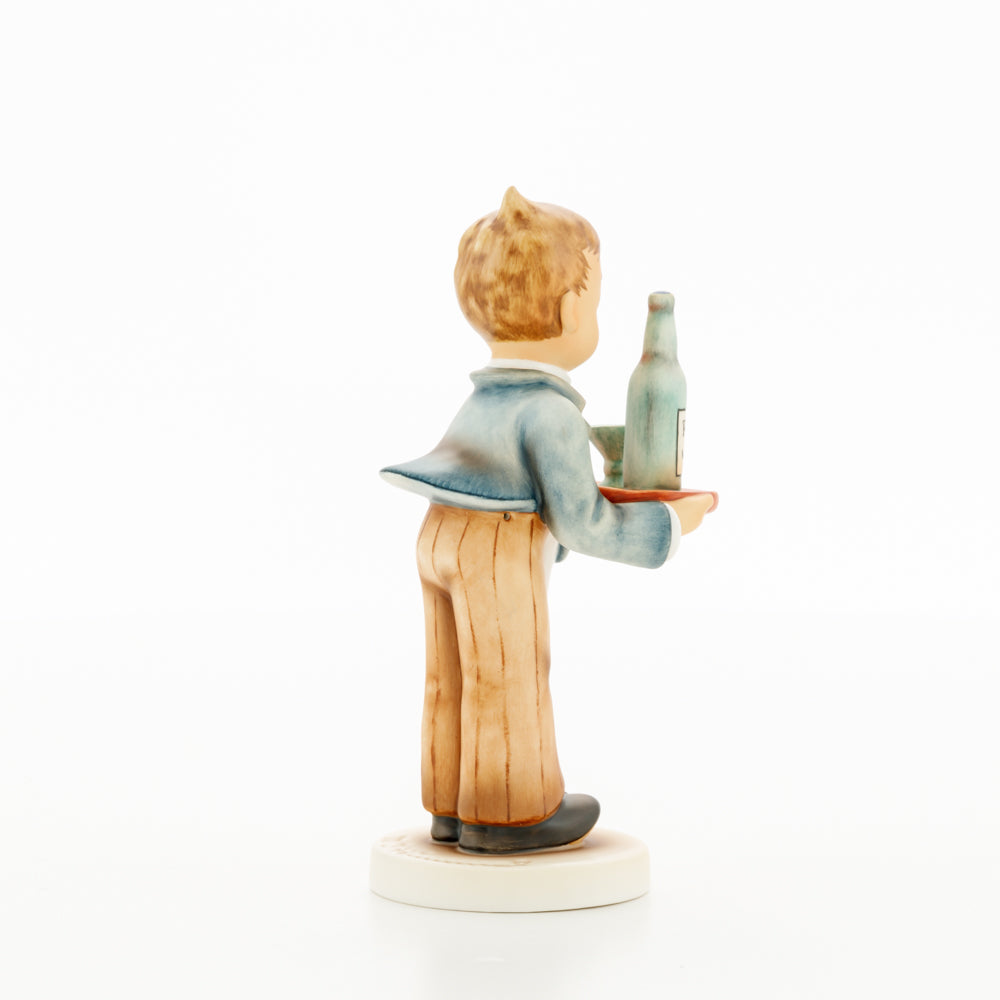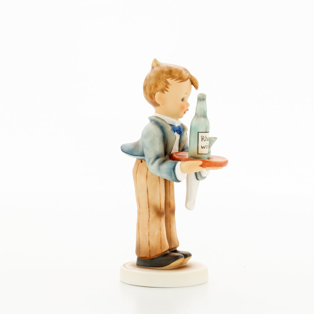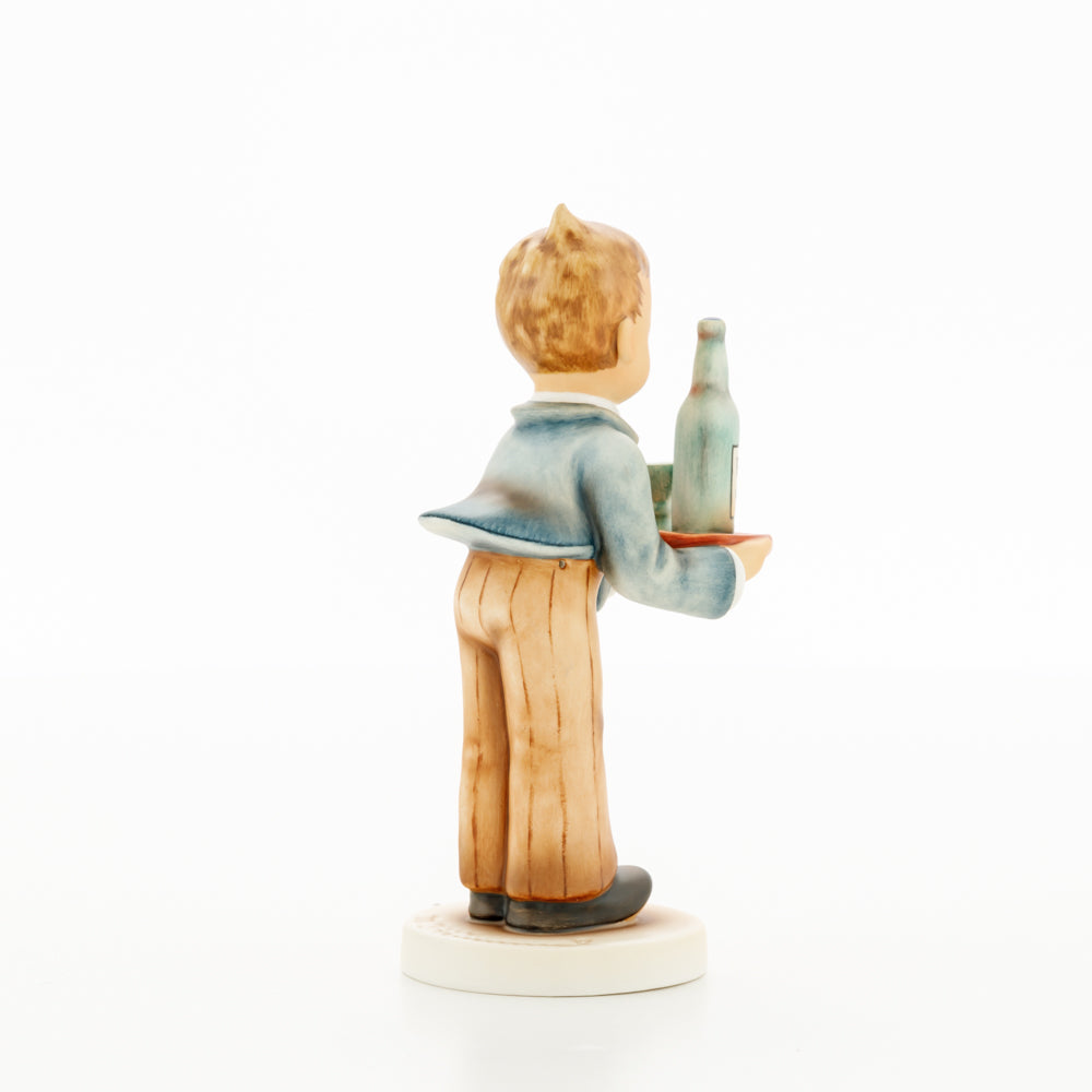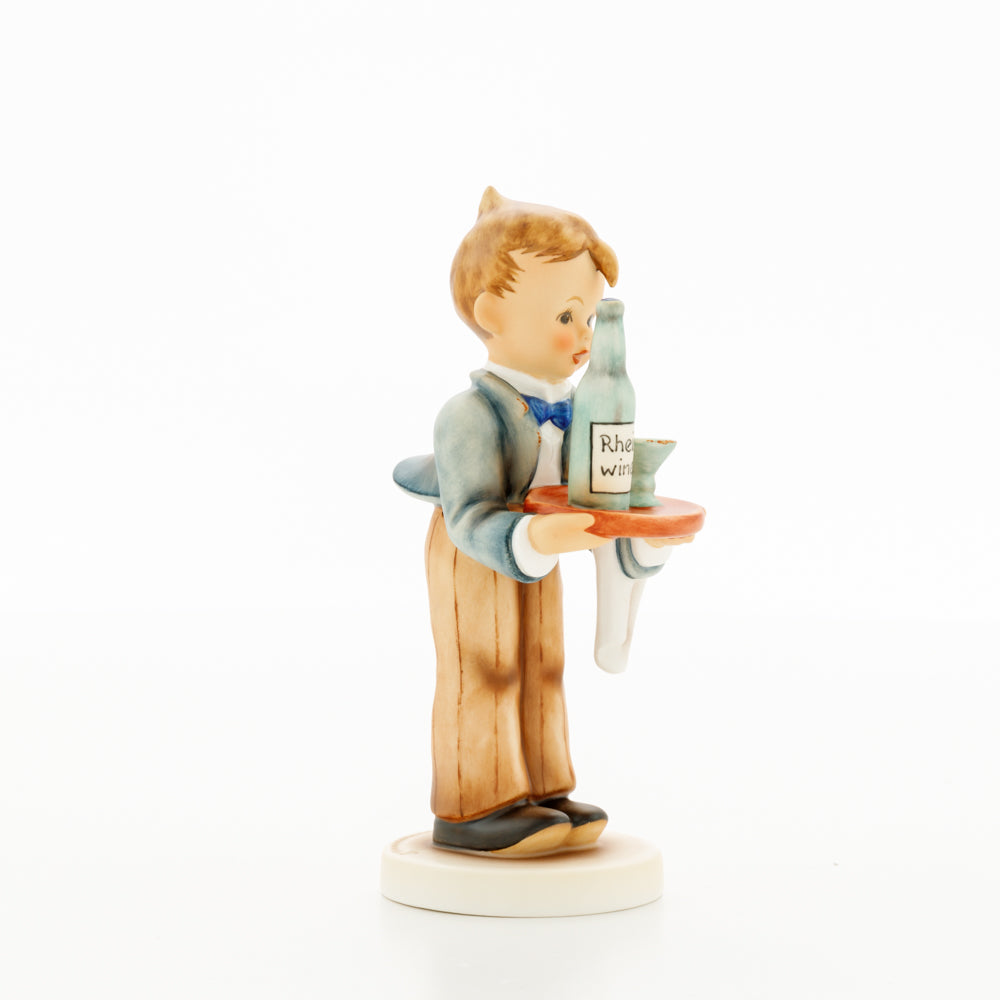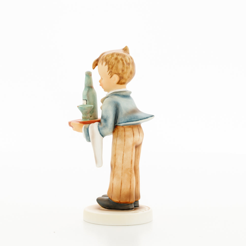 "Bloß nicht fallen lassen!" Vorsichtig und konzentriert trägt der Ober aus der Hummel Manufaktur Rödental das mit Getränken bestückte Tablett zu Tisch. Die original M.I. Hummel-Figur wurde 1943 von Arthur Möller gestaltet und war zunächst mit grauer Jacke und grau gestreifter Hose gekleidet. Anfang der 50er-Jahre wurde die bezaubernde Hummel-Figur "umgekleidet". Denn ab diesem Zeitpunkt war der Ober aus dem Hause Hummel in blauer Jacke und braun gestreifter Hose zu sehen. Darüber hinaus ist der geschäftige Hummel-Bub in zwei verschiedenen Größen erhältlich. Die Hummel-Figur, die ebenfalls nach den original Zeichnungen der Schwester Maria Innocentia Hummel gestaltet wurde, ist ein ideales Geschenk zur bestandenen Prüfung der Berufsschule oder aber auch zum Renteneintritt für Personen, die in dem entsprechenden Beruf gearbeitet haben.