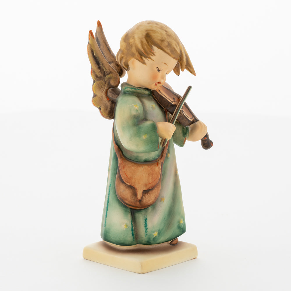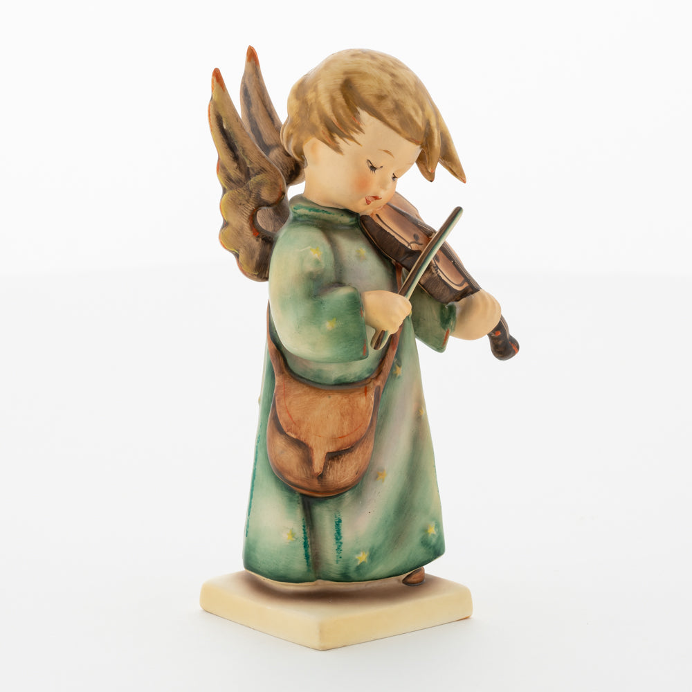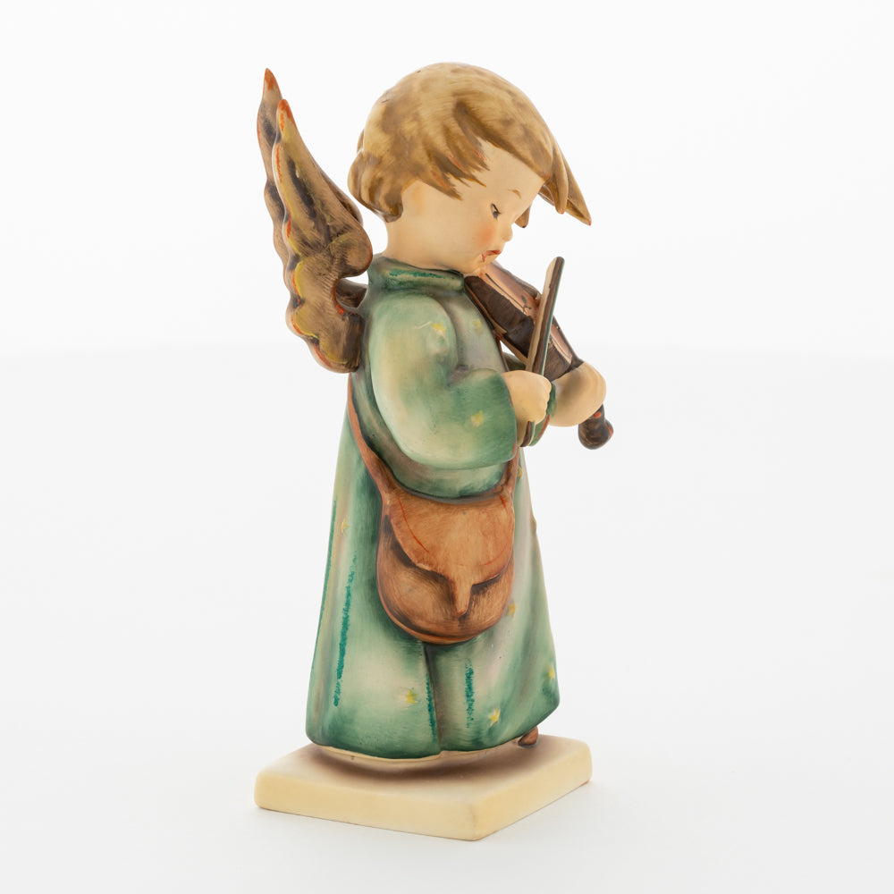 Was der kleine Geigenspieler wohl spielt? Gewiss sind es himmlische Klänge. Reinhold Unger gestaltete im Jahr 1948 diese Figur, die in der hier angebotenen Größe niemals nennenswert verändert wurde. Zu sehen ist ein blonder Engel mit einem waldgrünen Gewand, das von zarten Himmelssternen bedeckt ist. In seiner Hand hält er eine Violine. Man meint fast, die Melodie hören zu können. Sein Blick ist auf das Instrument gesenkt, während er sich dem Spiel des Streichinstrumentes hingibt. Im Jahr 1983 modellierten Gerhard Skrobek und Maria Müller eine kleinere Version des Klassikers.