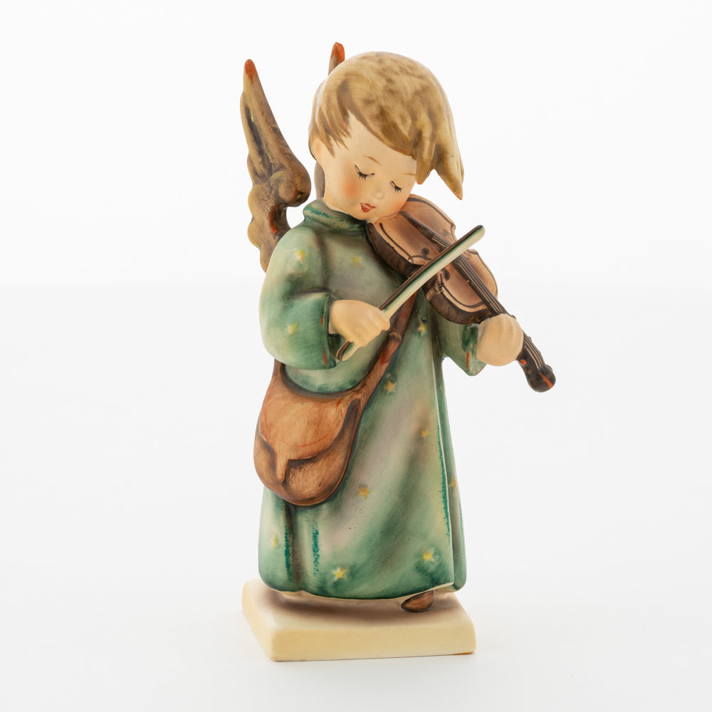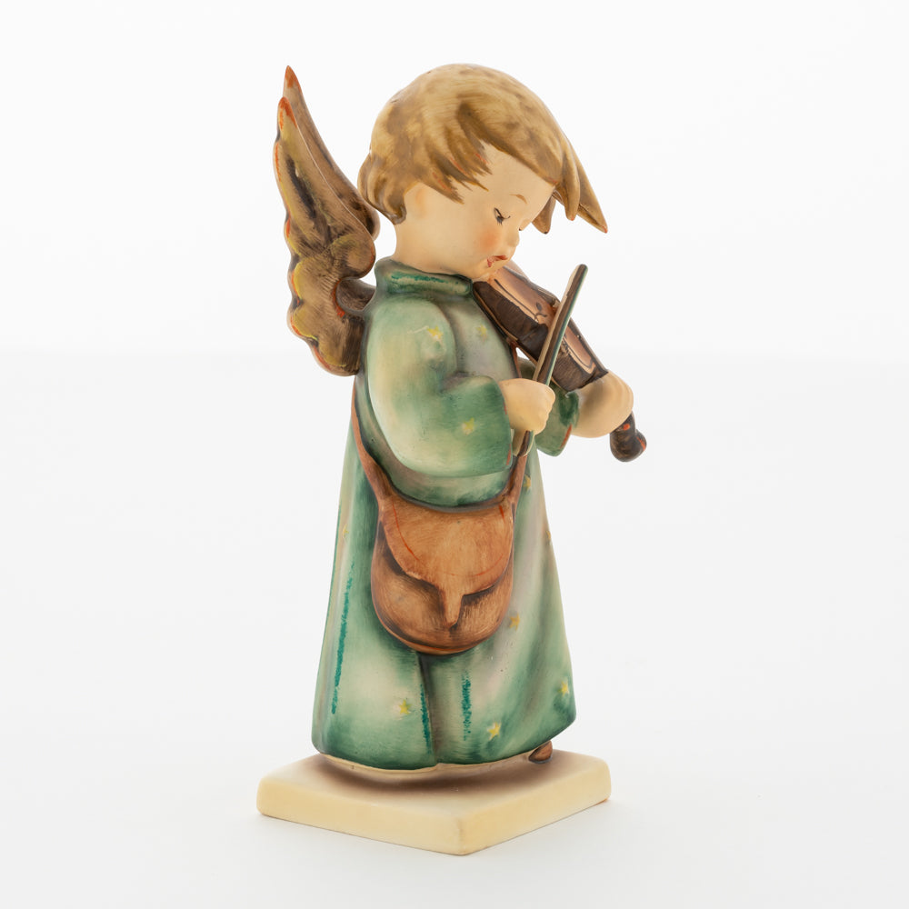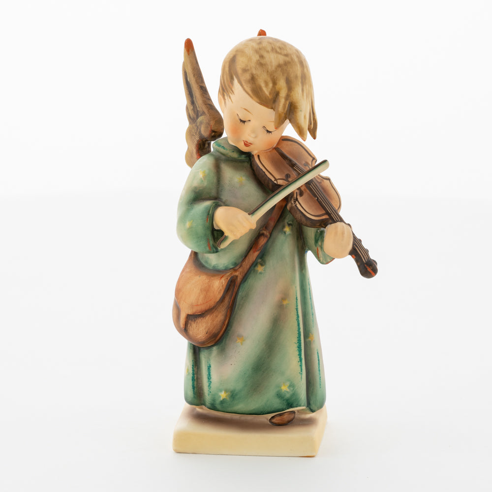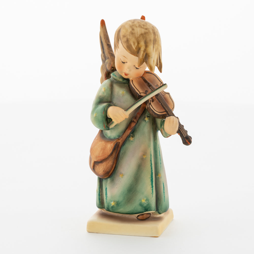 Was der kleine Geigenspieler wohl spielt? Gewiss sind es himmlische Klänge. Reinhold Unger gestaltete im Jahr 1948 diese Figur, die in der hier angebotenen Größe niemals nennenswert verändert wurde. Zu sehen ist ein blonder Engel mit einem waldgrünen Gewand, das von zarten Himmelssternen bedeckt ist. In seiner Hand hält er eine Violine. Man meint fast, die Melodie hören zu können. Sein Blick ist auf das Instrument gesenkt, während er sich dem Spiel des Streichinstrumentes hingibt. Im Jahr 1983 modellierten Gerhard Skrobek und Maria Müller eine kleinere Version des Klassikers.
