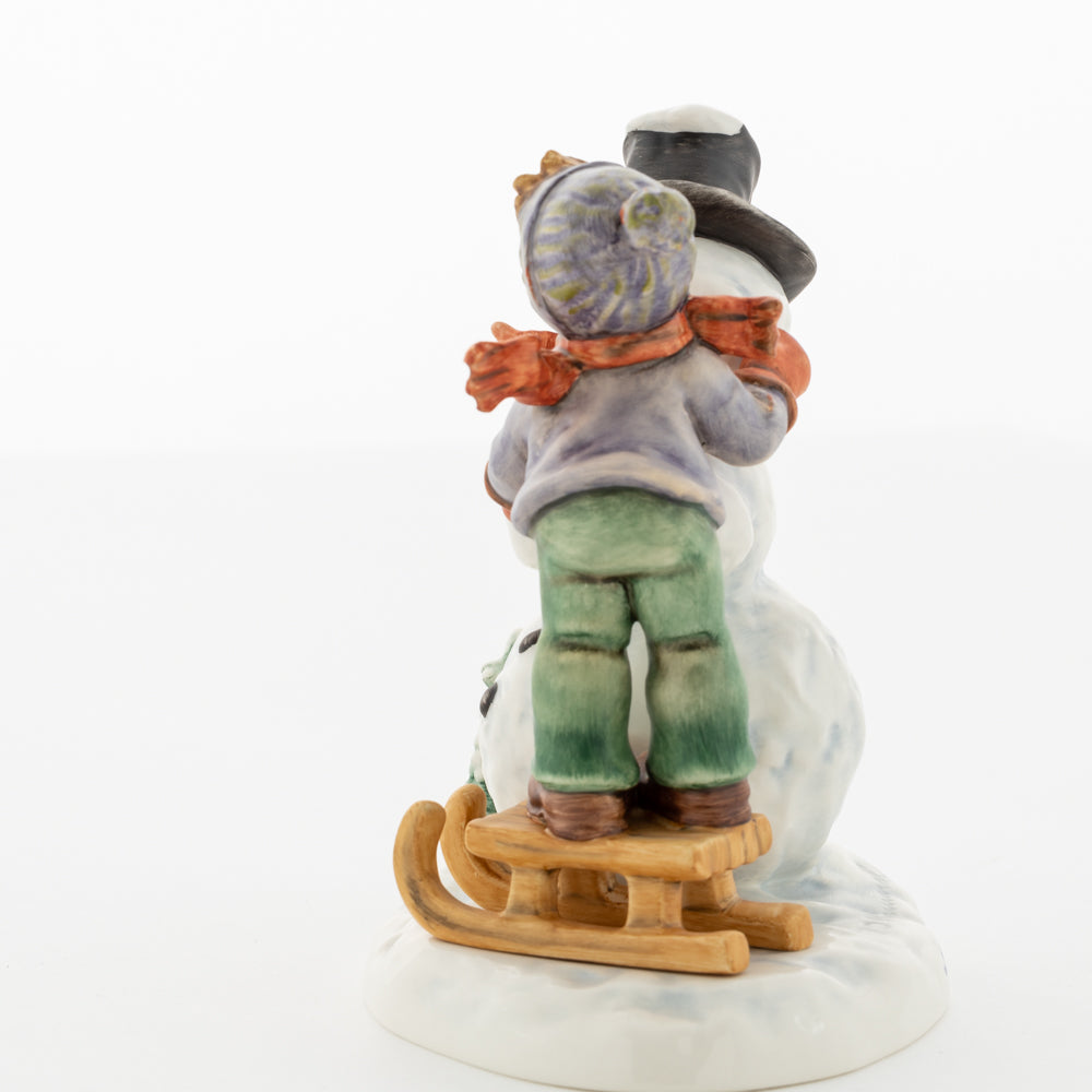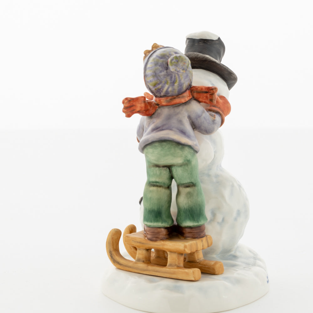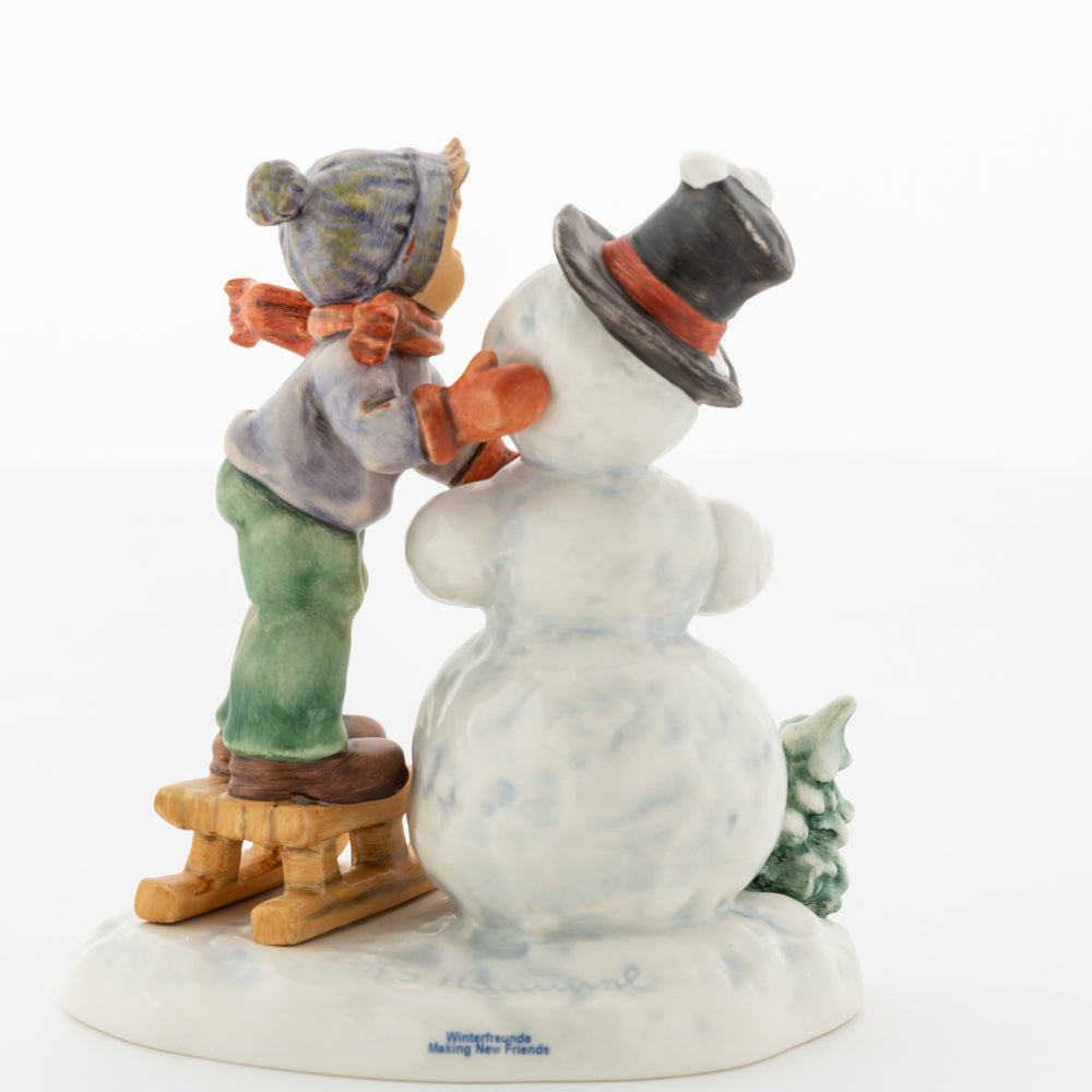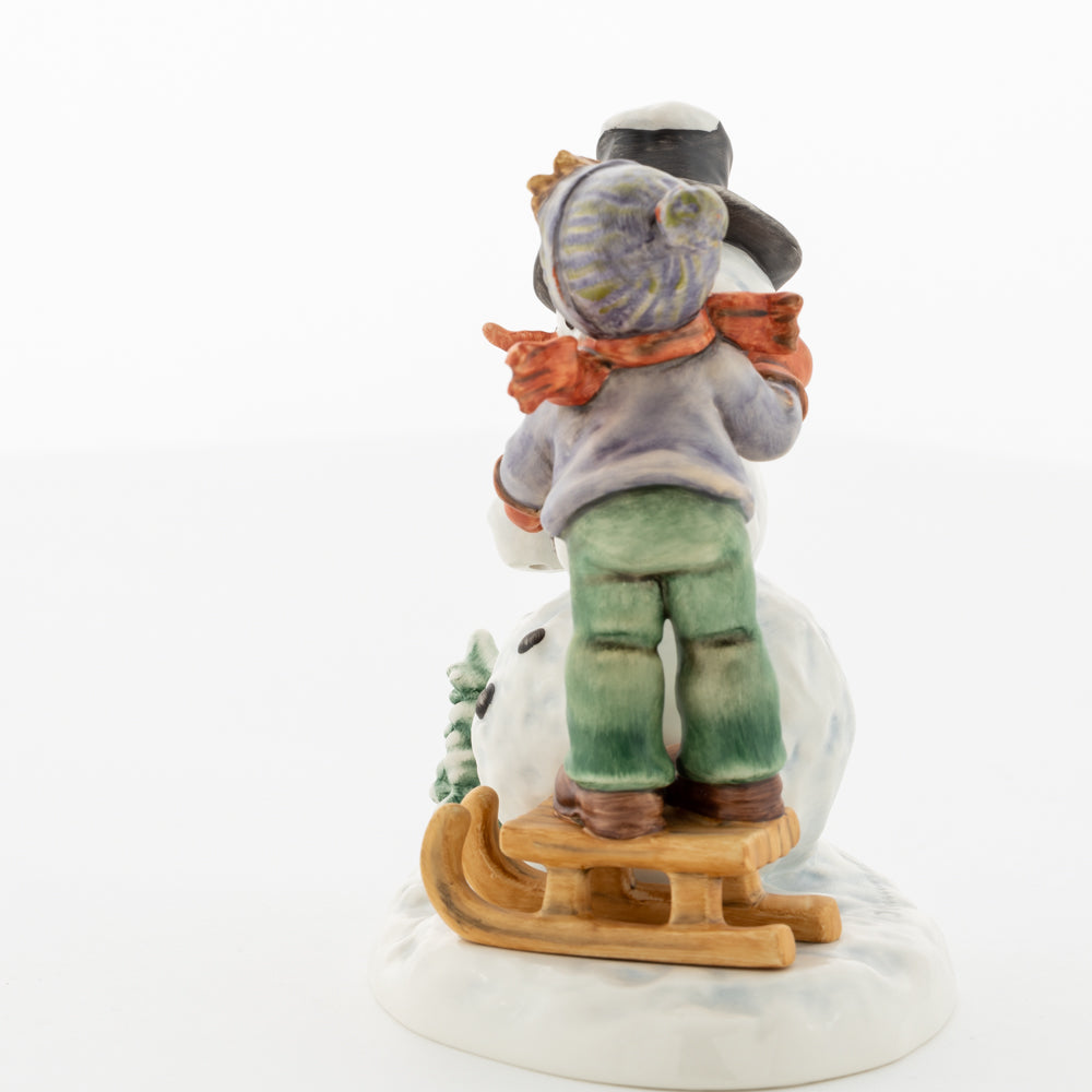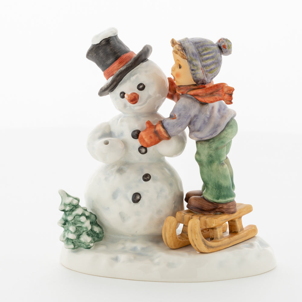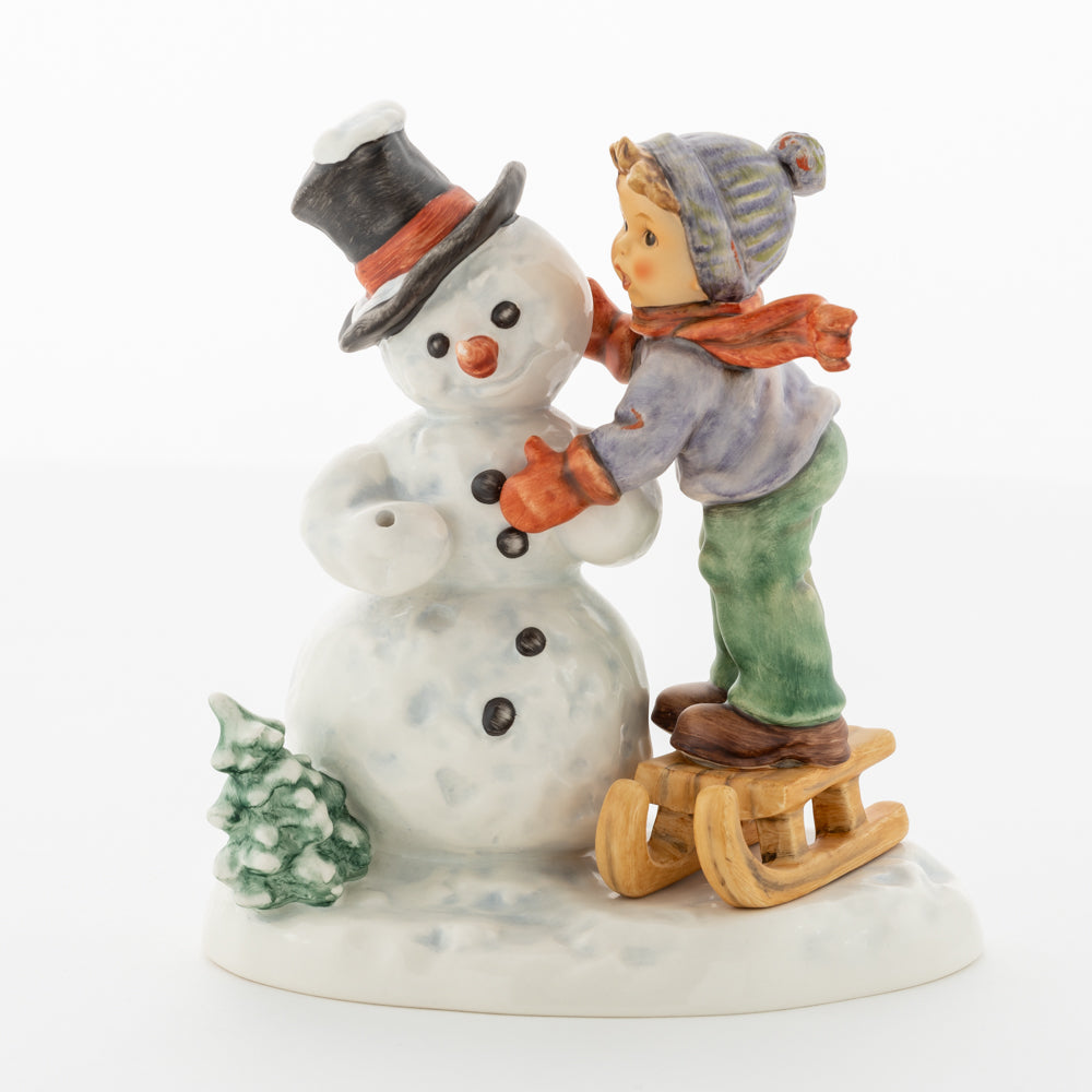 Ist er nicht gut gelungen? Stolz steht er da in seiner ganzen Pracht, der imposante Schneemann. Unser Hummel-Bub hat ihn mit schwarzen Zylinder und rotem Band festlich herausgeputzt. Schade, dass der kalte Geselle nicht mit in die warme Stube kann! Modelleur Helmut Fischer gelang eine detailreiche und liebevolle Winter-Szenerie. Fast meint man, den kalten Wind heulen zu hören, der dem eifrigen Hummel-Kind die Haare aus dem Gesicht und den Schal in die Luft wehen lässt. Wie gut, dass unser Bübchen dick eingemummelt seiner Beschäftigung nachgeht!