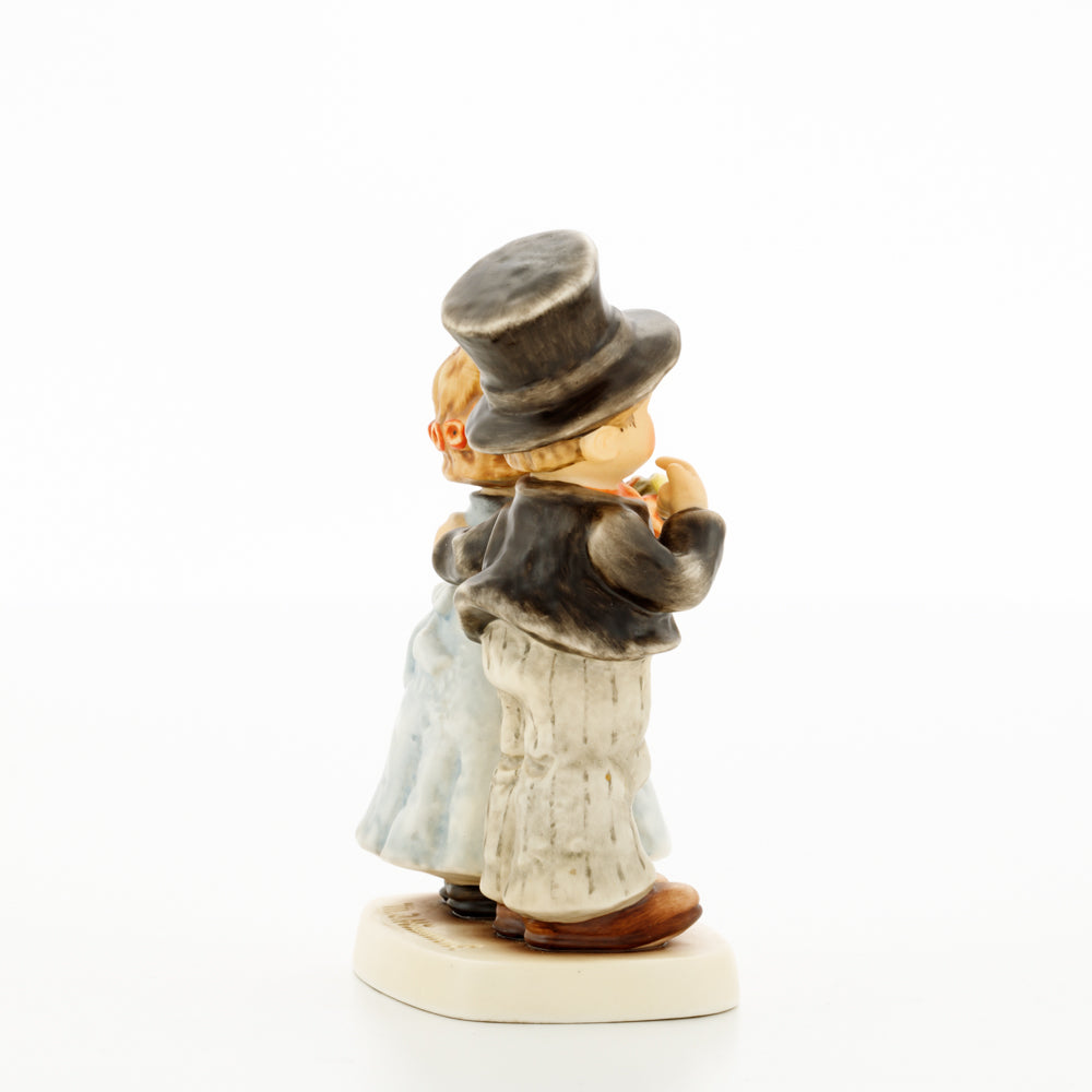 Diese original Hummel-Figur stammt aus der Hummel-Manufaktur im bayerischen Rödental und wird traditionell in reiner Handarbeit "made in Germany" gefertigt. Das frisch vermählte Pärchen wurde im Jahr 1997 von Meistermodelleur Helmut Fischer in strenger Anlehnung an die Originalzeichnungen der Franziskanerschwester Maria Innocentia Hummel kreiert. Die Schwester lebte und arbeitete im Kloster Sießen bei Siegmaringen und stammte aus Massing in Bayern.
