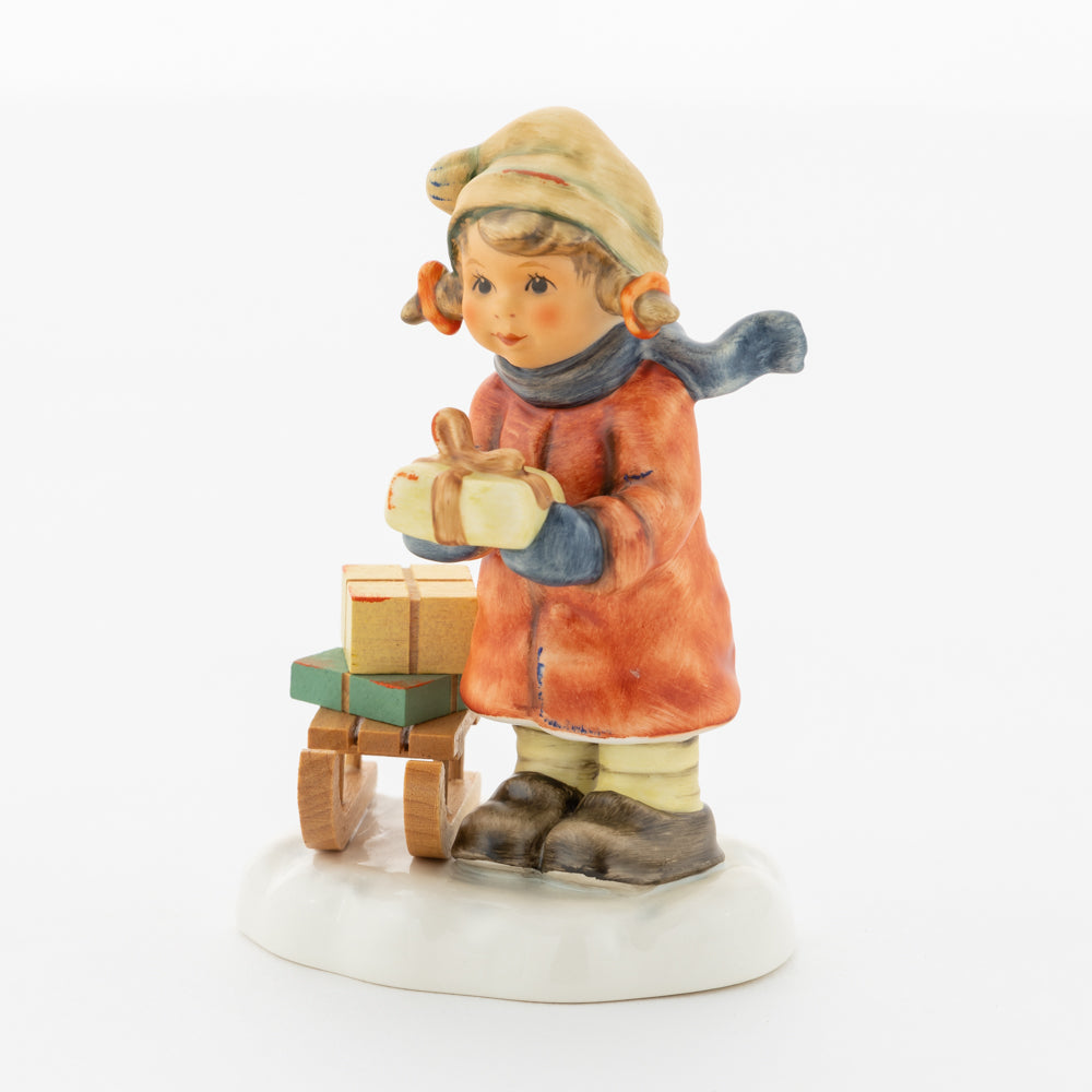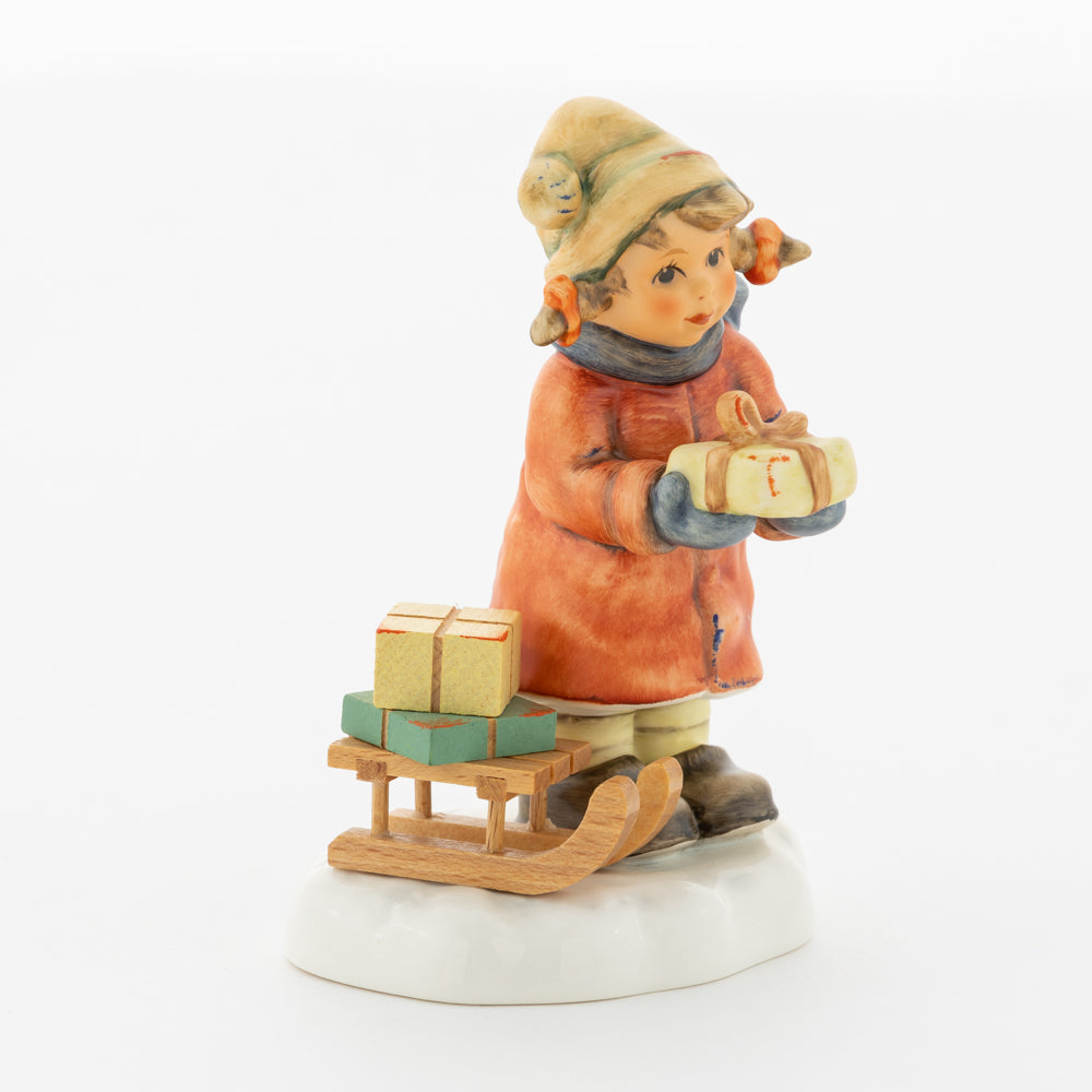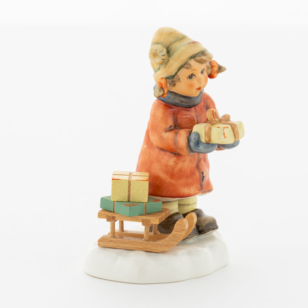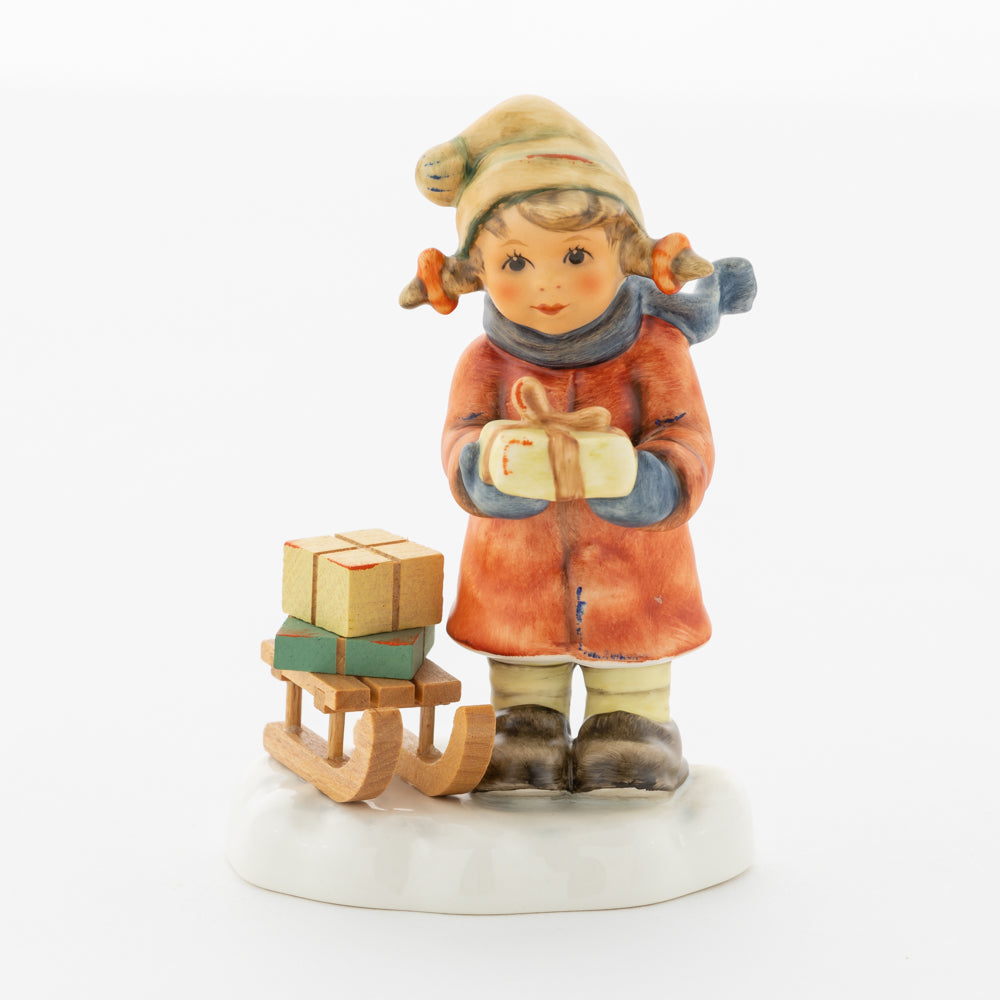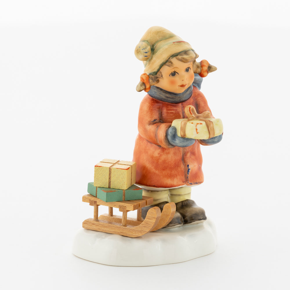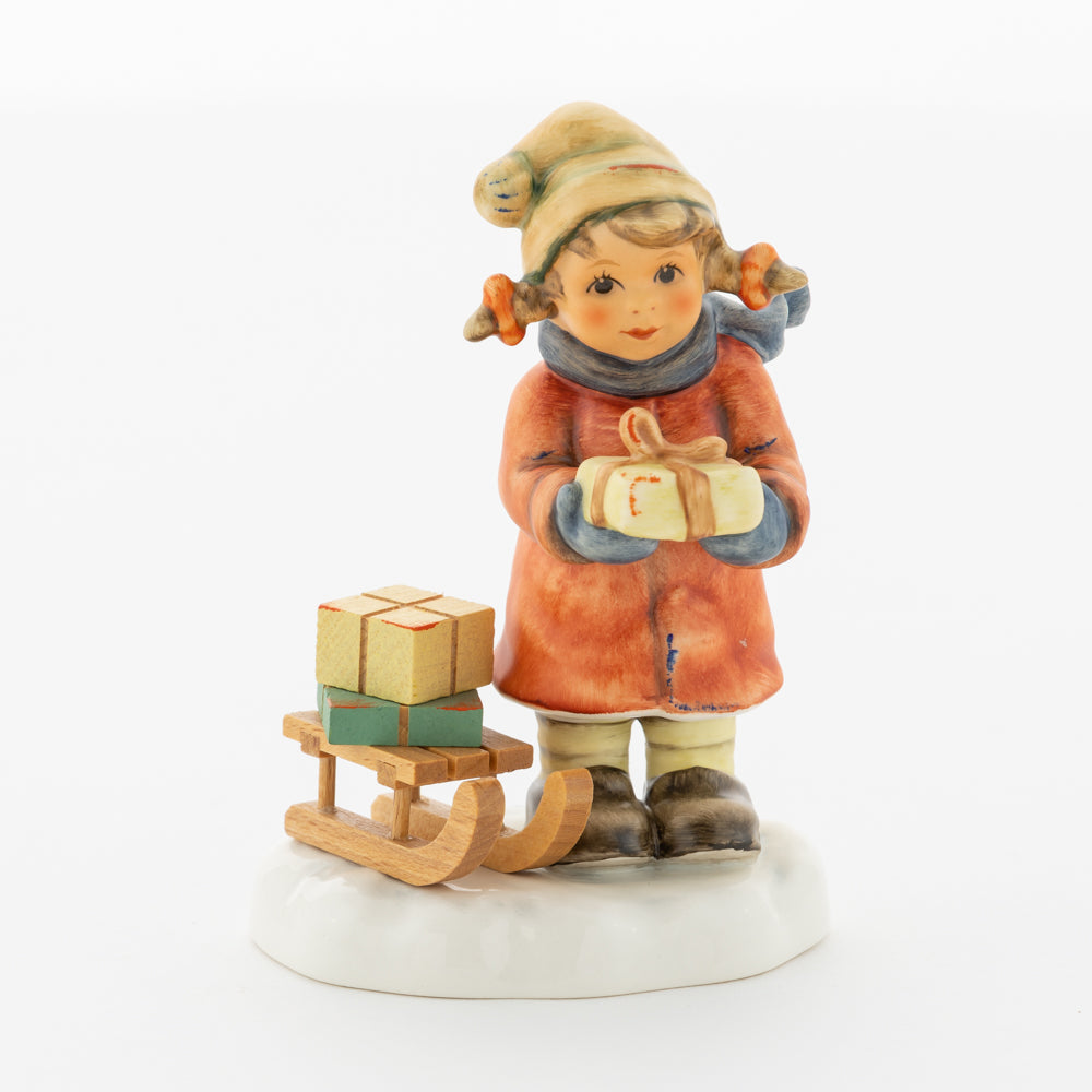 Wie bitte, das Geschenk ist wirklich für mich? Das ist aber lieb von Dir! Was da wohl drin ist? Das niedliche Hummel-Mädchen blickt dem Betrachter direkt in die Augen. Es ist als wolle sie ihm ihr Geschenk überreichen. Ist es nicht rührend, wie es an seine Lieben gedacht hat? Das entzückende Hummel-Kind mit einem Schlitten voller Geschenke entwarf Modelleur Helmut Fischer im Jahr 2003.