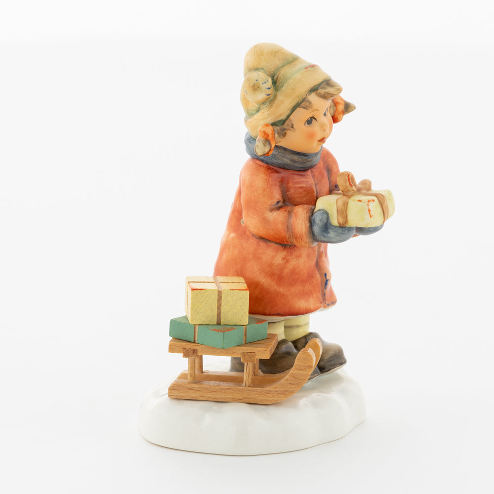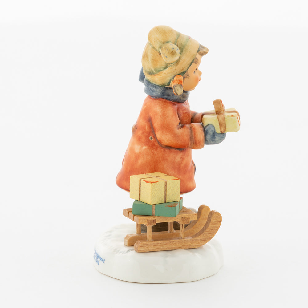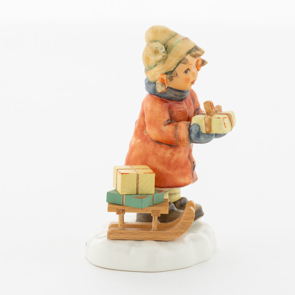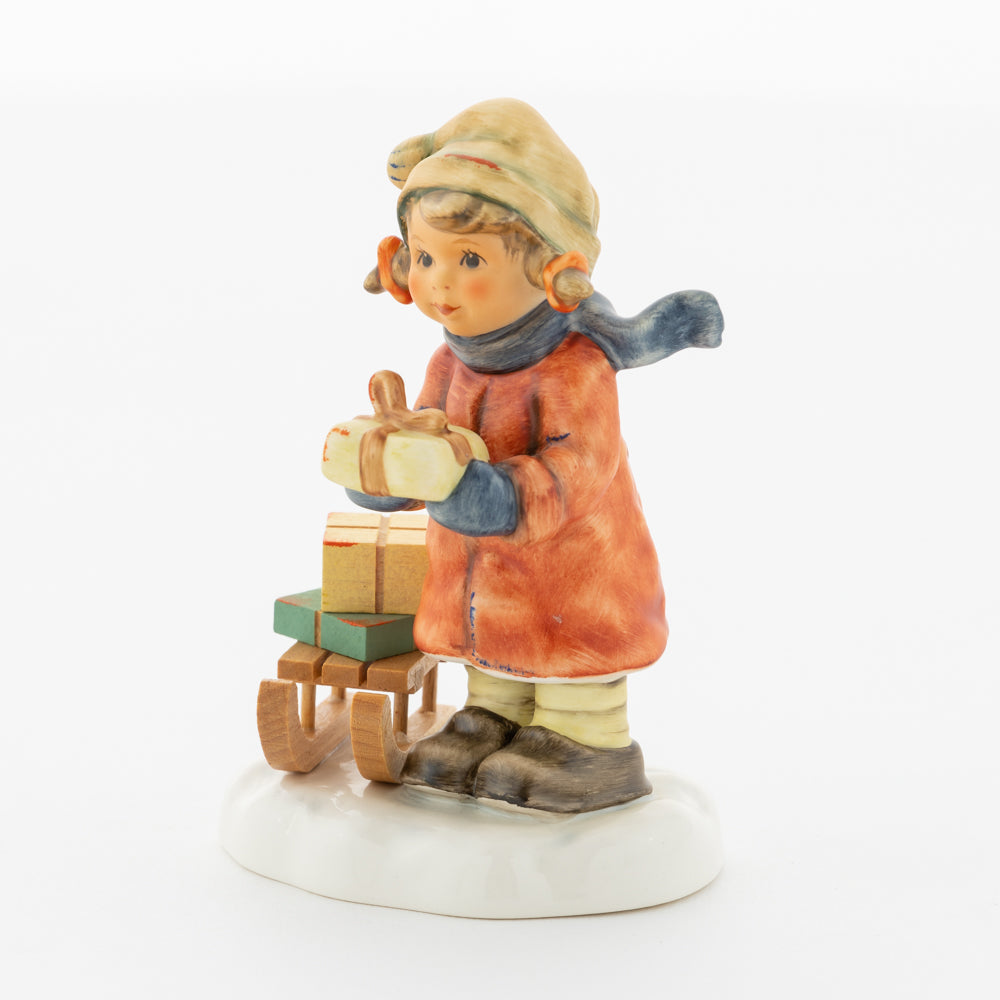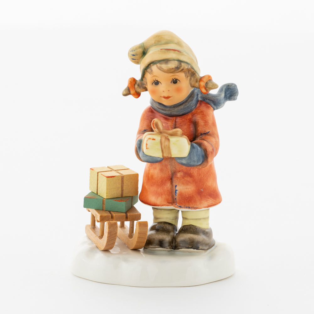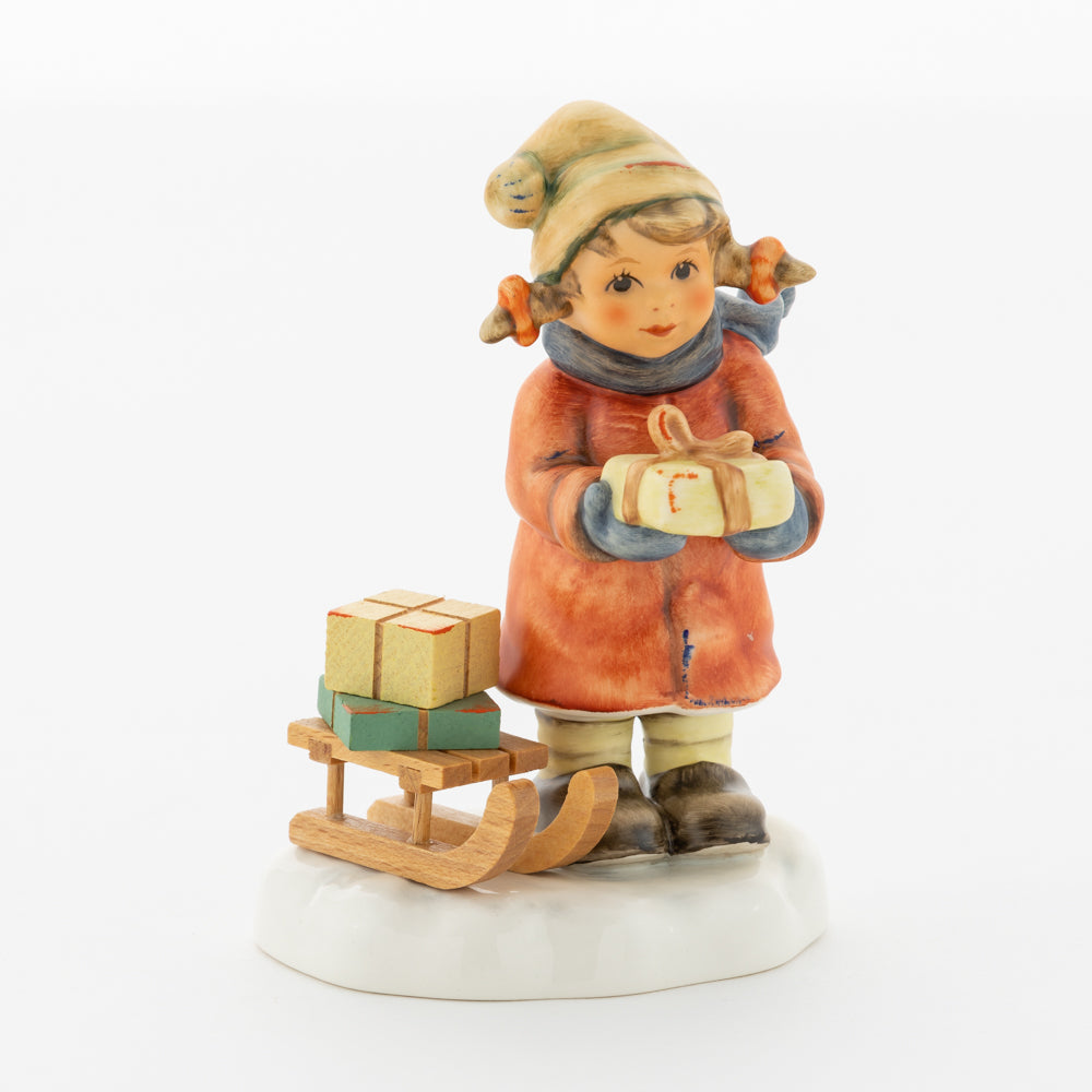 Wie bitte, das Geschenk ist wirklich für mich? Das ist aber lieb von Dir! Was da wohl drin ist? Das niedliche Hummel-Mädchen blickt dem Betrachter direkt in die Augen. Es ist als wolle sie ihm ihr Geschenk überreichen. Ist es nicht rührend, wie es an seine Lieben gedacht hat? Das entzückende Hummel-Kind mit einem Schlitten voller Geschenke entwarf Modelleur Helmut Fischer im Jahr 2003.