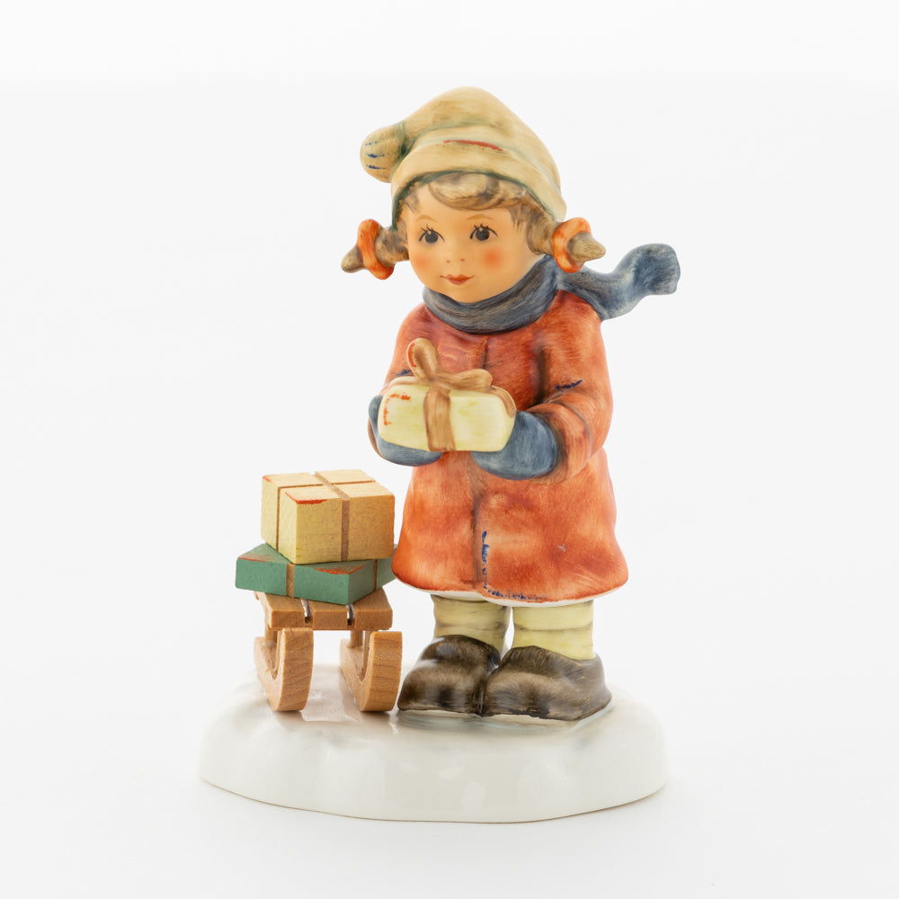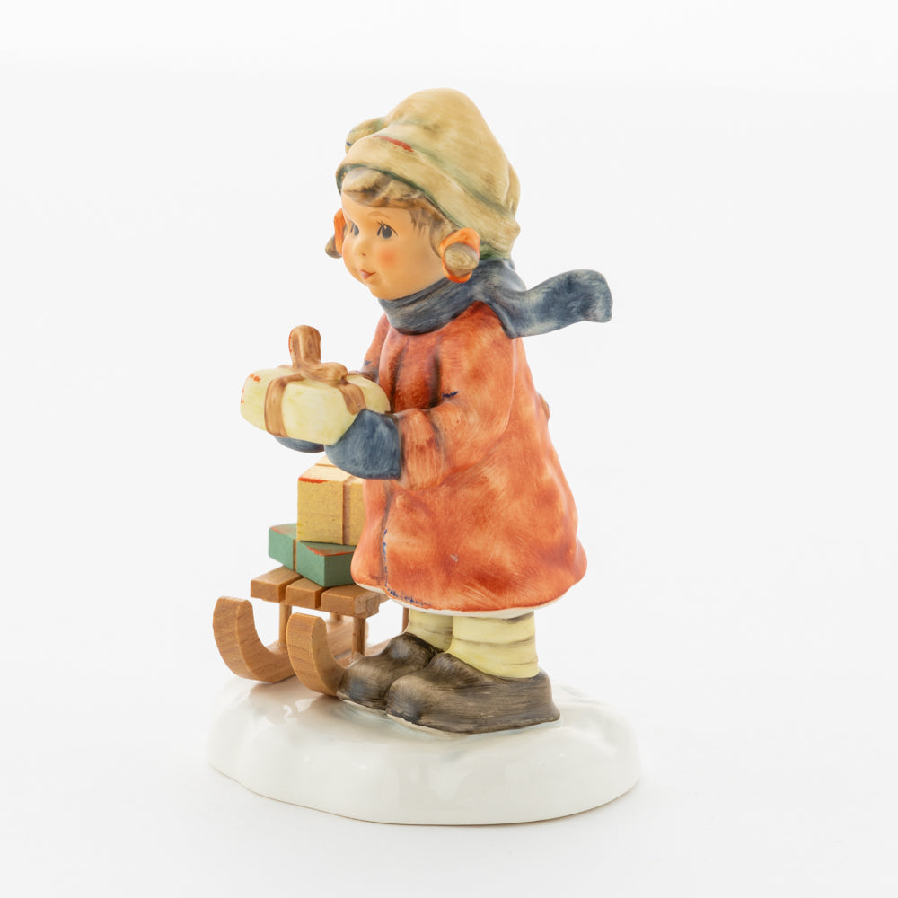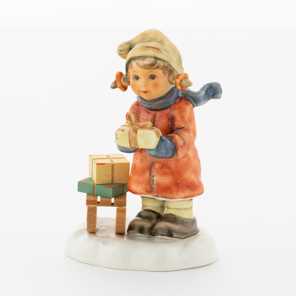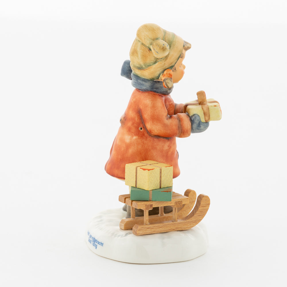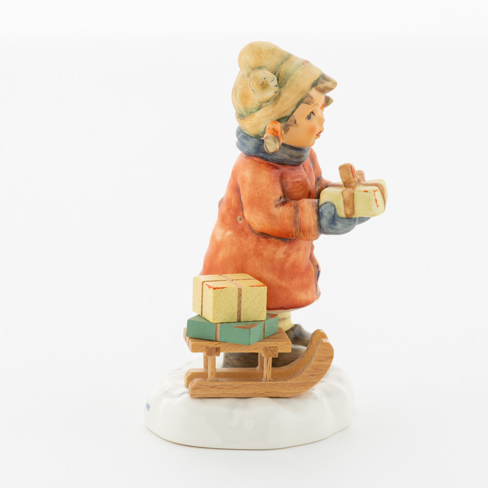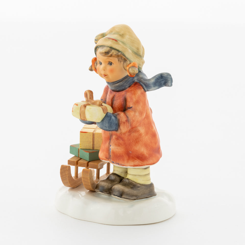 Wie bitte, das Geschenk ist wirklich für mich? Das ist aber lieb von Dir! Was da wohl drin ist? Das niedliche Hummel-Mädchen blickt dem Betrachter direkt in die Augen. Es ist als wolle sie ihm ihr Geschenk überreichen. Ist es nicht rührend, wie es an seine Lieben gedacht hat? Das entzückende Hummel-Kind mit einem Schlitten voller Geschenke entwarf Modelleur Helmut Fischer im Jahr 2003.