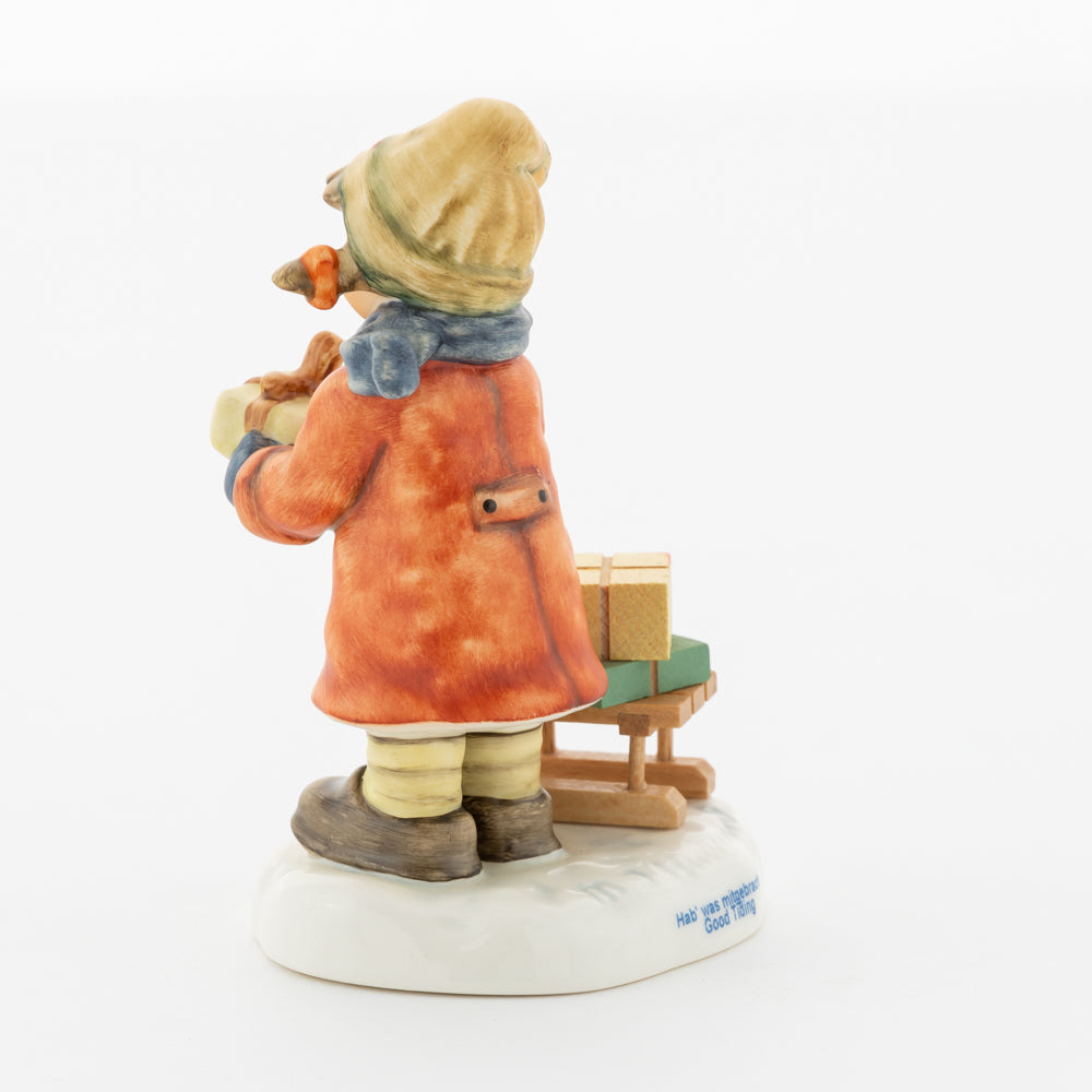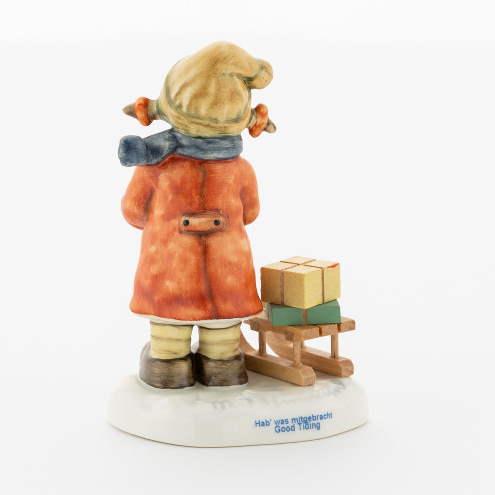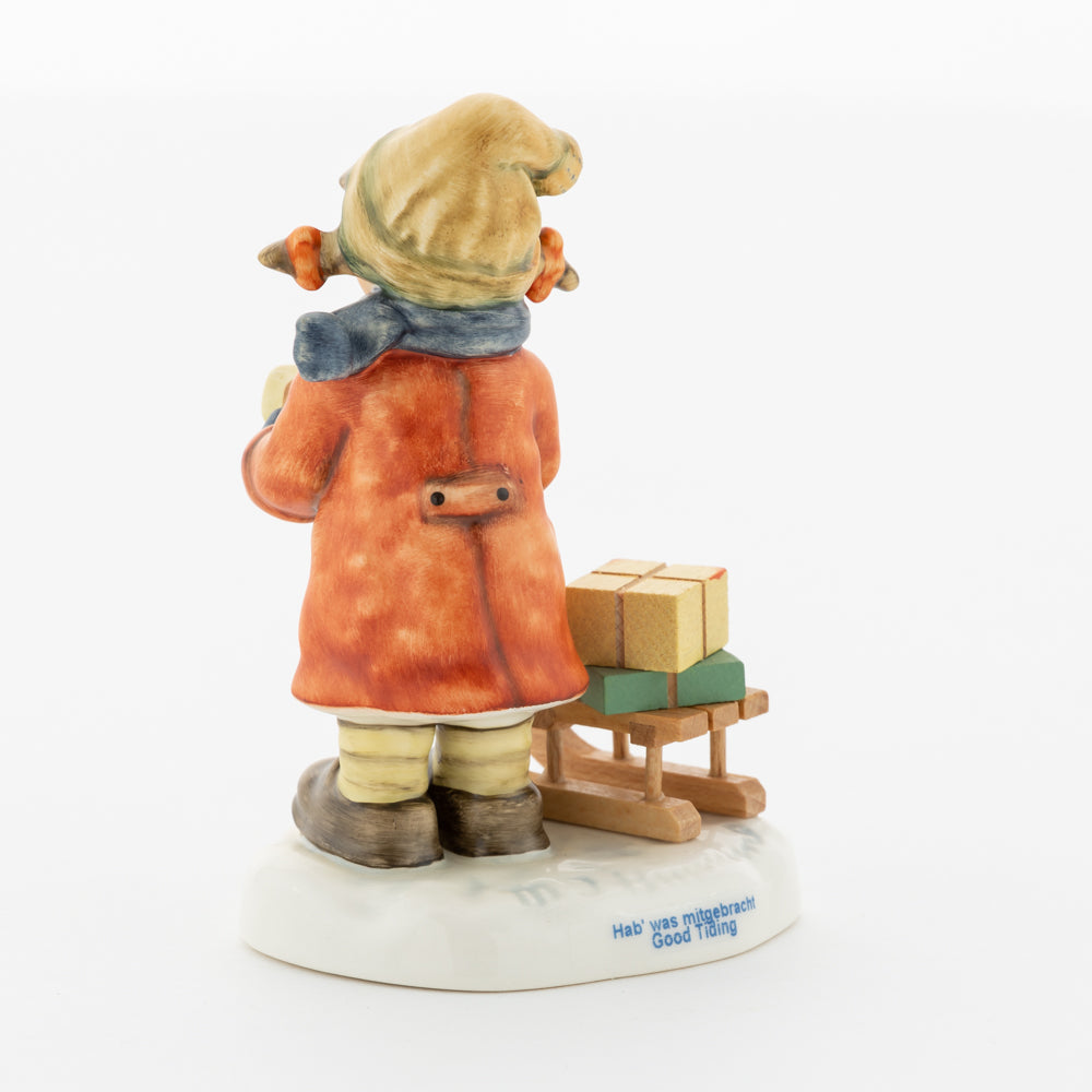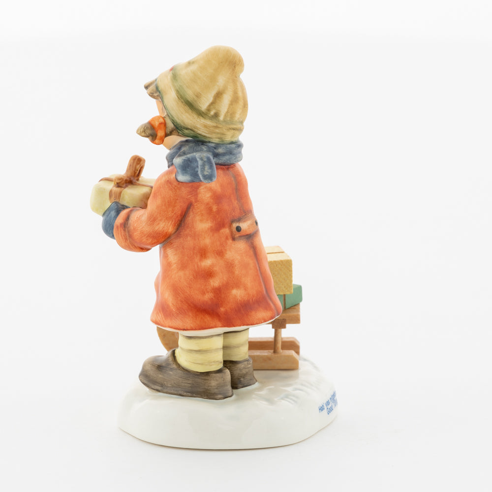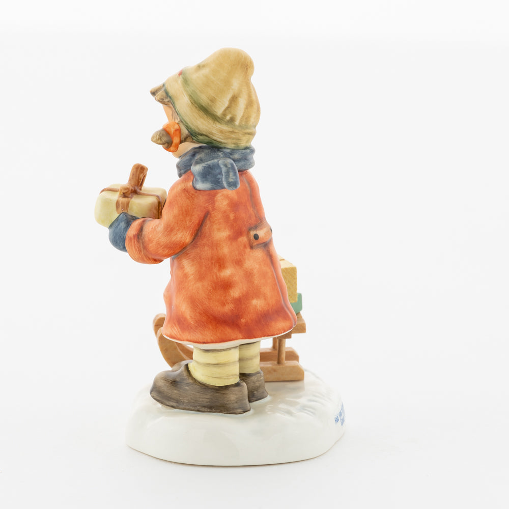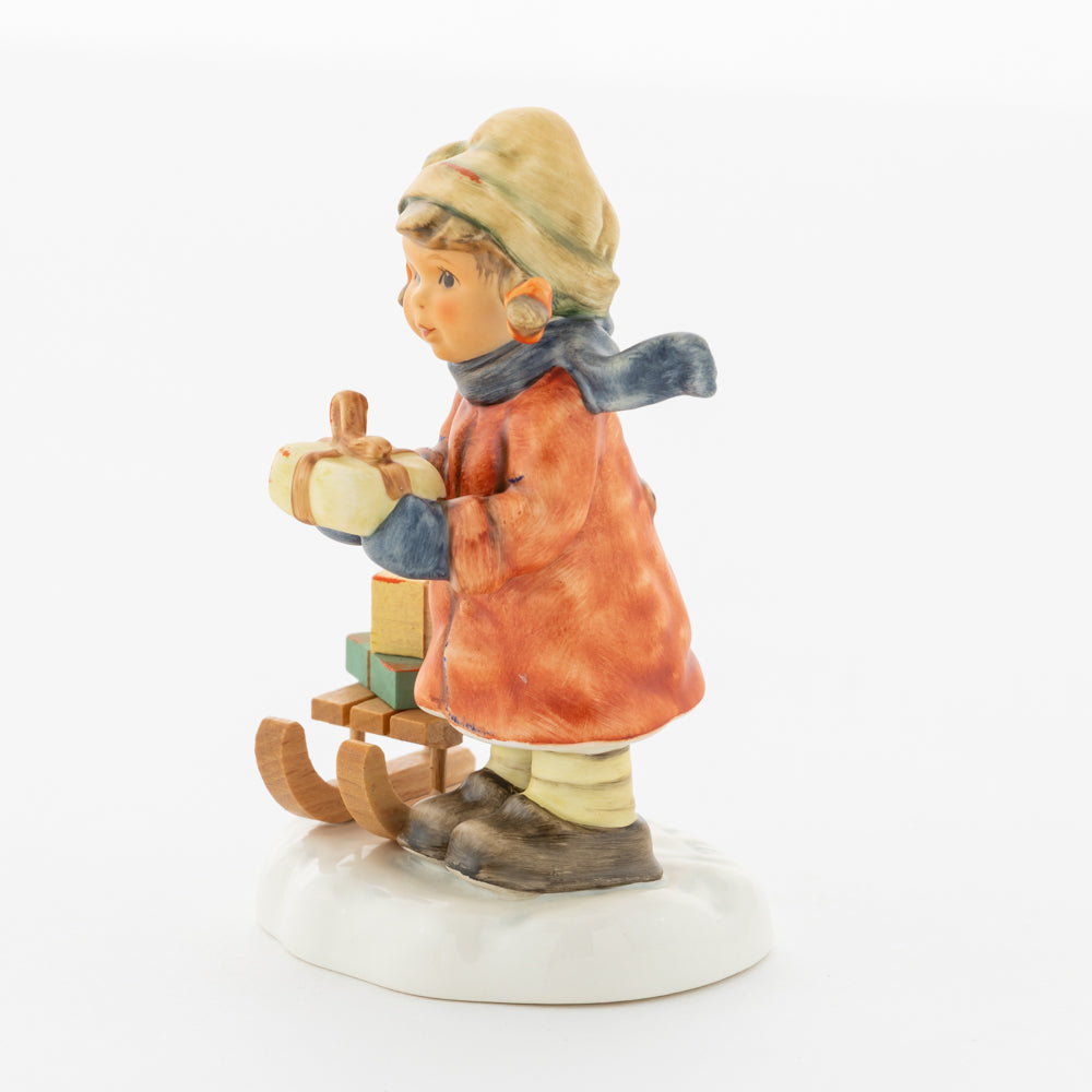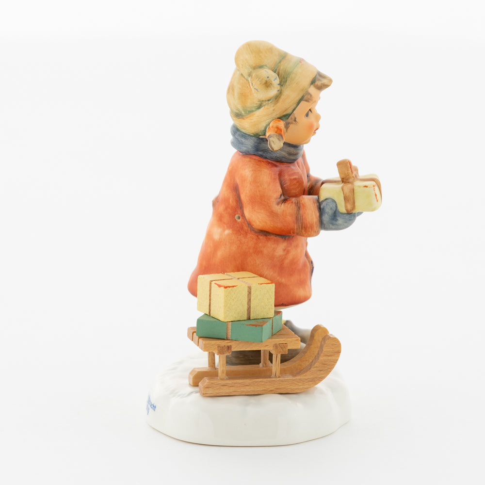 Wie bitte, das Geschenk ist wirklich für mich? Das ist aber lieb von Dir! Was da wohl drin ist? Das niedliche Hummel-Mädchen blickt dem Betrachter direkt in die Augen. Es ist als wolle sie ihm ihr Geschenk überreichen. Ist es nicht rührend, wie es an seine Lieben gedacht hat? Das entzückende Hummel-Kind mit einem Schlitten voller Geschenke entwarf Modelleur Helmut Fischer im Jahr 2003.
