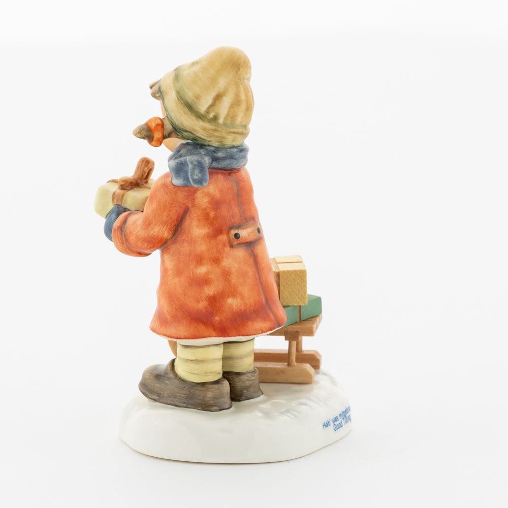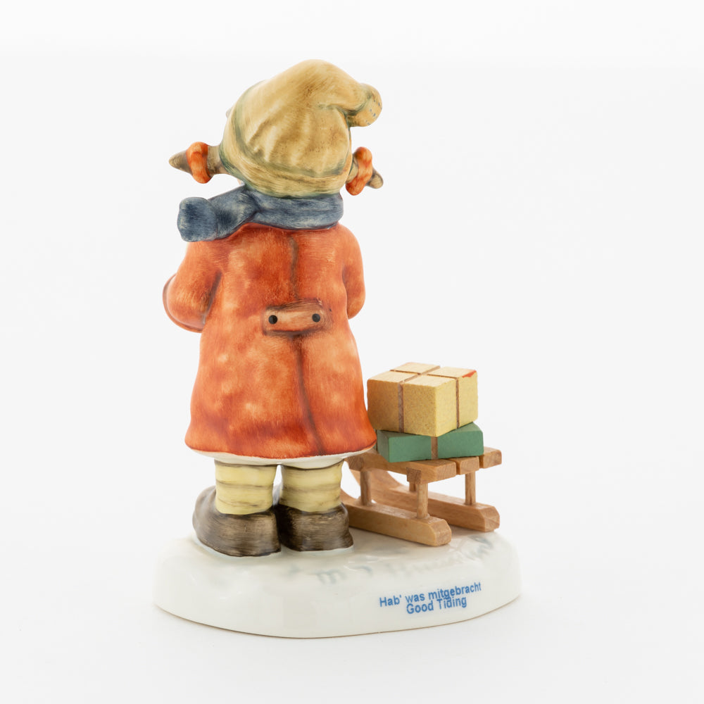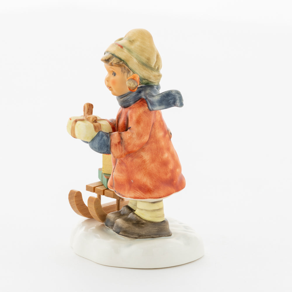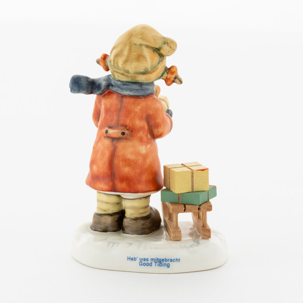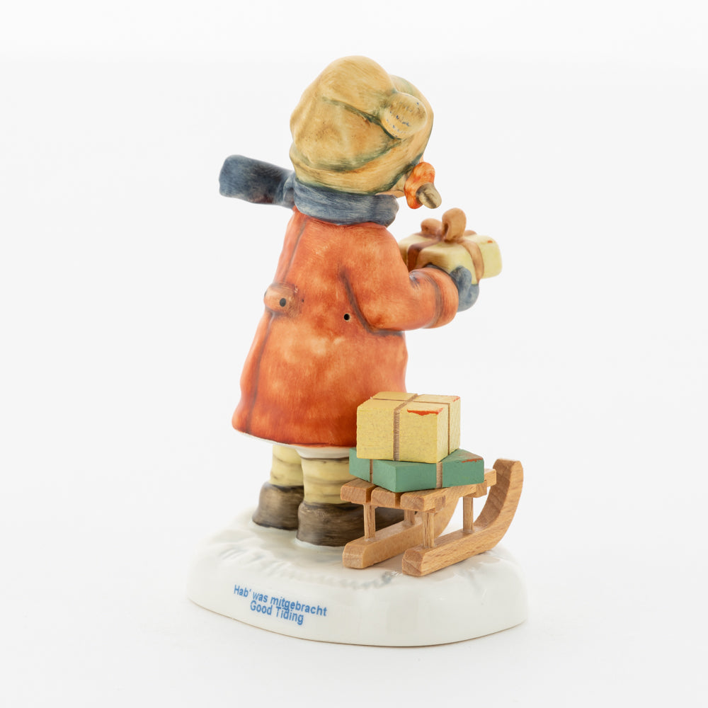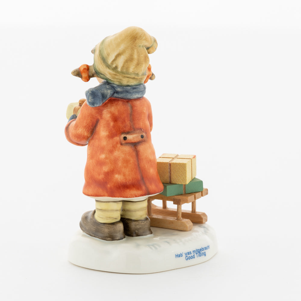 Wie bitte, das Geschenk ist wirklich für mich? Das ist aber lieb von Dir! Was da wohl drin ist? Das niedliche Hummel-Mädchen blickt dem Betrachter direkt in die Augen. Es ist als wolle sie ihm ihr Geschenk überreichen. Ist es nicht rührend, wie es an seine Lieben gedacht hat? Das entzückende Hummel-Kind mit einem Schlitten voller Geschenke entwarf Modelleur Helmut Fischer im Jahr 2003.