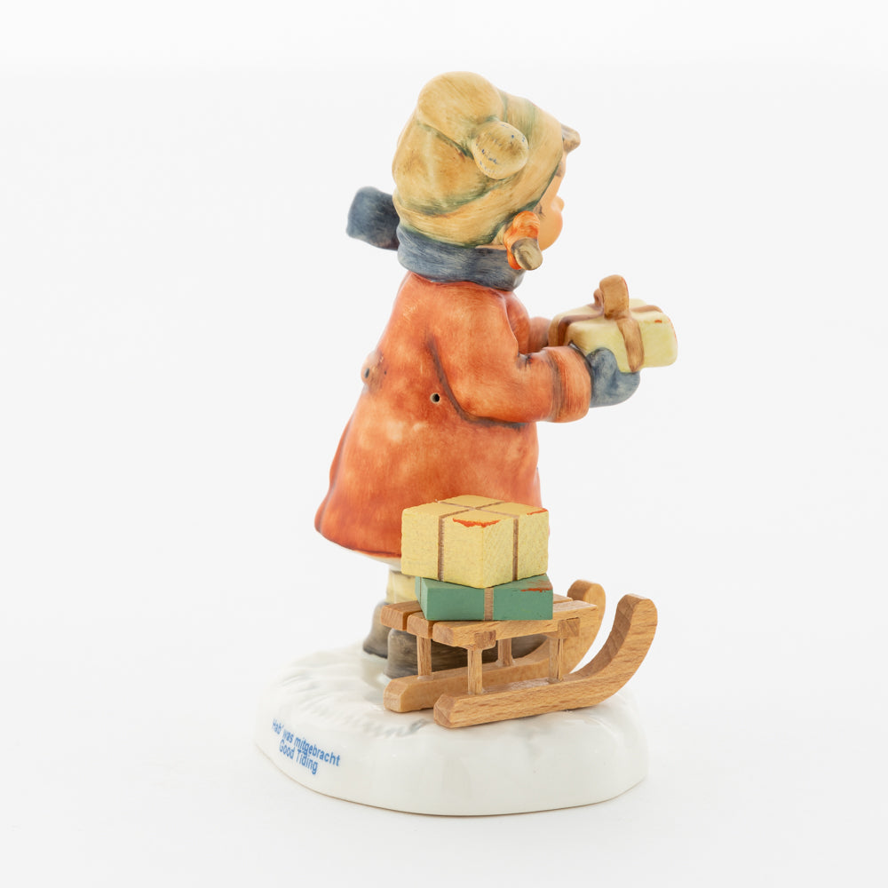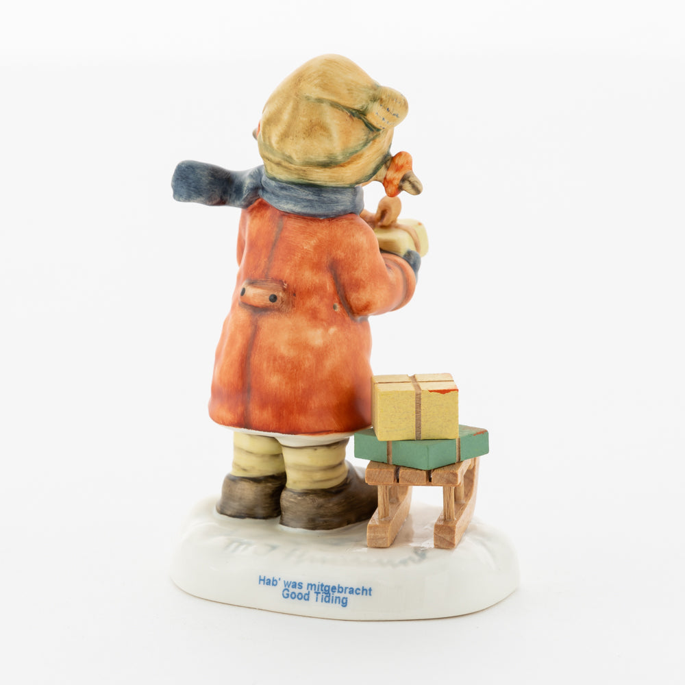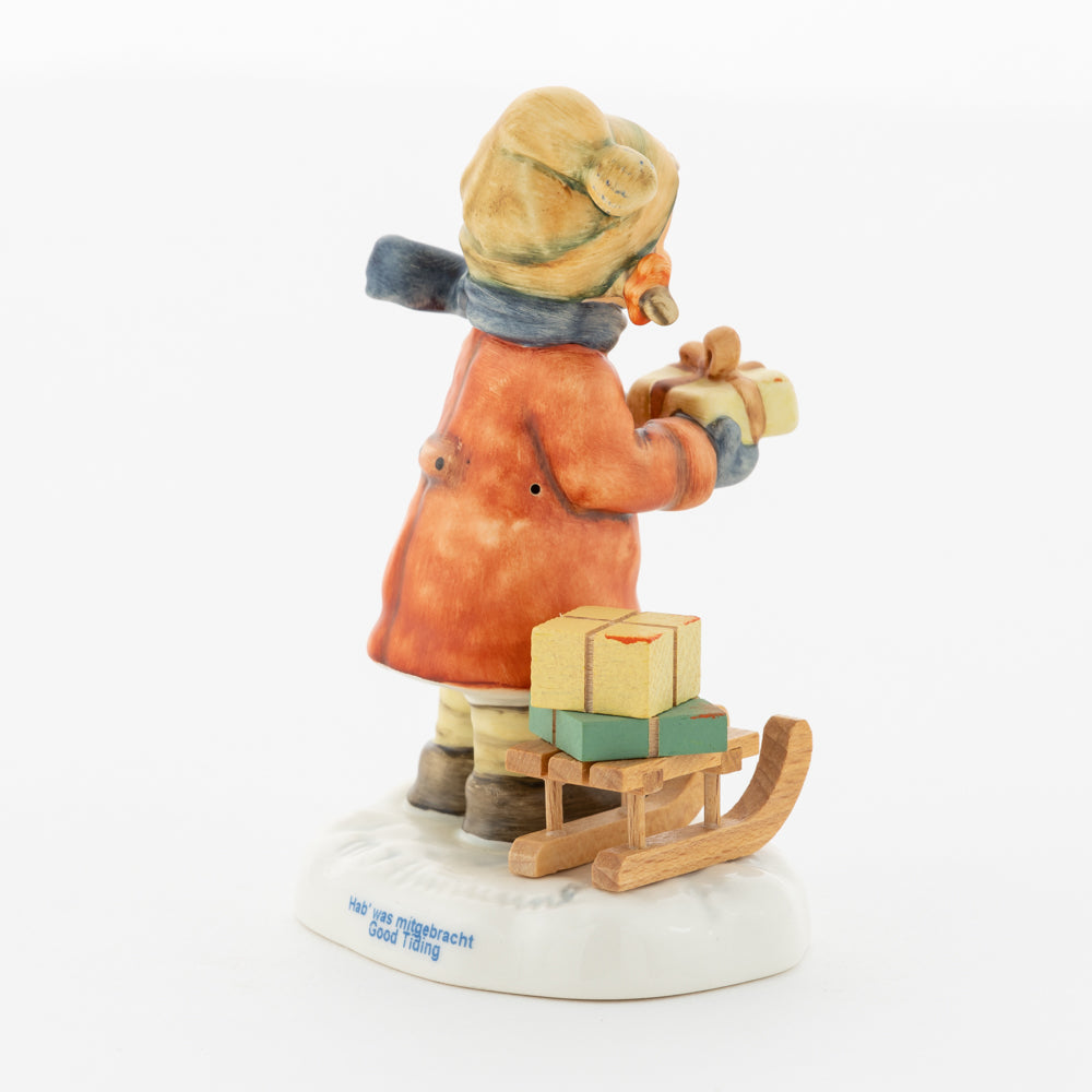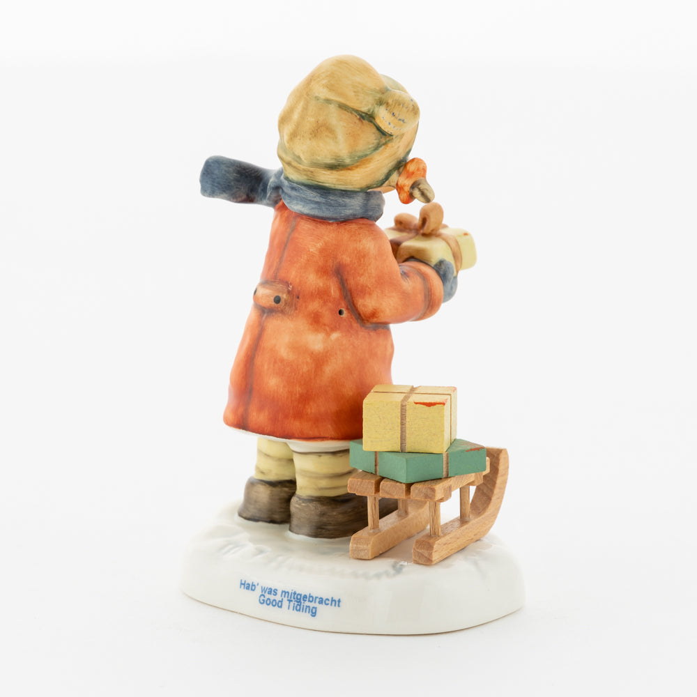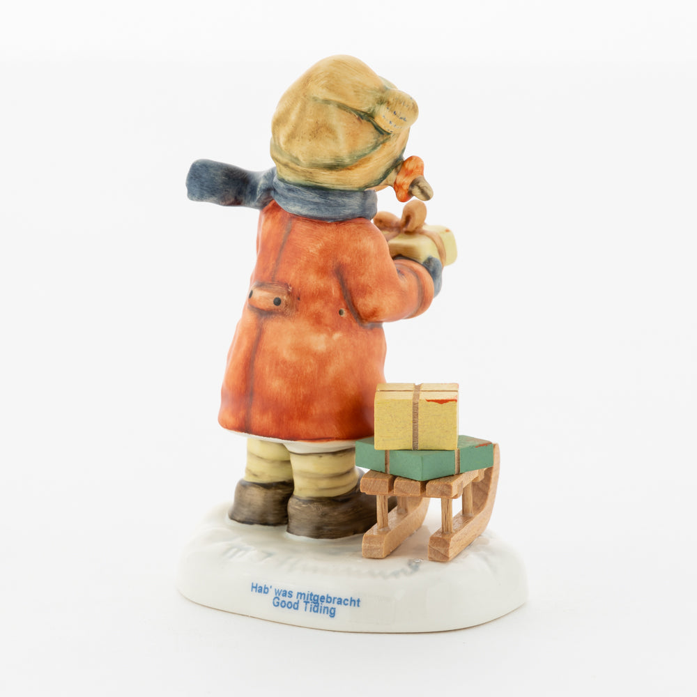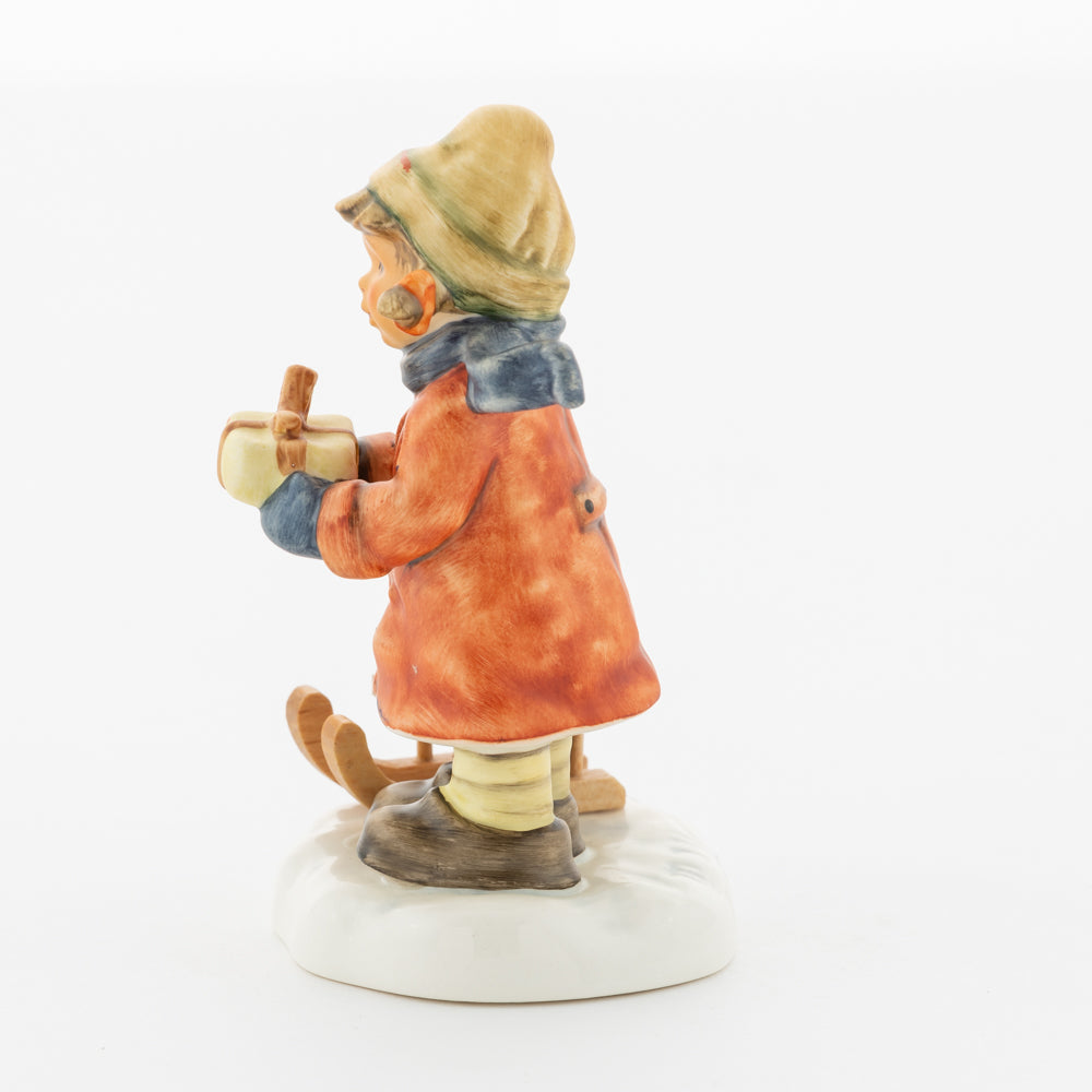 Wie bitte, das Geschenk ist wirklich für mich? Das ist aber lieb von Dir! Was da wohl drin ist? Das niedliche Hummel-Mädchen blickt dem Betrachter direkt in die Augen. Es ist als wolle sie ihm ihr Geschenk überreichen. Ist es nicht rührend, wie es an seine Lieben gedacht hat? Das entzückende Hummel-Kind mit einem Schlitten voller Geschenke entwarf Modelleur Helmut Fischer im Jahr 2003.