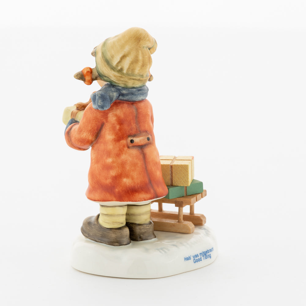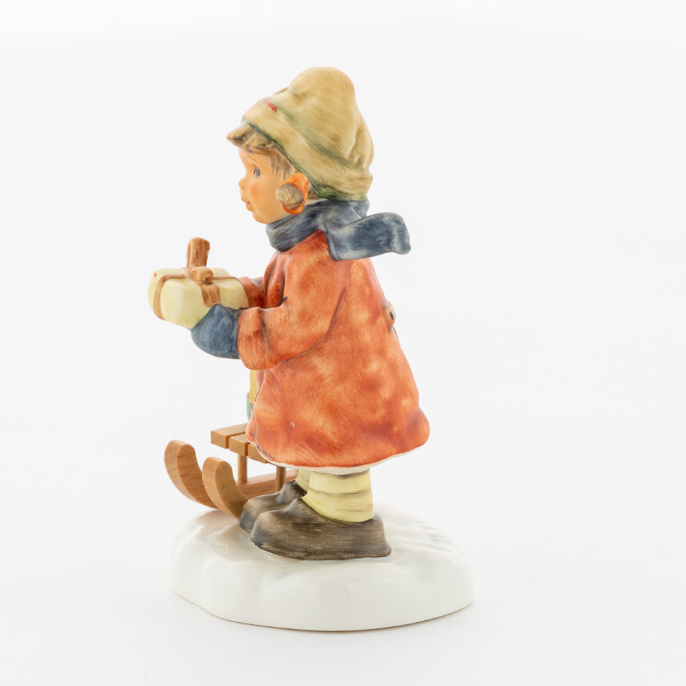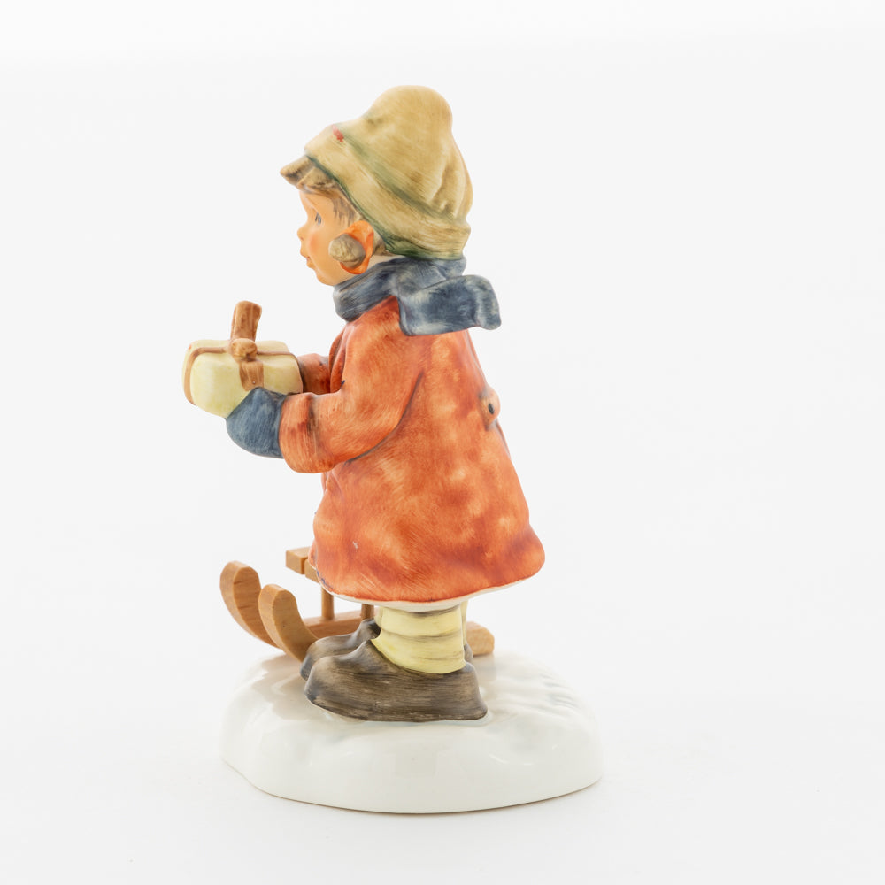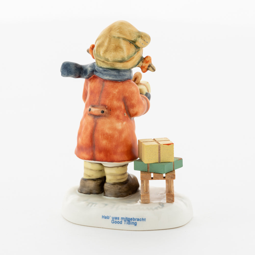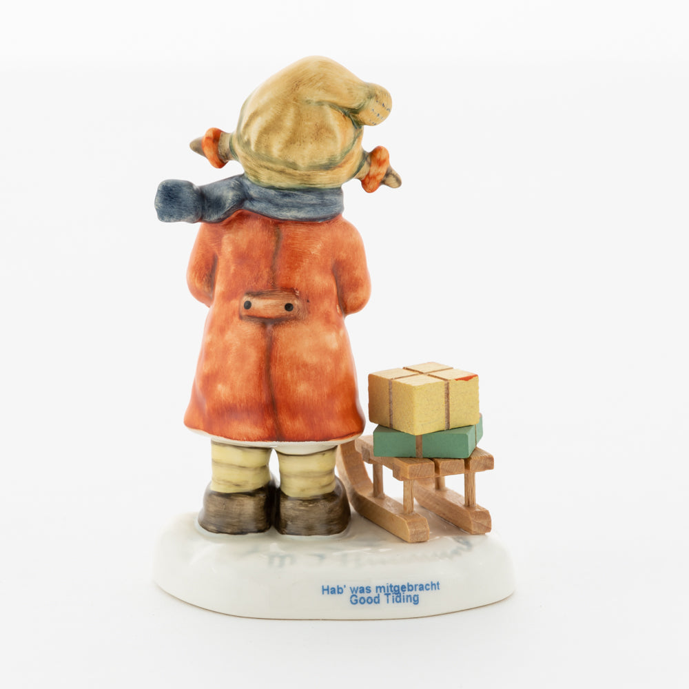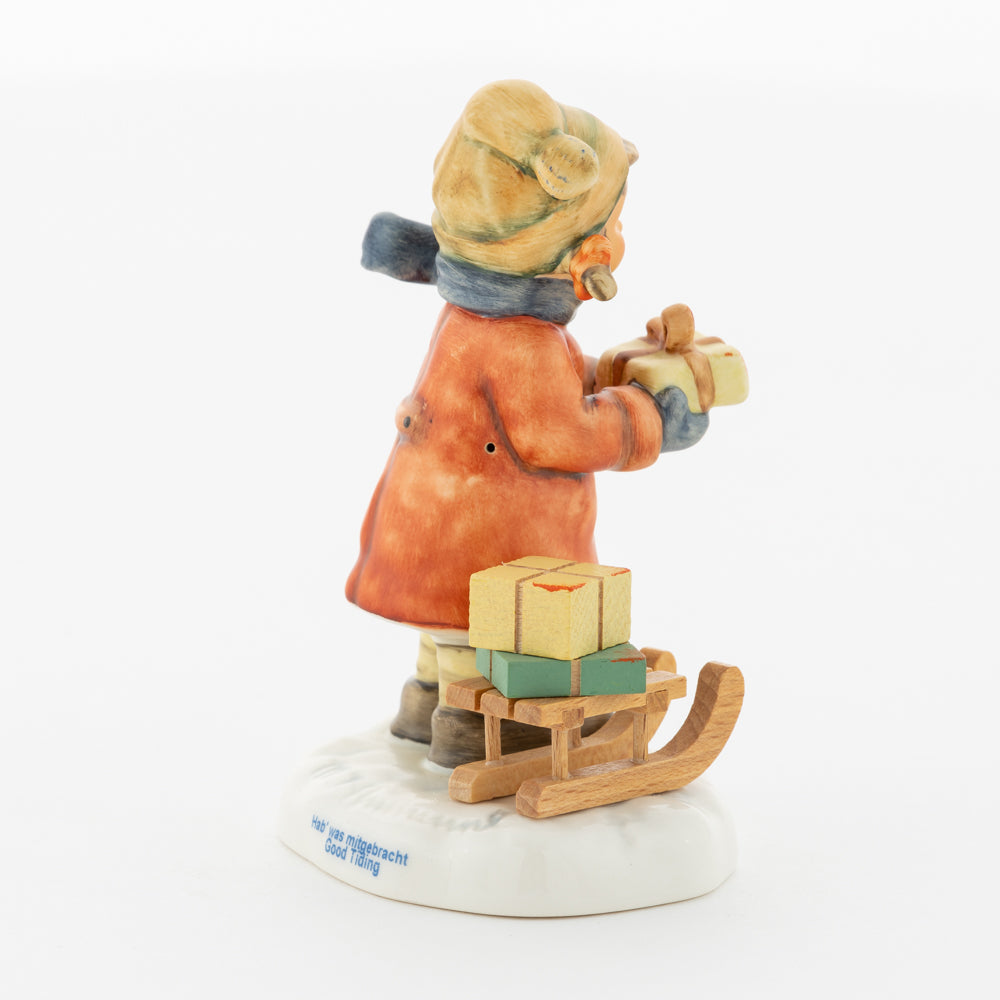 Wie bitte, das Geschenk ist wirklich für mich? Das ist aber lieb von Dir! Was da wohl drin ist? Das niedliche Hummel-Mädchen blickt dem Betrachter direkt in die Augen. Es ist als wolle sie ihm ihr Geschenk überreichen. Ist es nicht rührend, wie es an seine Lieben gedacht hat? Das entzückende Hummel-Kind mit einem Schlitten voller Geschenke entwarf Modelleur Helmut Fischer im Jahr 2003.