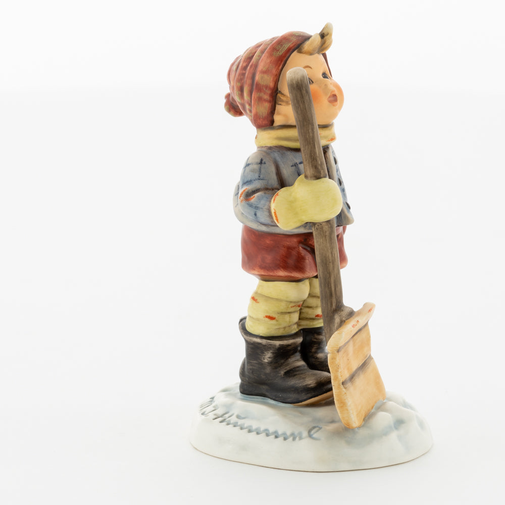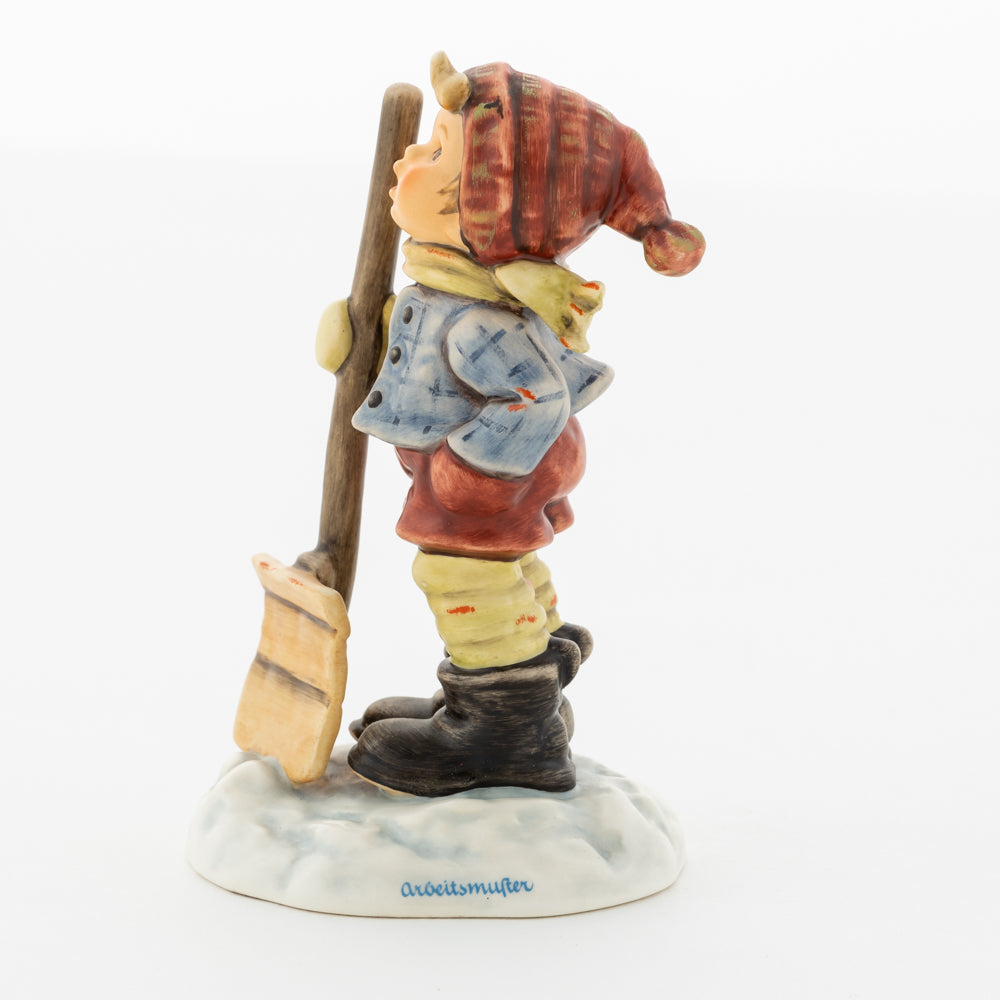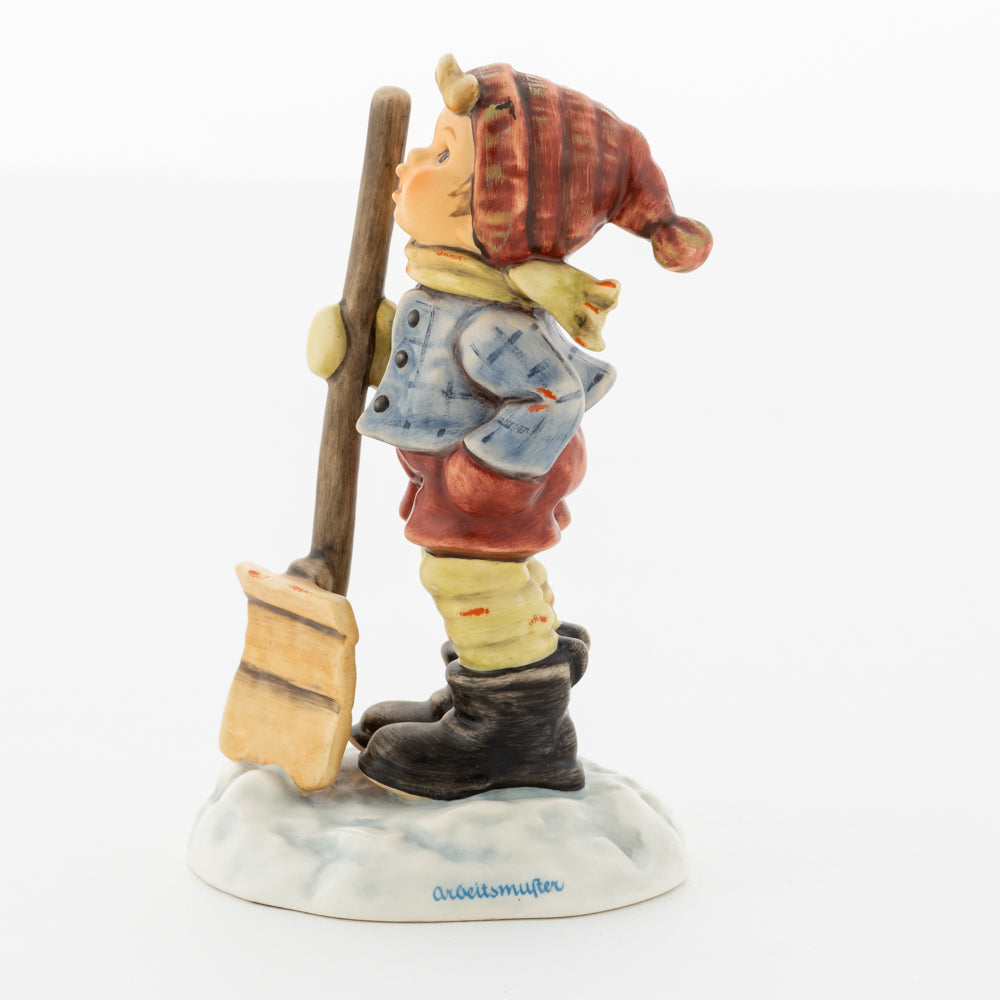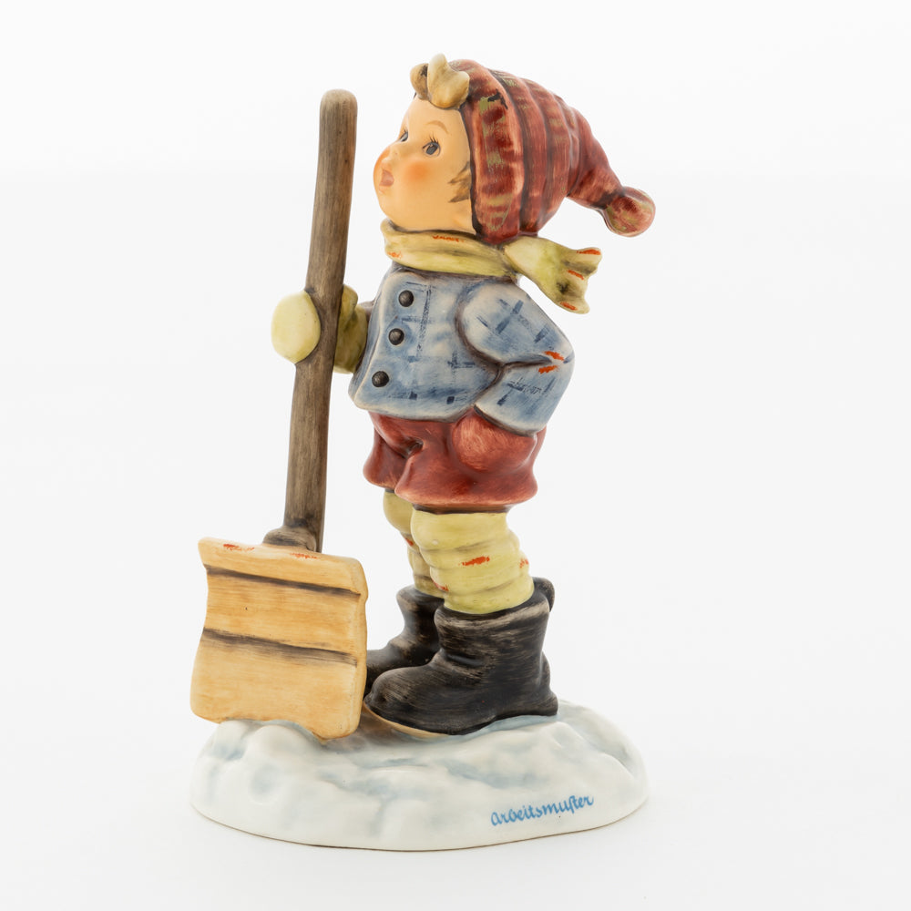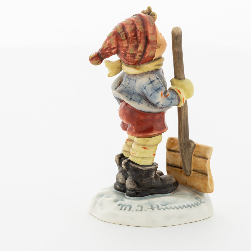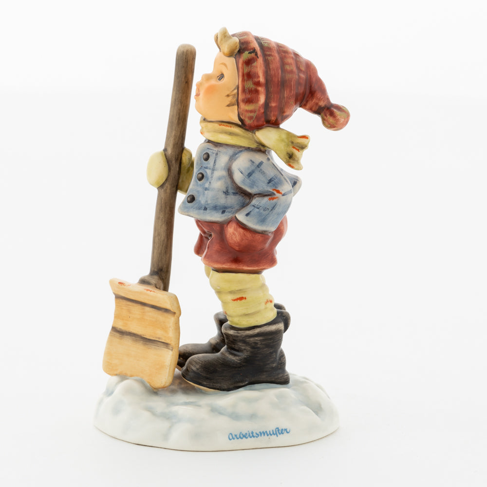 Gar nicht genug von der weißen Pracht kann der kleine Schneeräumer bekommen. In der Hoffnung auf neue Flocken schaut er sehnsüchtig zum Himmel, damit er und sein Schneeschieber wieder ordentlich zu tun haben. Den fleißigen Hummel-Bub, der mit Schal, Mütze und Wollstrümpfen dick eingemummelt seiner Arbeit nachgeht, modellierte Helmut Fischer im Jahr 1997. Im gleichen Jahr wurde auch „Mei, ist die schwer“ (HUM 2035/I) gestaltet – hier müht sich ein kleines Hummel-Mädchen an einer riesigen Schneekugel ab.