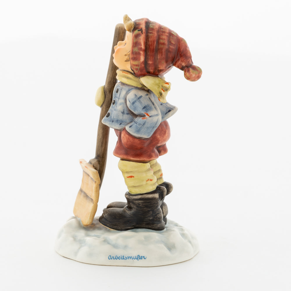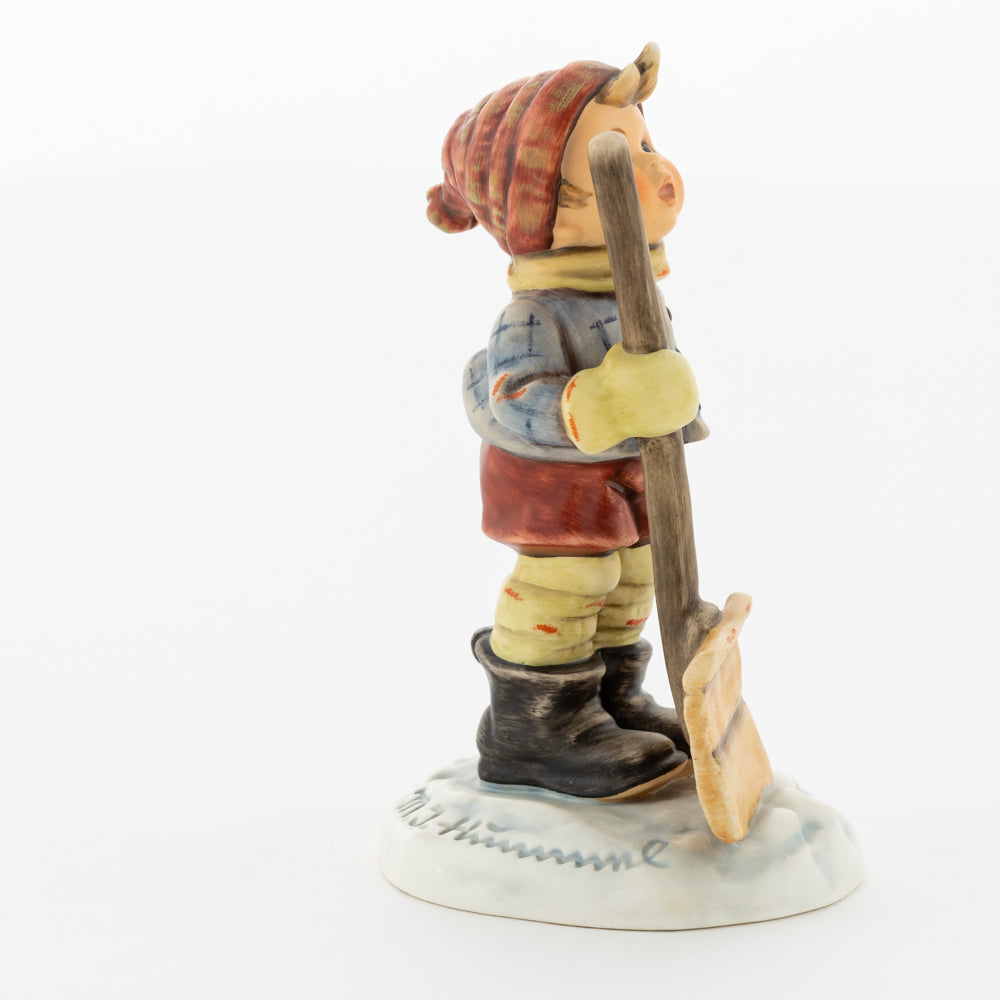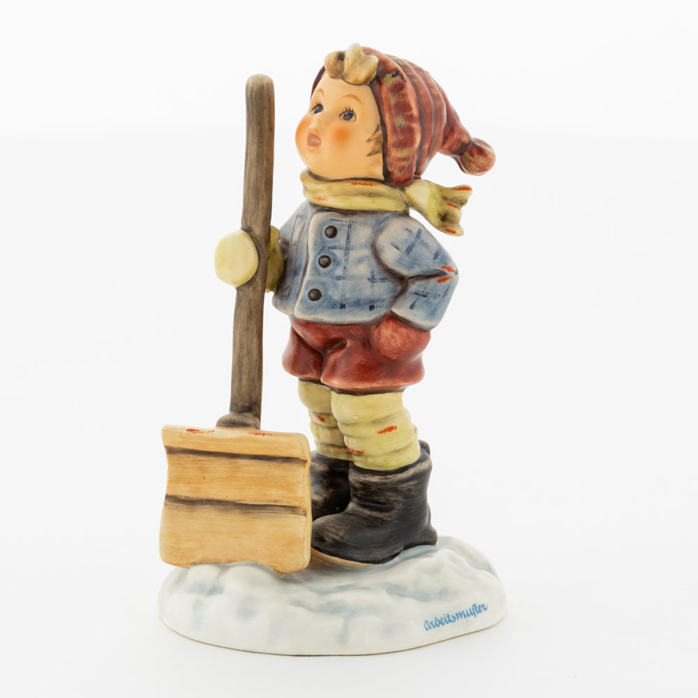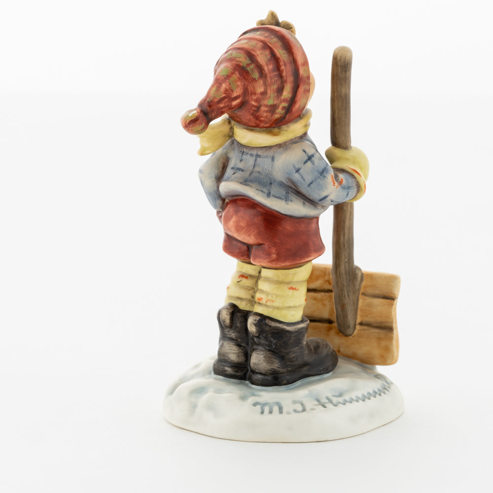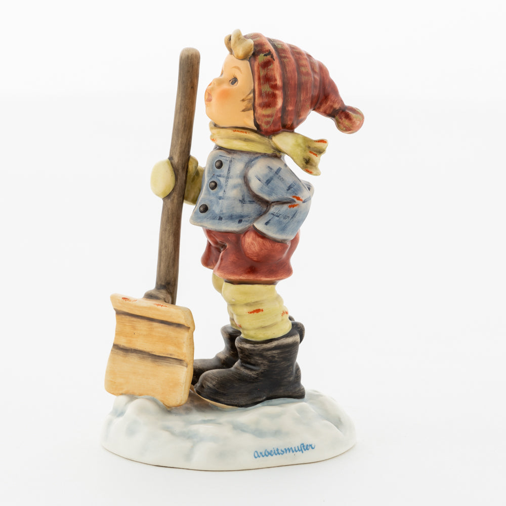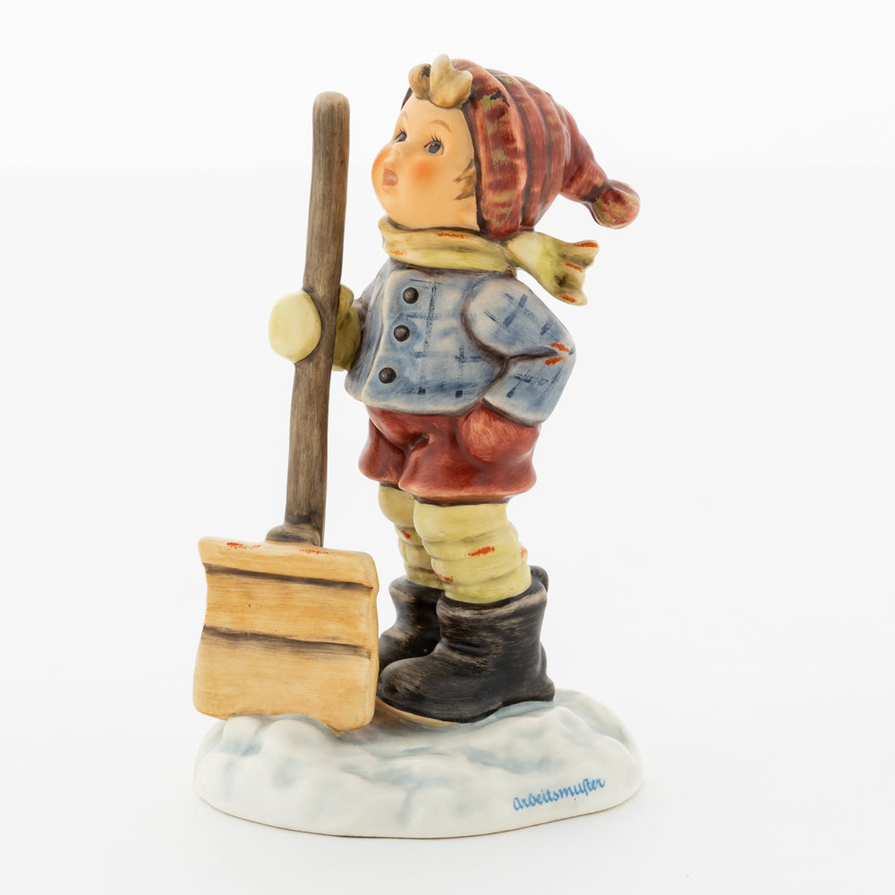 Gar nicht genug von der weißen Pracht kann der kleine Schneeräumer bekommen. In der Hoffnung auf neue Flocken schaut er sehnsüchtig zum Himmel, damit er und sein Schneeschieber wieder ordentlich zu tun haben. Den fleißigen Hummel-Bub, der mit Schal, Mütze und Wollstrümpfen dick eingemummelt seiner Arbeit nachgeht, modellierte Helmut Fischer im Jahr 1997. Im gleichen Jahr wurde auch „Mei, ist die schwer“ (HUM 2035/I) gestaltet – hier müht sich ein kleines Hummel-Mädchen an einer riesigen Schneekugel ab.