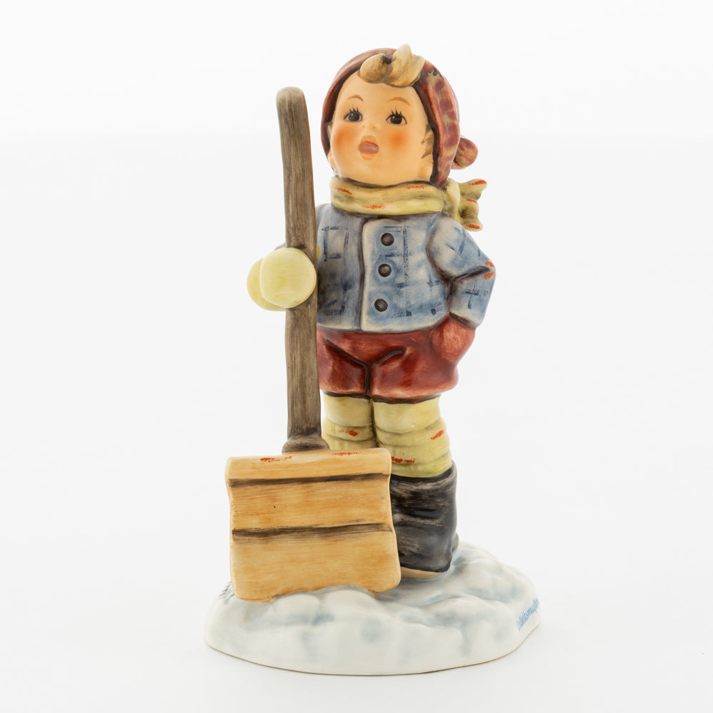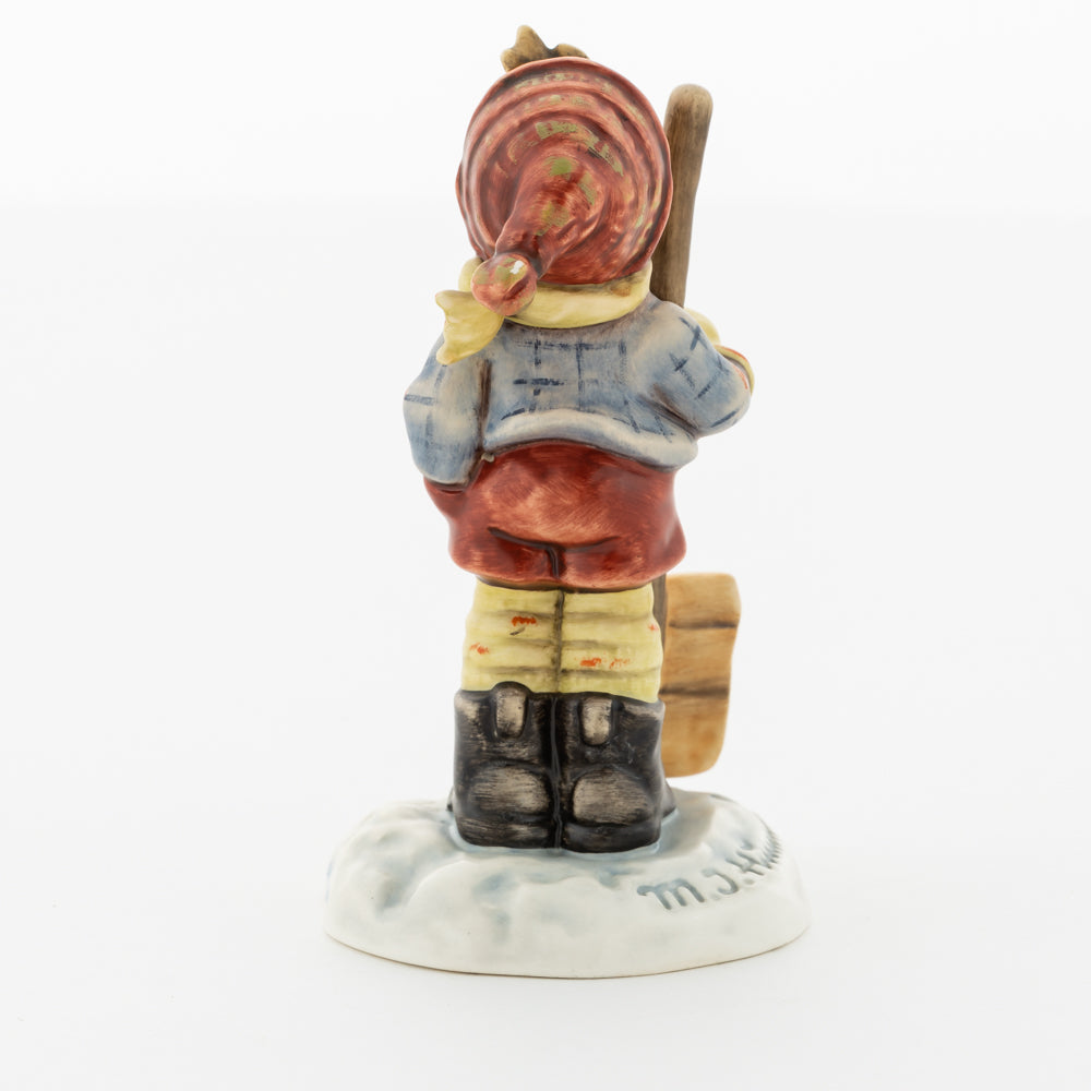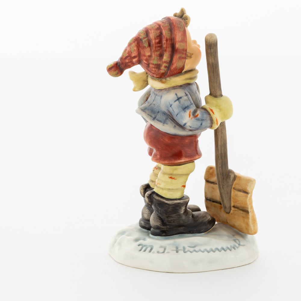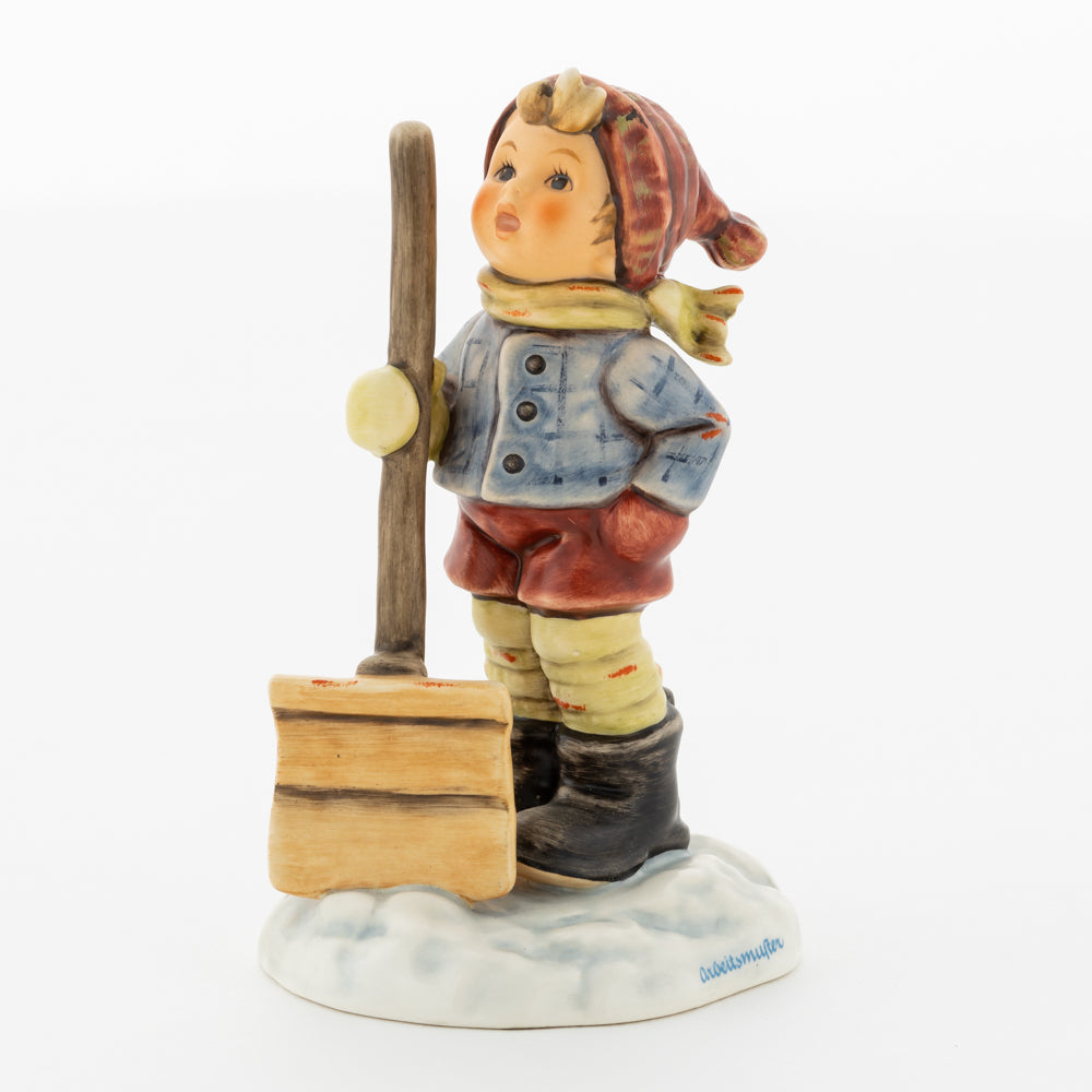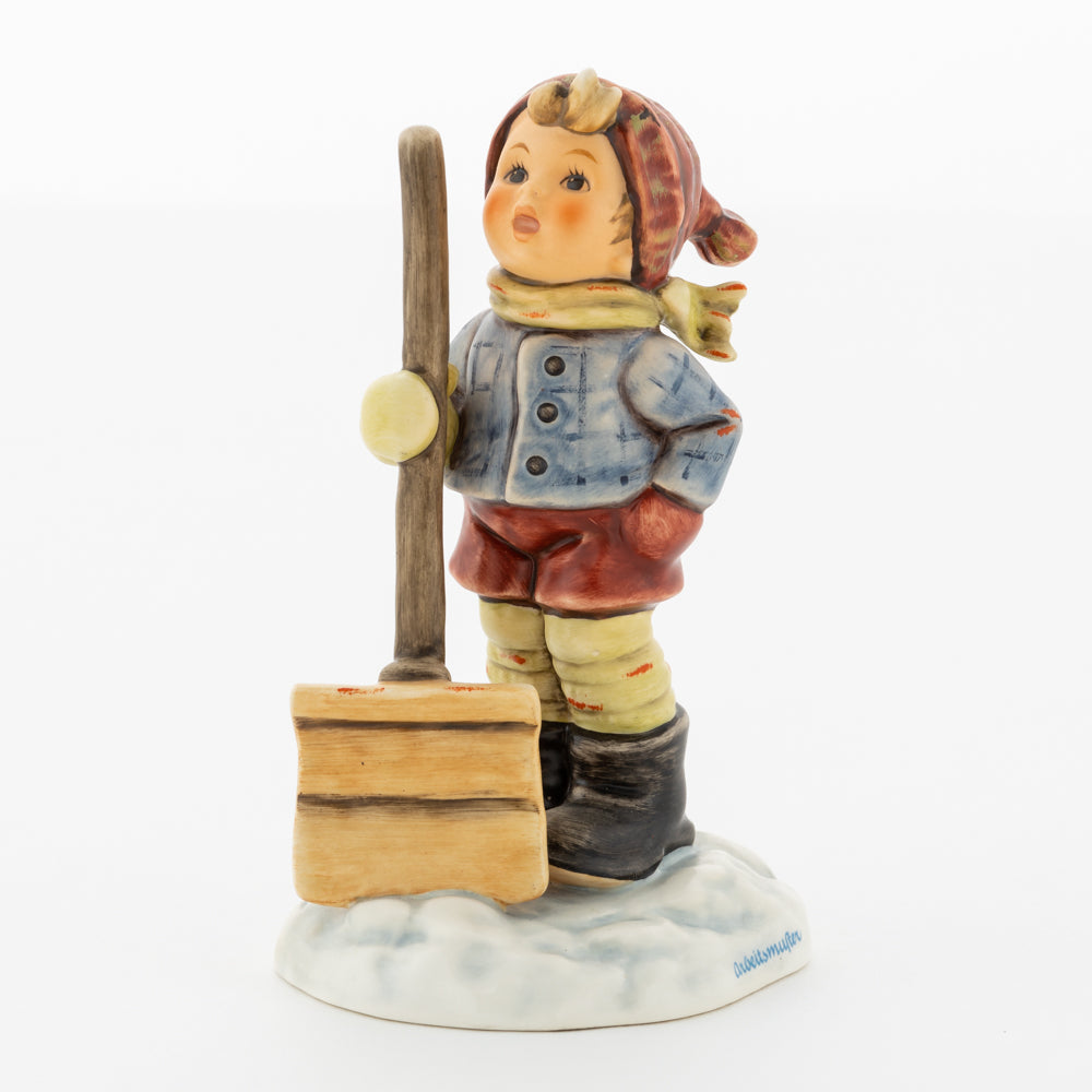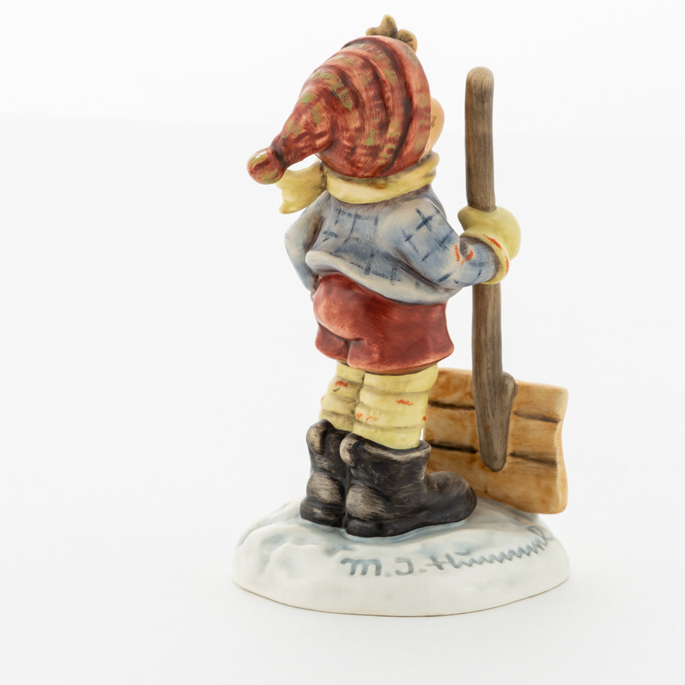 Gar nicht genug von der weißen Pracht kann der kleine Schneeräumer bekommen. In der Hoffnung auf neue Flocken schaut er sehnsüchtig zum Himmel, damit er und sein Schneeschieber wieder ordentlich zu tun haben. Den fleißigen Hummel-Bub, der mit Schal, Mütze und Wollstrümpfen dick eingemummelt seiner Arbeit nachgeht, modellierte Helmut Fischer im Jahr 1997. Im gleichen Jahr wurde auch „Mei, ist die schwer“ (HUM 2035/I) gestaltet – hier müht sich ein kleines Hummel-Mädchen an einer riesigen Schneekugel ab.