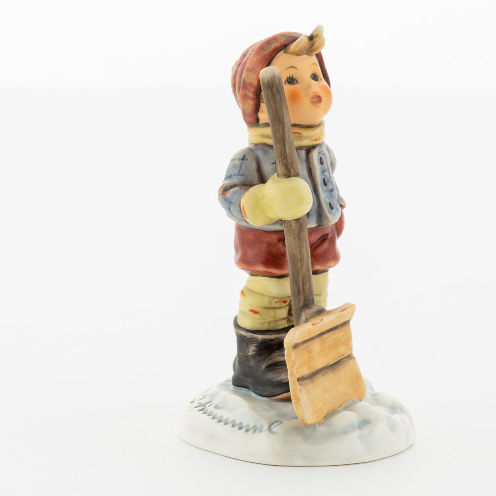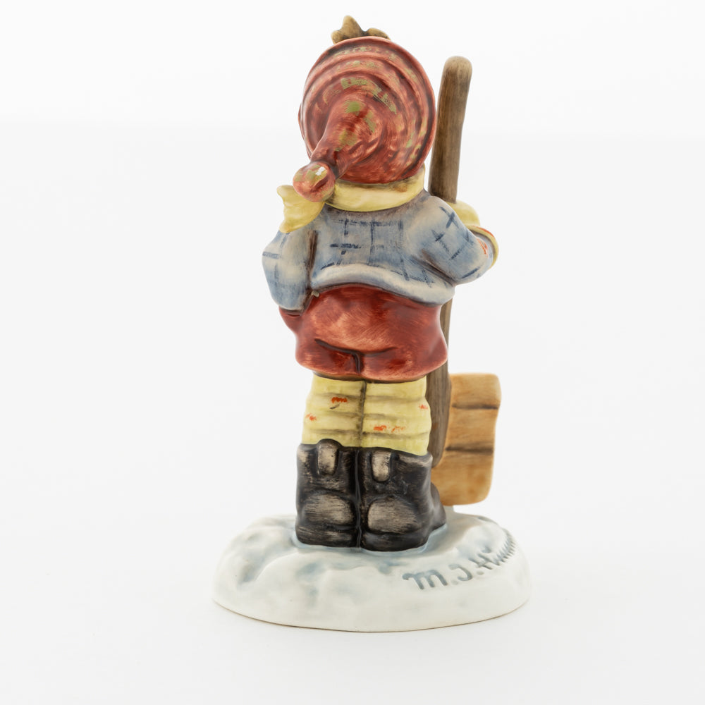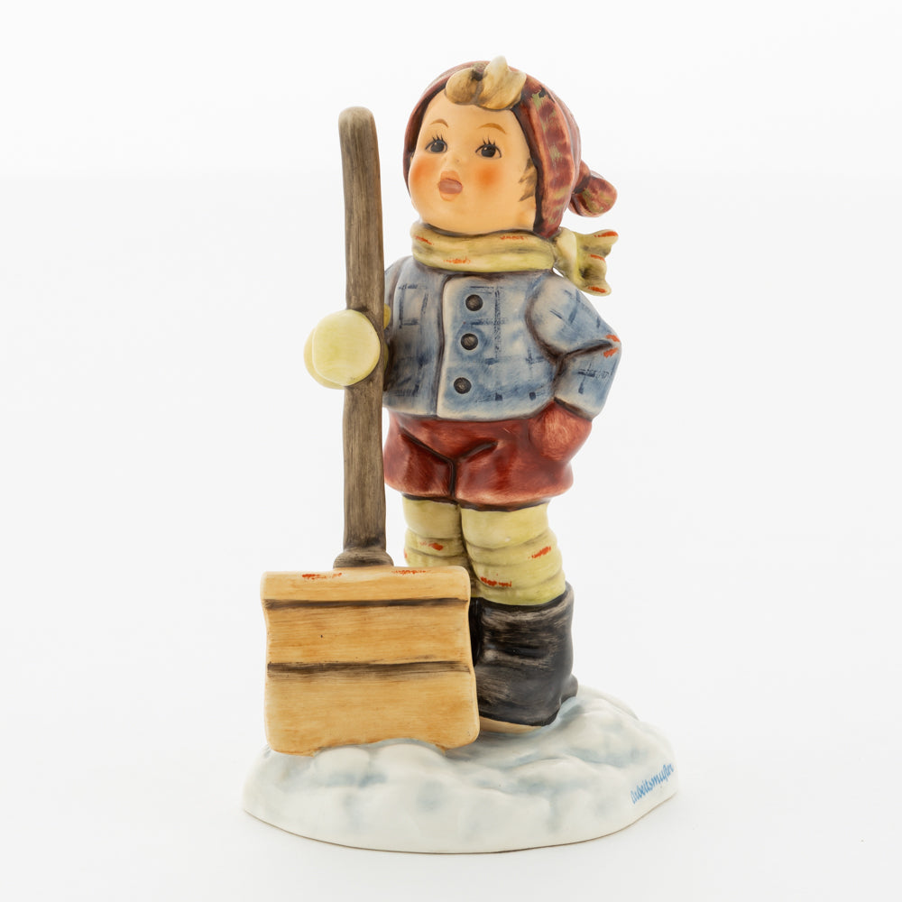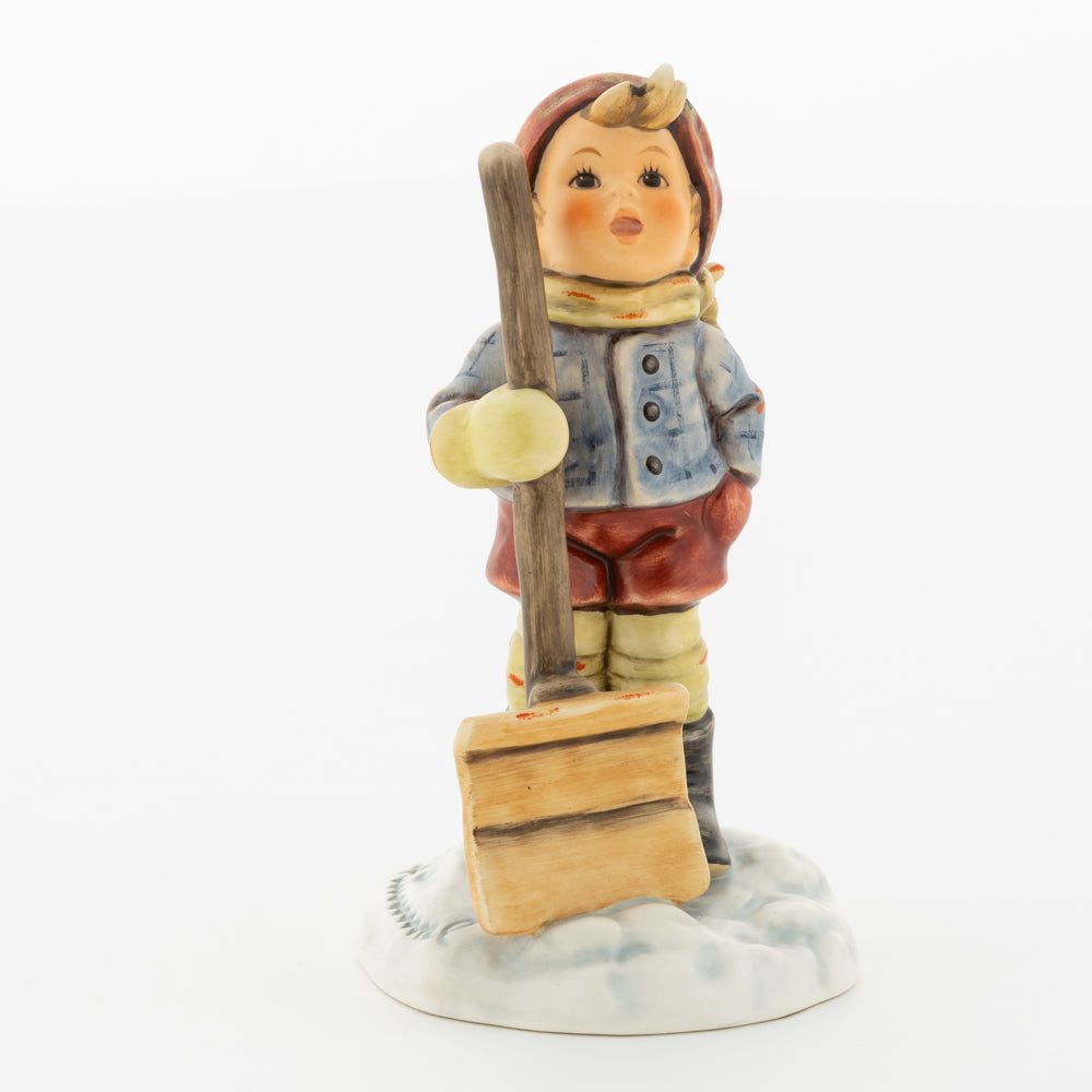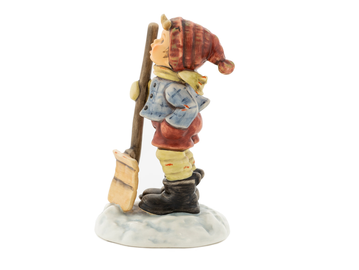 Gar nicht genug von der weißen Pracht kann der kleine Schneeräumer bekommen. In der Hoffnung auf neue Flocken schaut er sehnsüchtig zum Himmel, damit er und sein Schneeschieber wieder ordentlich zu tun haben. Den fleißigen Hummel-Bub, der mit Schal, Mütze und Wollstrümpfen dick eingemummelt seiner Arbeit nachgeht, modellierte Helmut Fischer im Jahr 1997. Im gleichen Jahr wurde auch „Mei, ist die schwer“ (HUM 2035/I) gestaltet – hier müht sich ein kleines Hummel-Mädchen an einer riesigen Schneekugel ab.