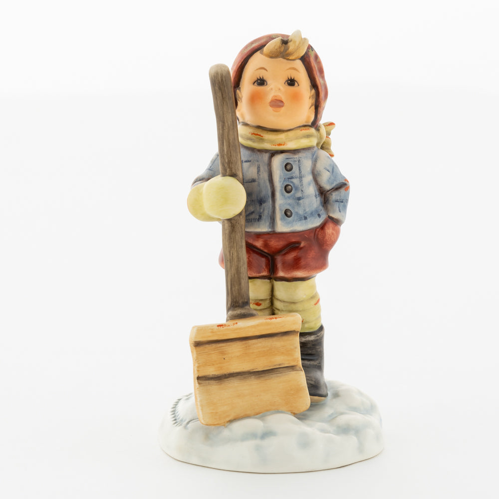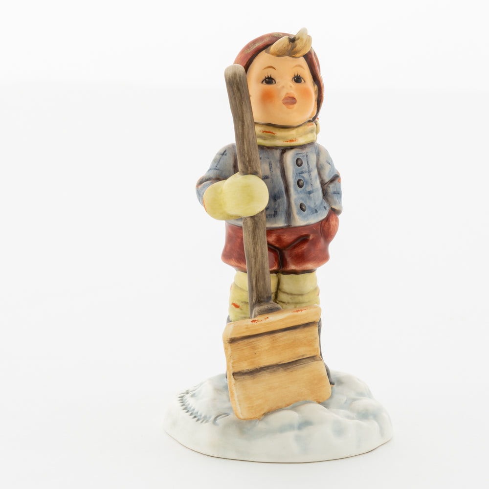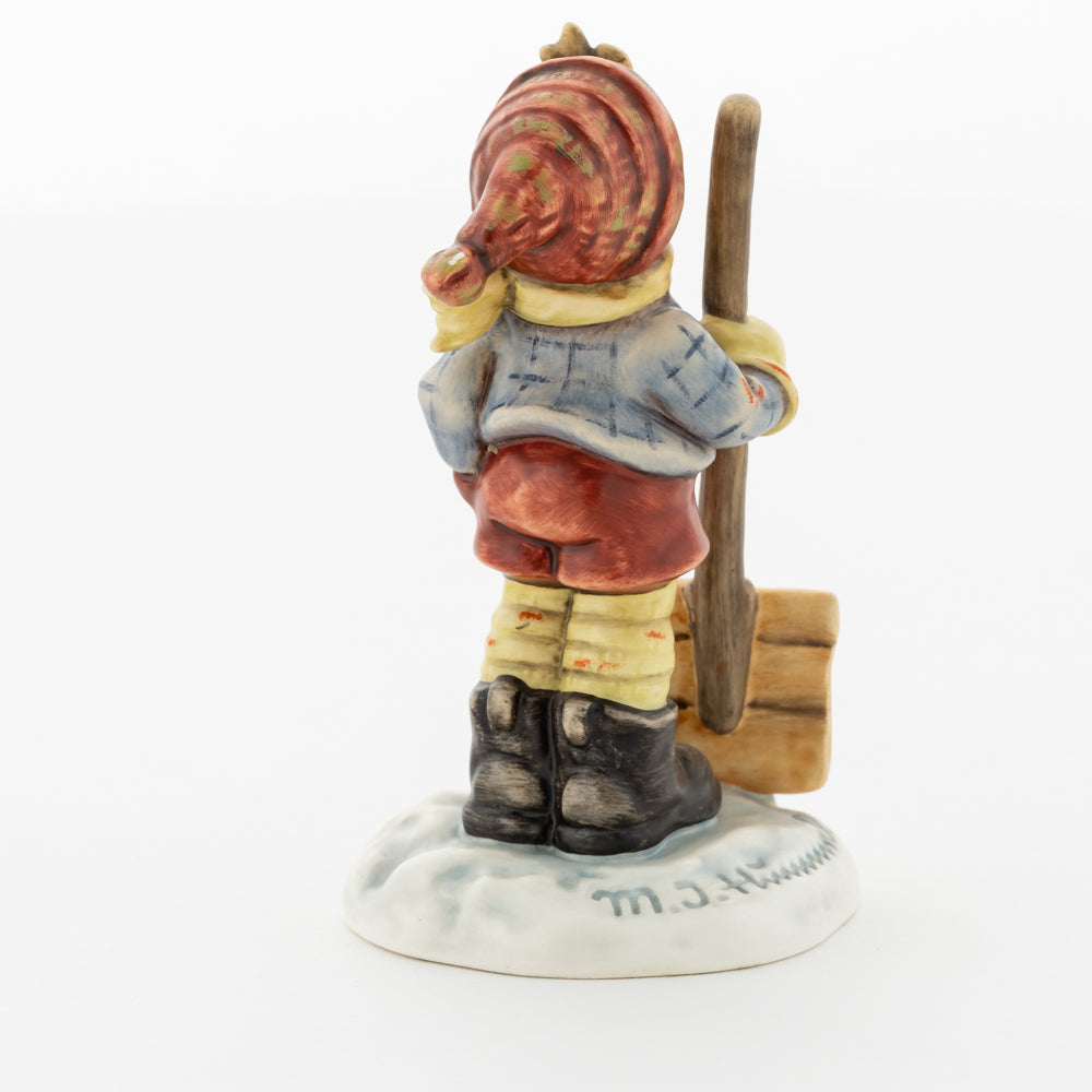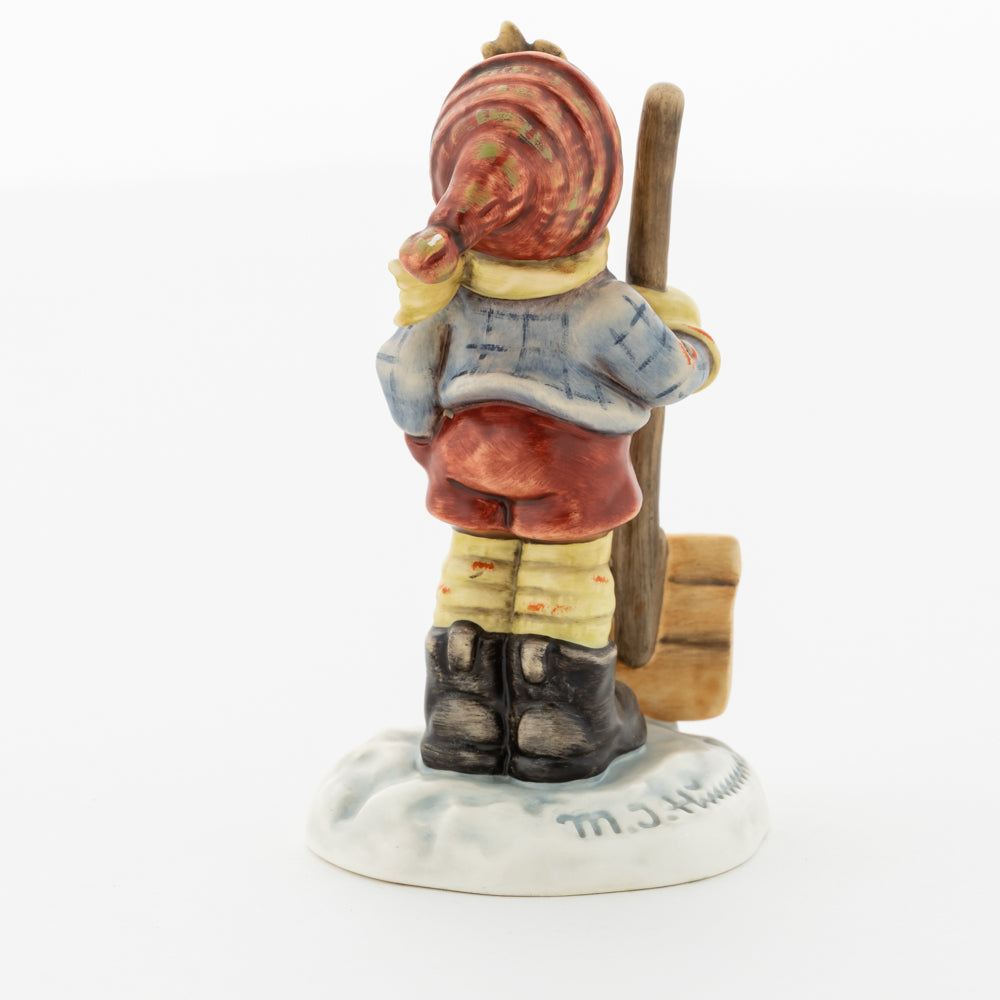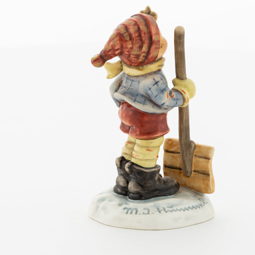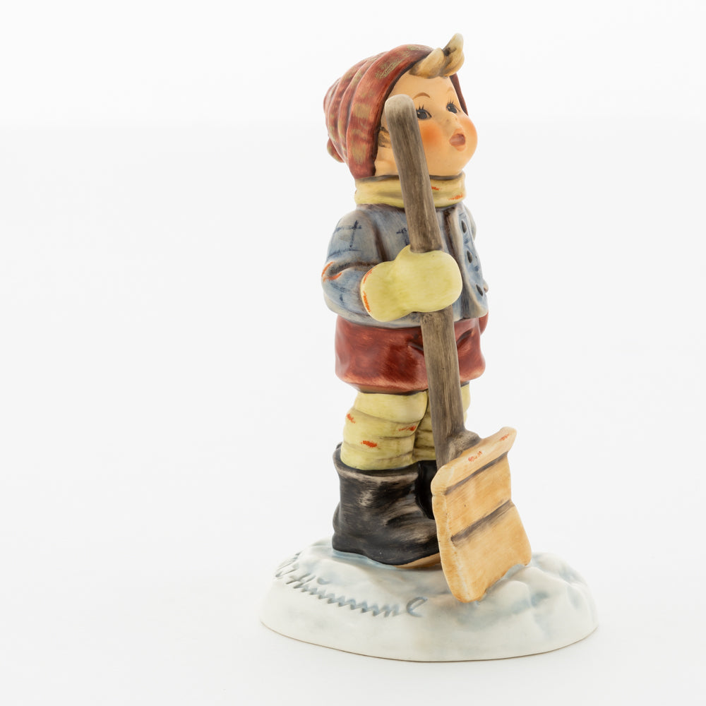 Gar nicht genug von der weißen Pracht kann der kleine Schneeräumer bekommen. In der Hoffnung auf neue Flocken schaut er sehnsüchtig zum Himmel, damit er und sein Schneeschieber wieder ordentlich zu tun haben. Den fleißigen Hummel-Bub, der mit Schal, Mütze und Wollstrümpfen dick eingemummelt seiner Arbeit nachgeht, modellierte Helmut Fischer im Jahr 1997. Im gleichen Jahr wurde auch „Mei, ist die schwer“ (HUM 2035/I) gestaltet – hier müht sich ein kleines Hummel-Mädchen an einer riesigen Schneekugel ab.