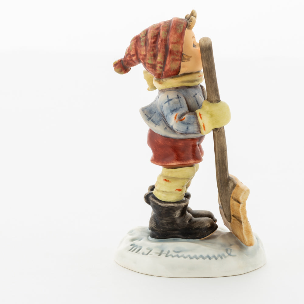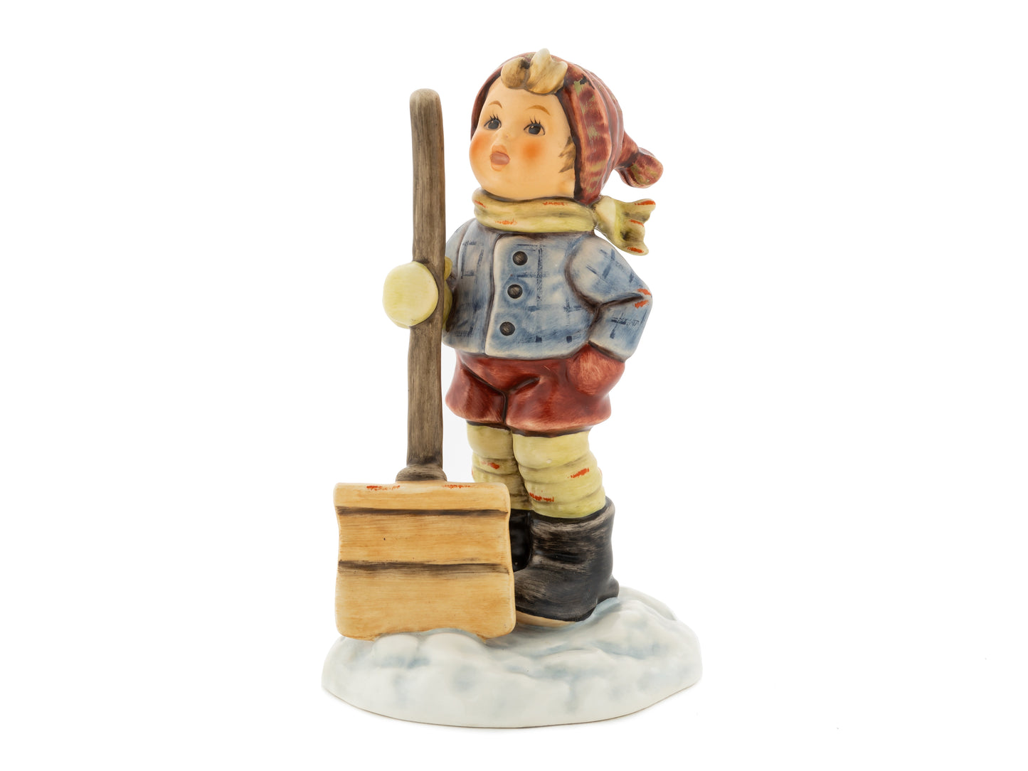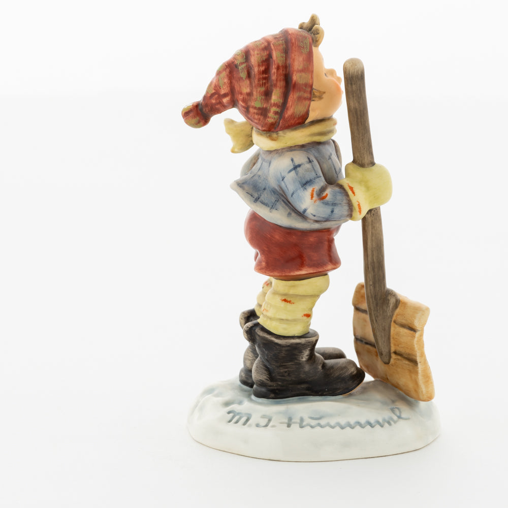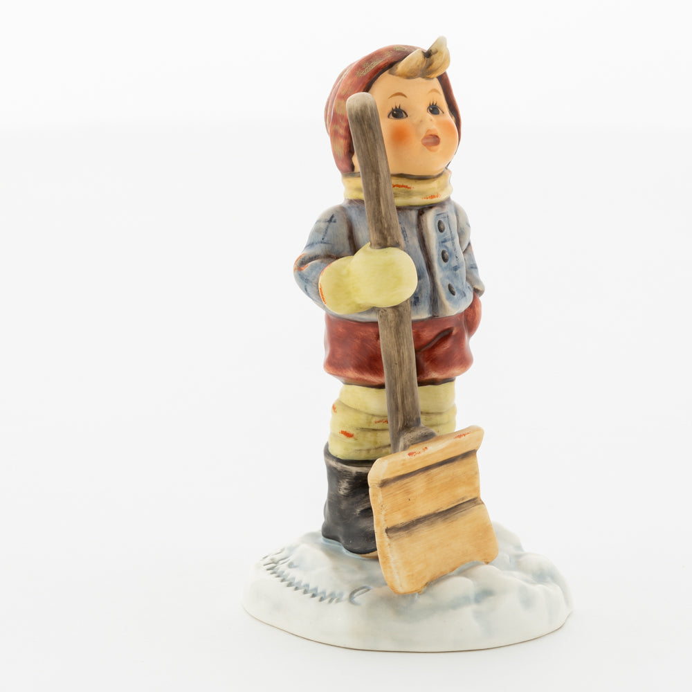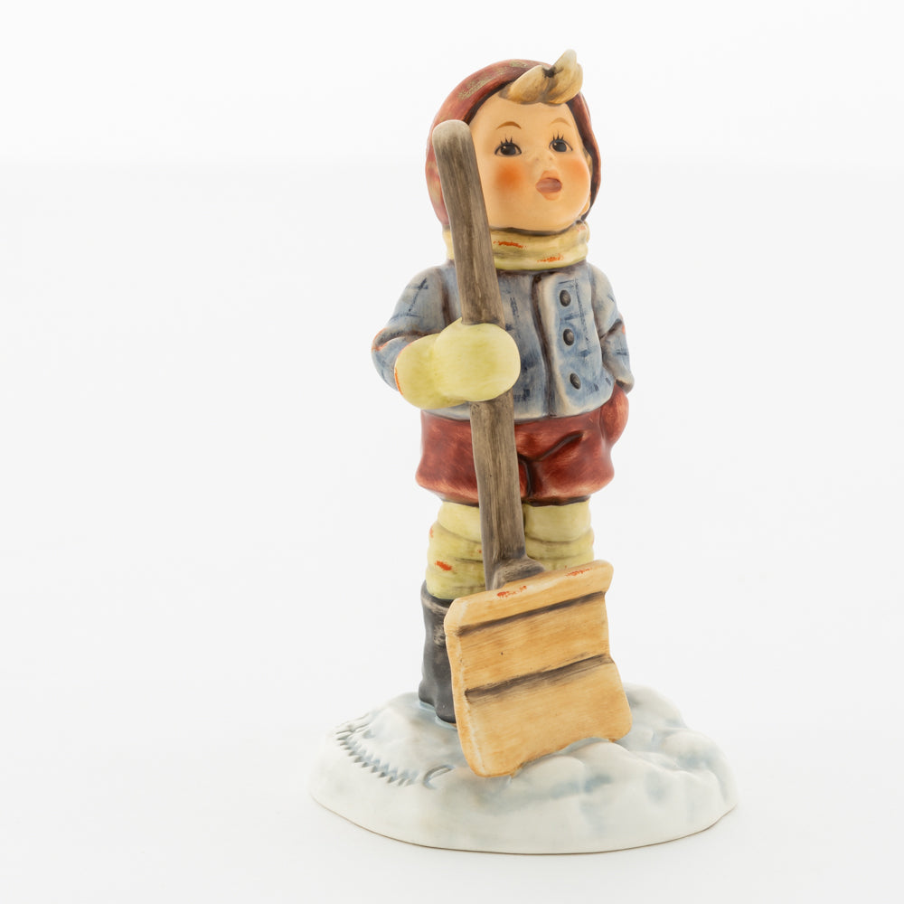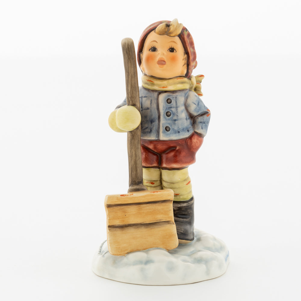 Gar nicht genug von der weißen Pracht kann der kleine Schneeräumer bekommen. In der Hoffnung auf neue Flocken schaut er sehnsüchtig zum Himmel, damit er und sein Schneeschieber wieder ordentlich zu tun haben. Den fleißigen Hummel-Bub, der mit Schal, Mütze und Wollstrümpfen dick eingemummelt seiner Arbeit nachgeht, modellierte Helmut Fischer im Jahr 1997. Im gleichen Jahr wurde auch „Mei, ist die schwer“ (HUM 2035/I) gestaltet – hier müht sich ein kleines Hummel-Mädchen an einer riesigen Schneekugel ab.