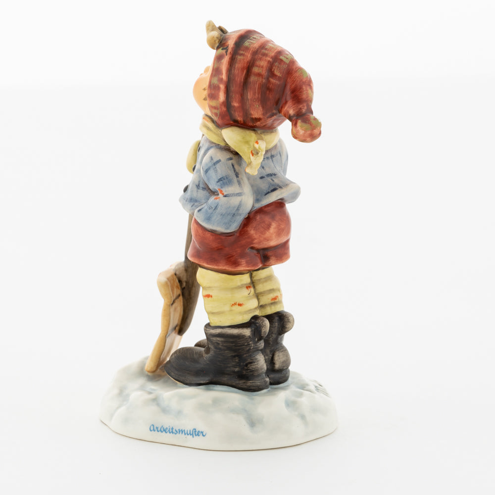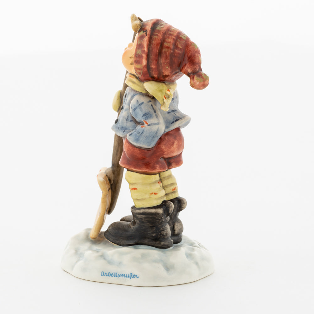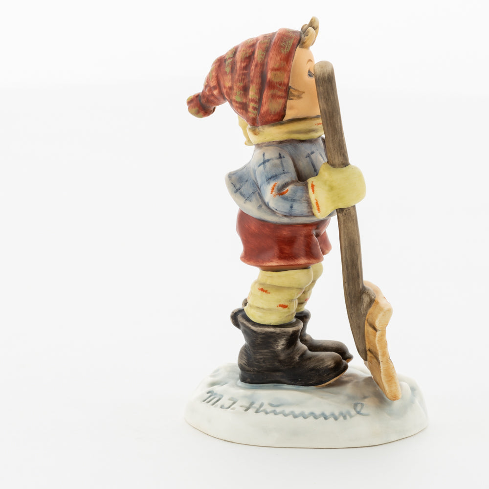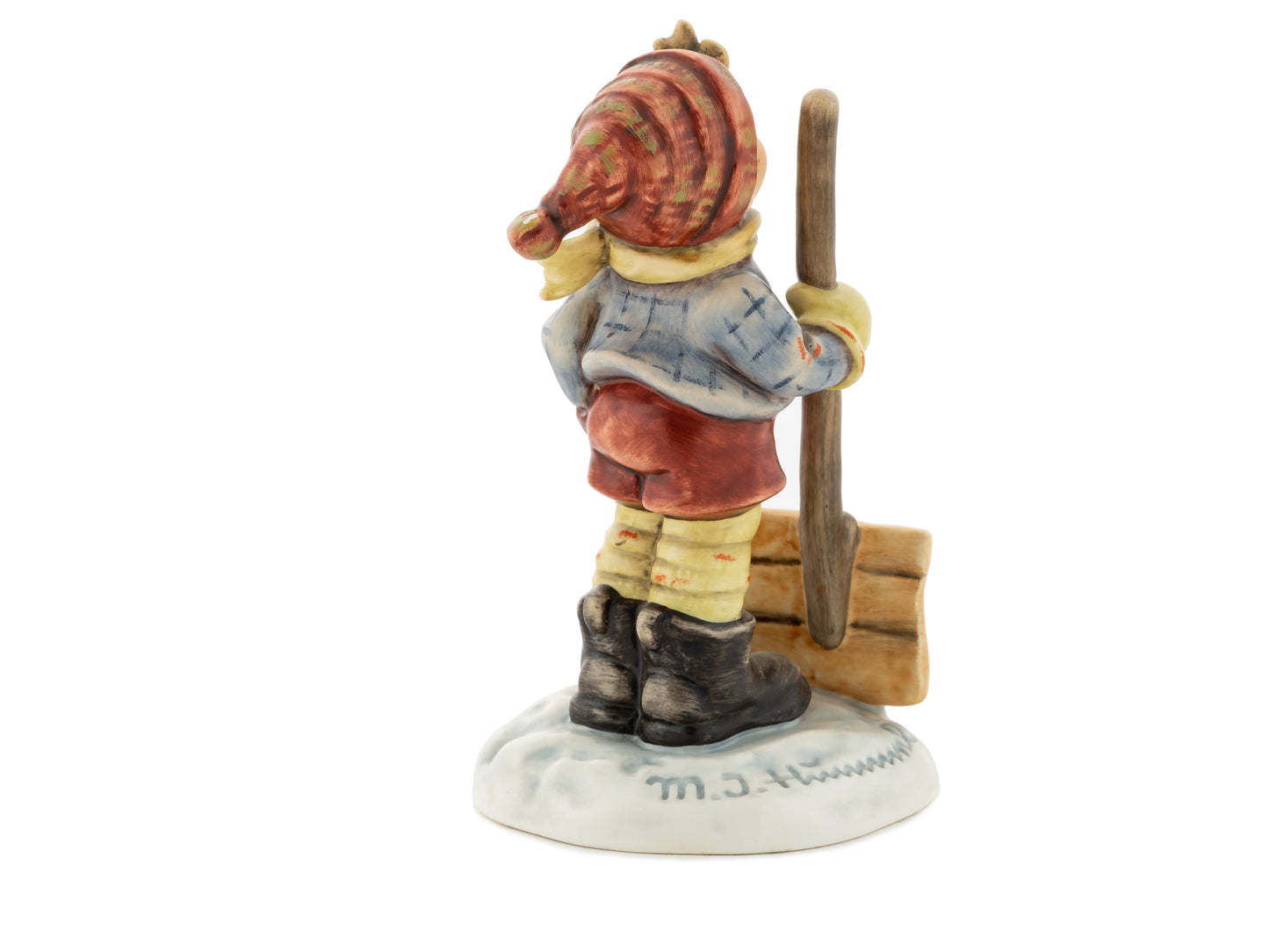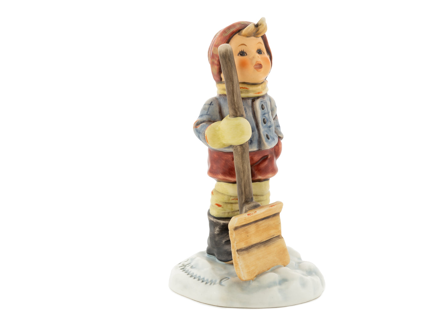Gar nicht genug von der weißen Pracht kann der kleine Schneeräumer bekommen. In der Hoffnung auf neue Flocken schaut er sehnsüchtig zum Himmel, damit er und sein Schneeschieber wieder ordentlich zu tun haben. Den fleißigen Hummel-Bub, der mit Schal, Mütze und Wollstrümpfen dick eingemummelt seiner Arbeit nachgeht, modellierte Helmut Fischer im Jahr 1997. Im gleichen Jahr wurde auch „Mei, ist die schwer“ (HUM 2035/I) gestaltet – hier müht sich ein kleines Hummel-Mädchen an einer riesigen Schneekugel ab.