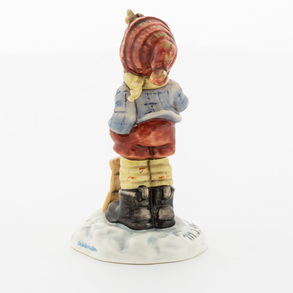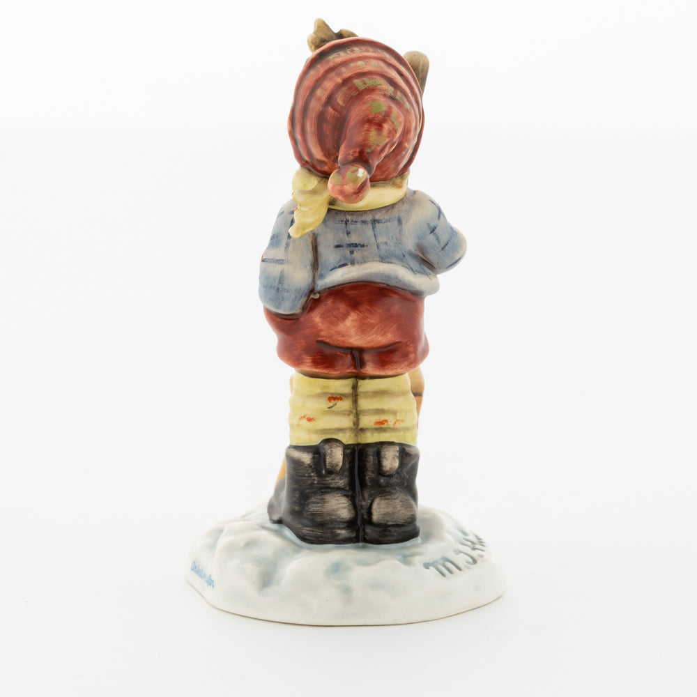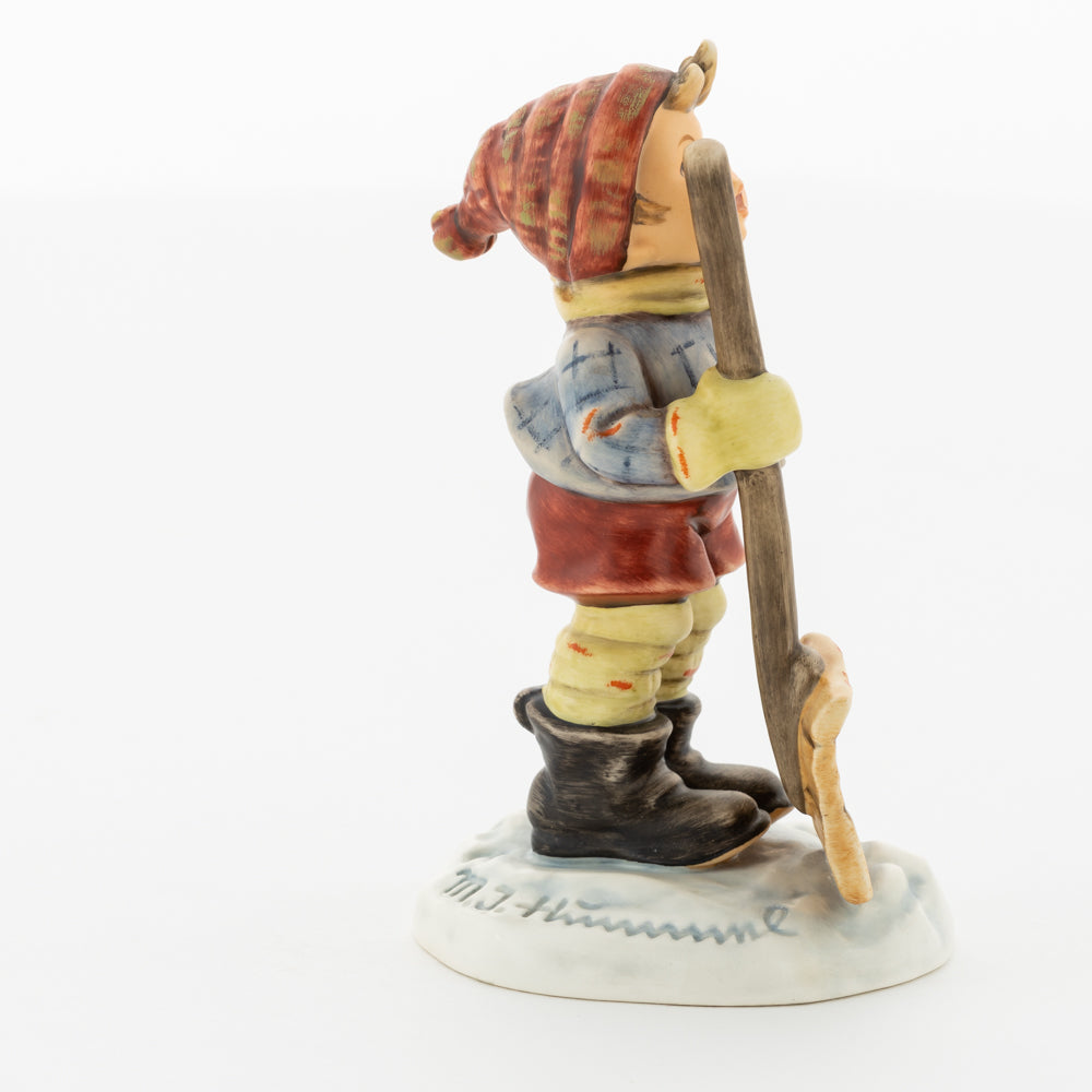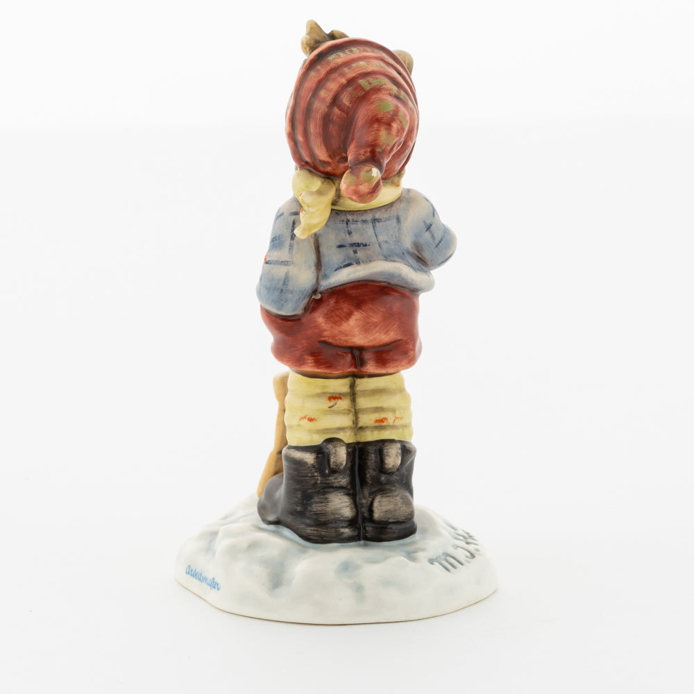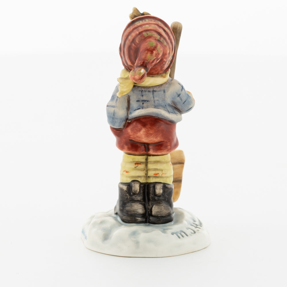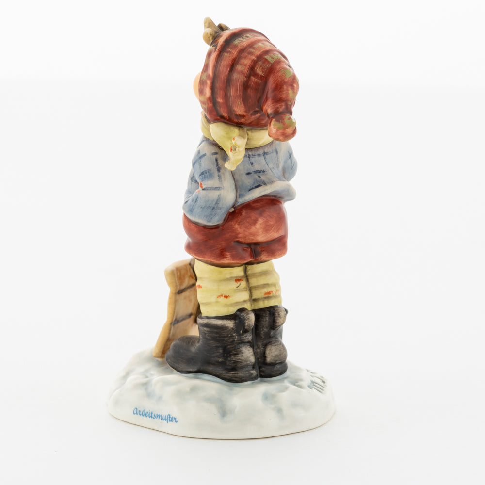 Gar nicht genug von der weißen Pracht kann der kleine Schneeräumer bekommen. In der Hoffnung auf neue Flocken schaut er sehnsüchtig zum Himmel, damit er und sein Schneeschieber wieder ordentlich zu tun haben. Den fleißigen Hummel-Bub, der mit Schal, Mütze und Wollstrümpfen dick eingemummelt seiner Arbeit nachgeht, modellierte Helmut Fischer im Jahr 1997. Im gleichen Jahr wurde auch „Mei, ist die schwer“ (HUM 2035/I) gestaltet – hier müht sich ein kleines Hummel-Mädchen an einer riesigen Schneekugel ab.