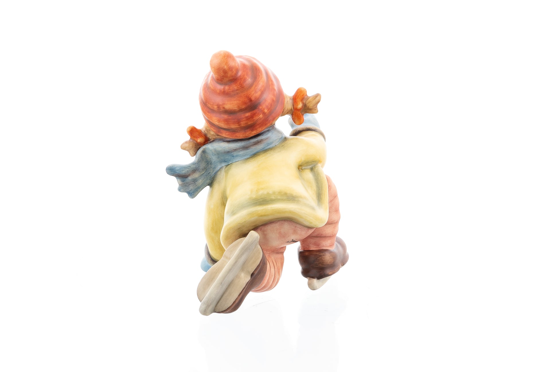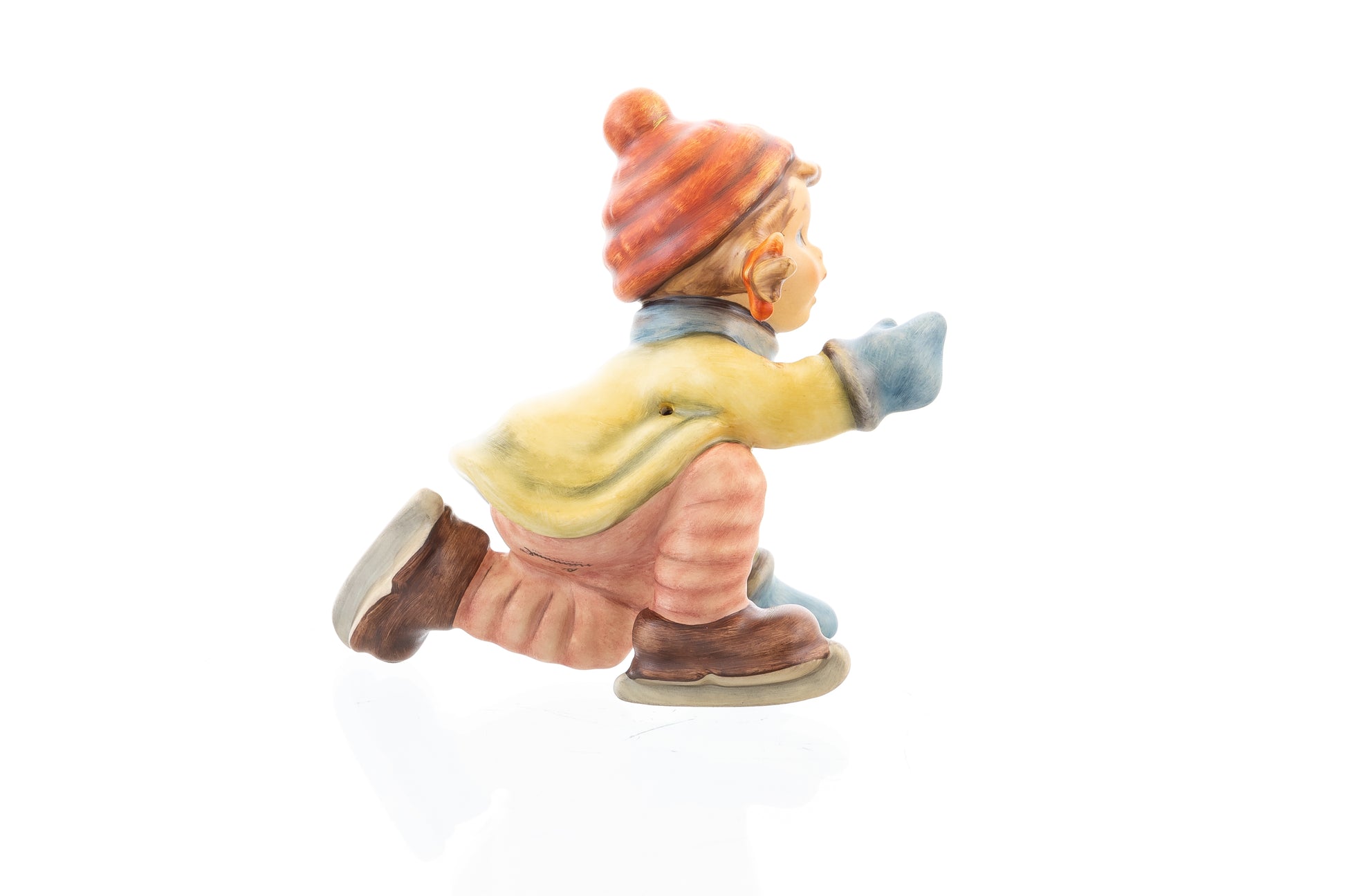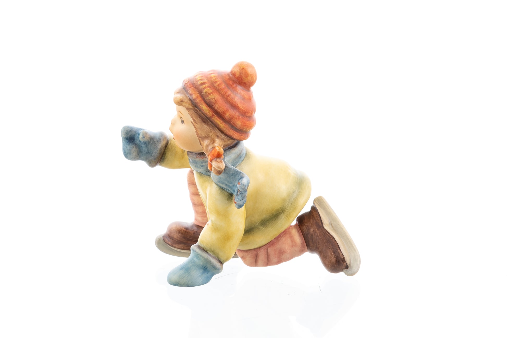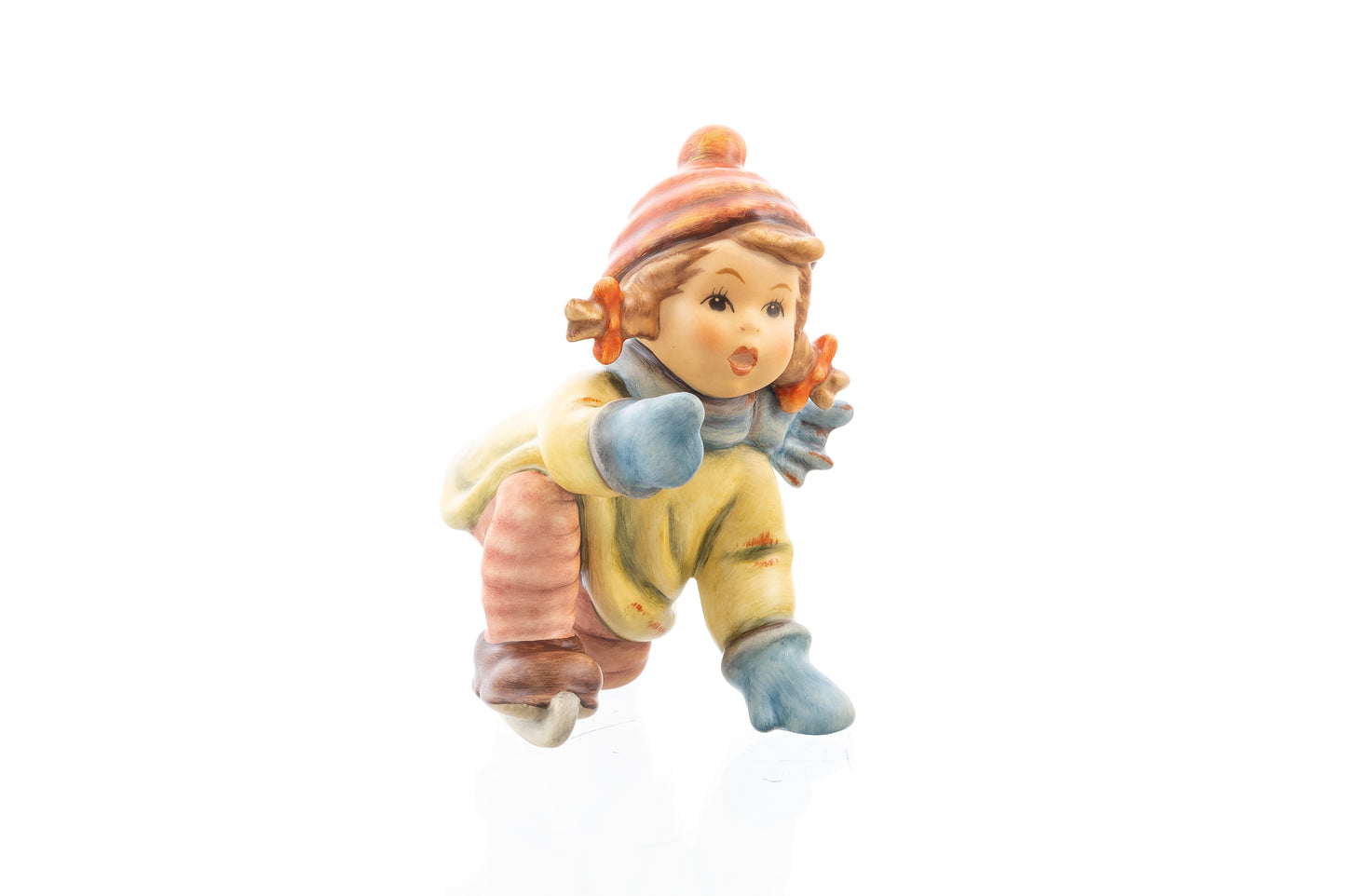 Die Partnerfigur von „Hilfst du mir“ ist „Aller Anfang ist schwer“ (HUM 2058/B) – den Freund des kleinen Hummel-Mädchens hat es auch nicht mehr auf den Füßen gehalten. Auf seinen vier Buchstaben sitzt er auf dem Eis. Doch gleich werden beide wieder auf das Eis steigen und losdüsen – so, wie man es im Winter eben macht.