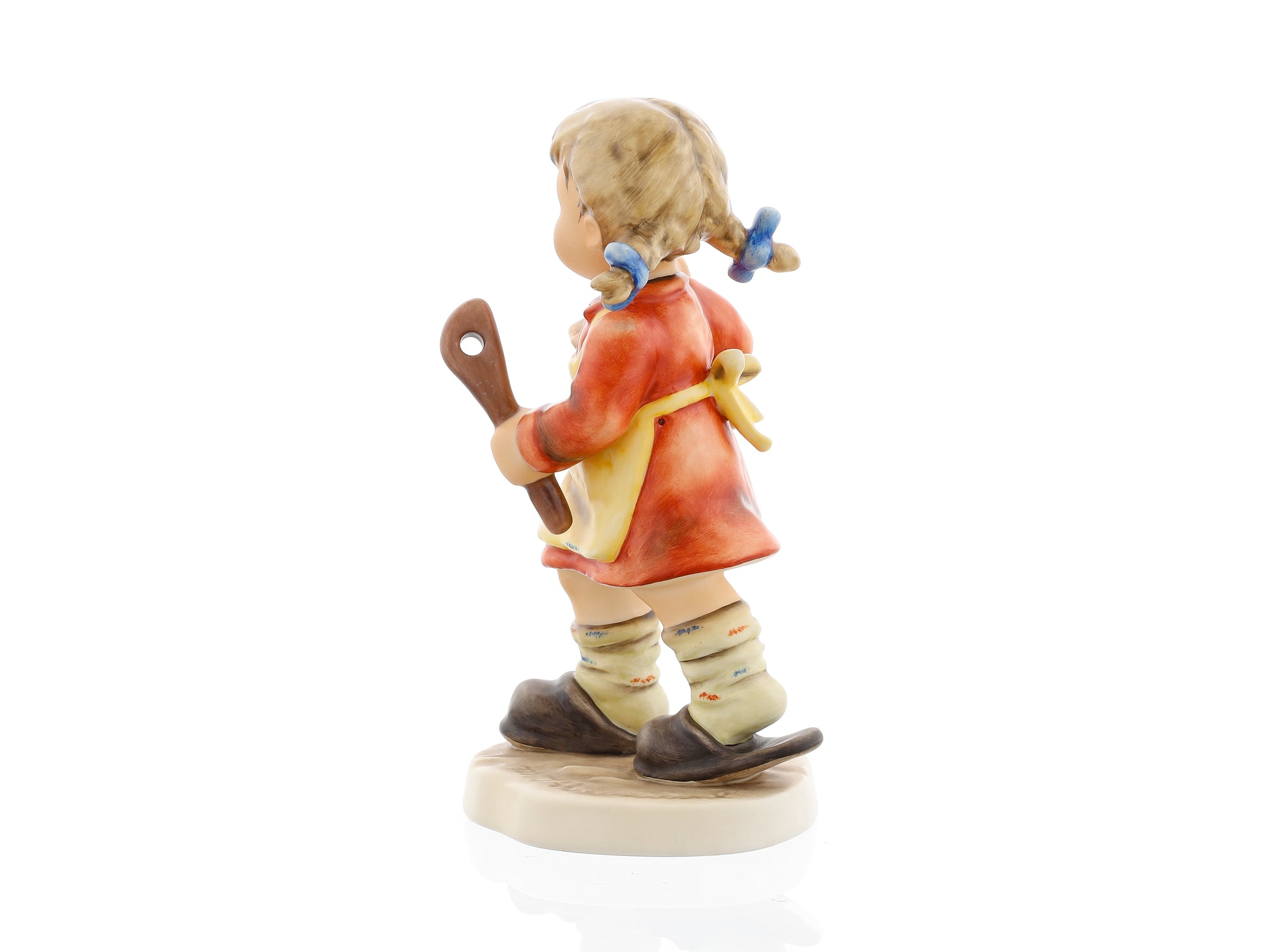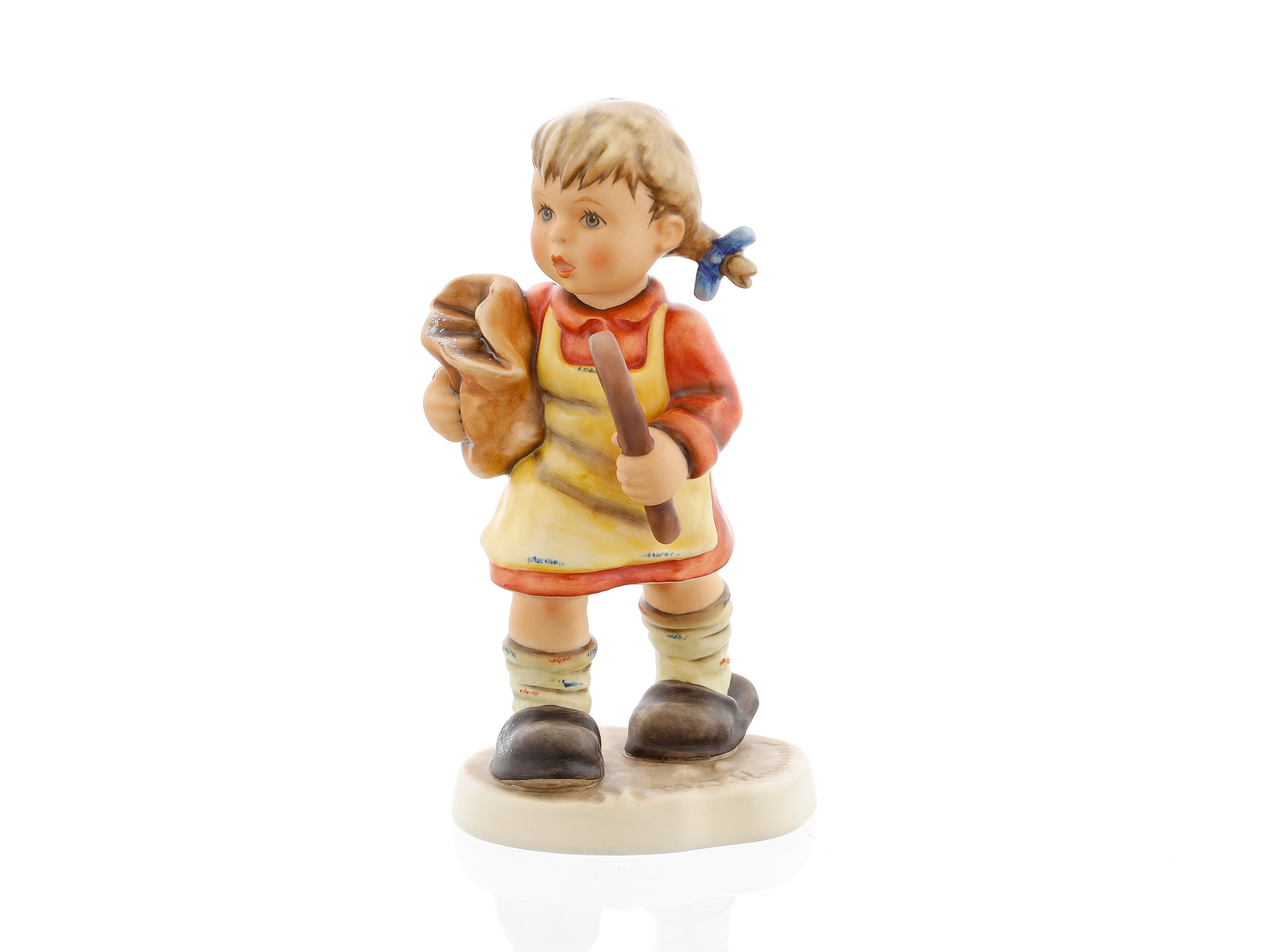 Unsere Hummel-Figur „… der Bäcker hat gerufen“ (HUM 2167) ist das liebliche Abbild einer kleinen Bäckerin – mit Liebe modelliert und detailreich angemalt: mit kleinen blauen Haarschleifen, einem roten Kleidchen mit Bubikragen und sogar mit etwas Mehl auf den Schlappen.