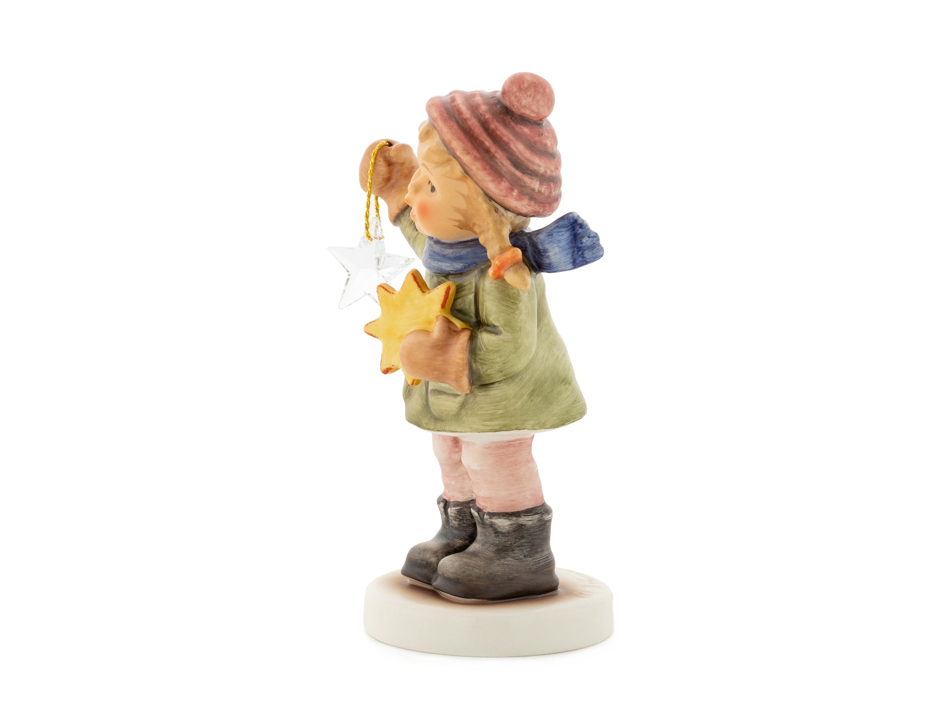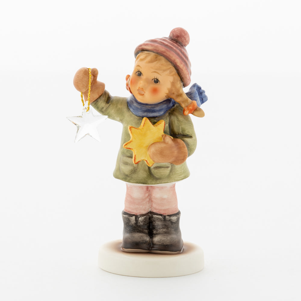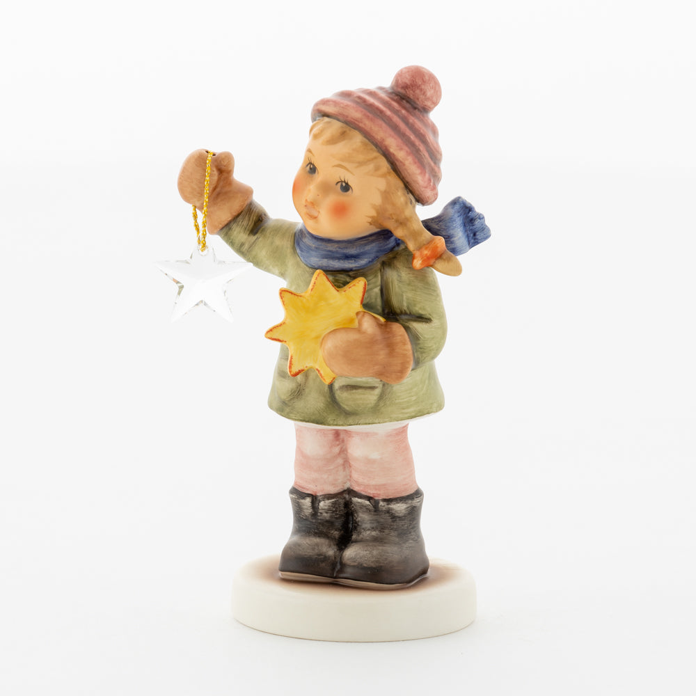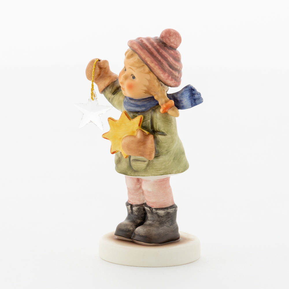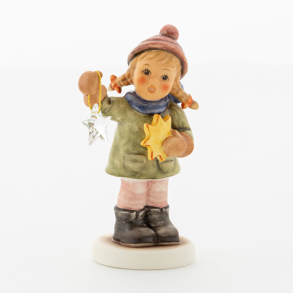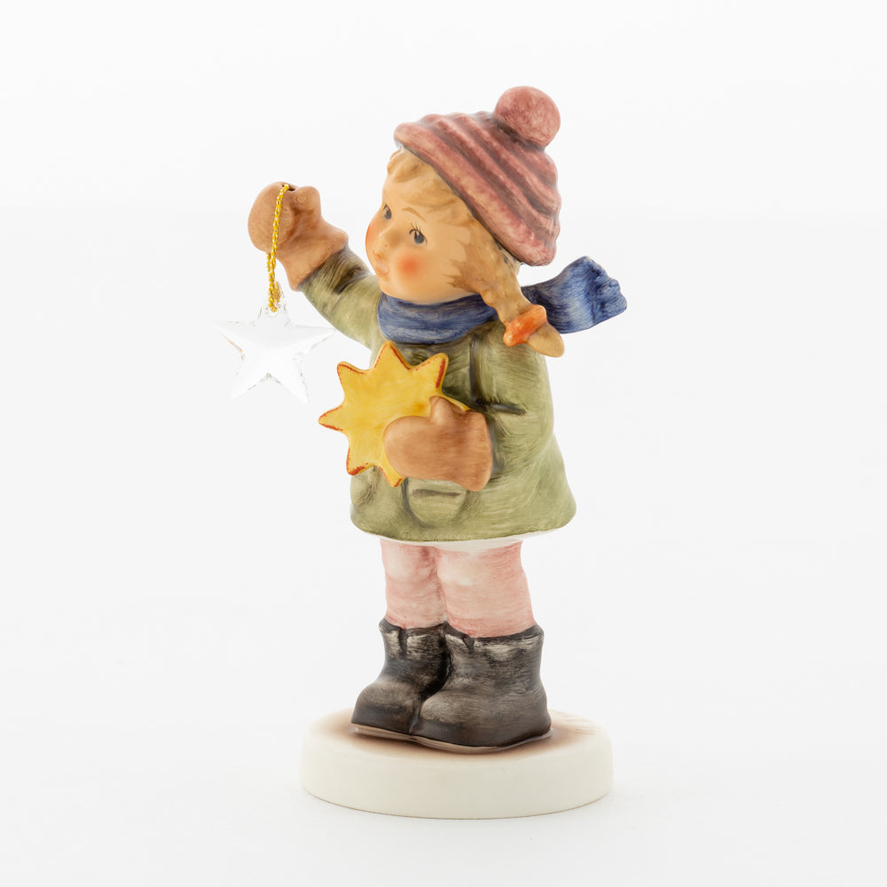 Das erste Mal darf unser kleines Hummel-Mädchen helfen, den Baum zu schmücken. Die roten Bäckchen sind vor Freude gerötet. Vorsichtig trägt das Kind den kostbaren kristallinen Swarovski-Stern vor sich her, damit er auch ja nicht zerbricht. Den zweiten goldenen Stern hat es fest an die Brust gedrückt. Ach, wie sehr es sich doch auf Weihnachten freut! Im Jahr 2004 fing Modelleurin Tamara Fuchs diese liebevolle Szene ein, die Sie durch die Weihnachtszeit begleiten wird und das Herz erfreut.