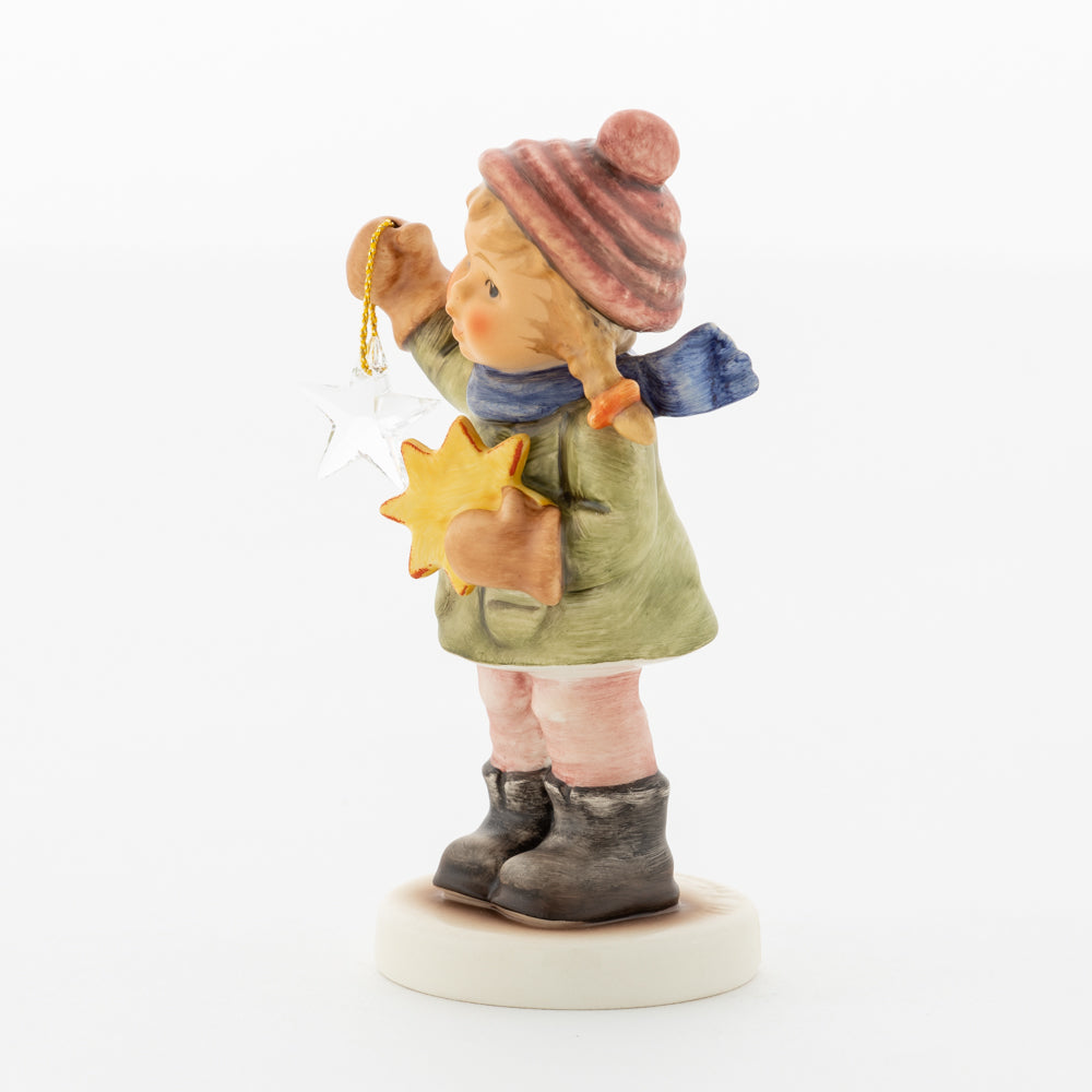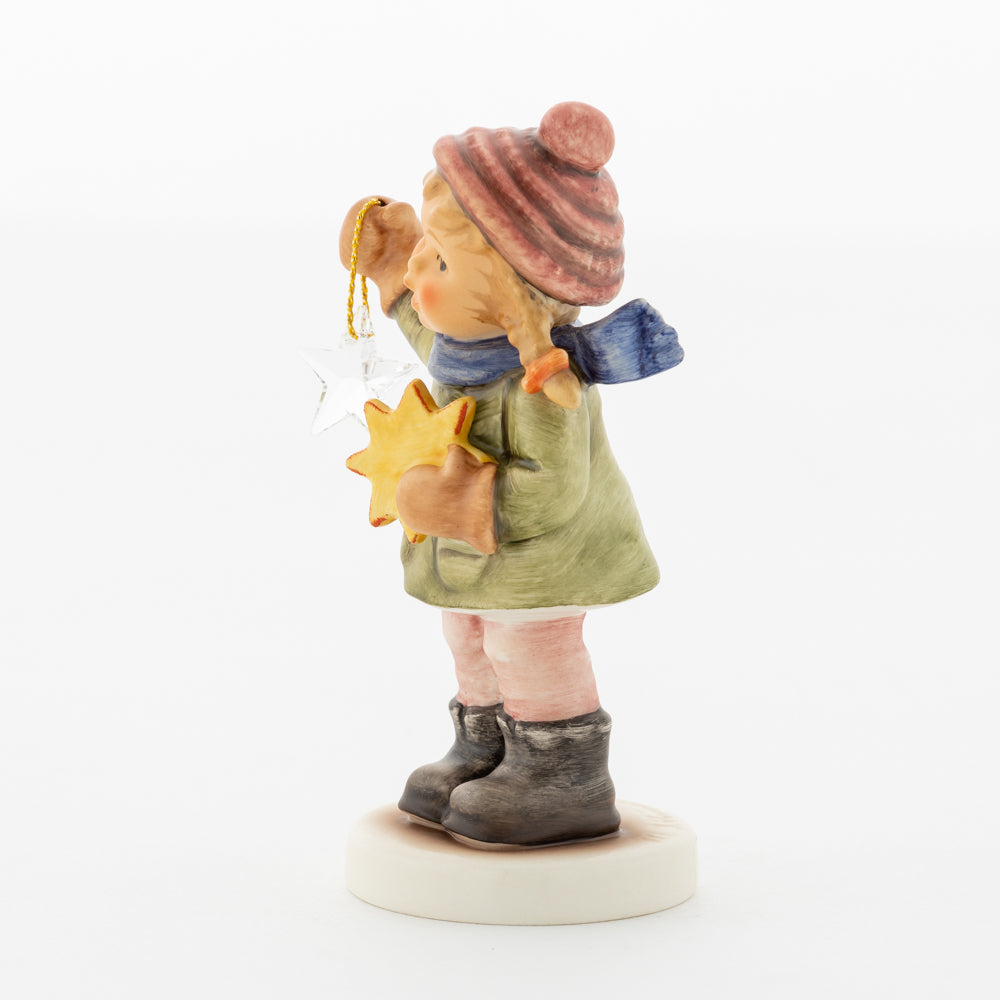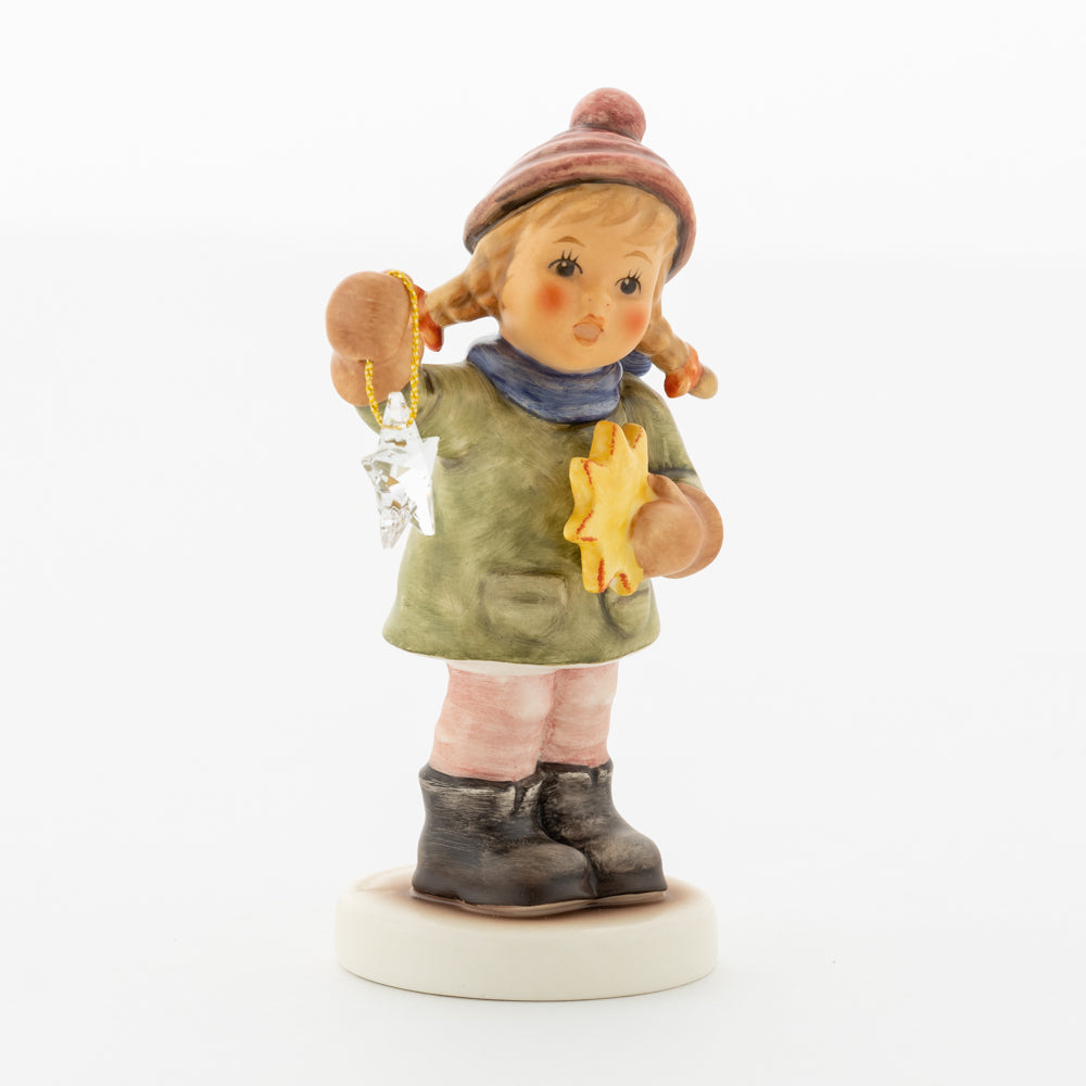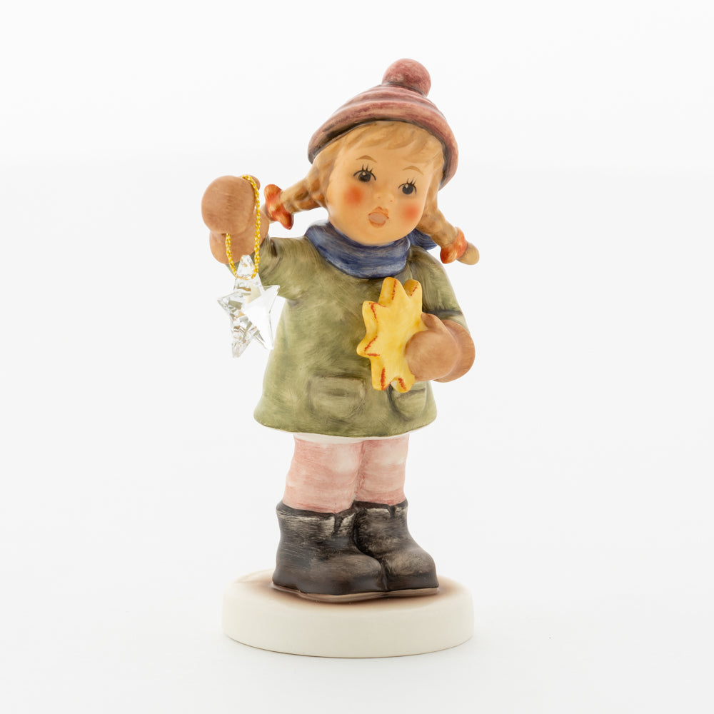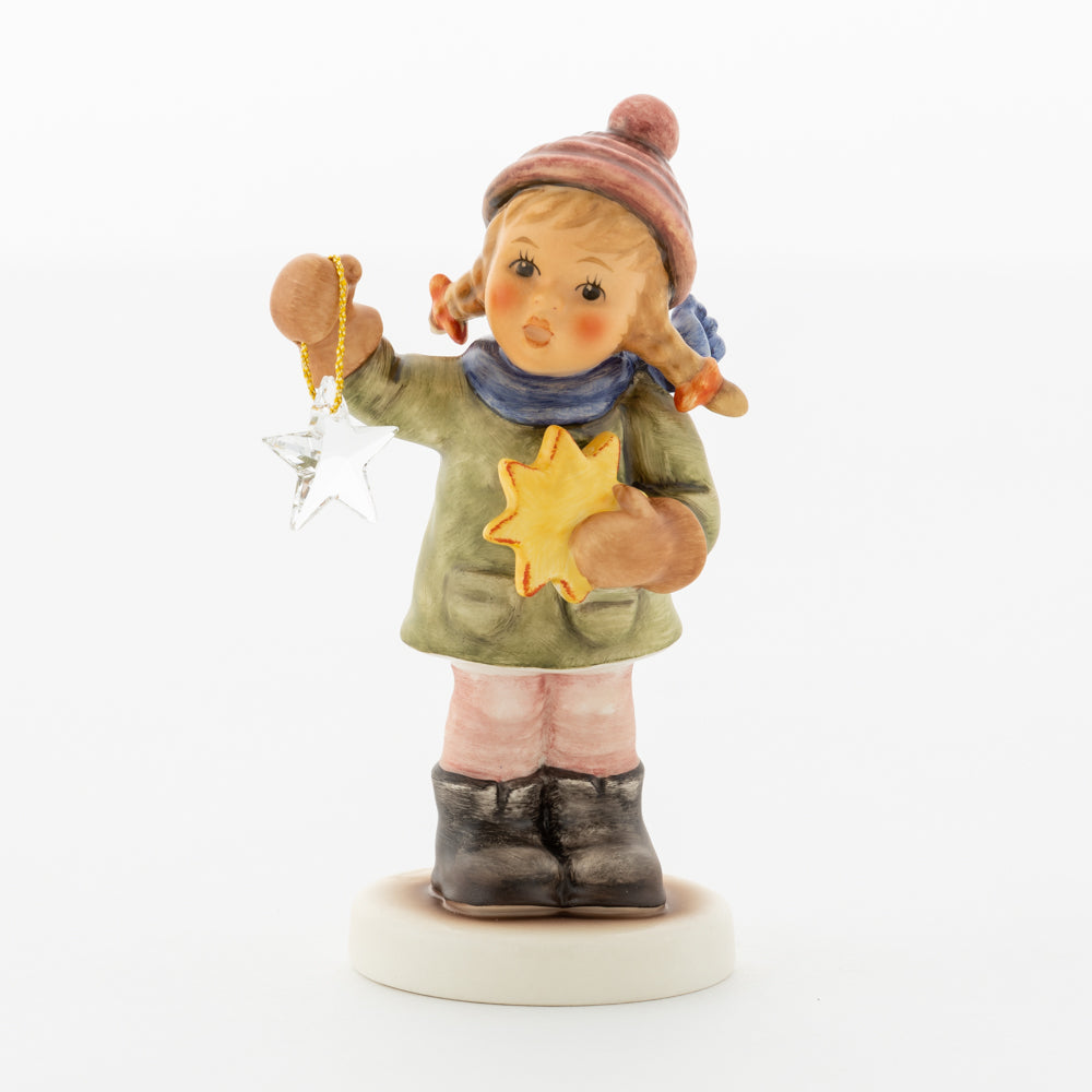 Das erste Mal darf unser kleines Hummel-Mädchen helfen, den Baum zu schmücken. Die roten Bäckchen sind vor Freude gerötet. Vorsichtig trägt das Kind den kostbaren kristallinen Swarovski-Stern vor sich her, damit er auch ja nicht zerbricht. Den zweiten goldenen Stern hat es fest an die Brust gedrückt. Ach, wie sehr es sich doch auf Weihnachten freut! Im Jahr 2004 fing Modelleurin Tamara Fuchs diese liebevolle Szene ein, die Sie durch die Weihnachtszeit begleiten wird und das Herz erfreut.