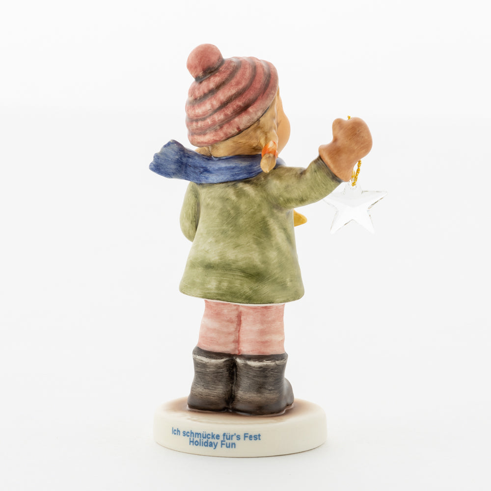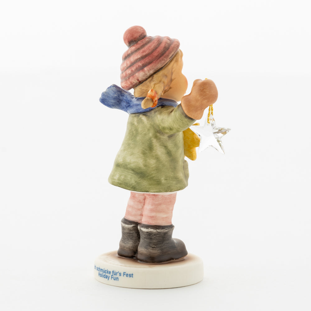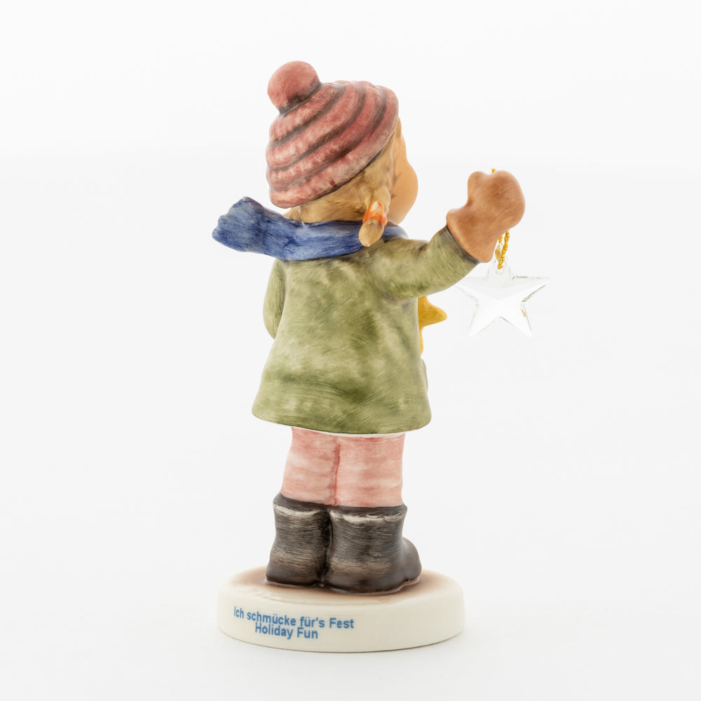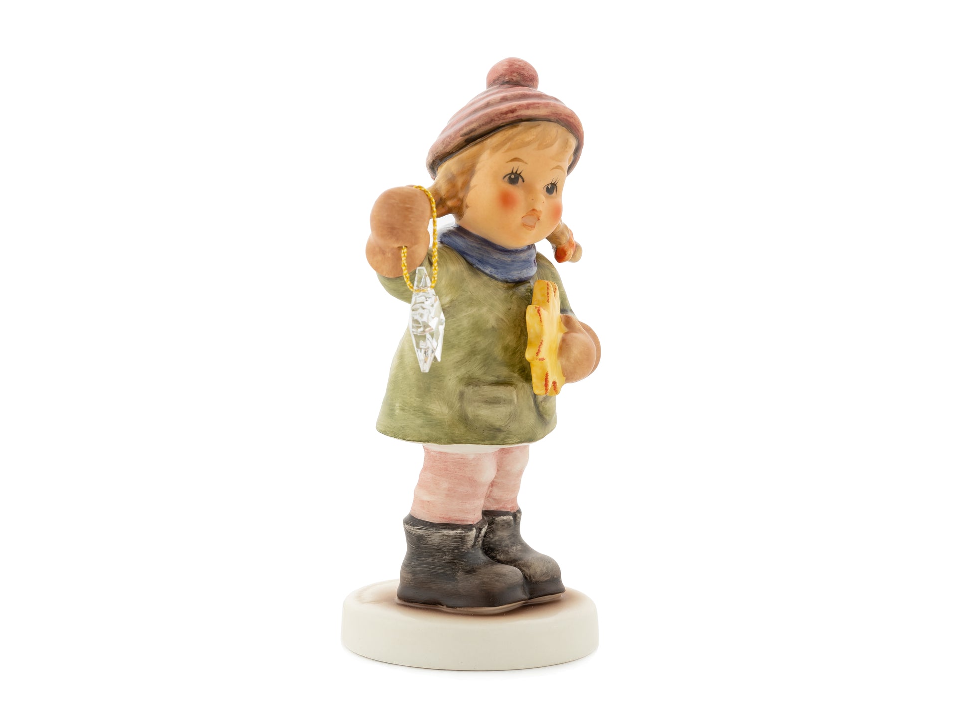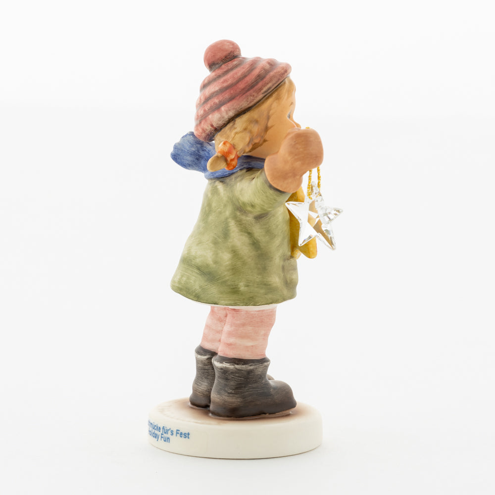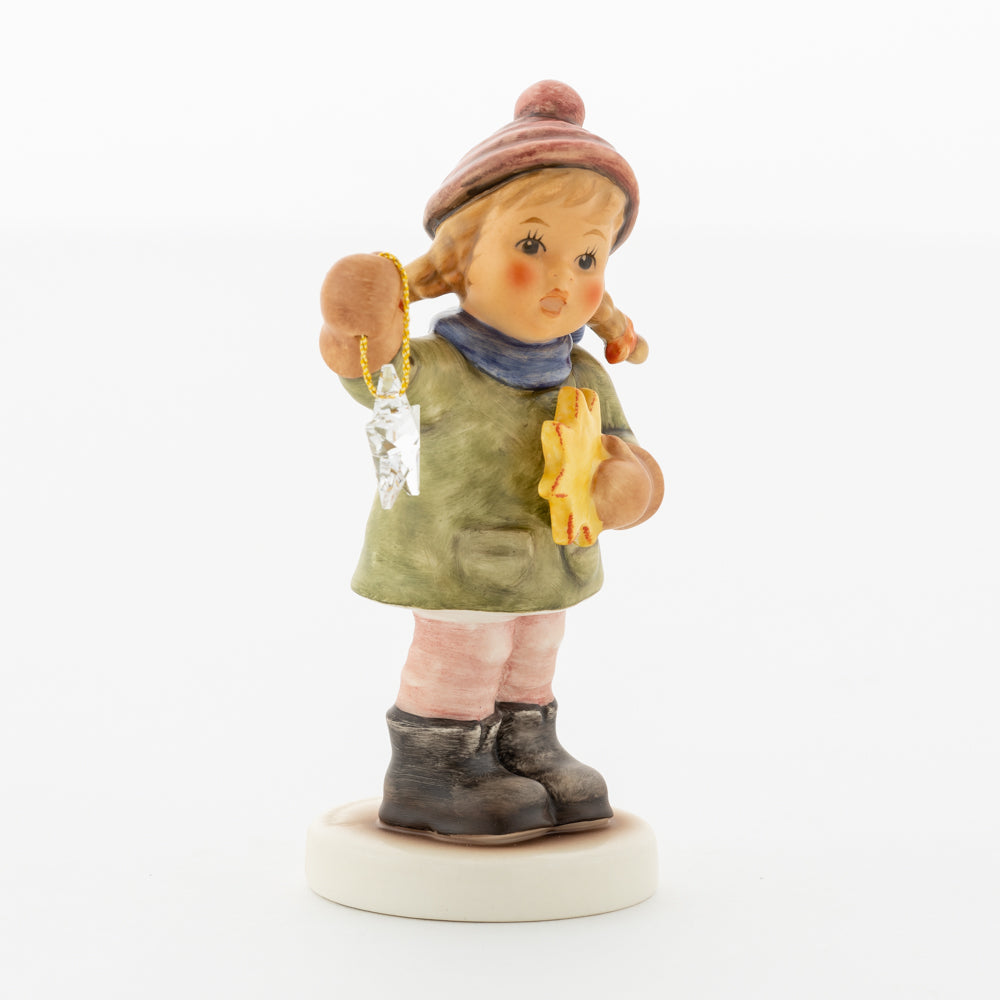 Das erste Mal darf unser kleines Hummel-Mädchen helfen, den Baum zu schmücken. Die roten Bäckchen sind vor Freude gerötet. Vorsichtig trägt das Kind den kostbaren kristallinen Swarovski-Stern vor sich her, damit er auch ja nicht zerbricht. Den zweiten goldenen Stern hat es fest an die Brust gedrückt. Ach, wie sehr es sich doch auf Weihnachten freut! Im Jahr 2004 fing Modelleurin Tamara Fuchs diese liebevolle Szene ein, die Sie durch die Weihnachtszeit begleiten wird und das Herz erfreut.