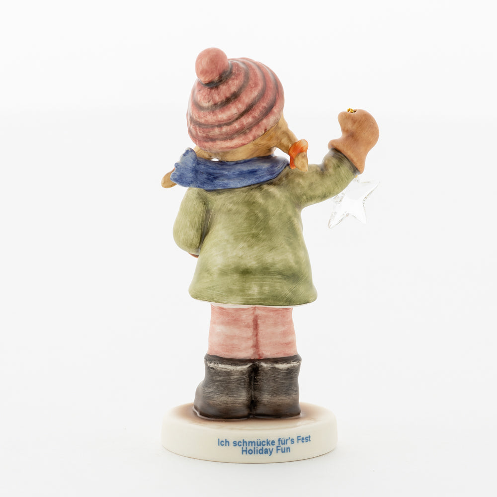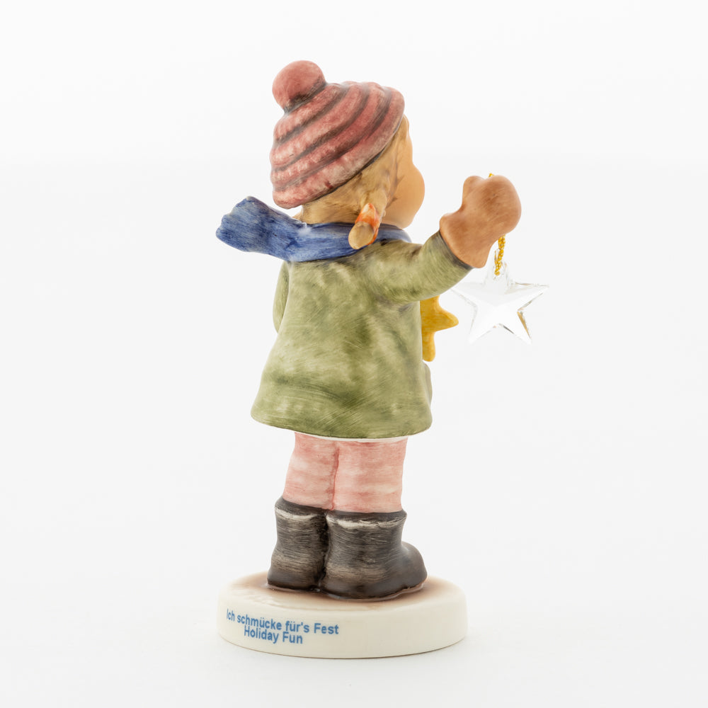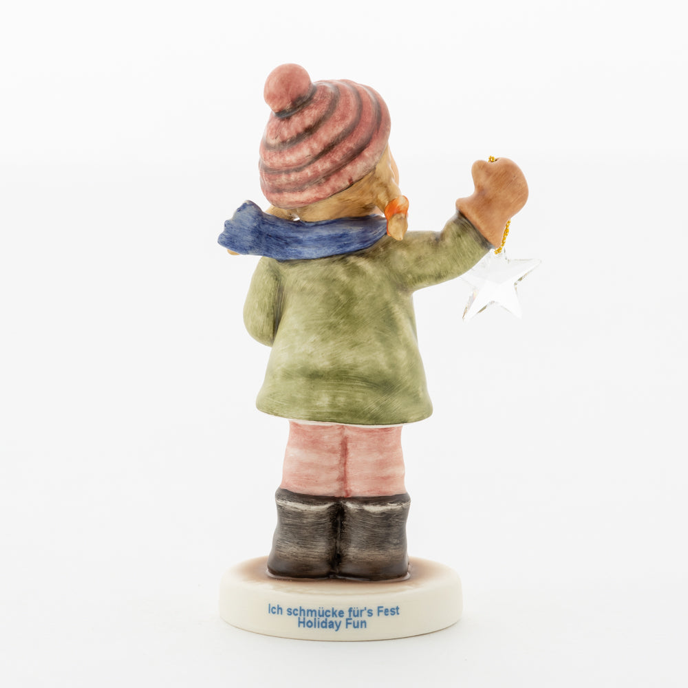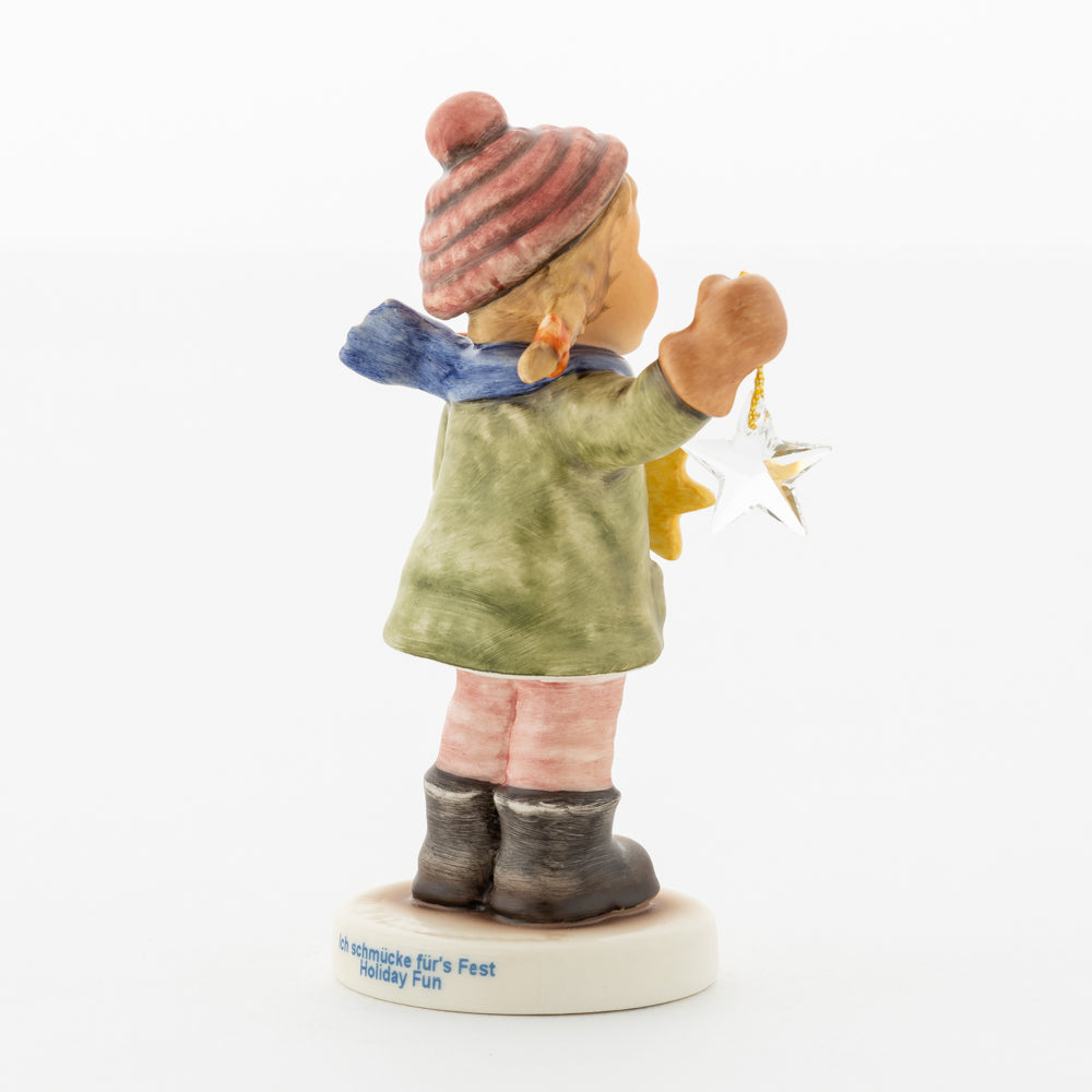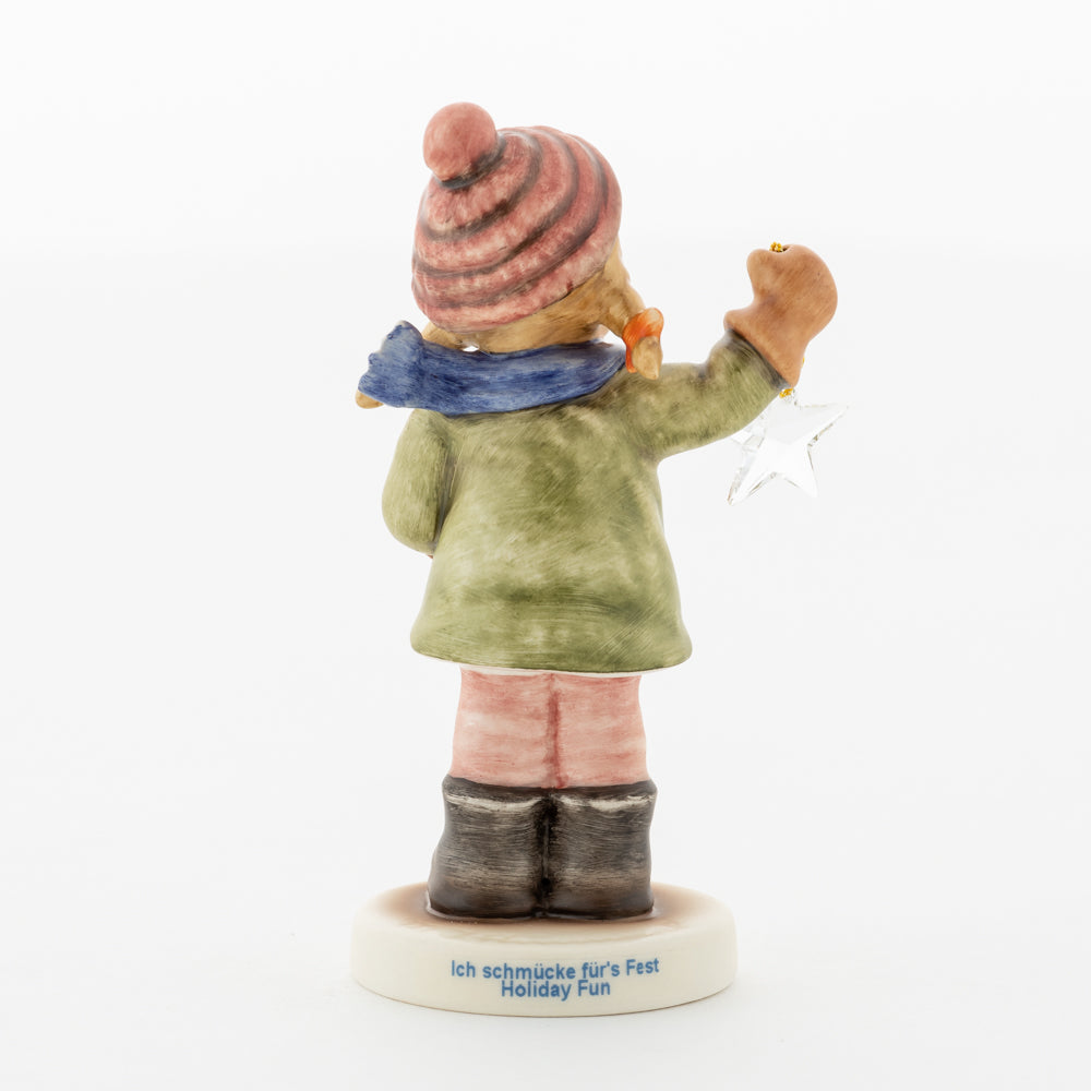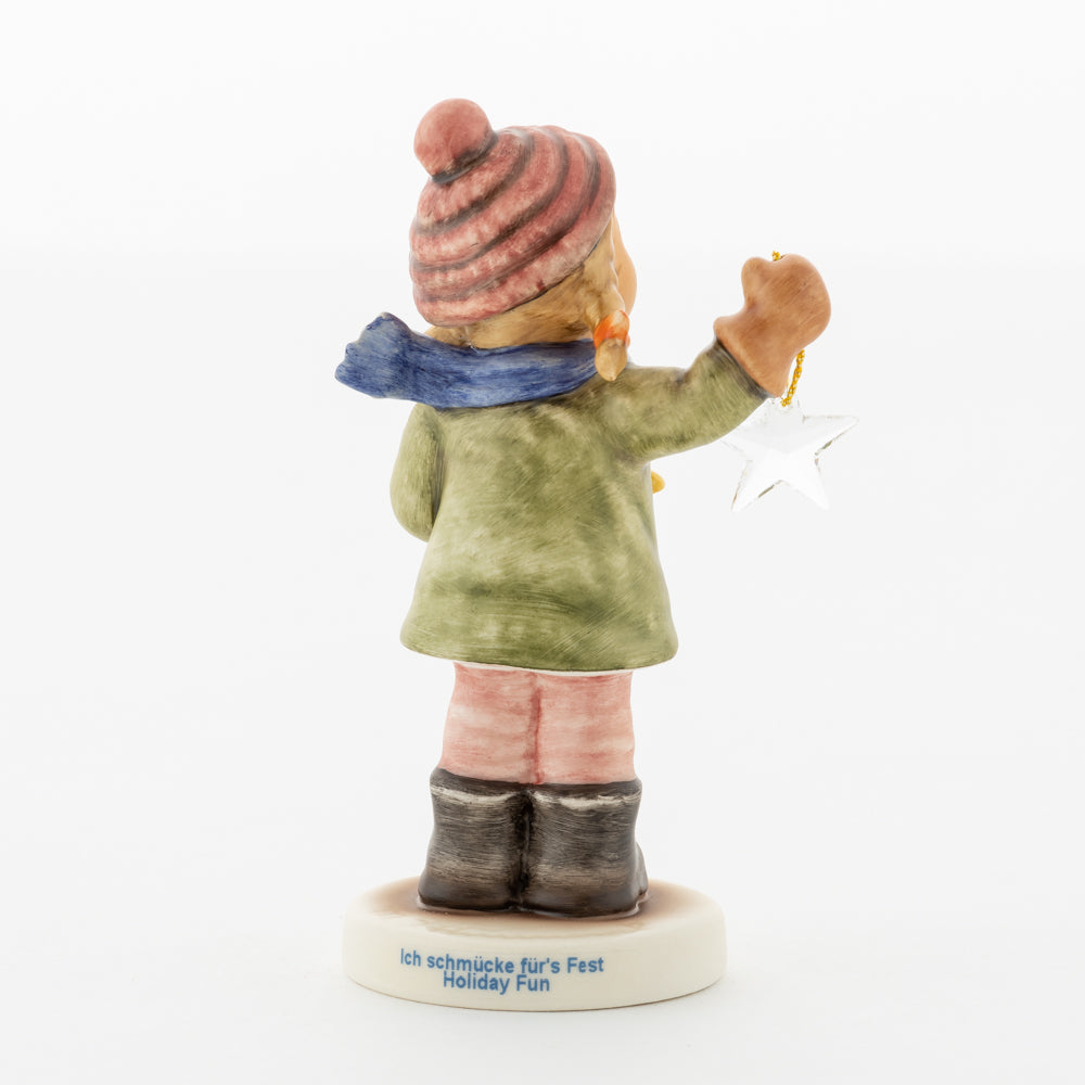 Das erste Mal darf unser kleines Hummel-Mädchen helfen, den Baum zu schmücken. Die roten Bäckchen sind vor Freude gerötet. Vorsichtig trägt das Kind den kostbaren kristallinen Swarovski-Stern vor sich her, damit er auch ja nicht zerbricht. Den zweiten goldenen Stern hat es fest an die Brust gedrückt. Ach, wie sehr es sich doch auf Weihnachten freut! Im Jahr 2004 fing Modelleurin Tamara Fuchs diese liebevolle Szene ein, die Sie durch die Weihnachtszeit begleiten wird und das Herz erfreut.