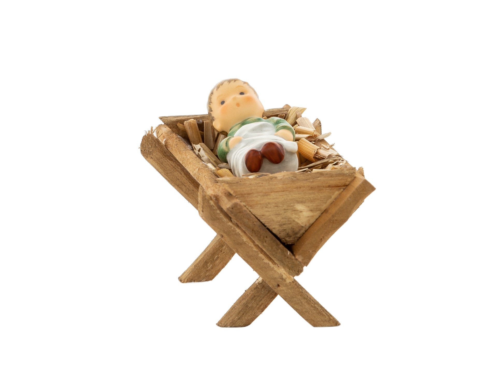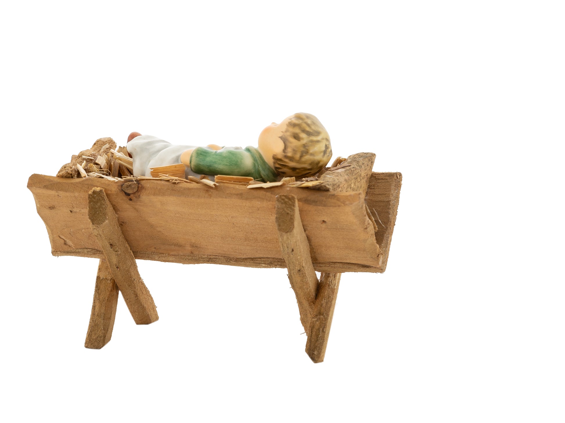 In der Weihnachtsgeschichte ist überliefert, dass Maria und Josef keine richtige Krippe im Stall fanden. Daher betteten sie das Jesuskind in eine Futterkrippe – eine bis heute gängige Darstellung des Jesuskindes. In der Krippe der Hummel Manufaktur liegt Jesus ebenfalls in einer kleinen Holzkrippe. In der christlichen Kunst ist dieses Motiv seit dem 3. Jahrhundert beliebt und steht auch heute wie kein anderes für die Weihnachtsgeschichte. Den Namen Jesus wählte seine Mutter Maria auf Geheiß der Engel aus.