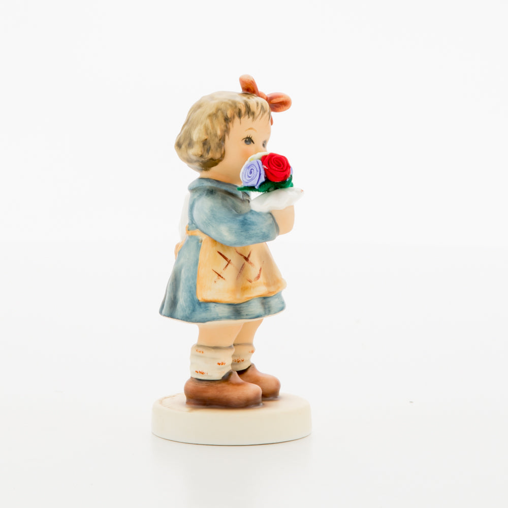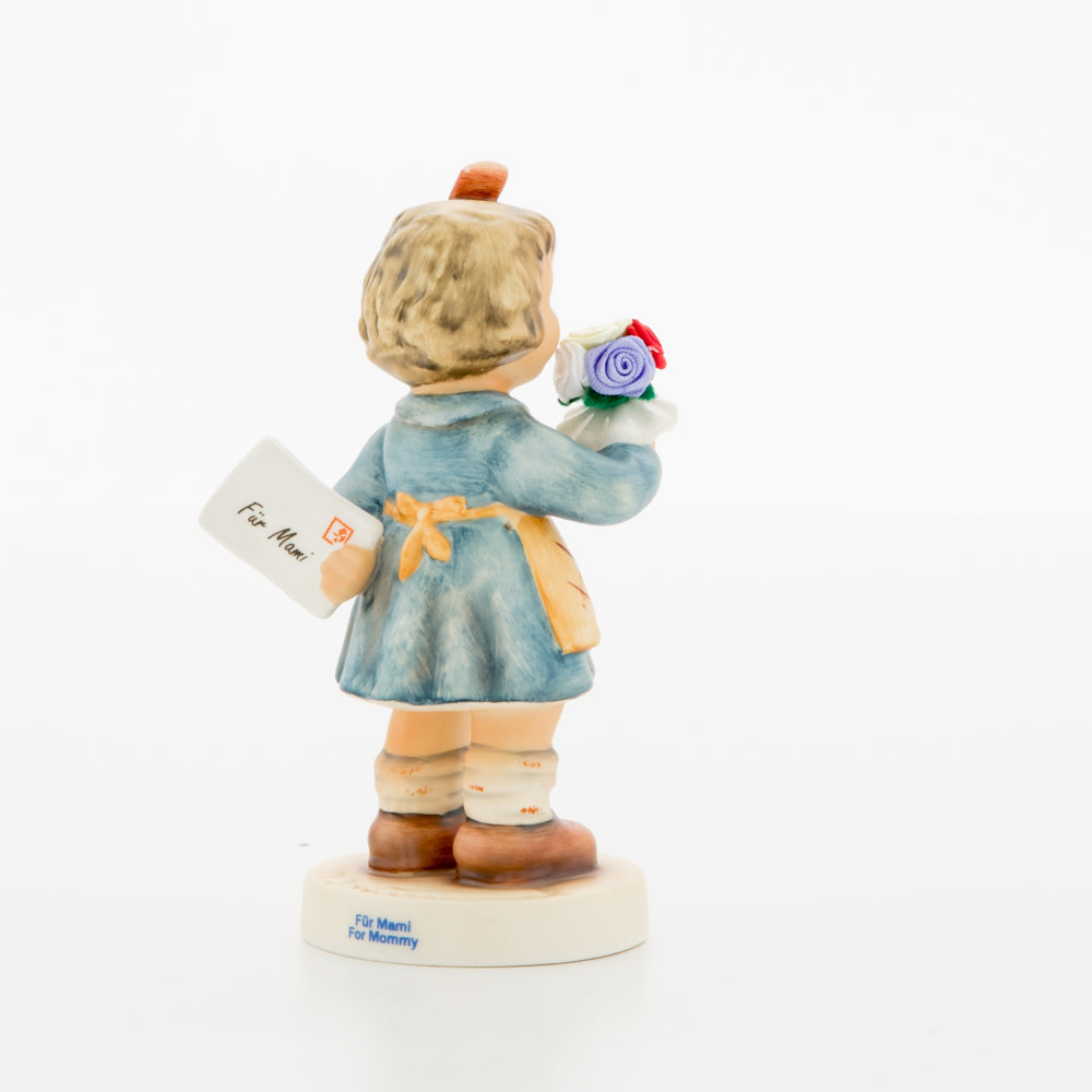 Einen Blumenstrauß in der rechten Hand und in der linken Hand - versteckt hinter dem Rücken - ein Briefumschlag mit der Aufschrift „Für Mami“. Was für eine tolle Überraschung! Diese hübsche M.I. Hummel-Figur wurde von Anette Barth und Helmut Fischer geschaffen. Wie auch die Hummel-Figuren „Glückskind" (HUM 2387) oder „Nur für dich" (HUM 2259) gehört dieses Mädchen aus der Hummel Manufaktur zur neuen Muttertags-Kollektion.