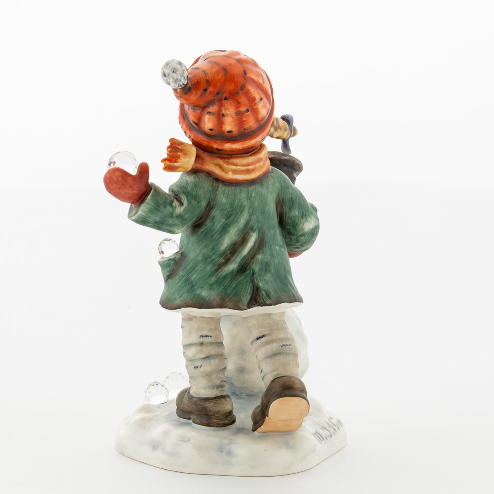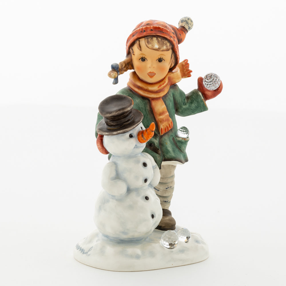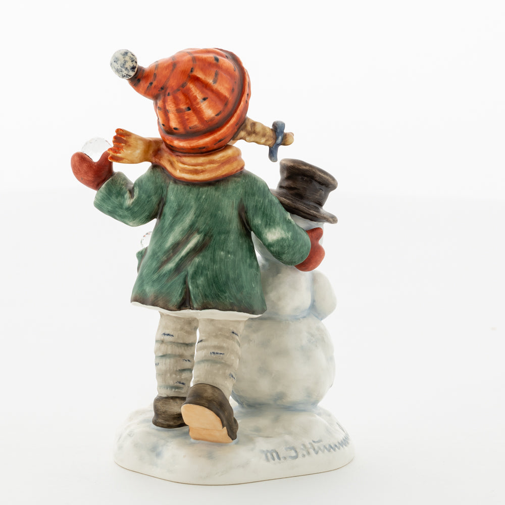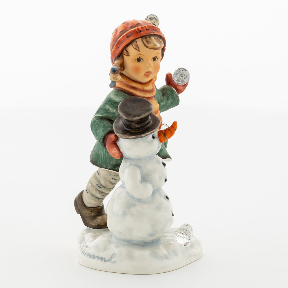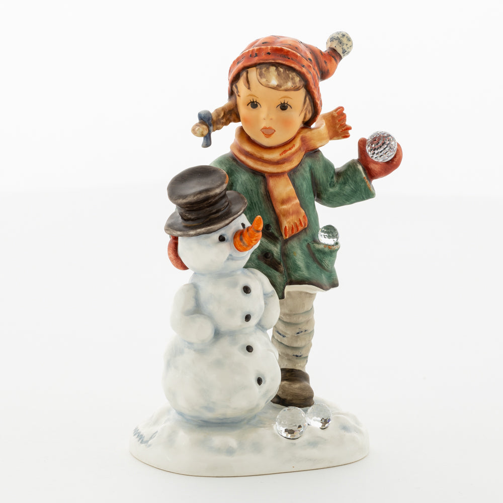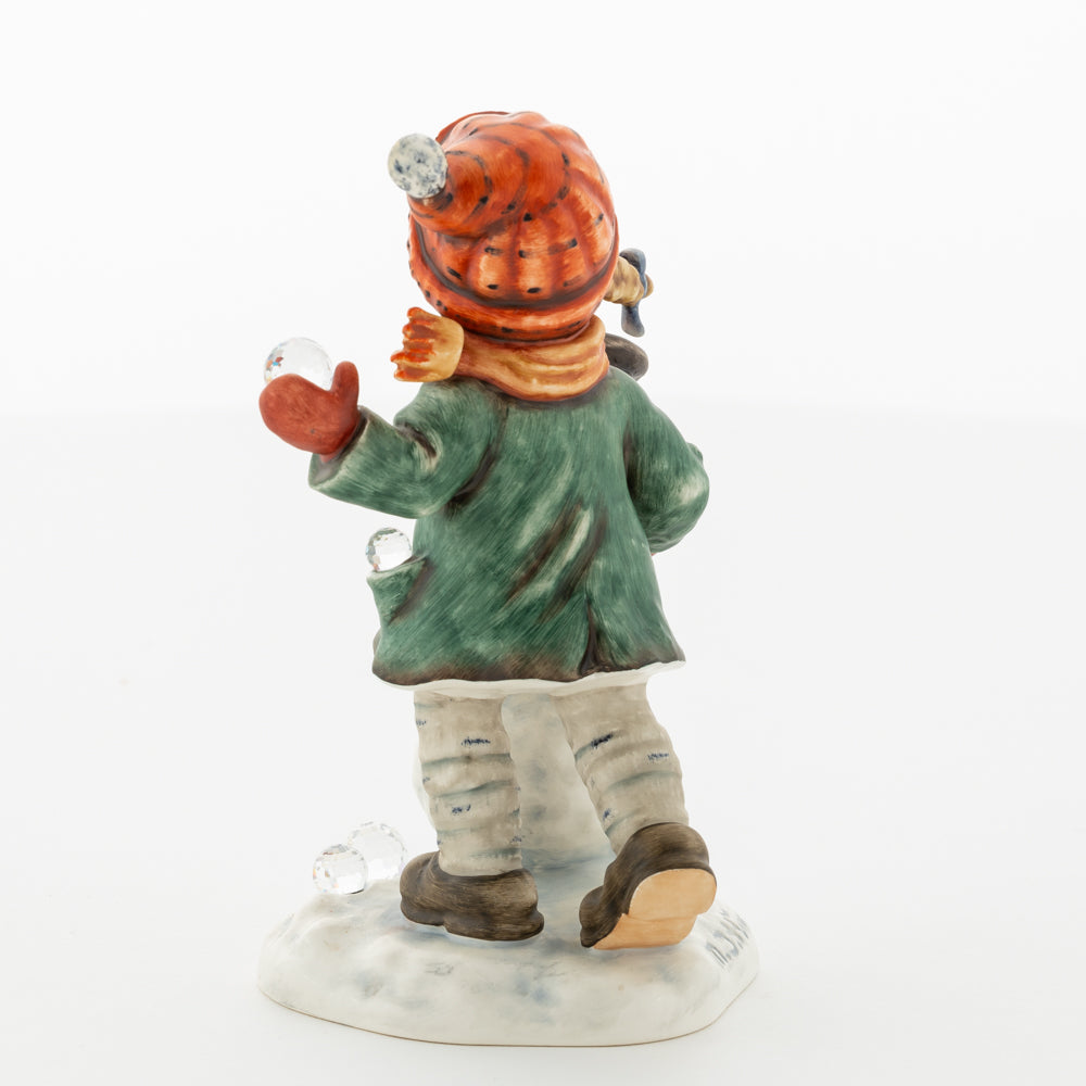 Beide Hummel-Kinder lassen sich im Winter sehr schön gemeinsam aufstellen, bringen aber auch „solo“ Winterfreude ins Haus. Das kleine Hummel-Mädchen, das hinter dem Schneemann Deckung sucht, ist auf 1.999 Exemplare limitiert. Modelleurin Tamara Fuchs schuf die Figur im Jahr 2015.
