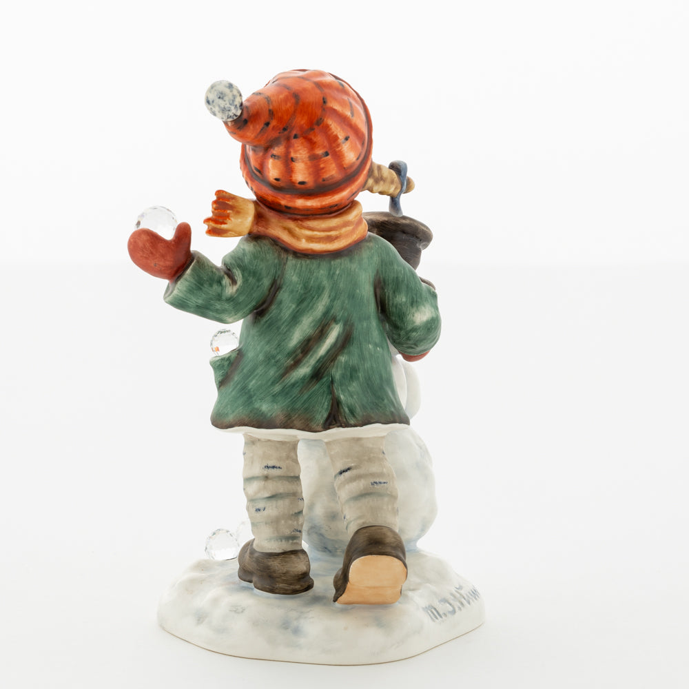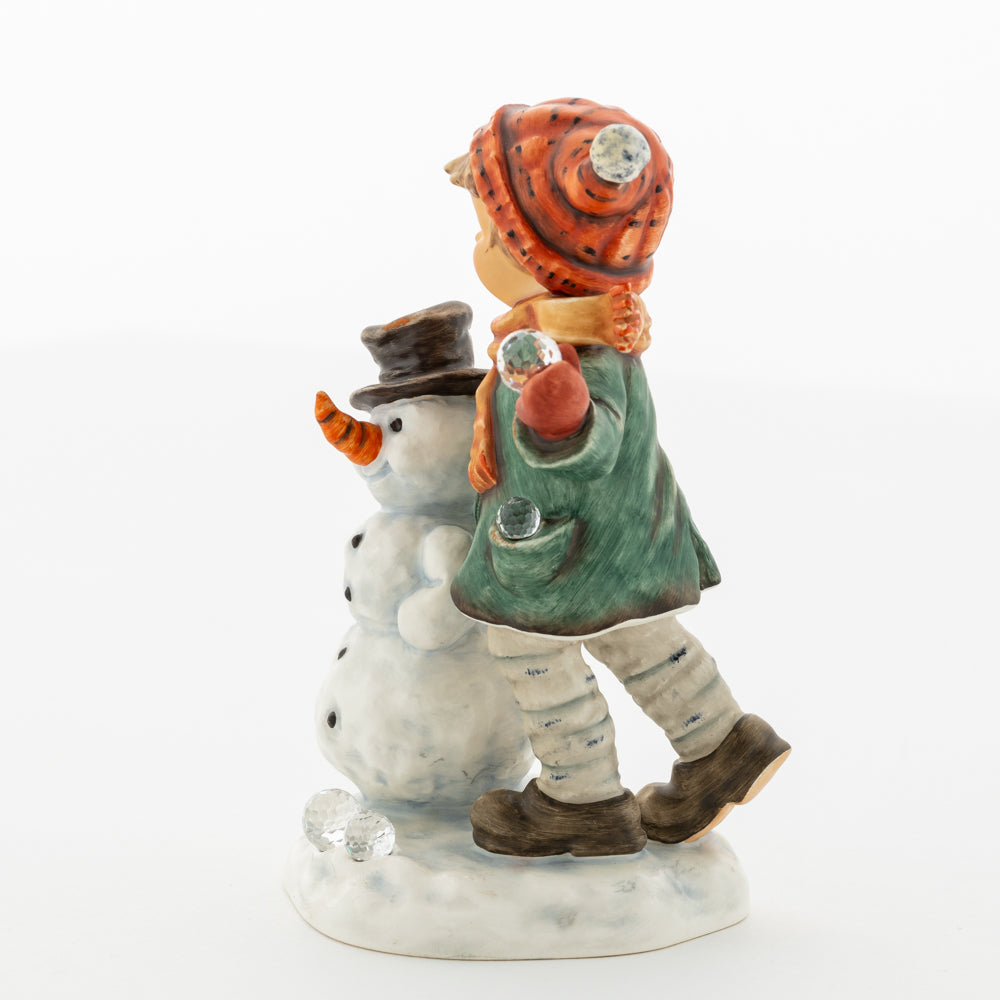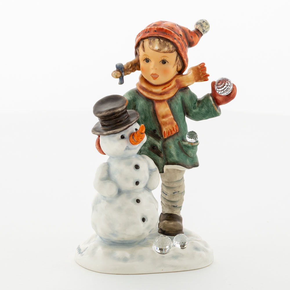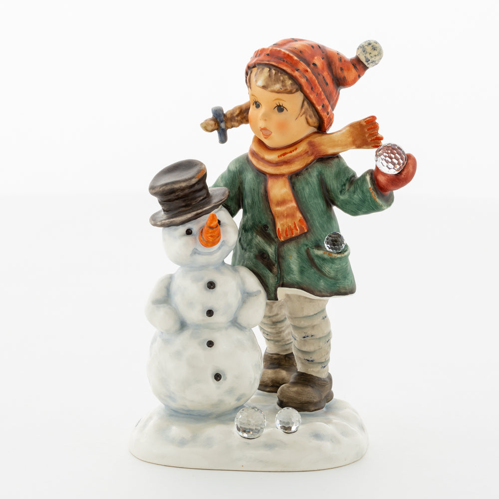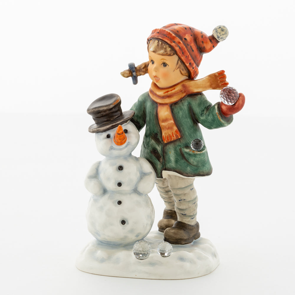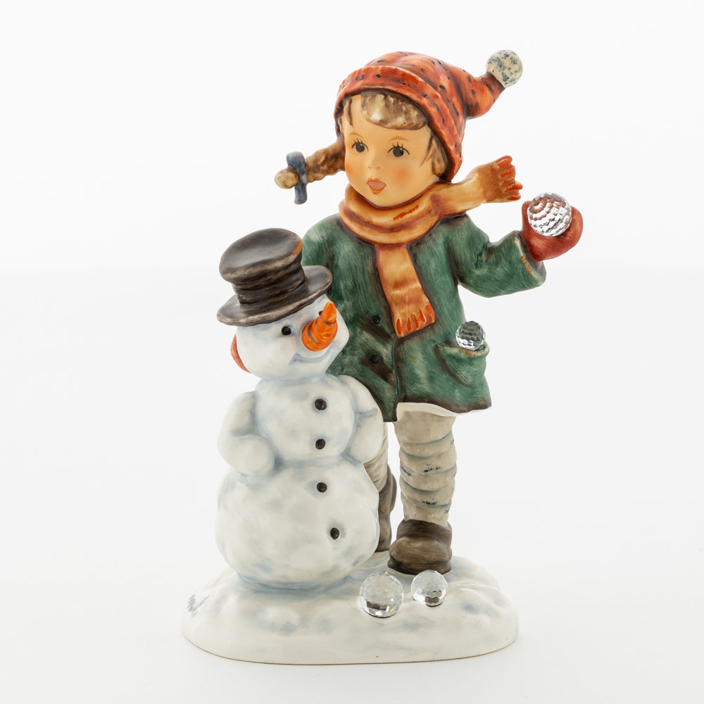 Beide Hummel-Kinder lassen sich im Winter sehr schön gemeinsam aufstellen, bringen aber auch „solo“ Winterfreude ins Haus. Das kleine Hummel-Mädchen, das hinter dem Schneemann Deckung sucht, ist auf 1.999 Exemplare limitiert. Modelleurin Tamara Fuchs schuf die Figur im Jahr 2015.