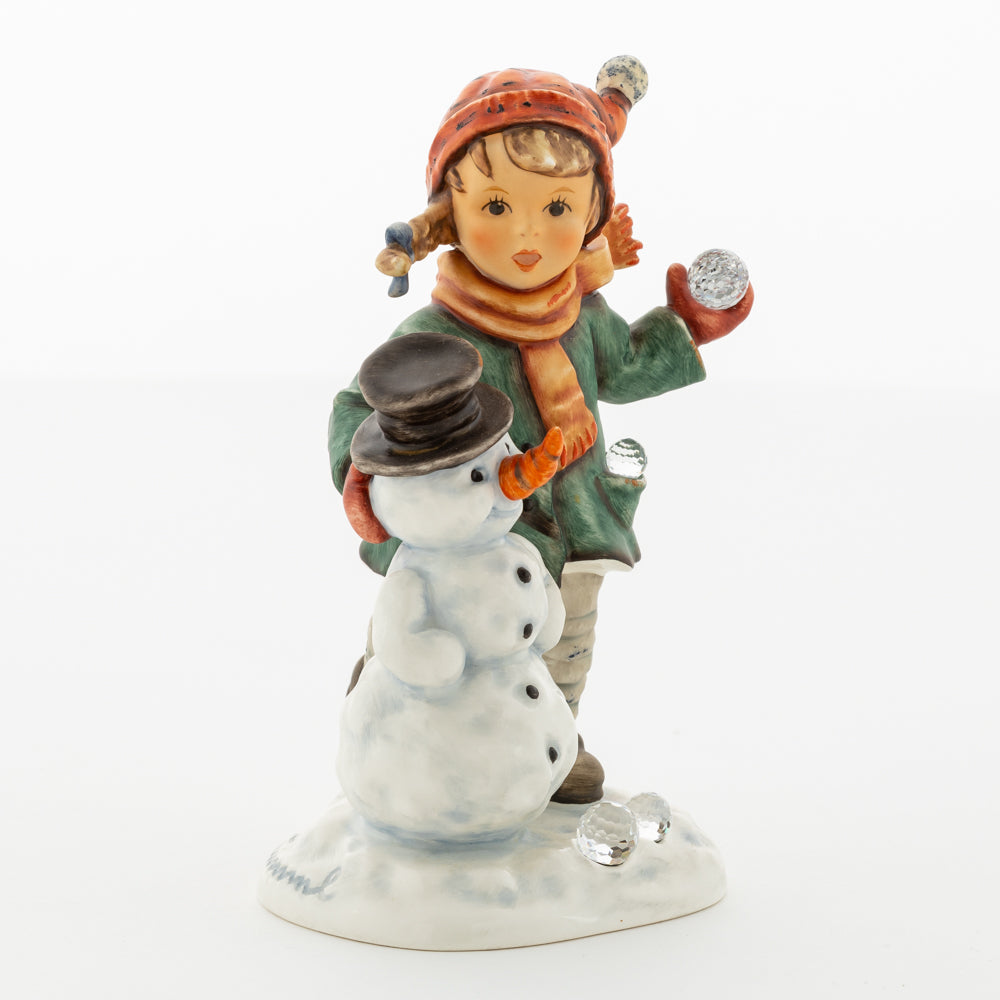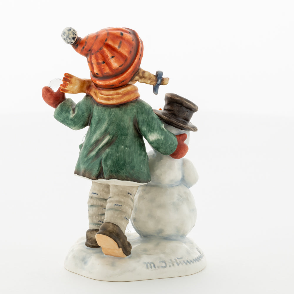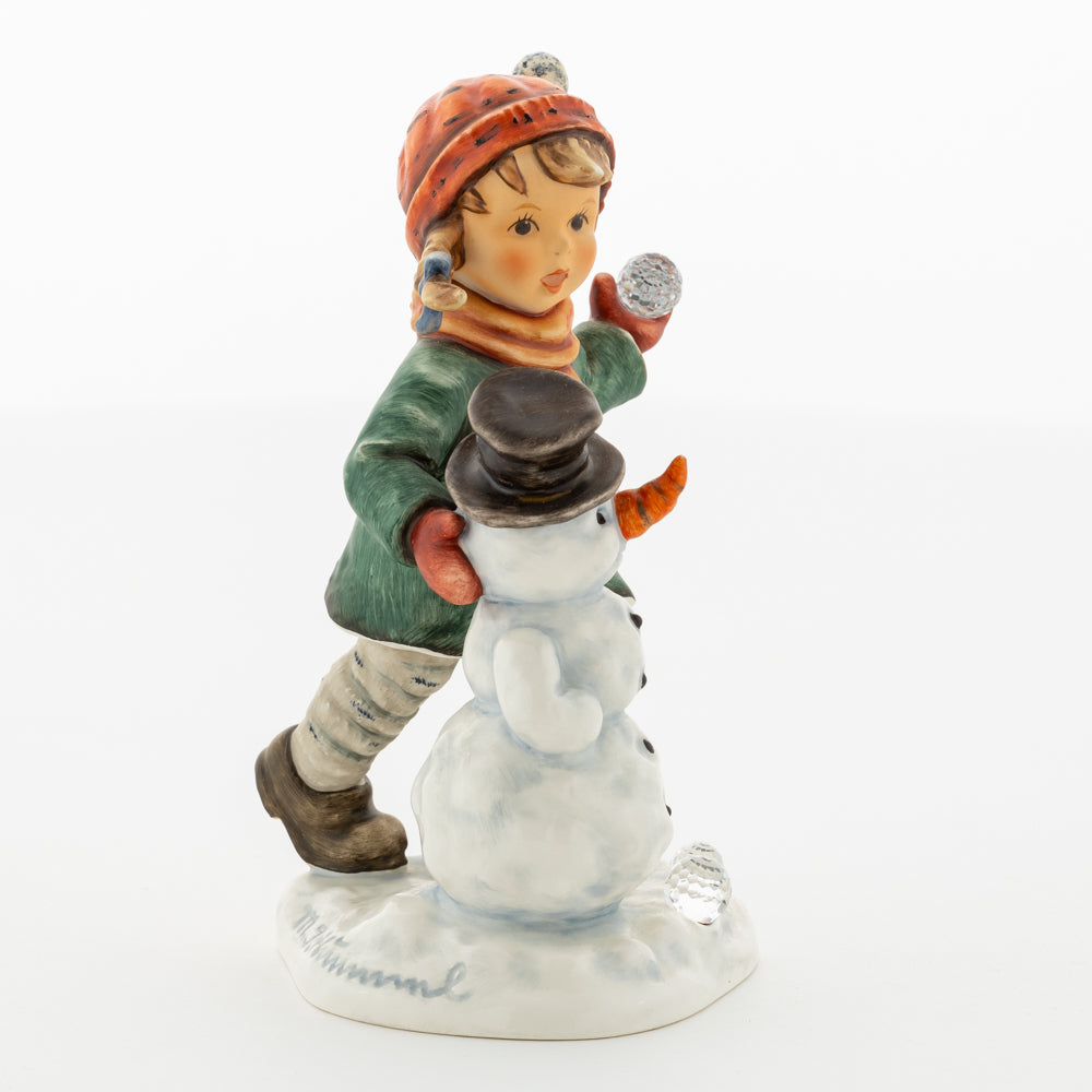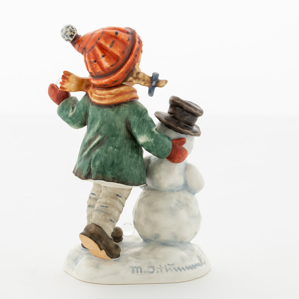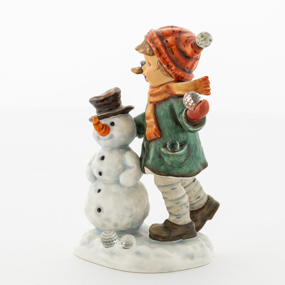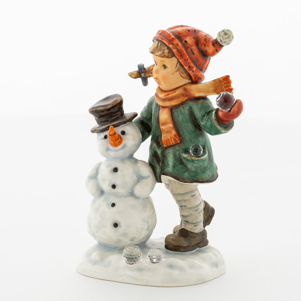 Beide Hummel-Kinder lassen sich im Winter sehr schön gemeinsam aufstellen, bringen aber auch „solo“ Winterfreude ins Haus. Das kleine Hummel-Mädchen, das hinter dem Schneemann Deckung sucht, ist auf 1.999 Exemplare limitiert. Modelleurin Tamara Fuchs schuf die Figur im Jahr 2015.