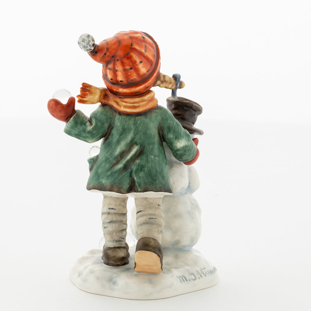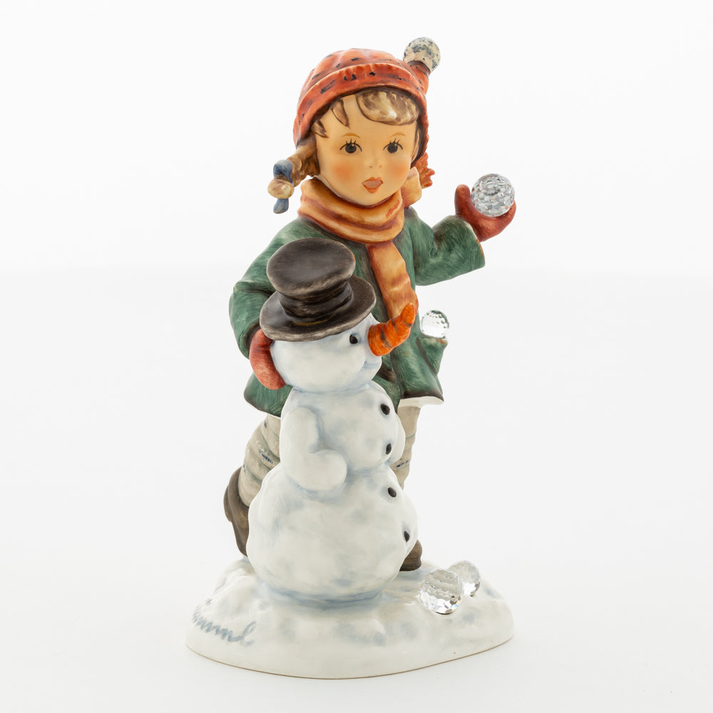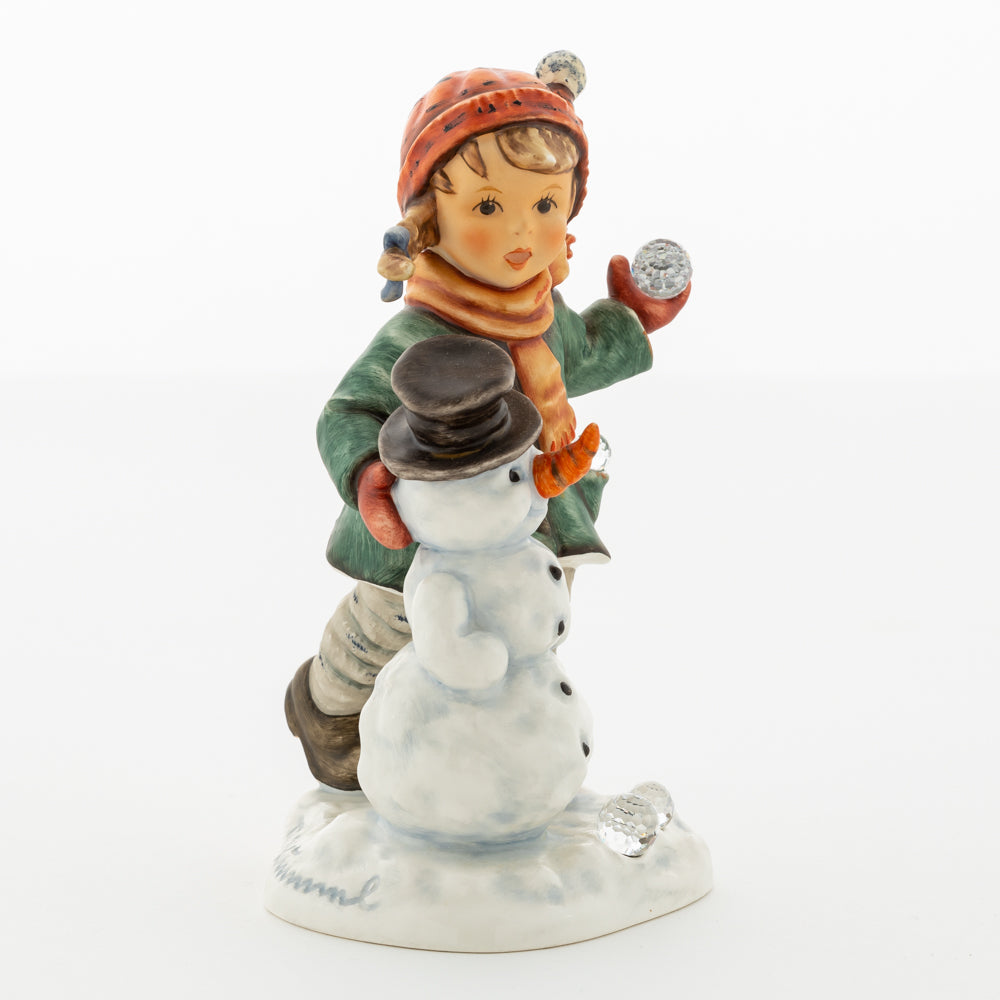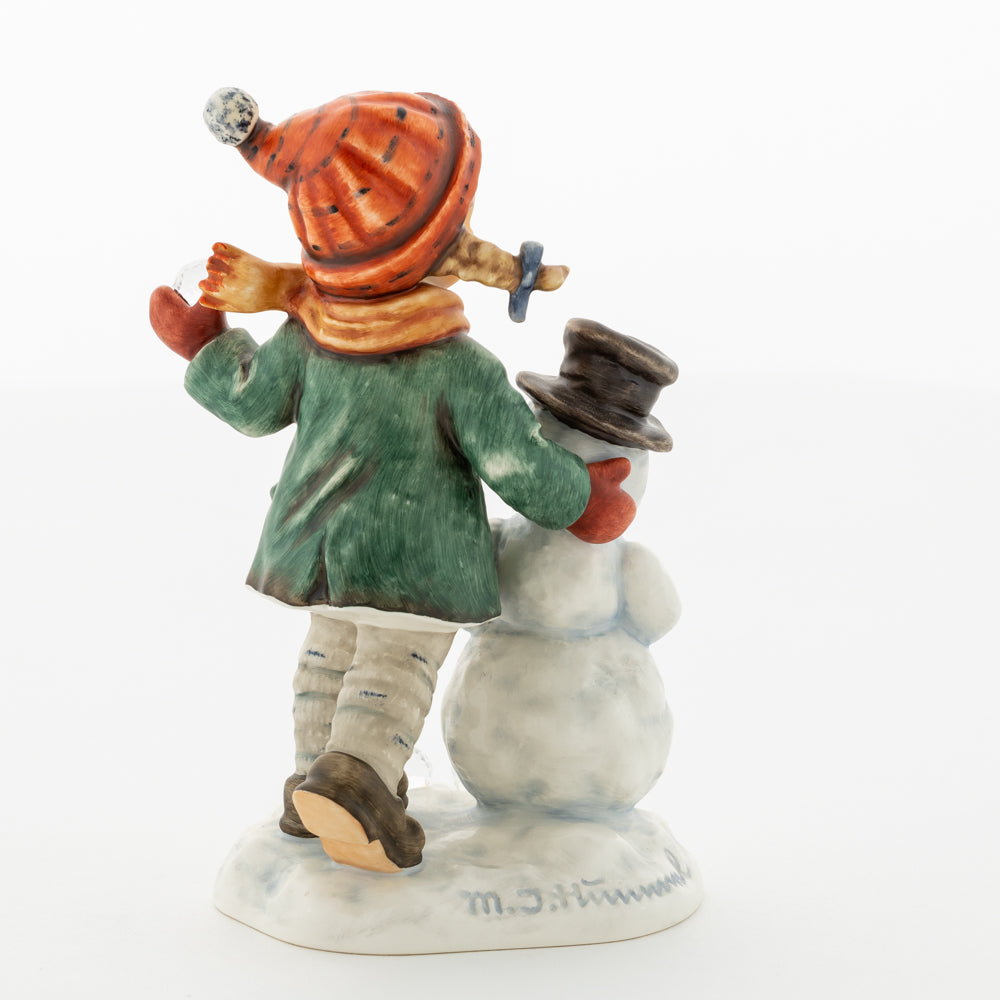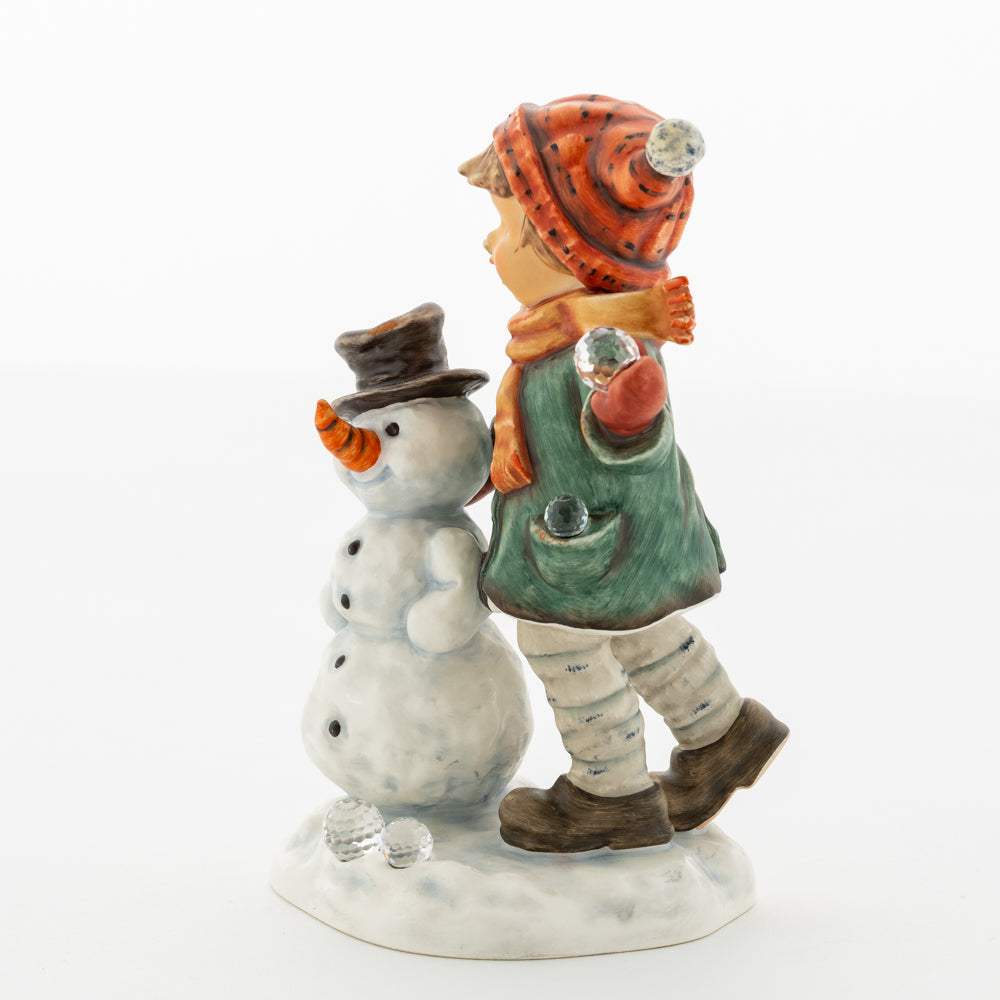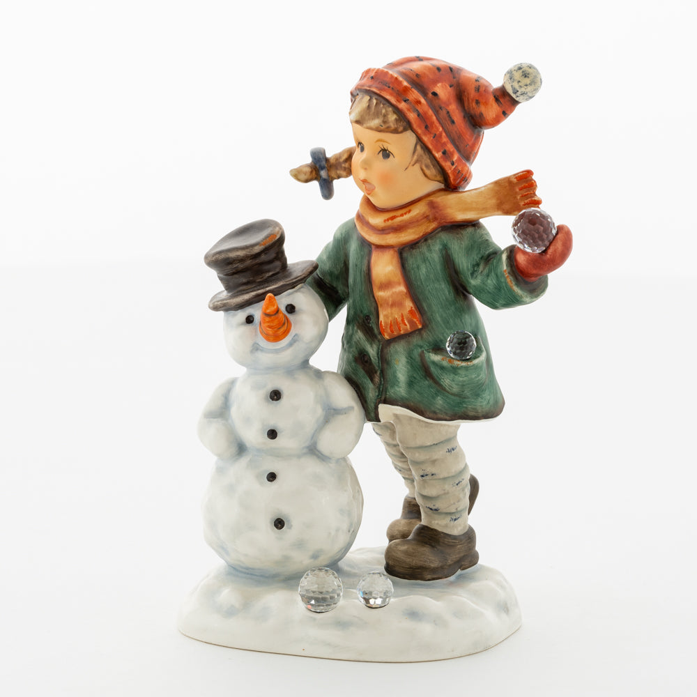 Beide Hummel-Kinder lassen sich im Winter sehr schön gemeinsam aufstellen, bringen aber auch „solo“ Winterfreude ins Haus. Das kleine Hummel-Mädchen, das hinter dem Schneemann Deckung sucht, ist auf 1.999 Exemplare limitiert. Modelleurin Tamara Fuchs schuf die Figur im Jahr 2015.