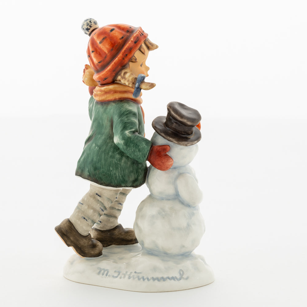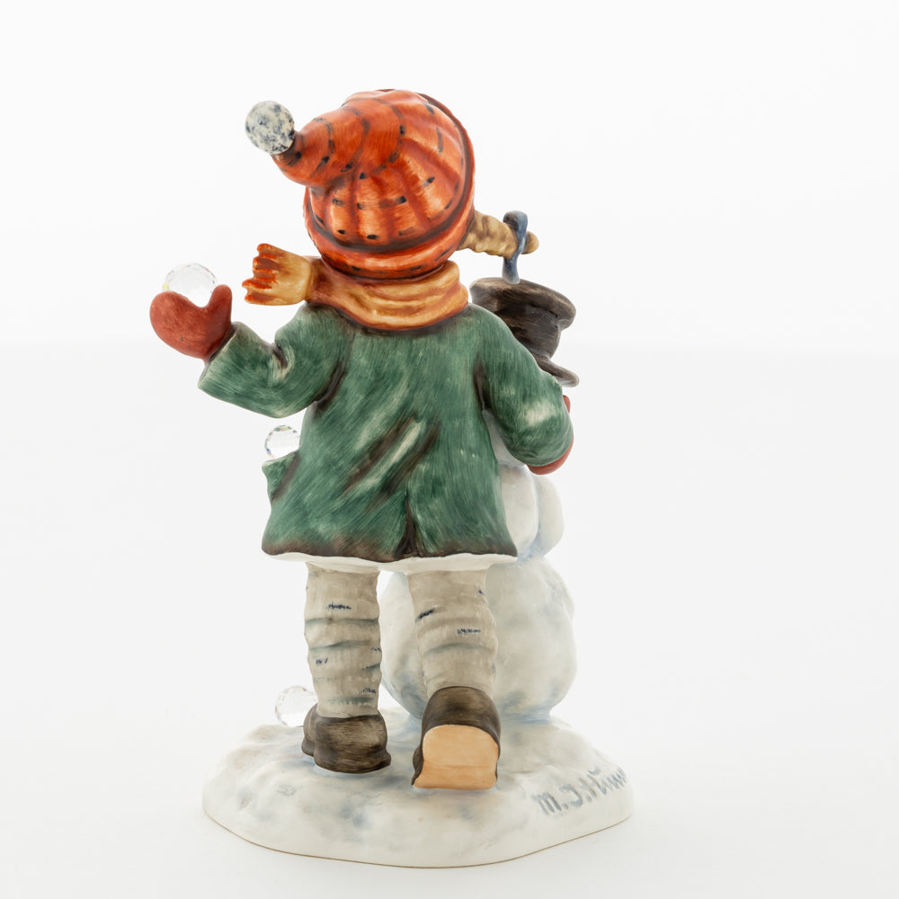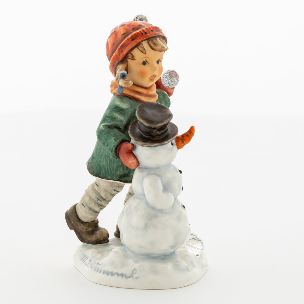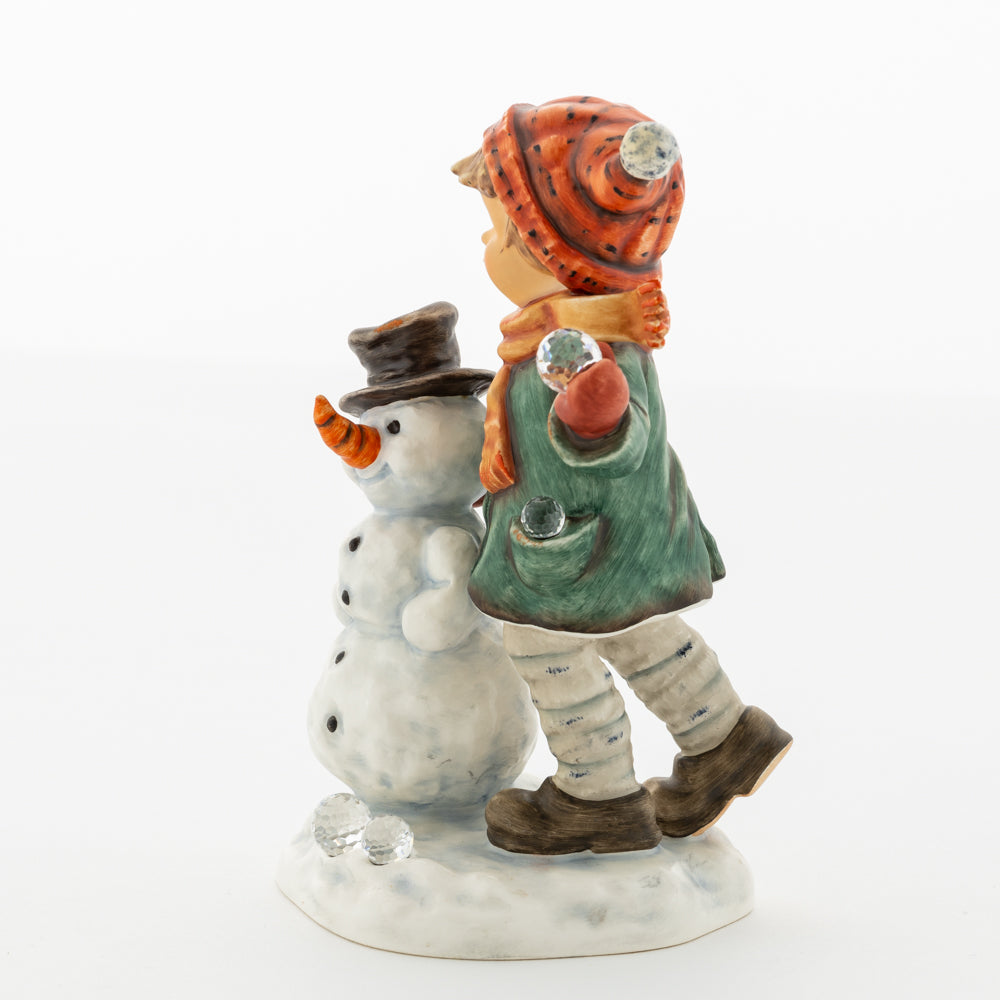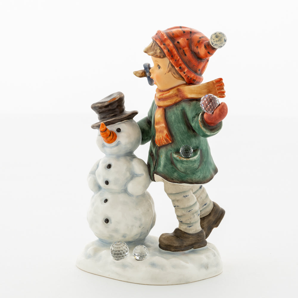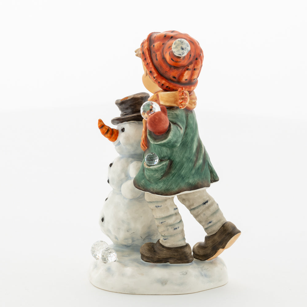 Beide Hummel-Kinder lassen sich im Winter sehr schön gemeinsam aufstellen, bringen aber auch „solo“ Winterfreude ins Haus. Das kleine Hummel-Mädchen, das hinter dem Schneemann Deckung sucht, ist auf 1.999 Exemplare limitiert. Modelleurin Tamara Fuchs schuf die Figur im Jahr 2015.