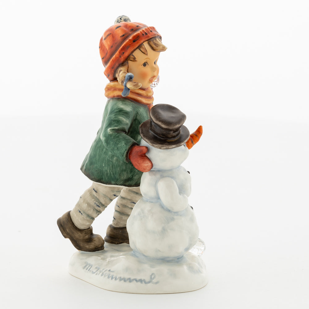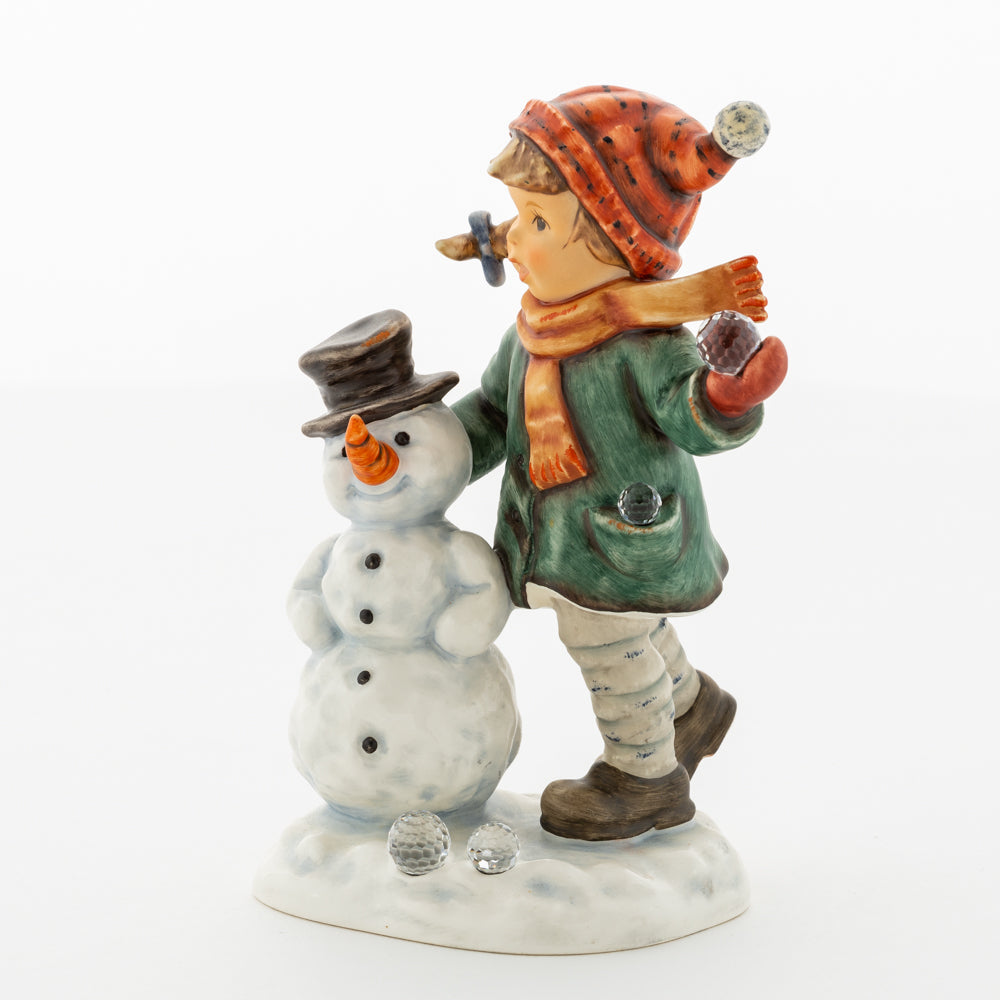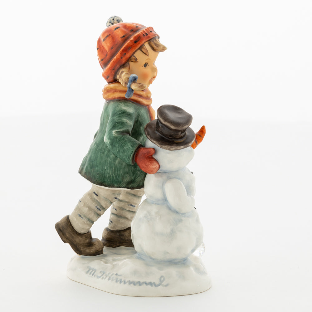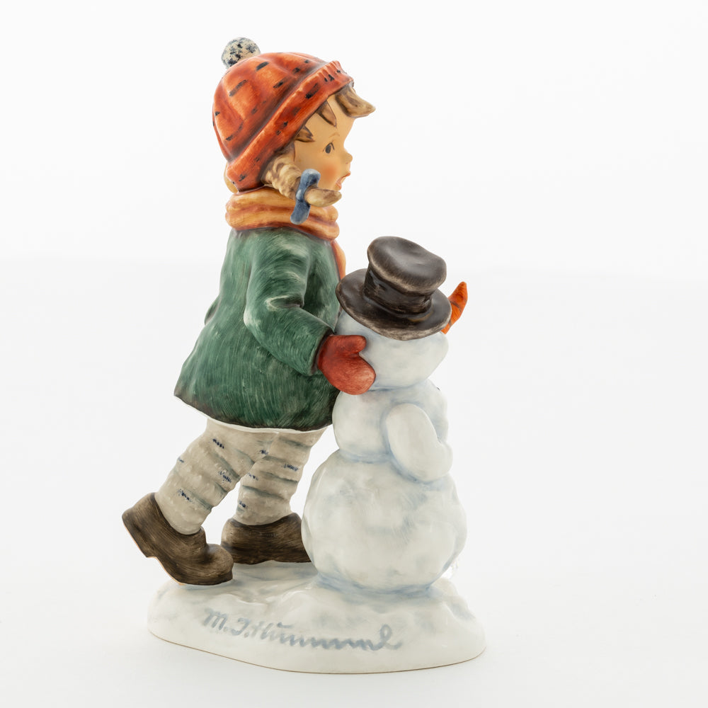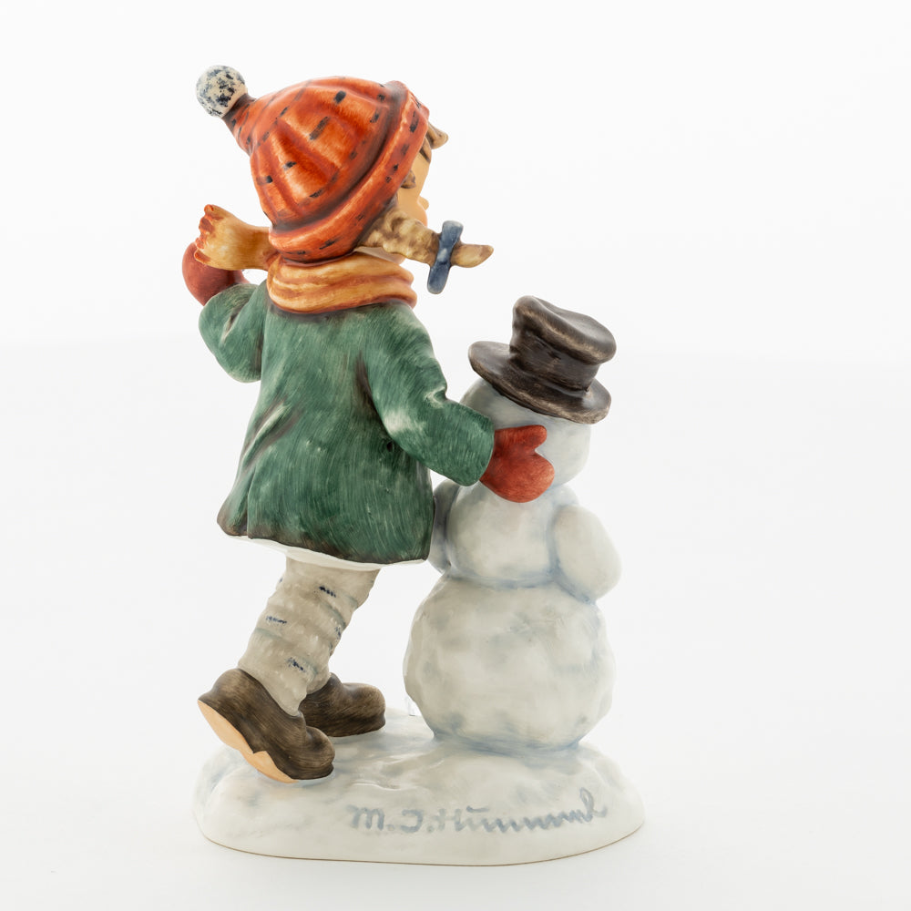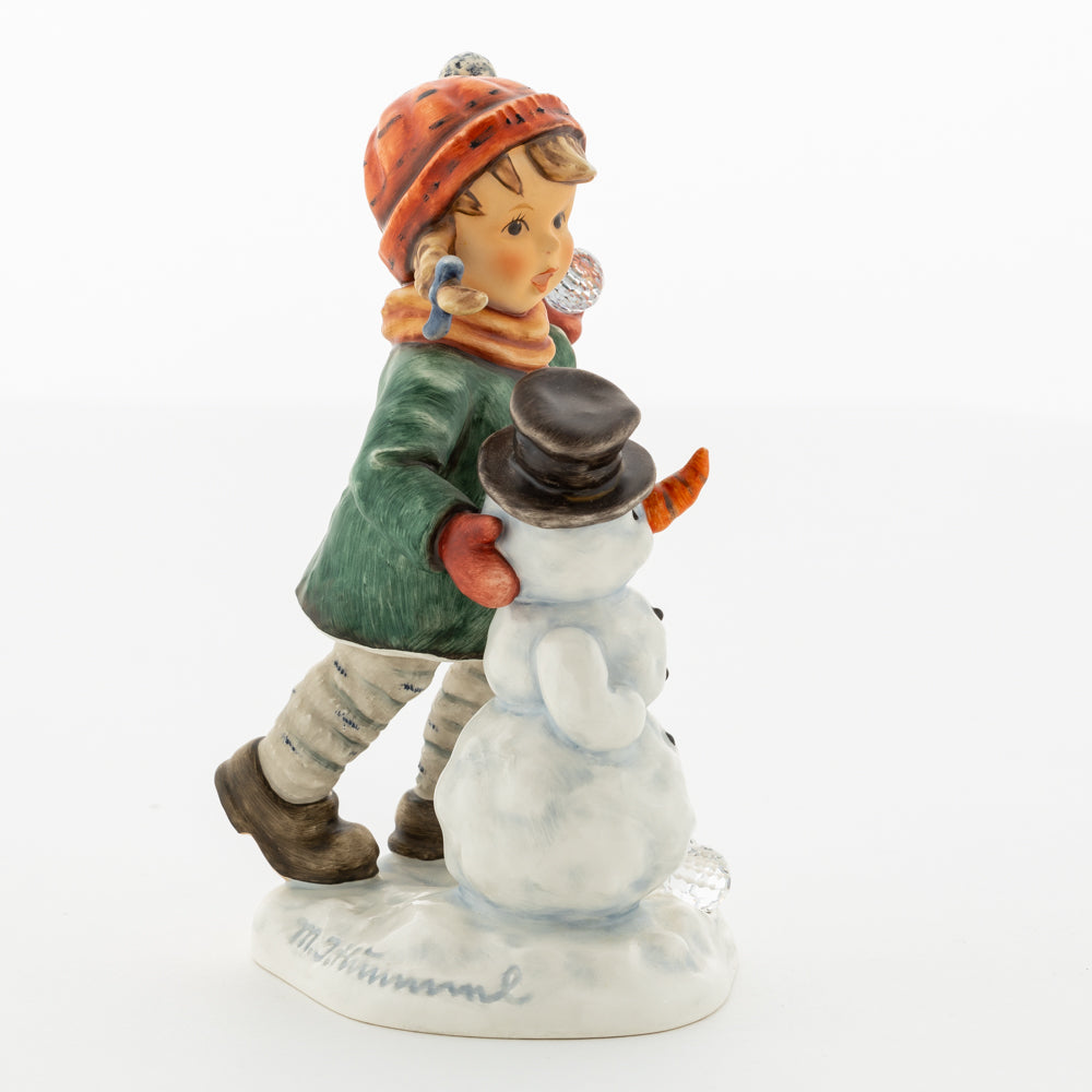 Beide Hummel-Kinder lassen sich im Winter sehr schön gemeinsam aufstellen, bringen aber auch „solo“ Winterfreude ins Haus. Das kleine Hummel-Mädchen, das hinter dem Schneemann Deckung sucht, ist auf 1.999 Exemplare limitiert. Modelleurin Tamara Fuchs schuf die Figur im Jahr 2015.