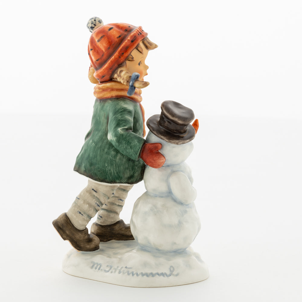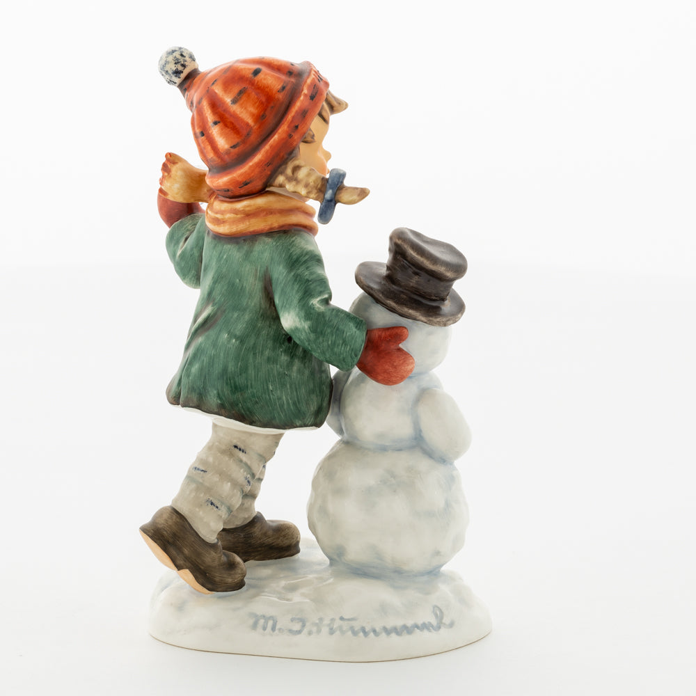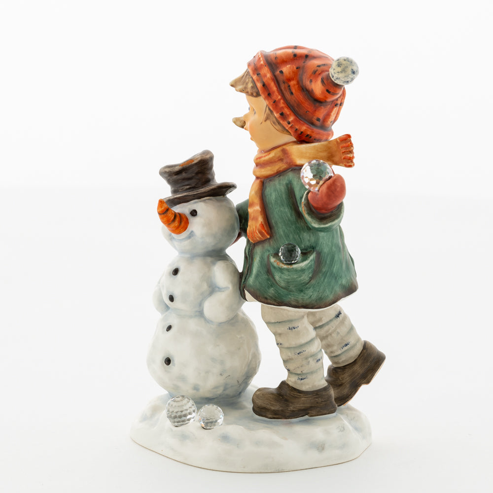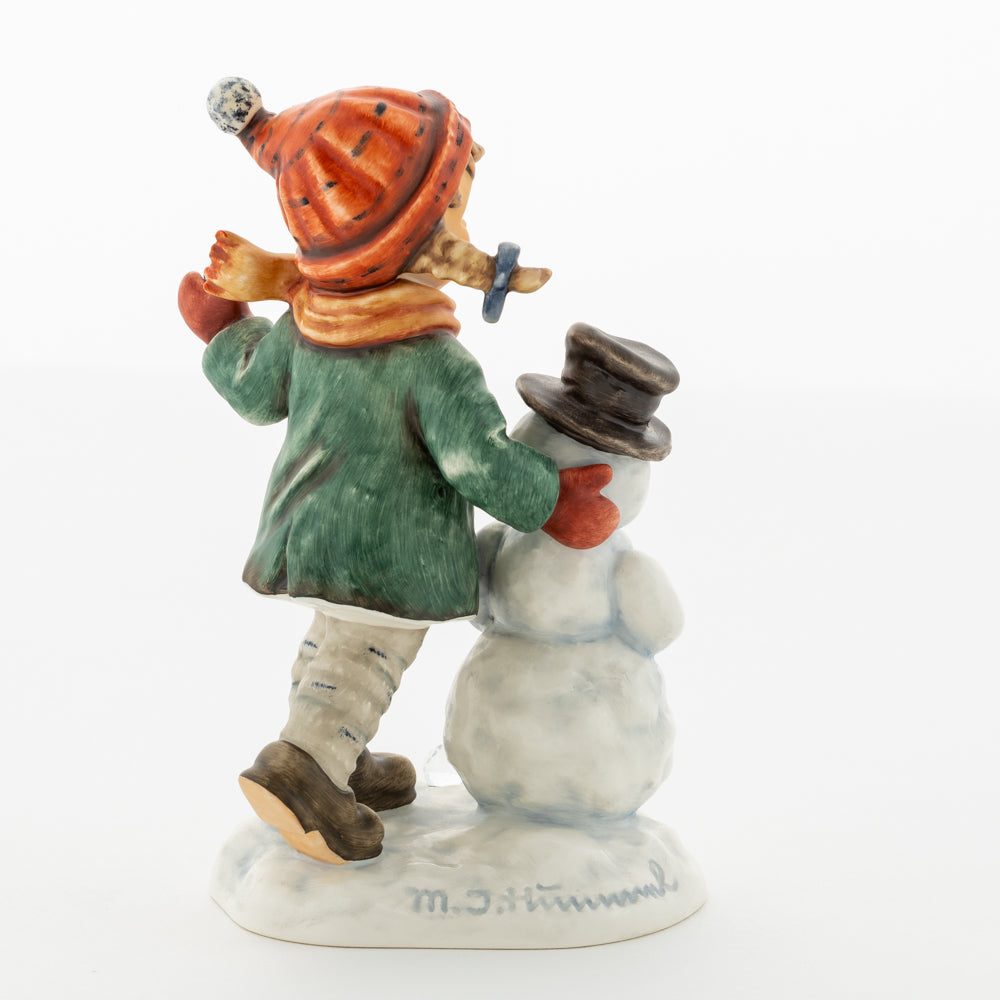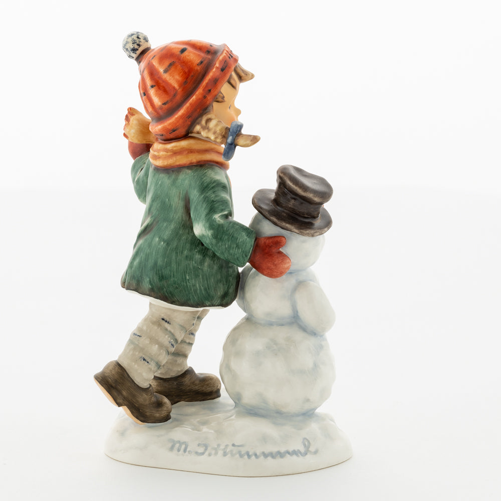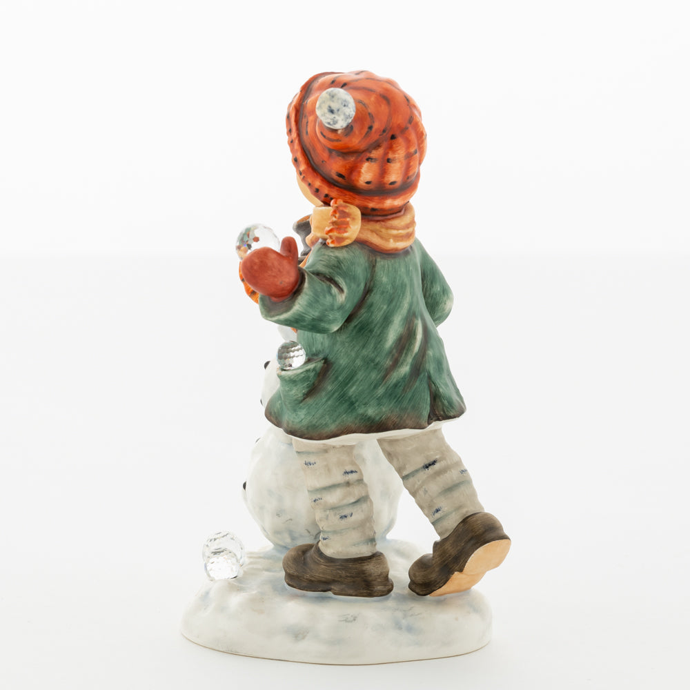 Beide Hummel-Kinder lassen sich im Winter sehr schön gemeinsam aufstellen, bringen aber auch „solo“ Winterfreude ins Haus. Das kleine Hummel-Mädchen, das hinter dem Schneemann Deckung sucht, ist auf 1.999 Exemplare limitiert. Modelleurin Tamara Fuchs schuf die Figur im Jahr 2015.