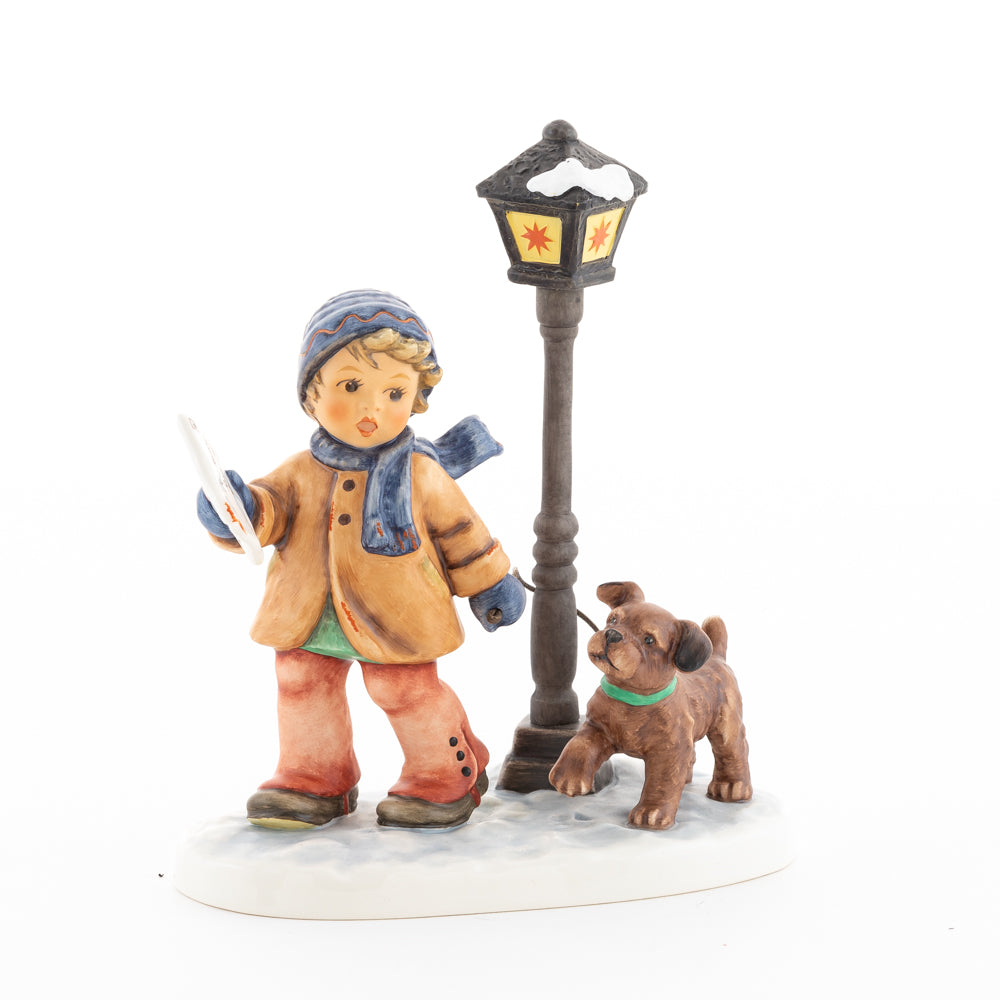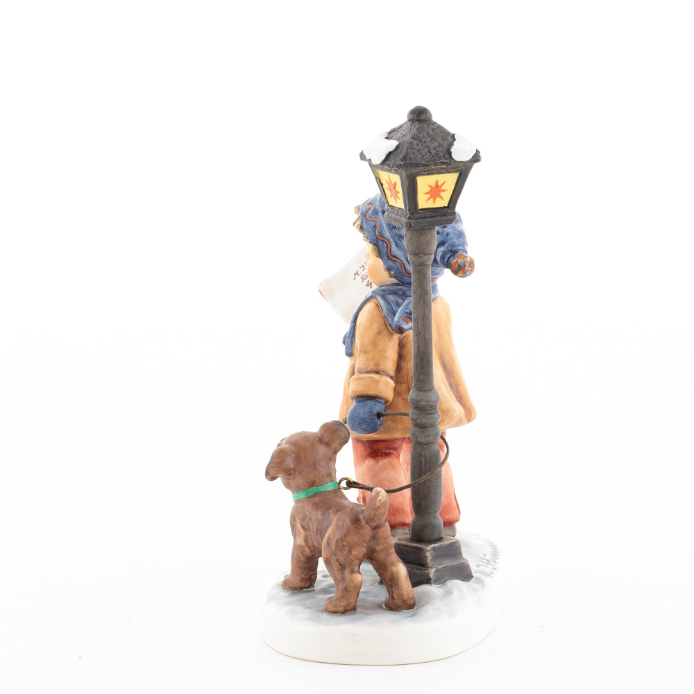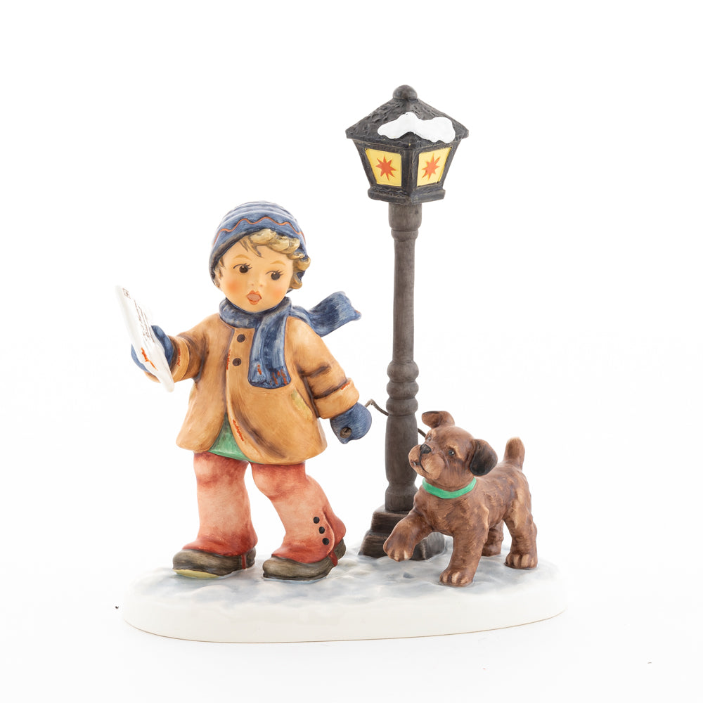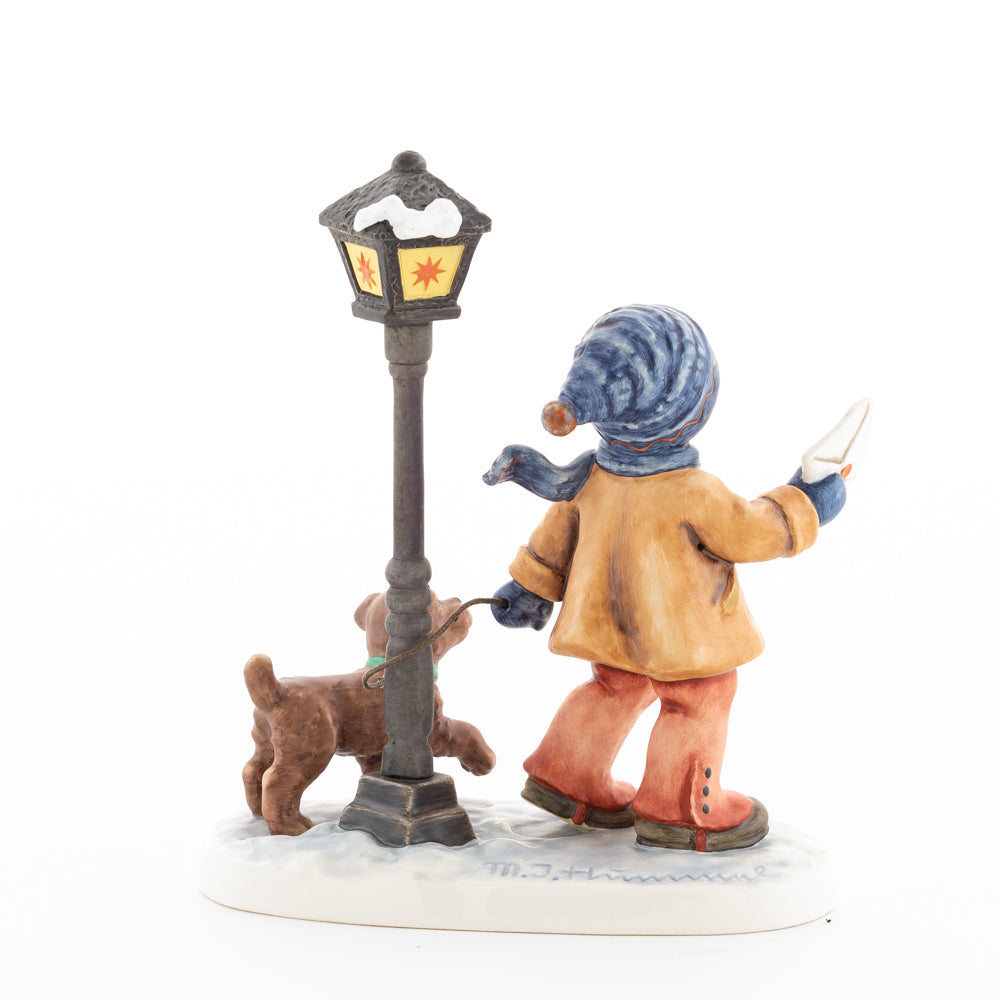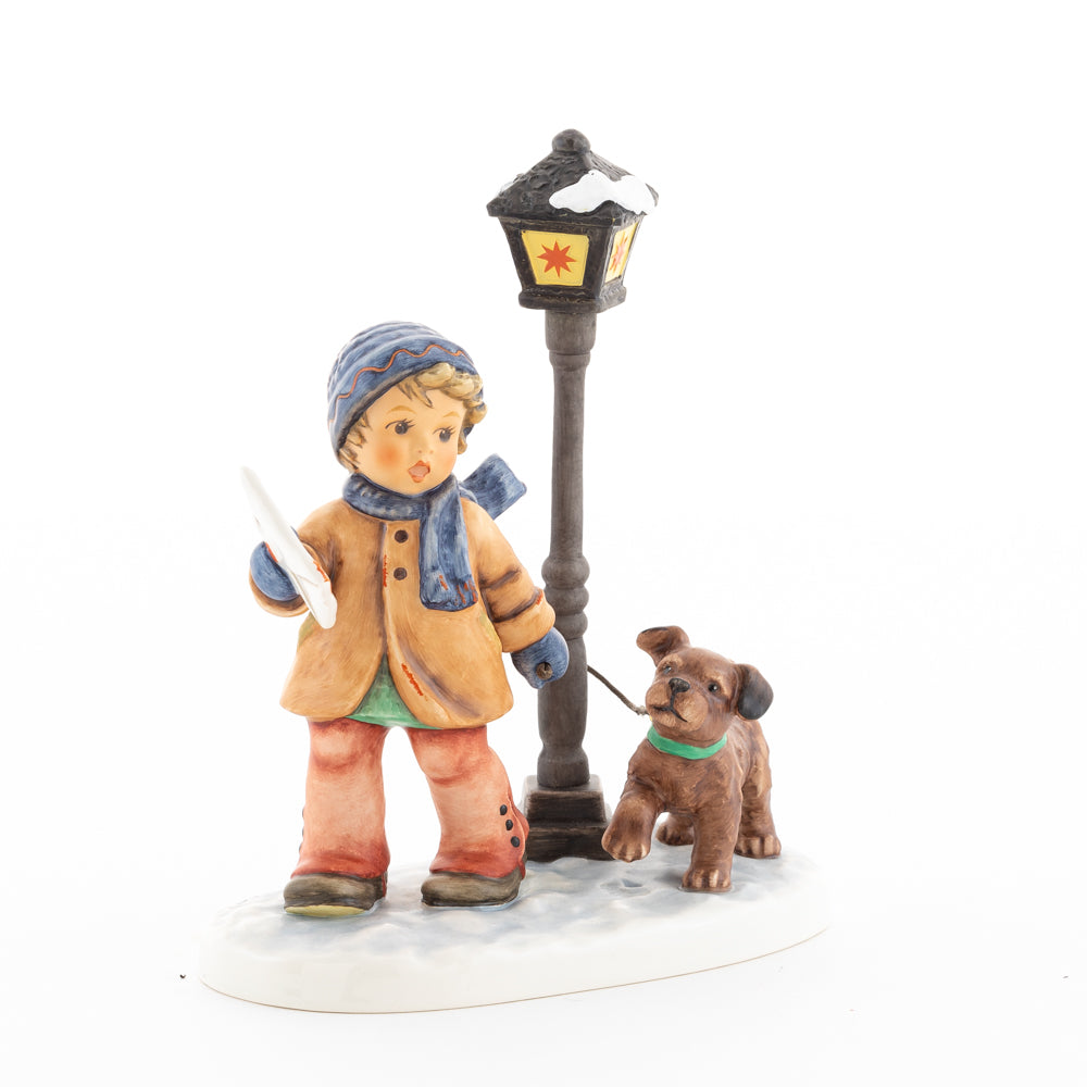 „Aus dem Weg, wir haben es doch eilig!“, scheint der Junge mit dem blauen Schal und der blauen Mütze zu rufen. In der einen Hand hält er wichtige Weihnachtspost, in der anderen die Leine seines Hundes, den er eilig hinter sich herzieht. Doch was ist das? Weil der Hund voller Vorfreude herumgesprungen ist, hat sich seine Leine um die Laterne gewickelt. Schaffen es der Bub und sein Freund aus Fell also noch rechtzeitig zum Briefkasten? Diese Doppelfigur ist handbemalt und -gefertigt und besticht durch viele liebevolle Details. Vom grünen Halsband des Hundes über das Licht in der Laterne bis zur Anschrift auf der Weihnachtspost.